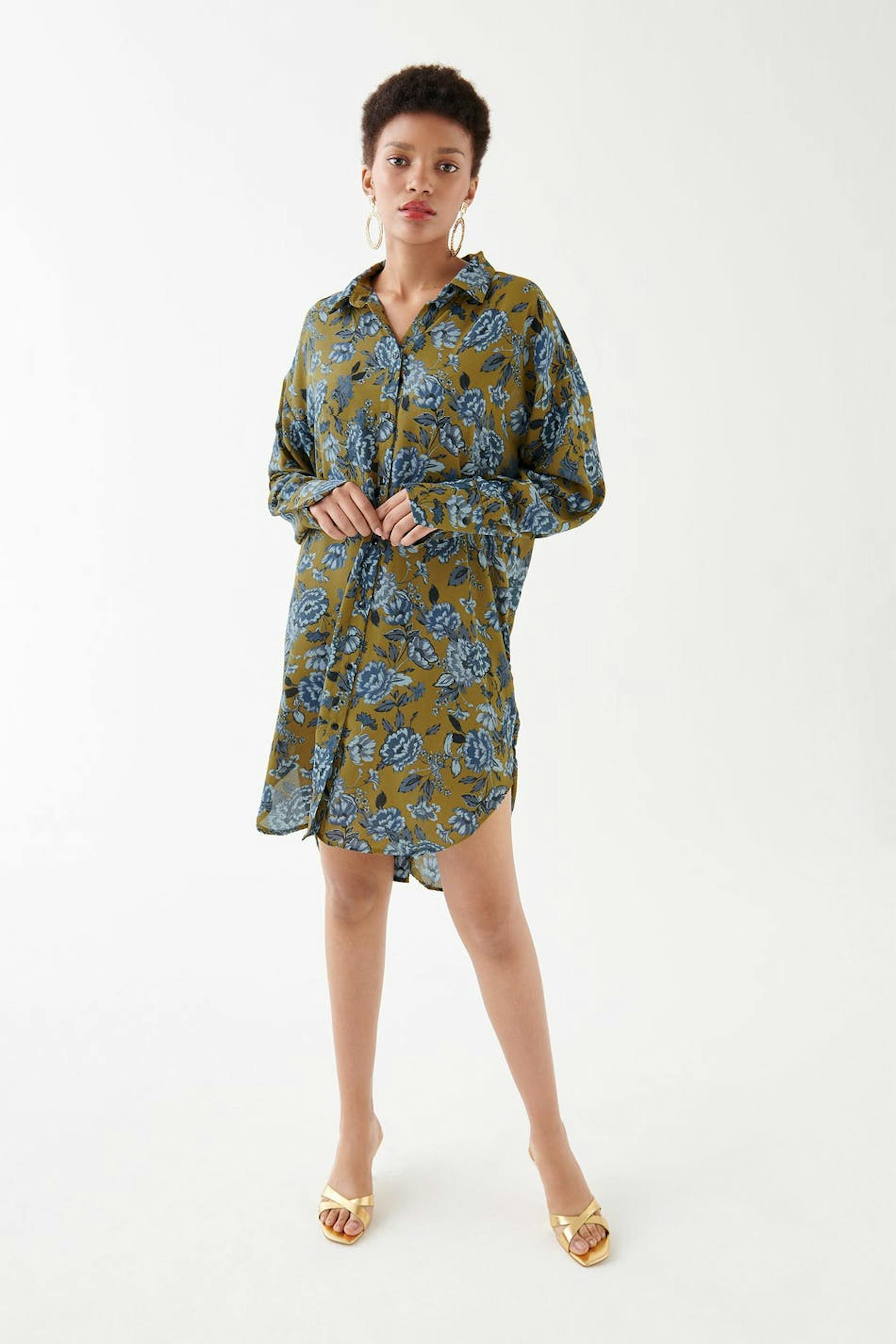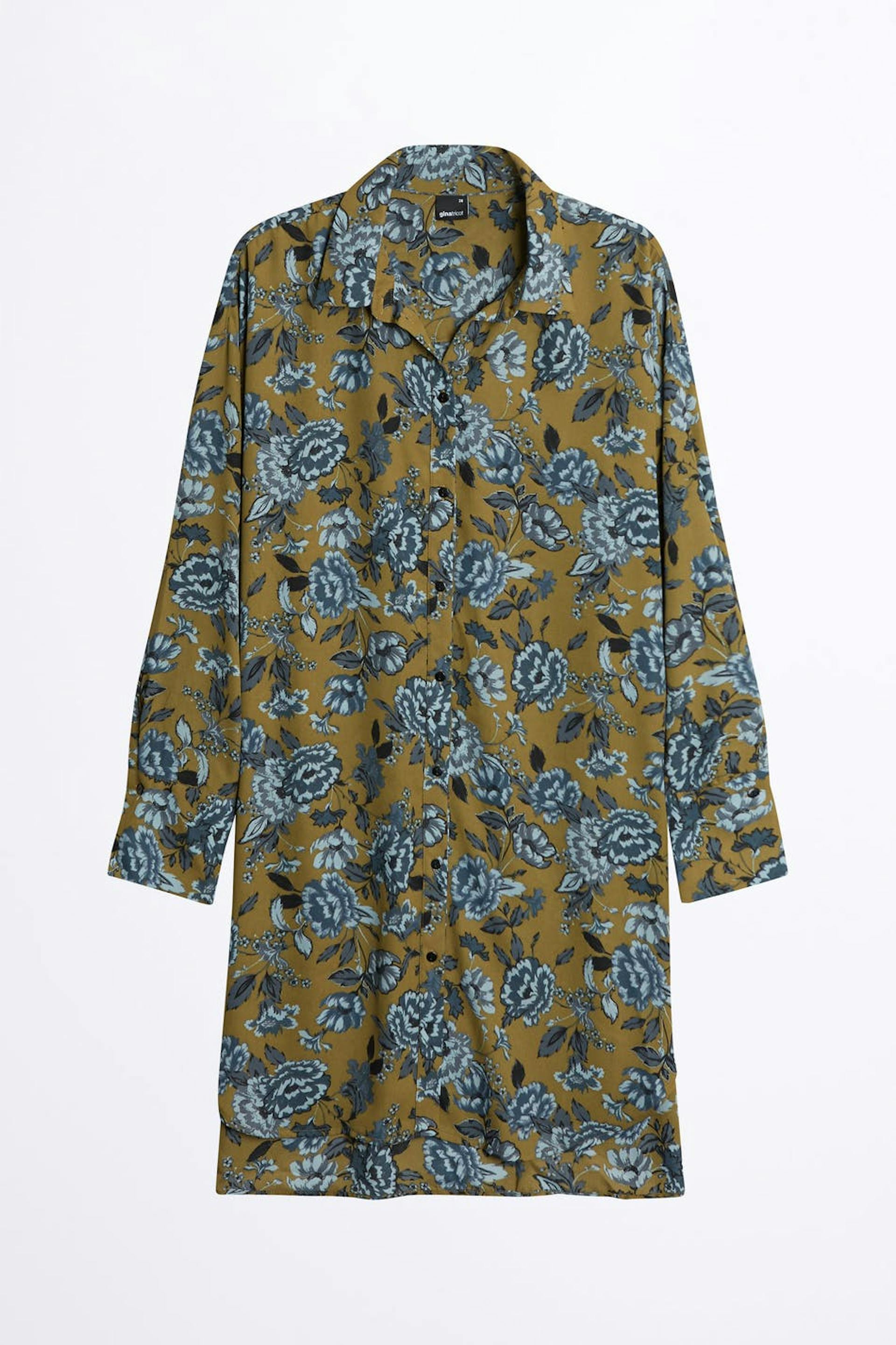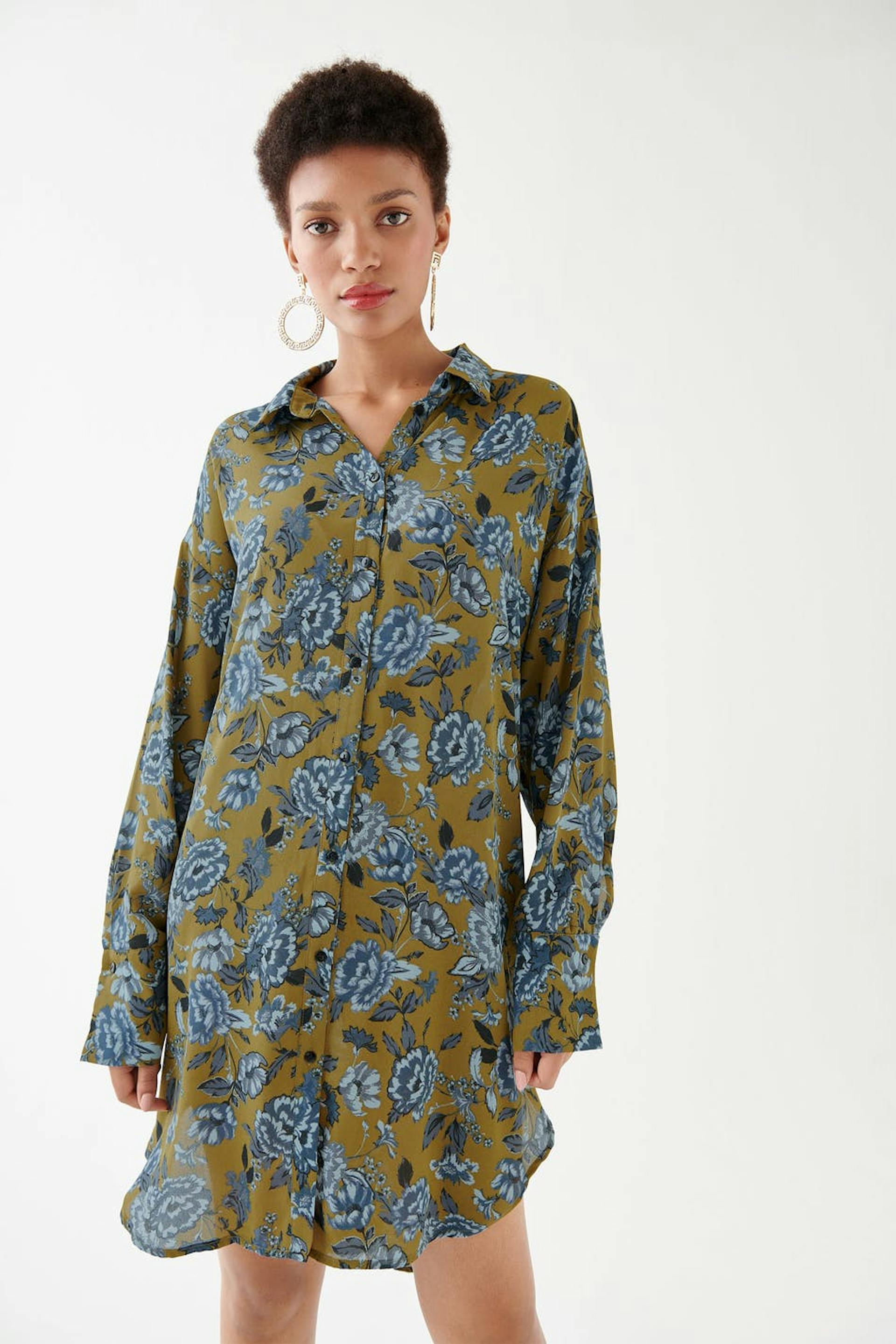 Kukallinen tunika ylisuuri istuvuudella. Vihreä, sininen, ylisuuri ja pitkähihainen. Siinä on napit edessä, pyöristetty helma ja kaulus.
