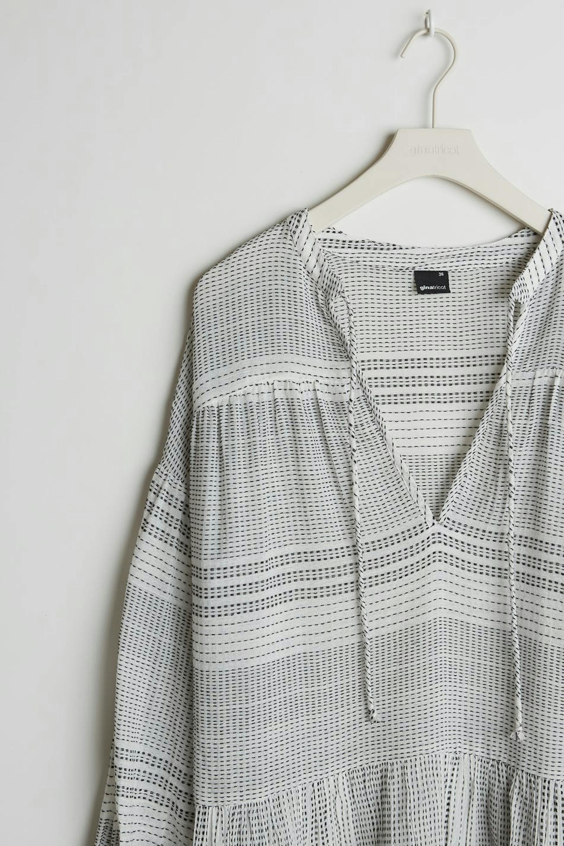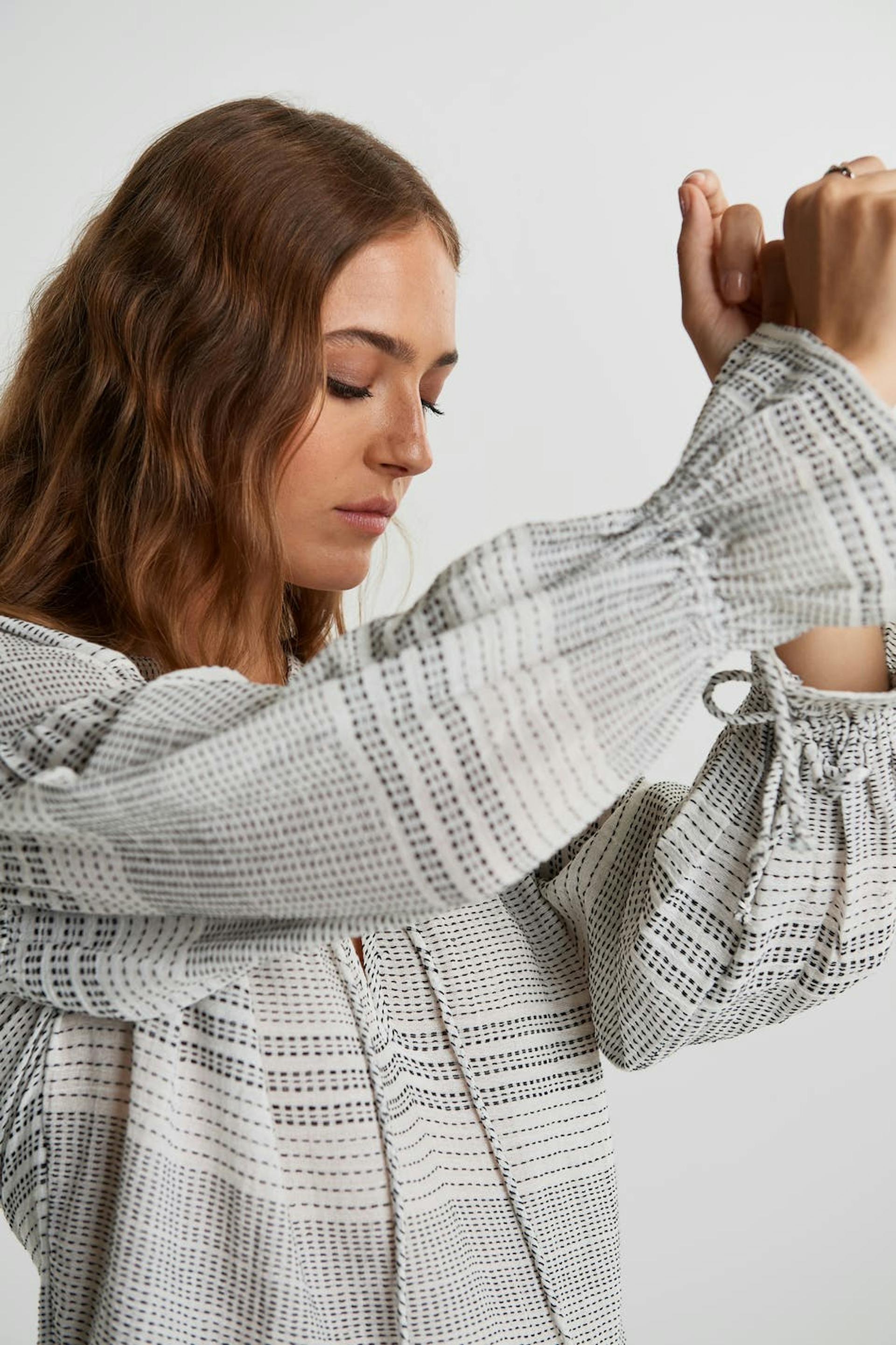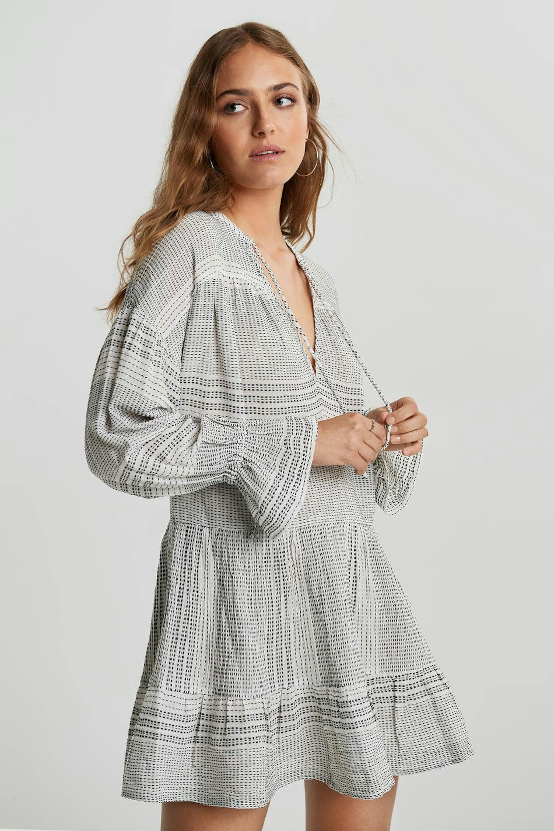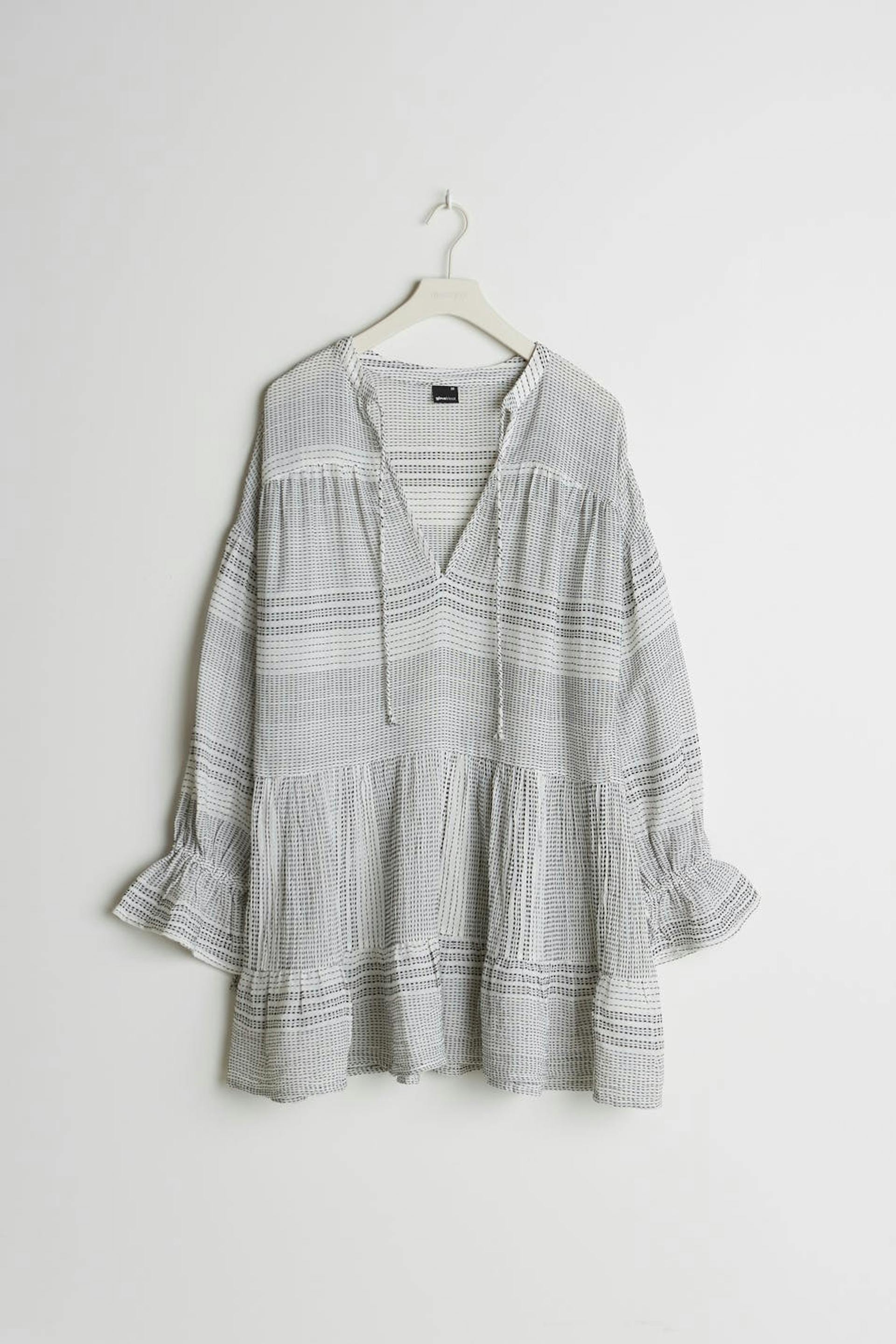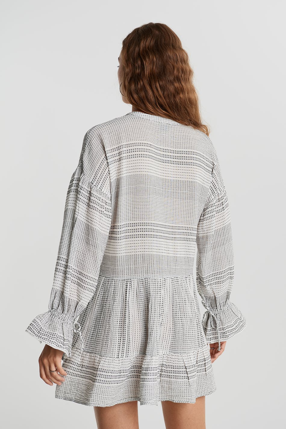 Lyhyt mekko röyhelöillä hihansuissa ja hameessa. Mekko on valkoinen ja pitkähihainen ja siinä on nauhayksityiskohta kaula-aukossa.