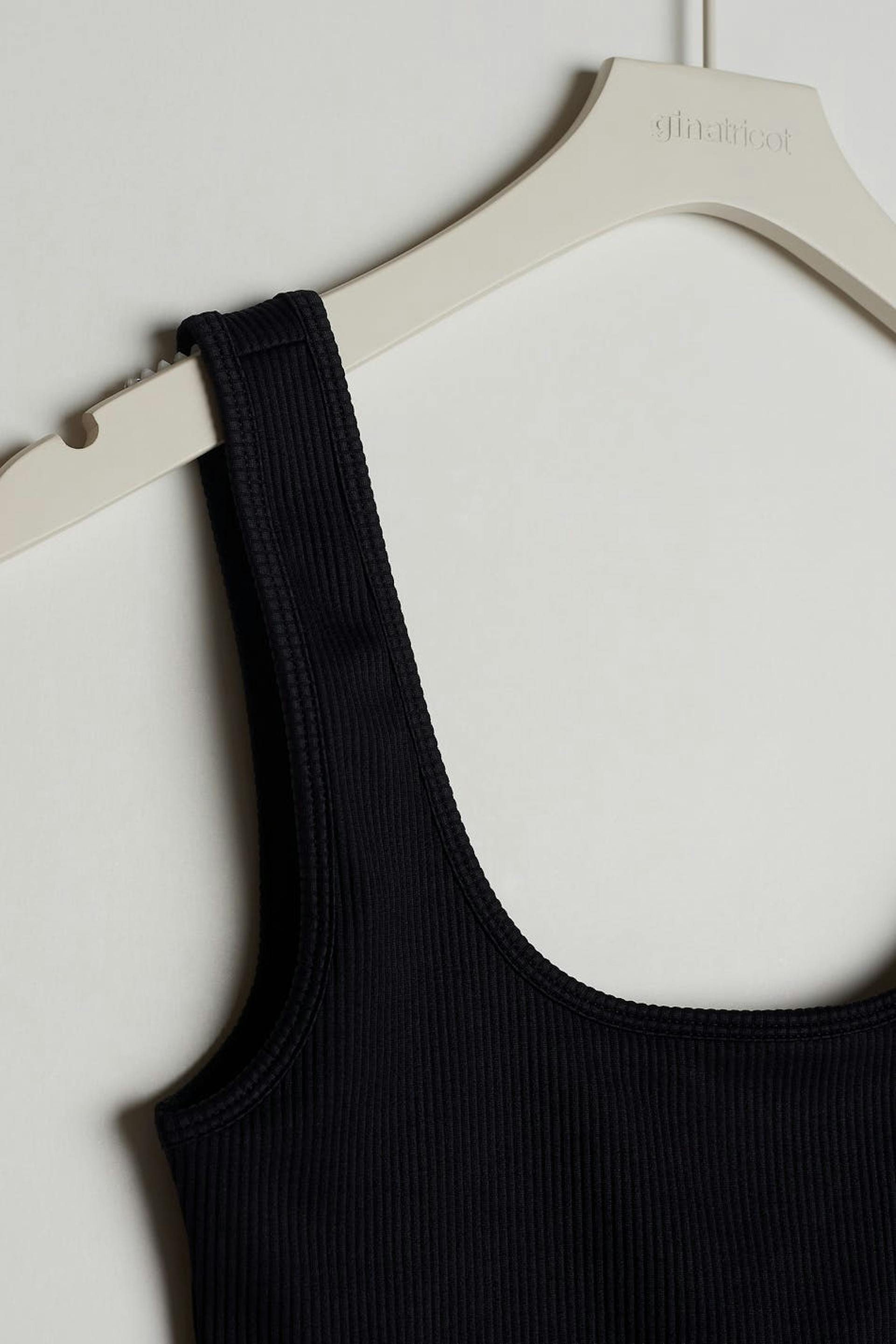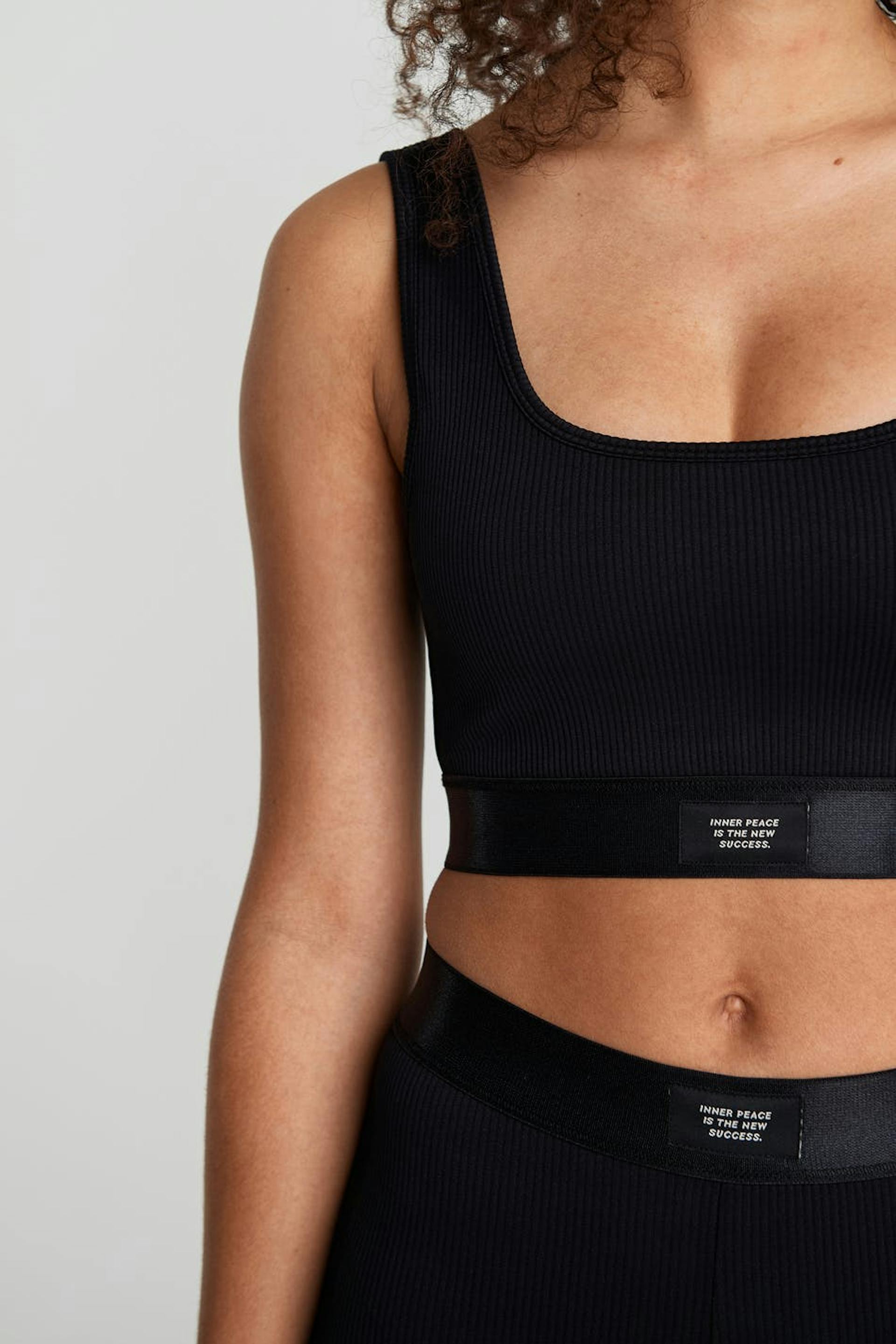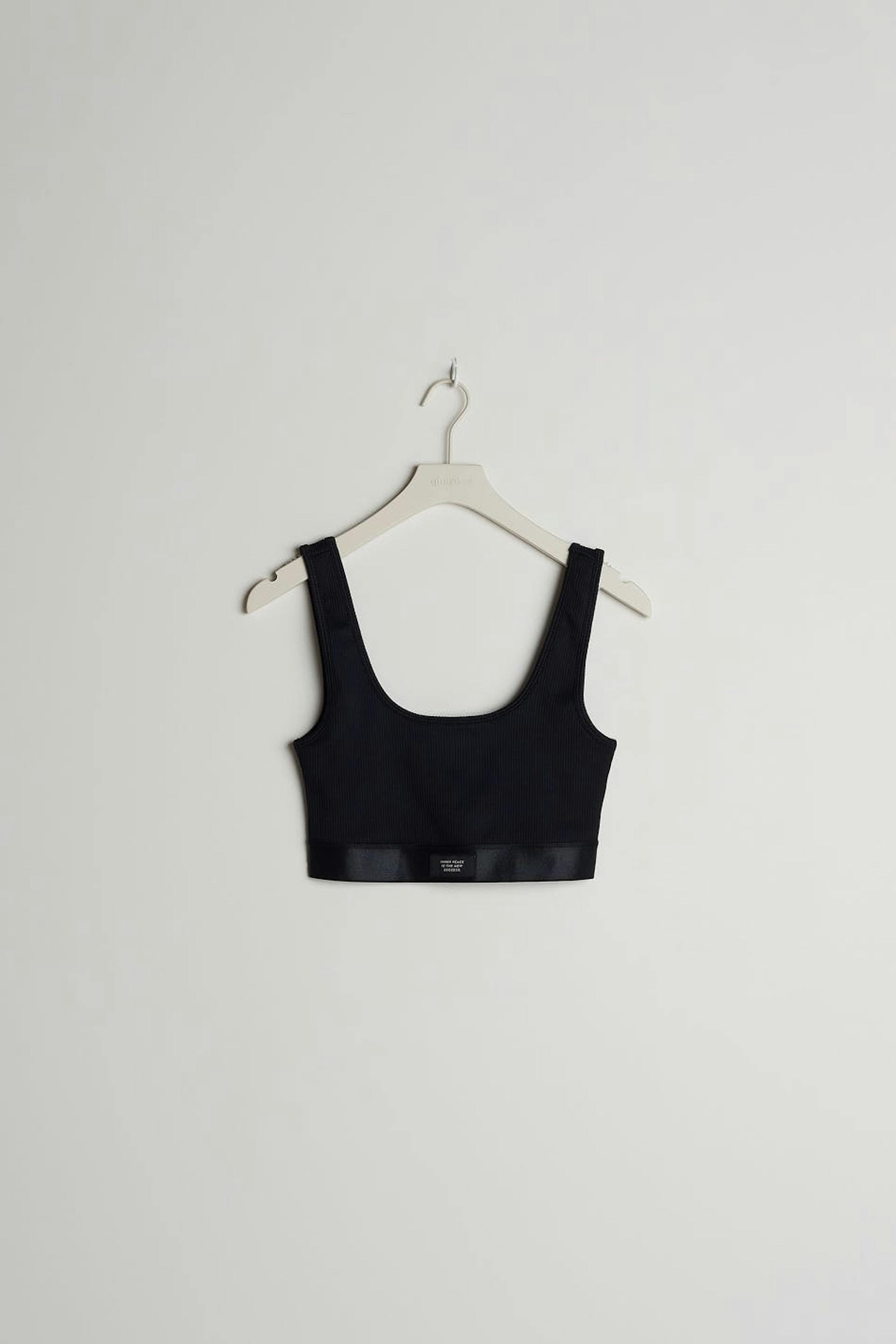 Pehmeä toppi vartalonmyötäisellä istuvuudella. Toppi on musta ja lyhyt ja siinä on pinnoitettu materiaali trikoosta. Siinä on joustonauha helmassa.