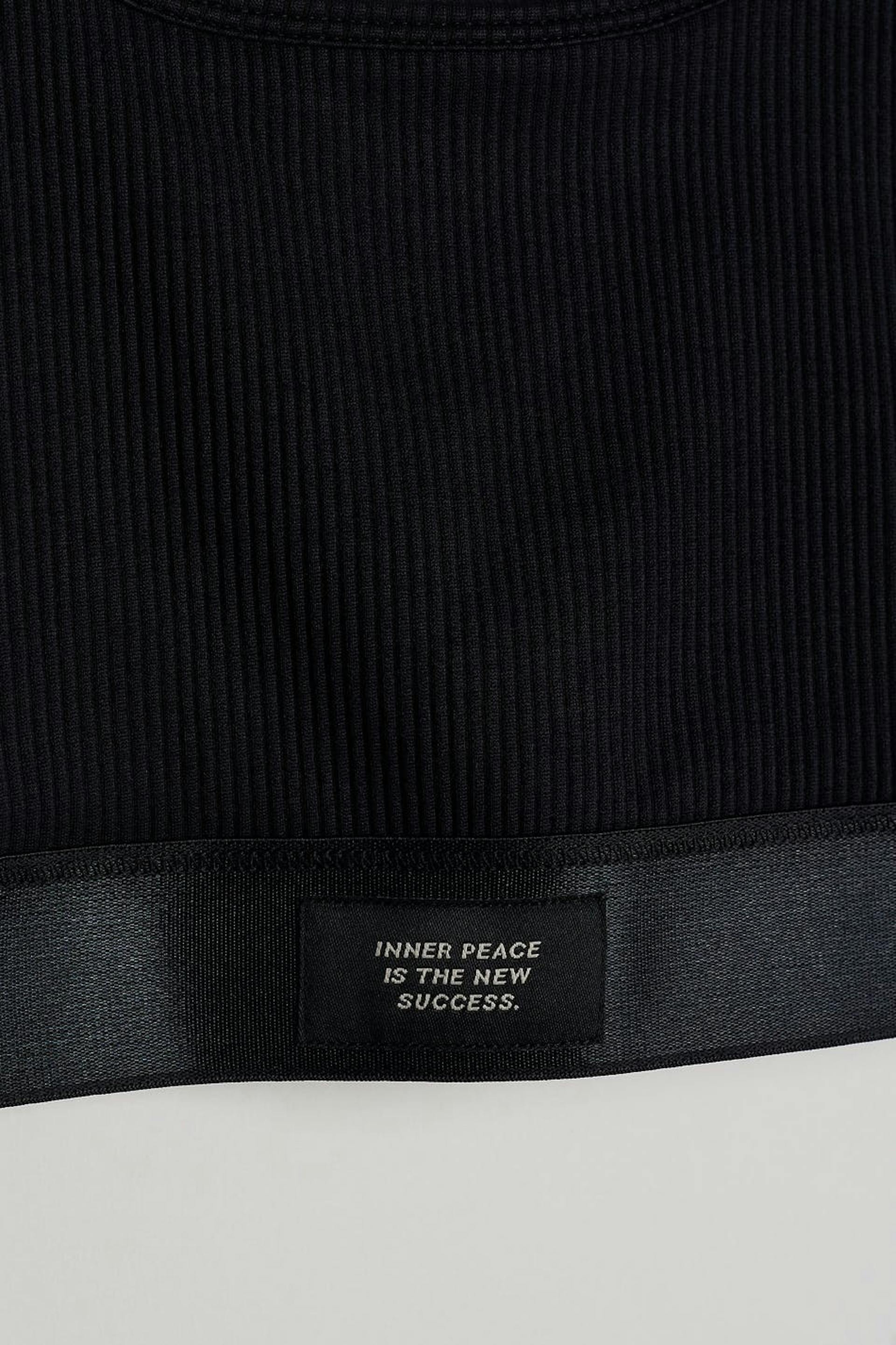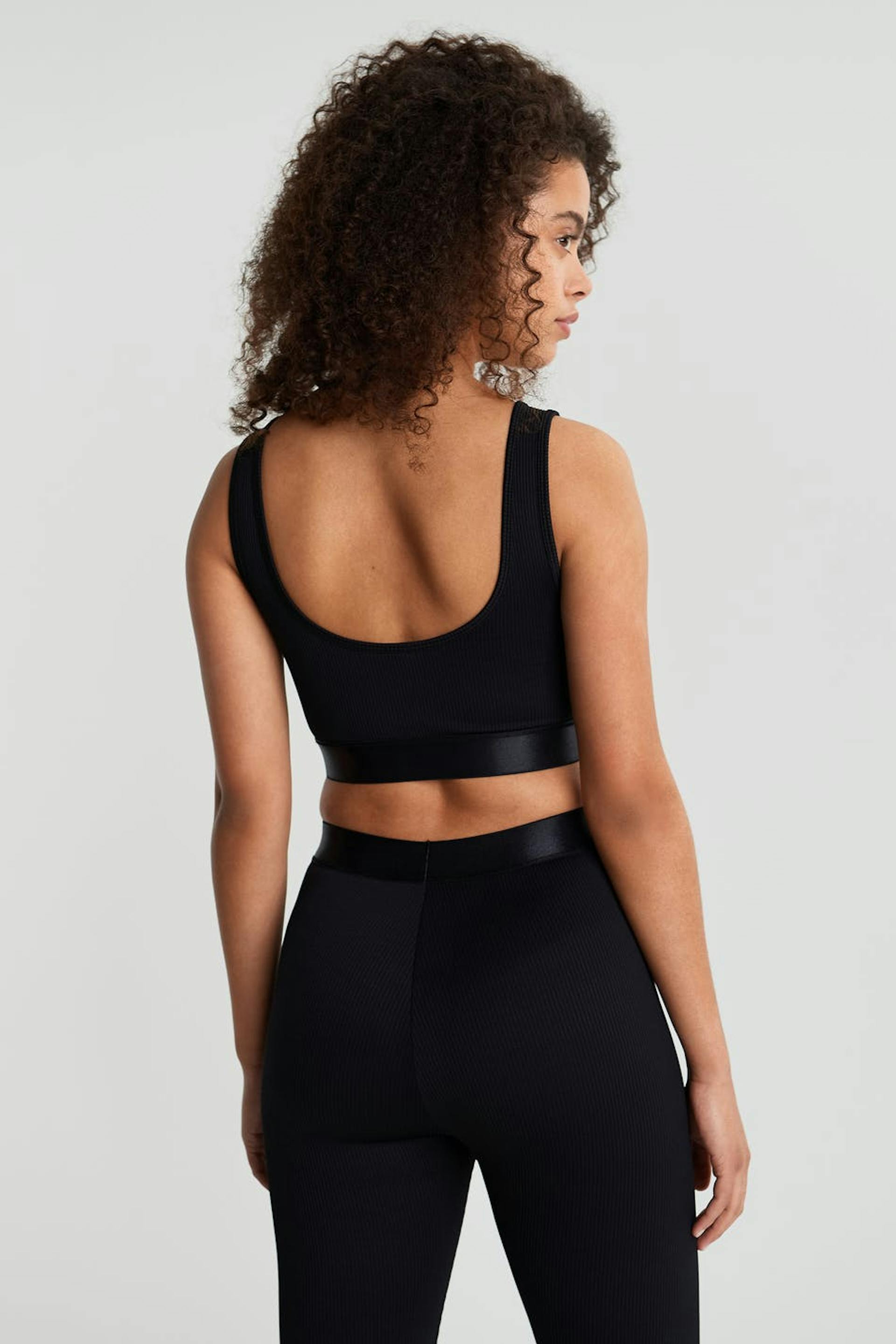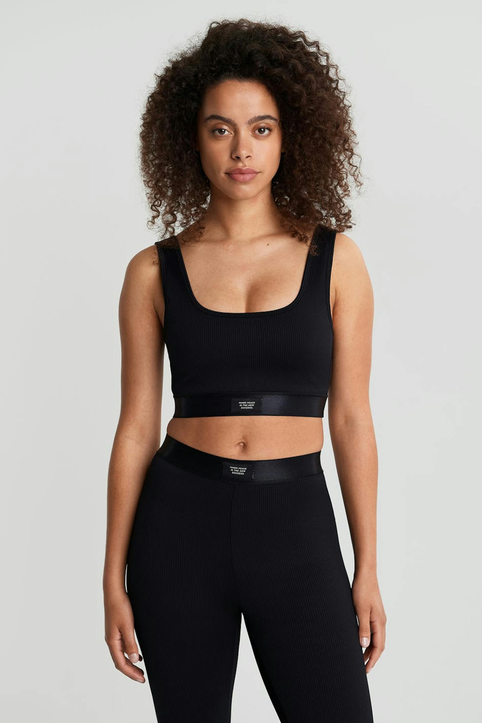 Pehmeä toppi vartalonmyötäisellä istuvuudella. Toppi on musta ja lyhyt ja siinä on pinnoitettu materiaali trikoosta. Siinä on joustonauha helmassa.