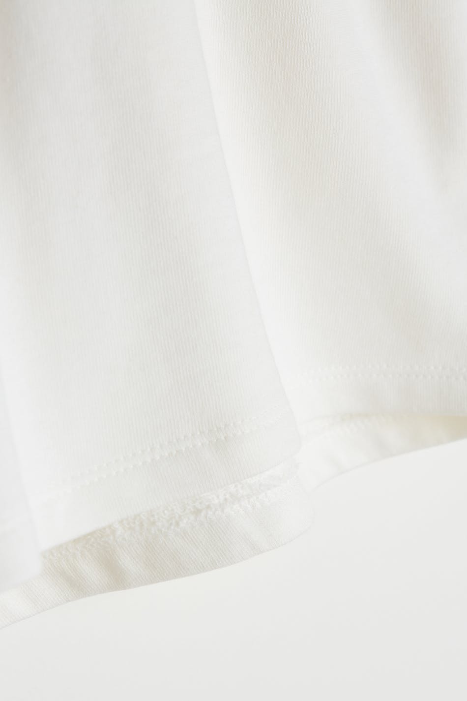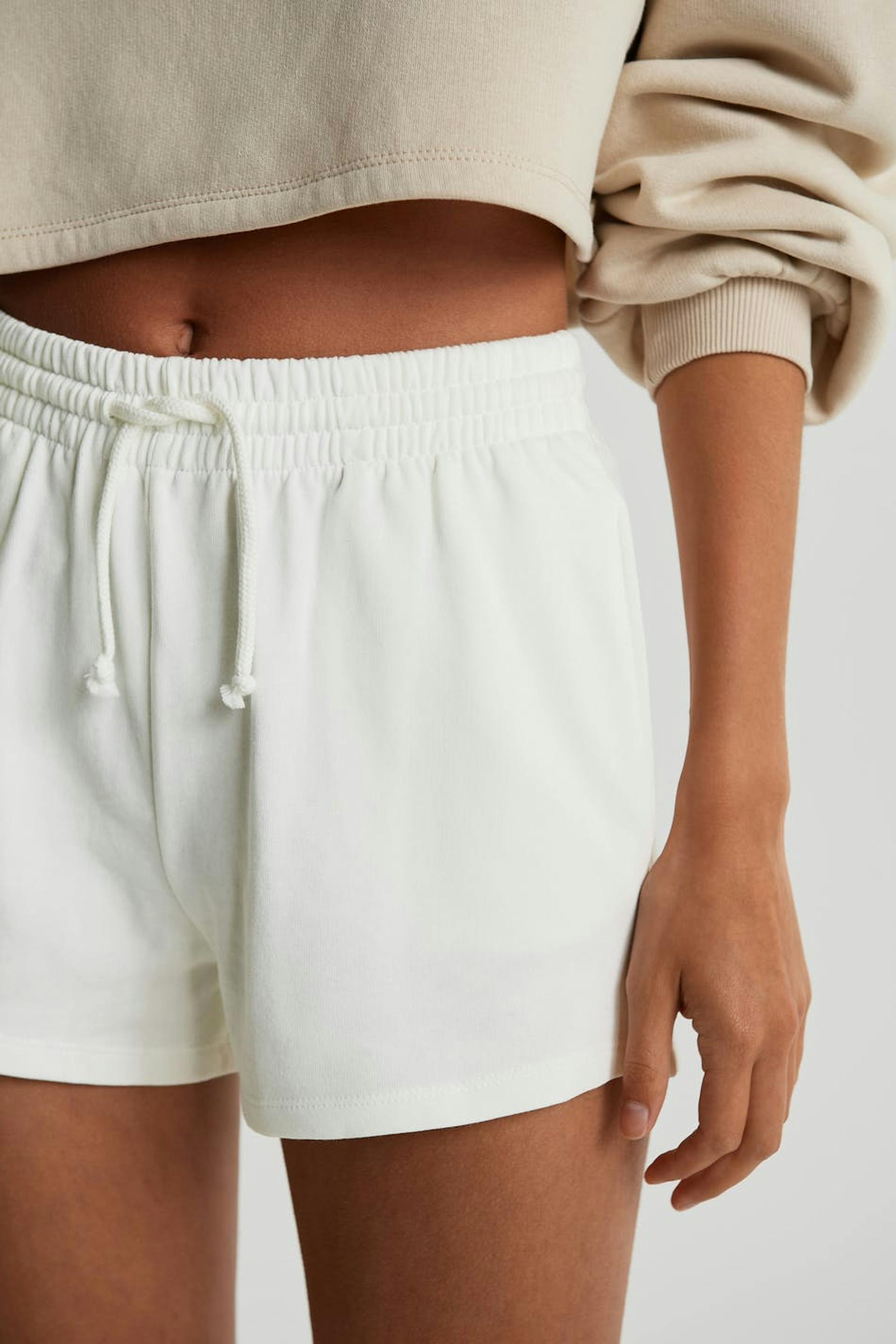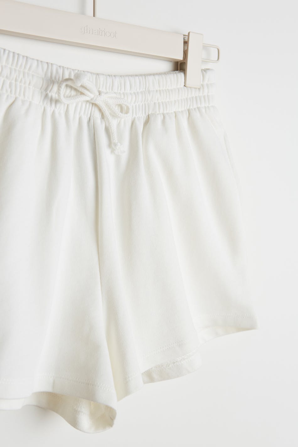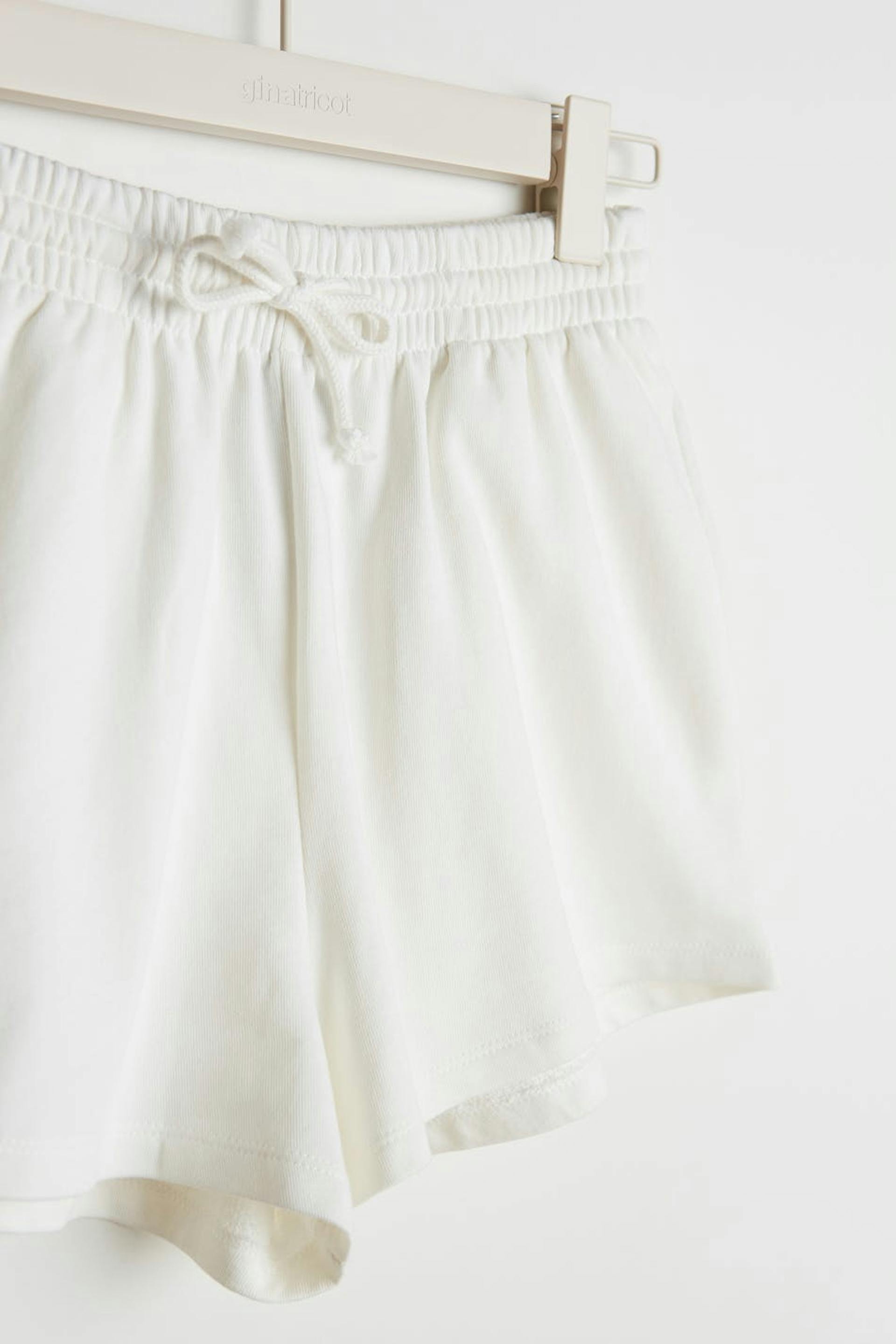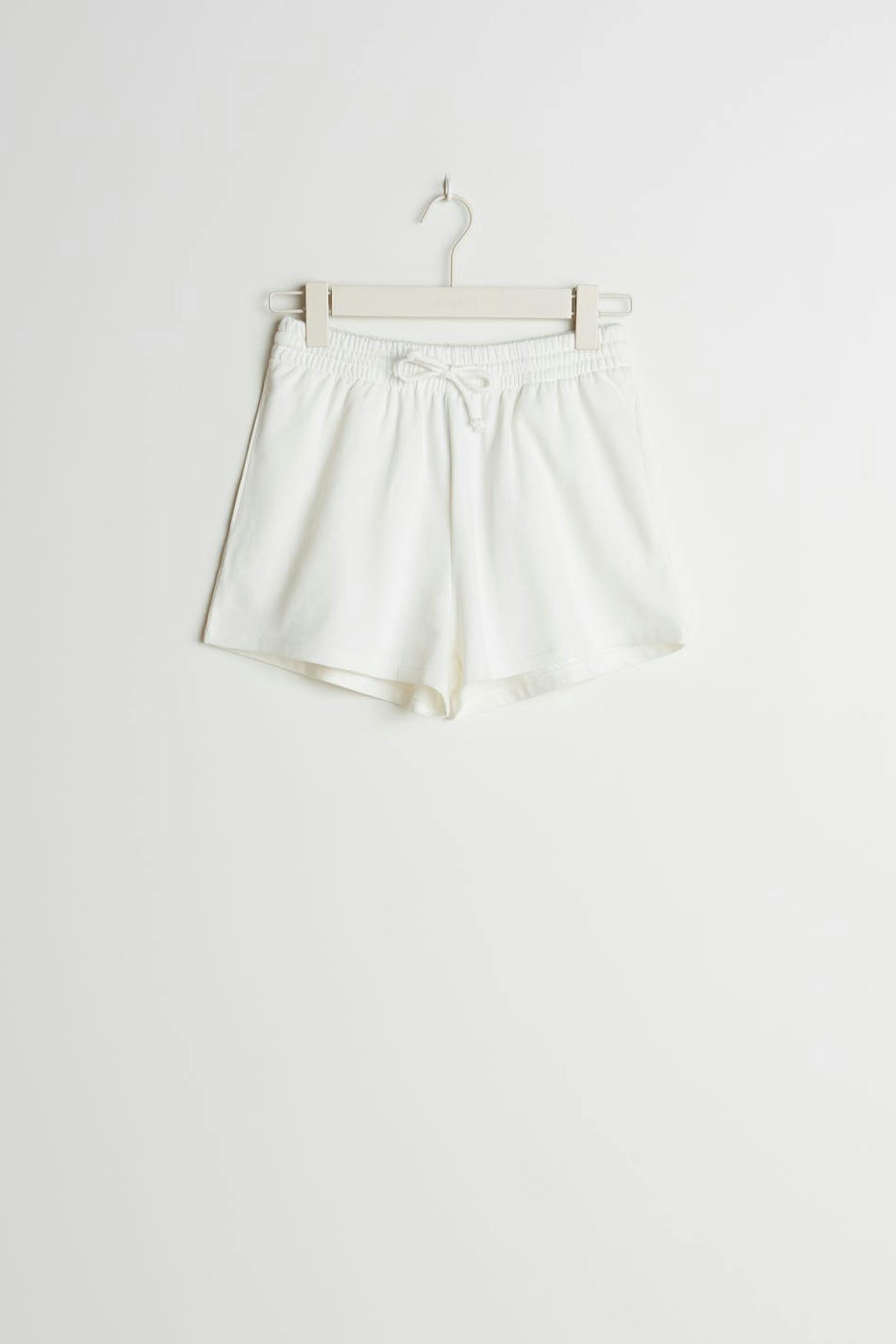 Lyhyet shortsit normaalilla leikkauksella. Shortsit ovat valkoisia ja pehmeitä ja niissä on vyötärö kuminauhasta kiristysnyörillä. Ne valmistetaan collegekankaasta.