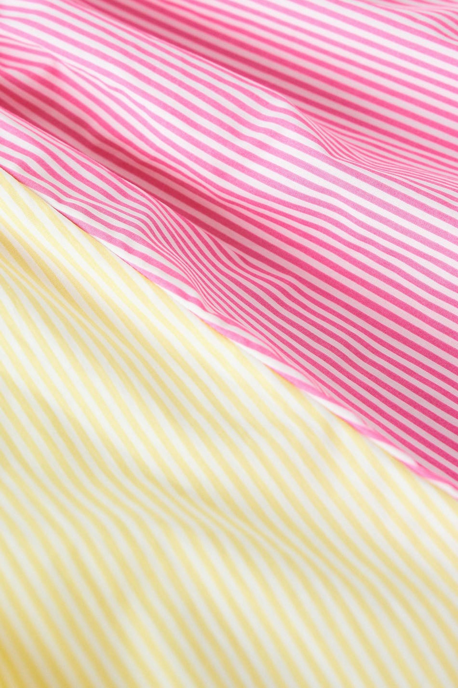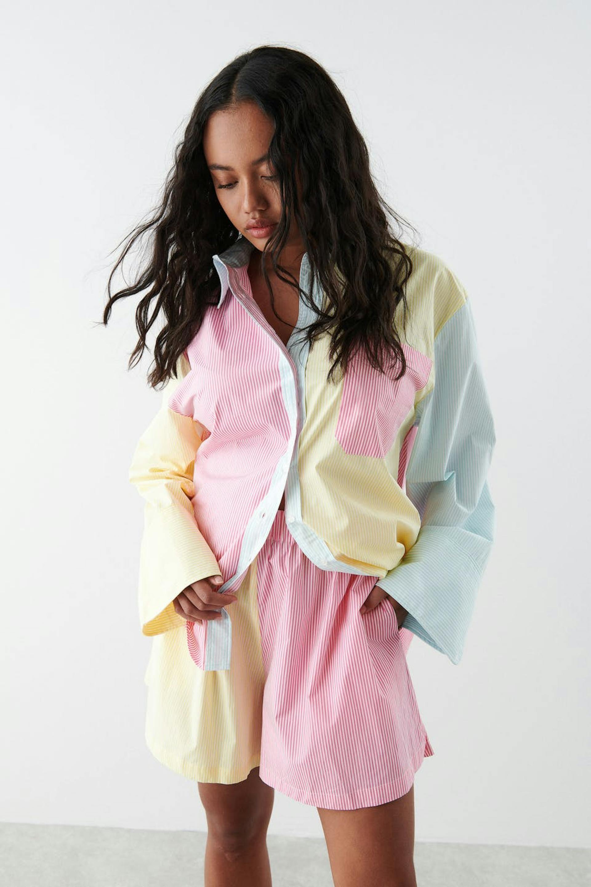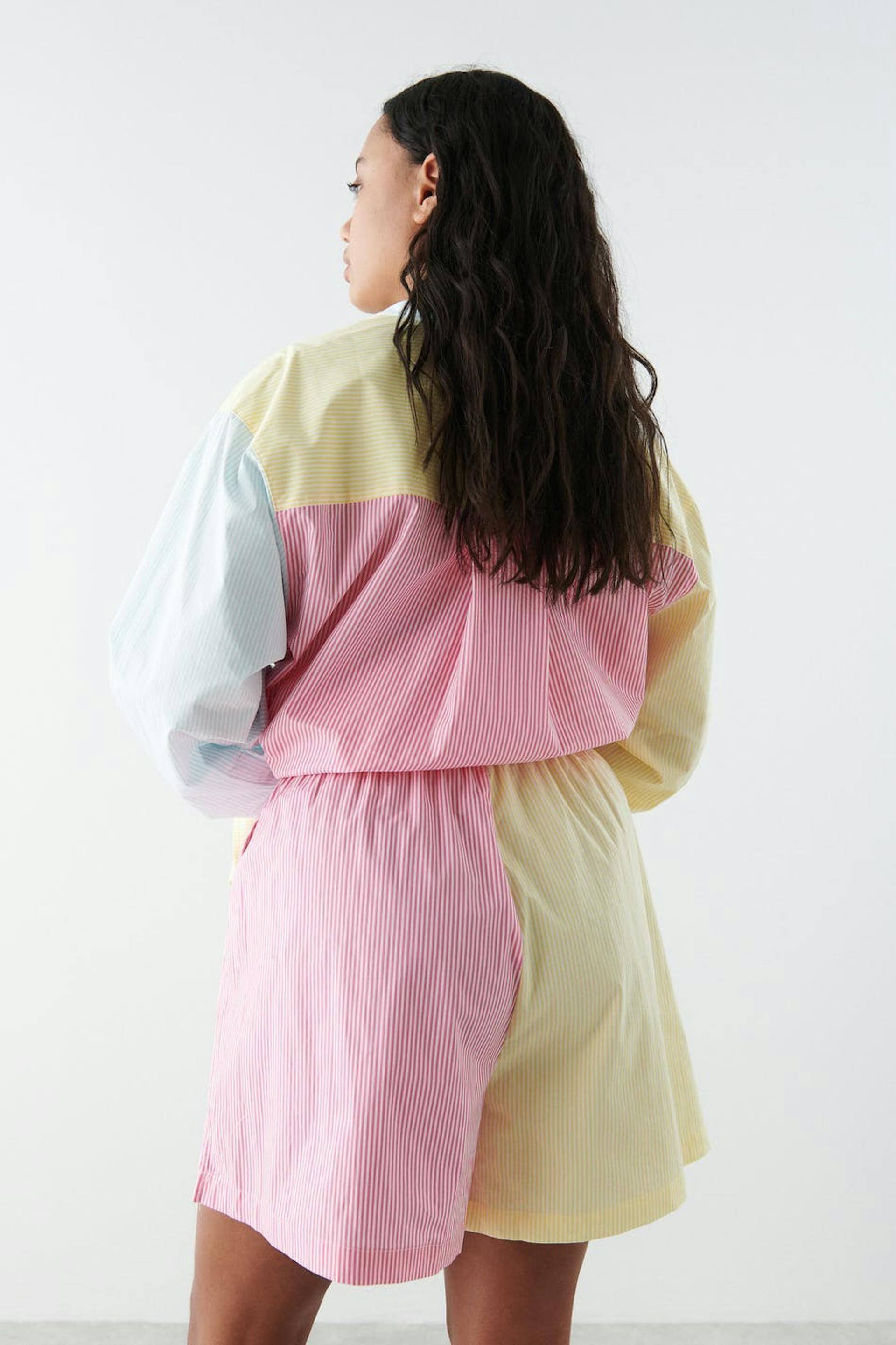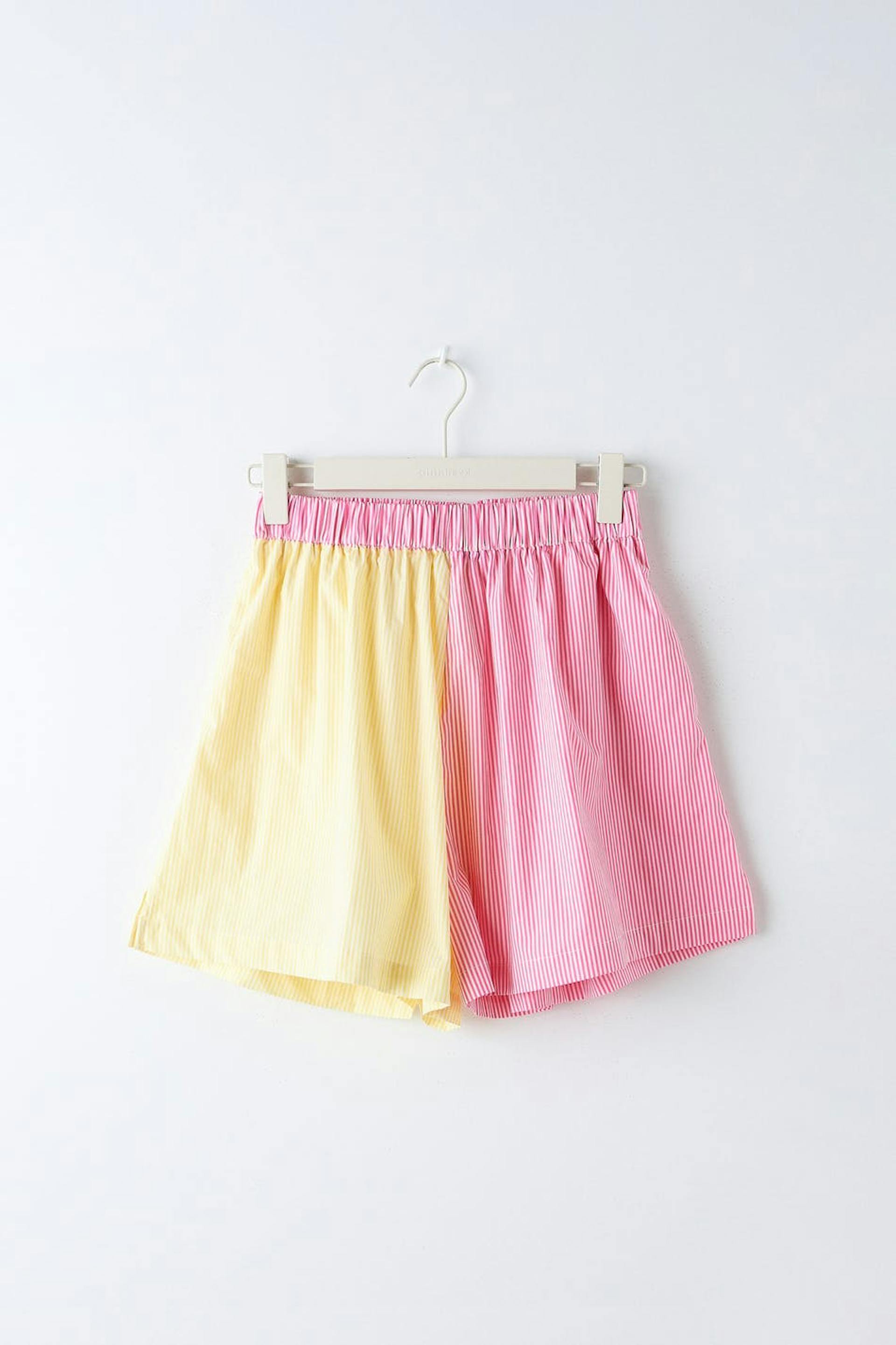 Raidalliset shortsit popliinista korkealla vyötäröllä. Shortsit ovat pinkkejä ja keltaisia ja niissä on laatikkomainen malli. Niissä on kuminauha vyötäröllä ja taskut sivuissa.