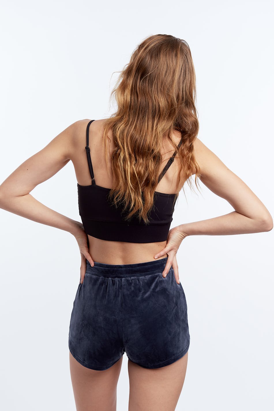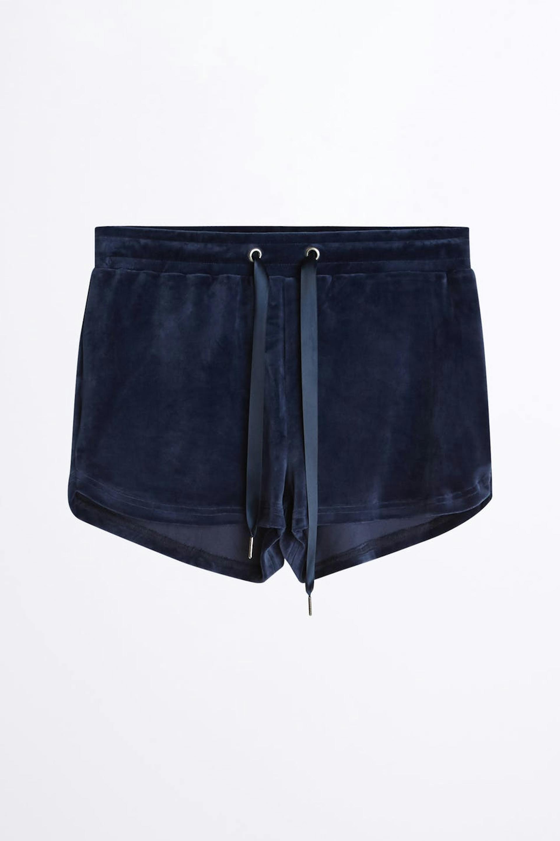 Lyhyet shortsit suoralla leikkauksella. Shortsit ovat tummansinisiä ja niissä on joustava vyötärö kiristysnyörillä satiinista. Ne valmistetaan veluurista. Helposti syttyvää materiaalia.