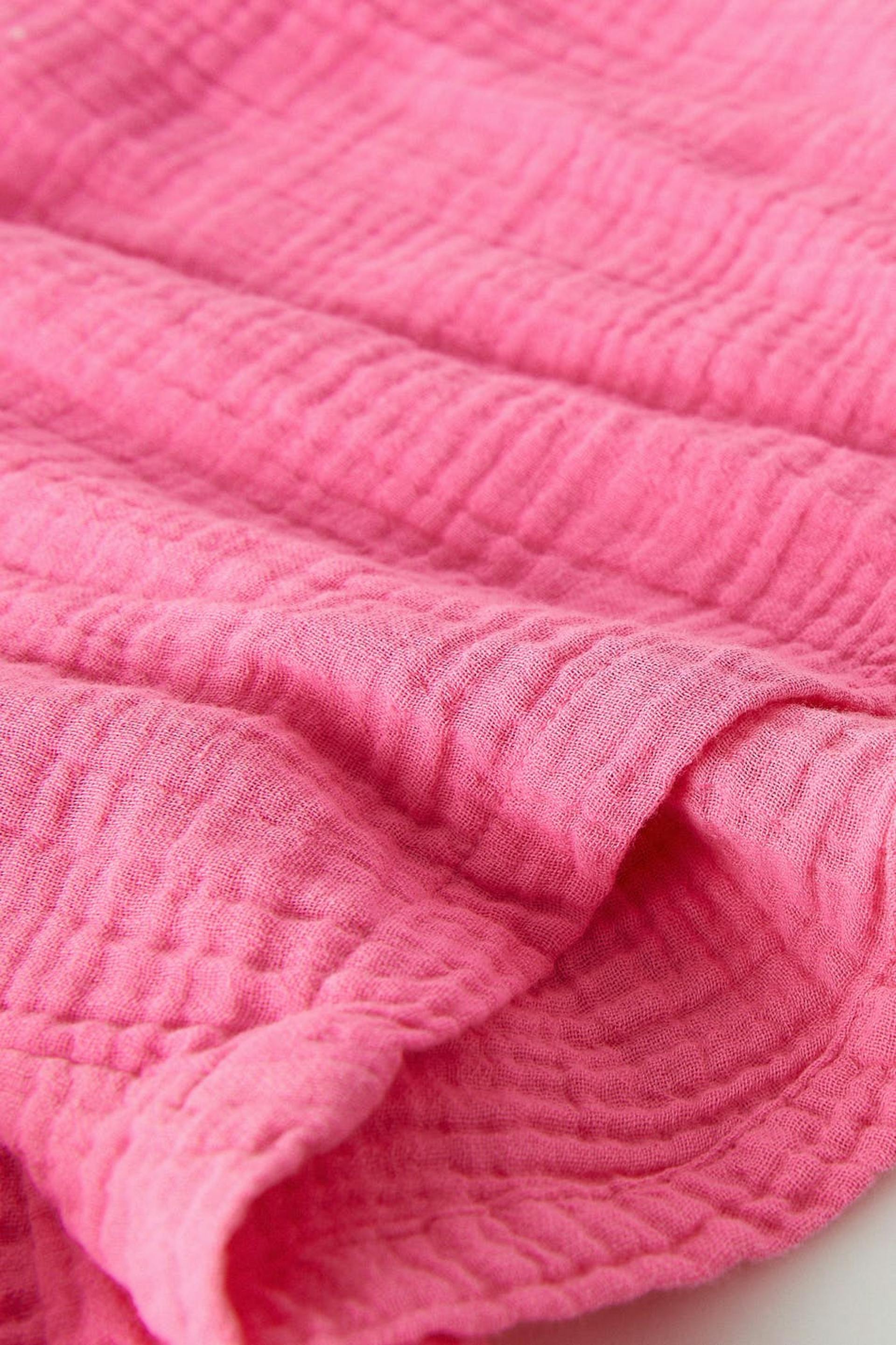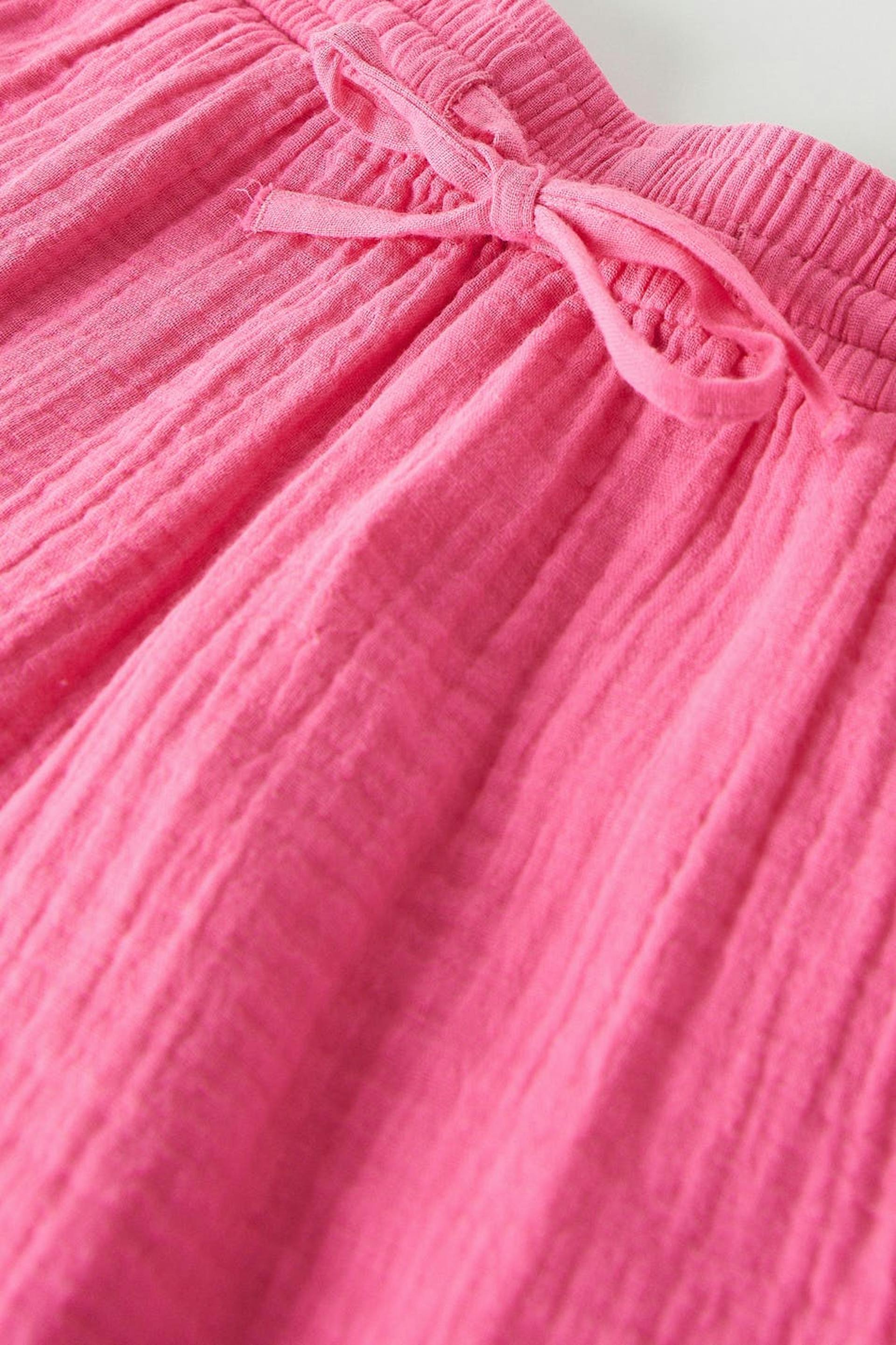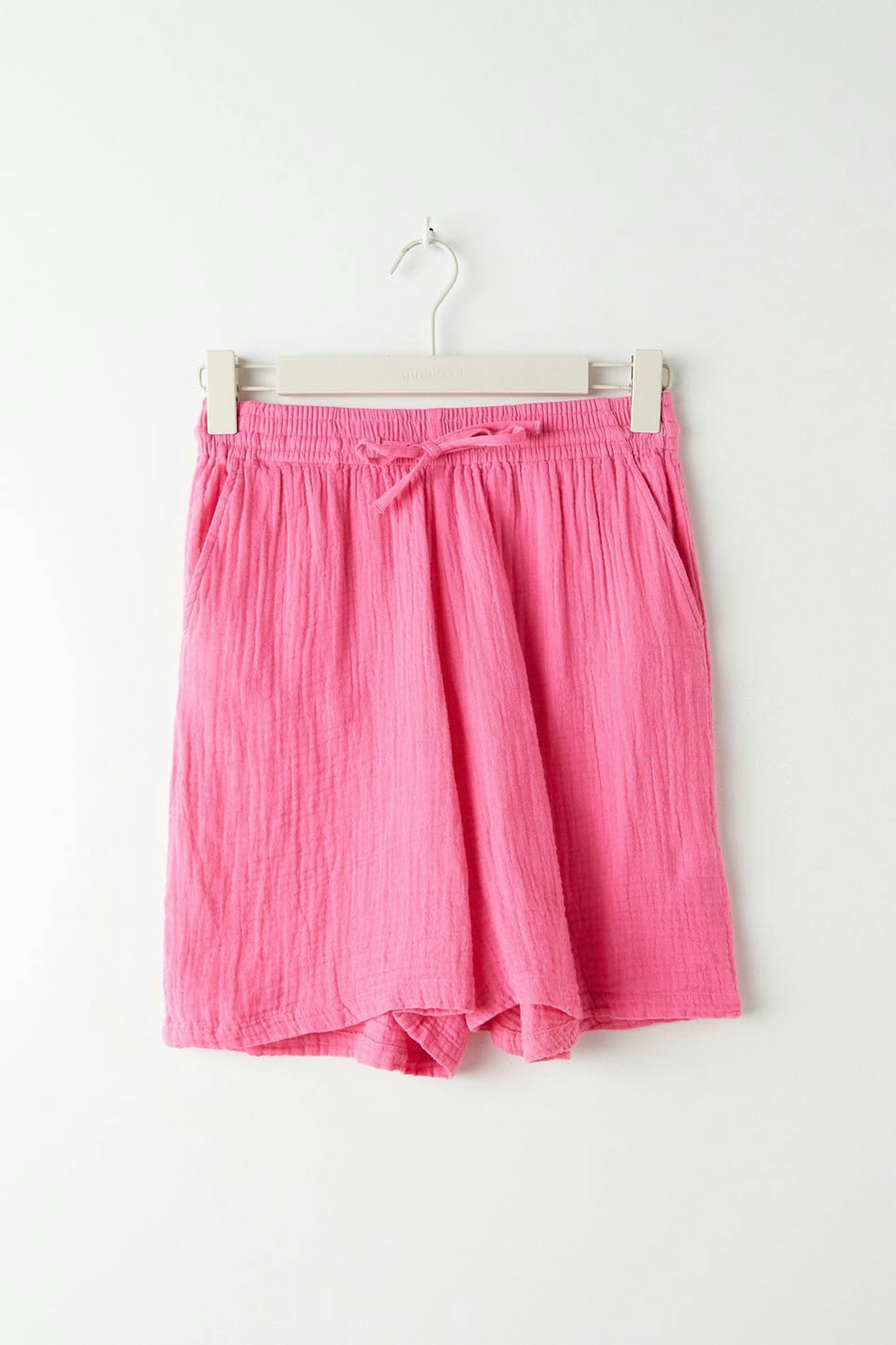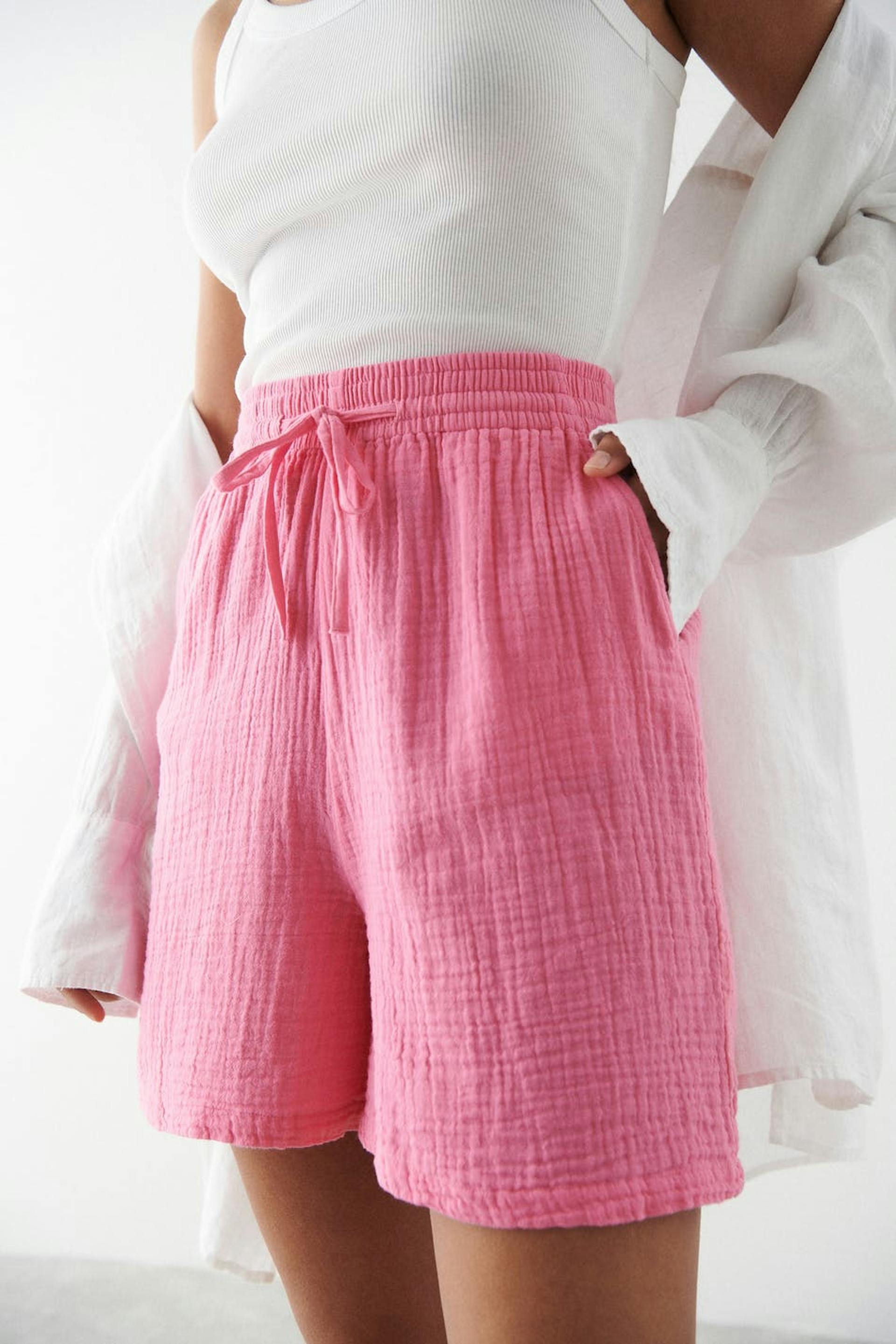 Pehmeät shortsit kudotusta puuvillakankaasta korkealla vyötäröllä. Shortsit ovat pinkkejä ja niissä on taskut sivuissa. Niissä on kuminauha vyötäröllä kiristysnyörillä.