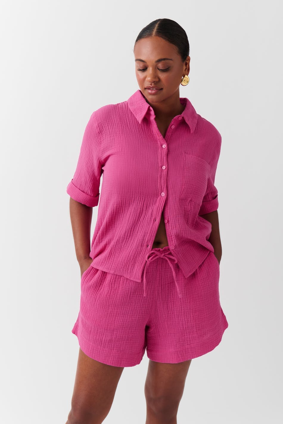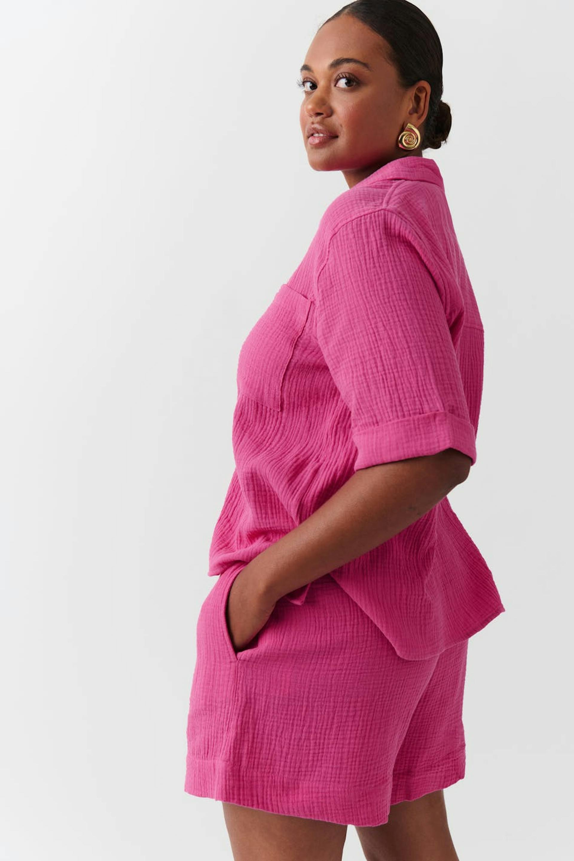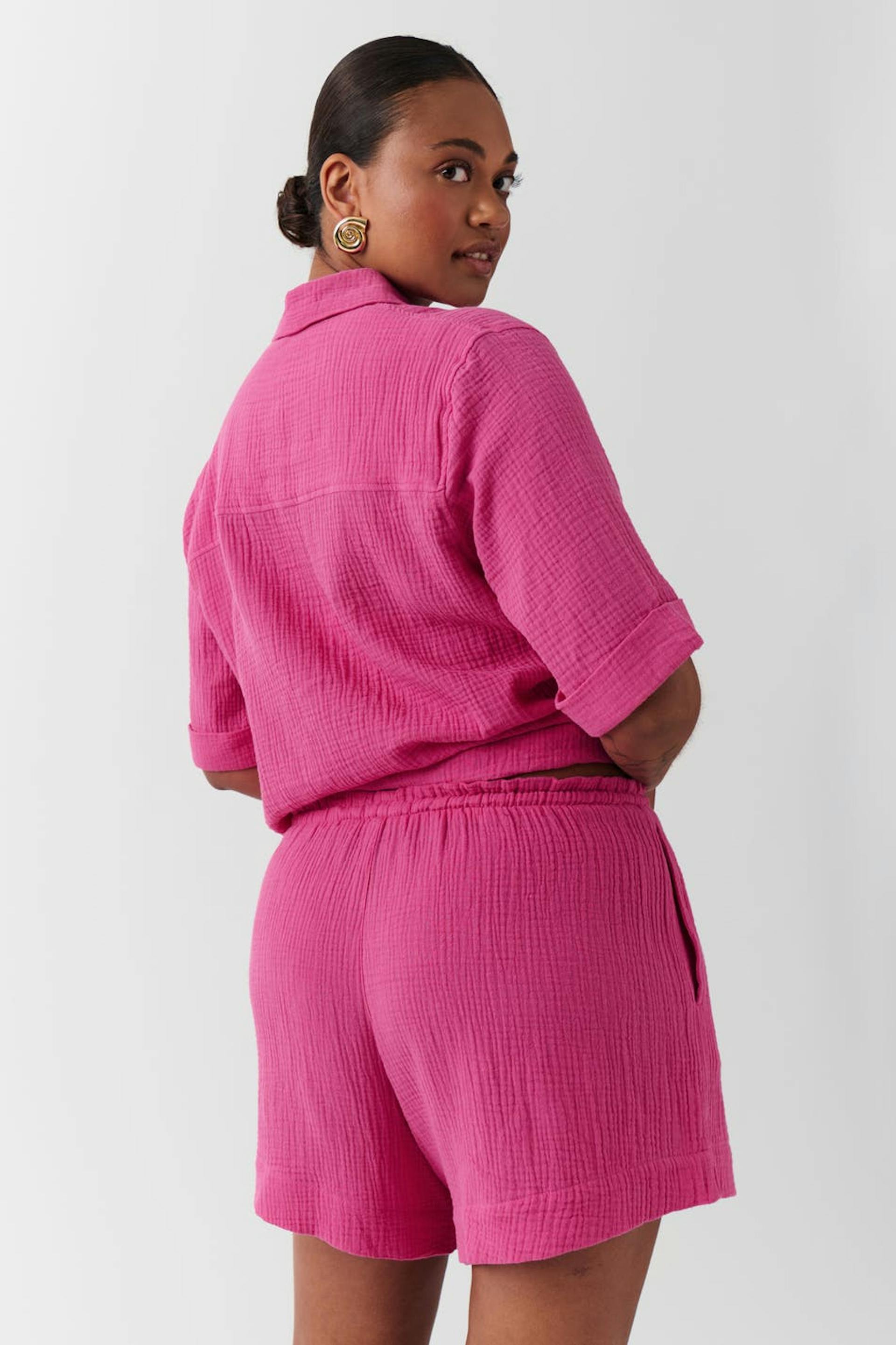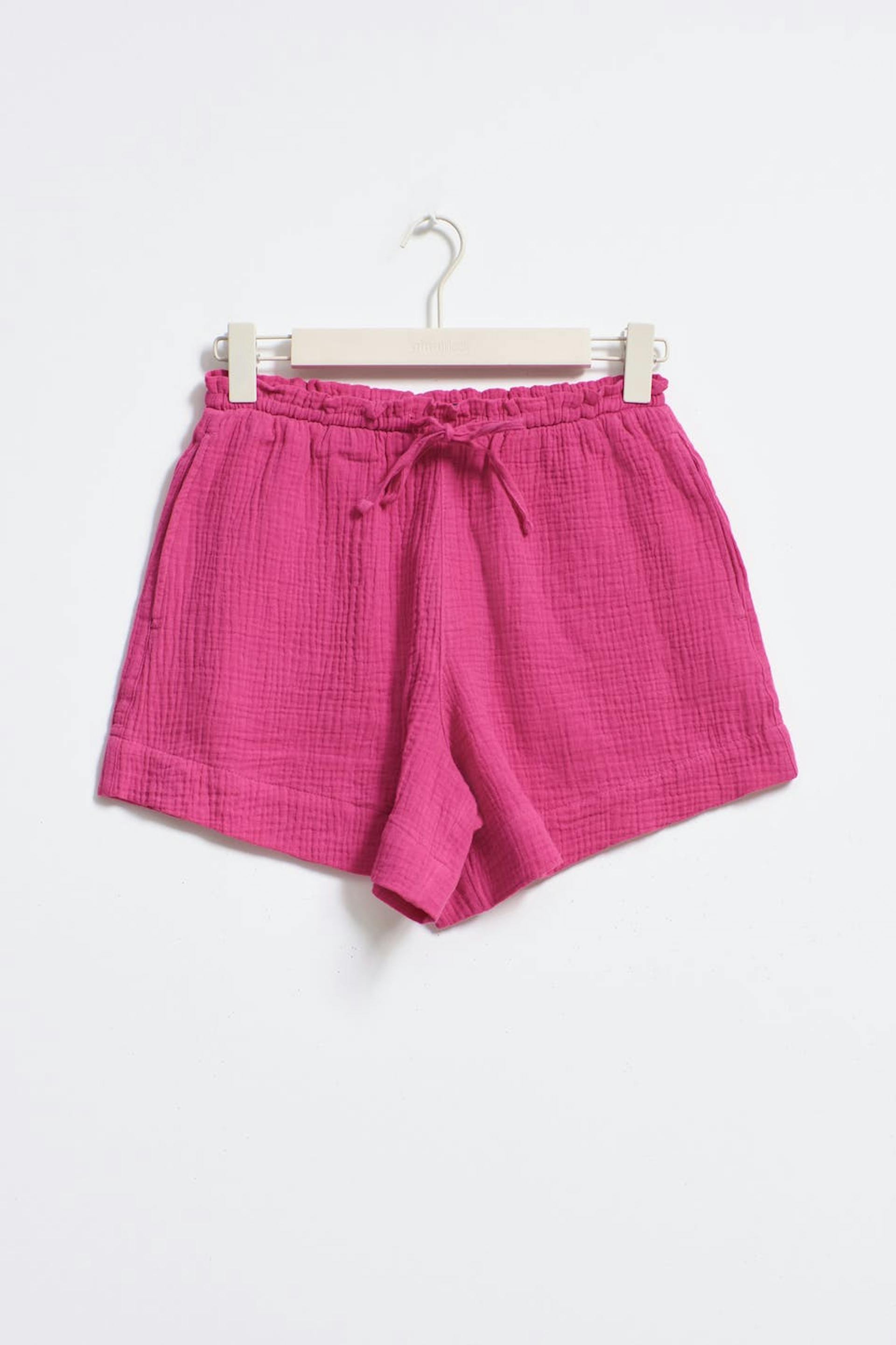 Lyhyet shortsit puuvillasta solmittavalla vyöllä edessä. Shortsit ovat pinkkejä ja niissä on rakennemateriaali. Niissä on sivutaskut ja keskikorkea vyötärö kuminauhalla.