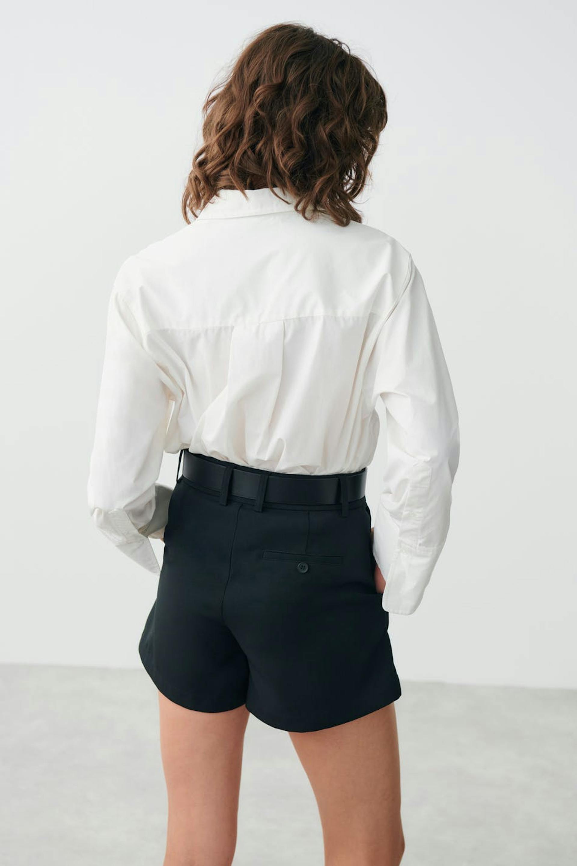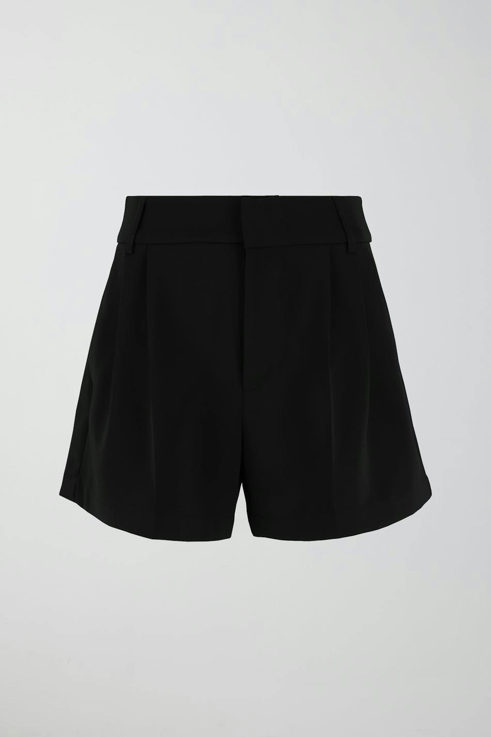 Shortsit kudotusta laadusta leveillä jaloilla. Shortsit ovat mustia ja niissä on korkea vyötärö. Niissä on vekit edessä, laskokset edessä, vetoketjusepalus, taskut sivuilla ja kahden kantin taskut napilla takana.