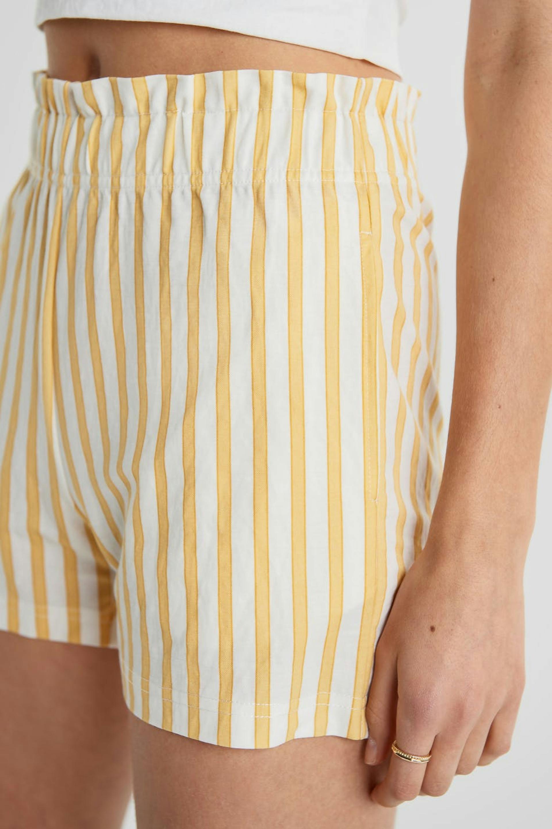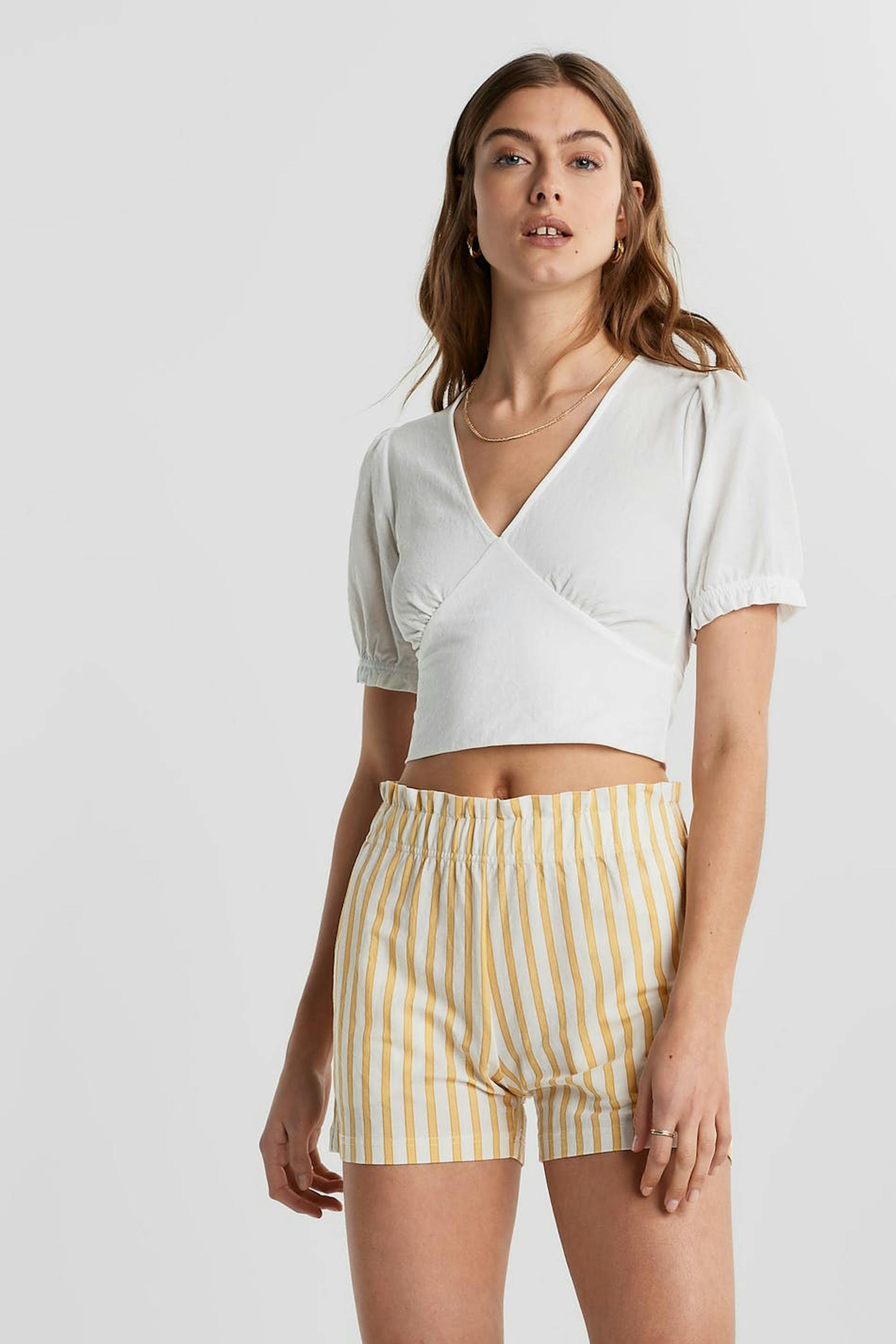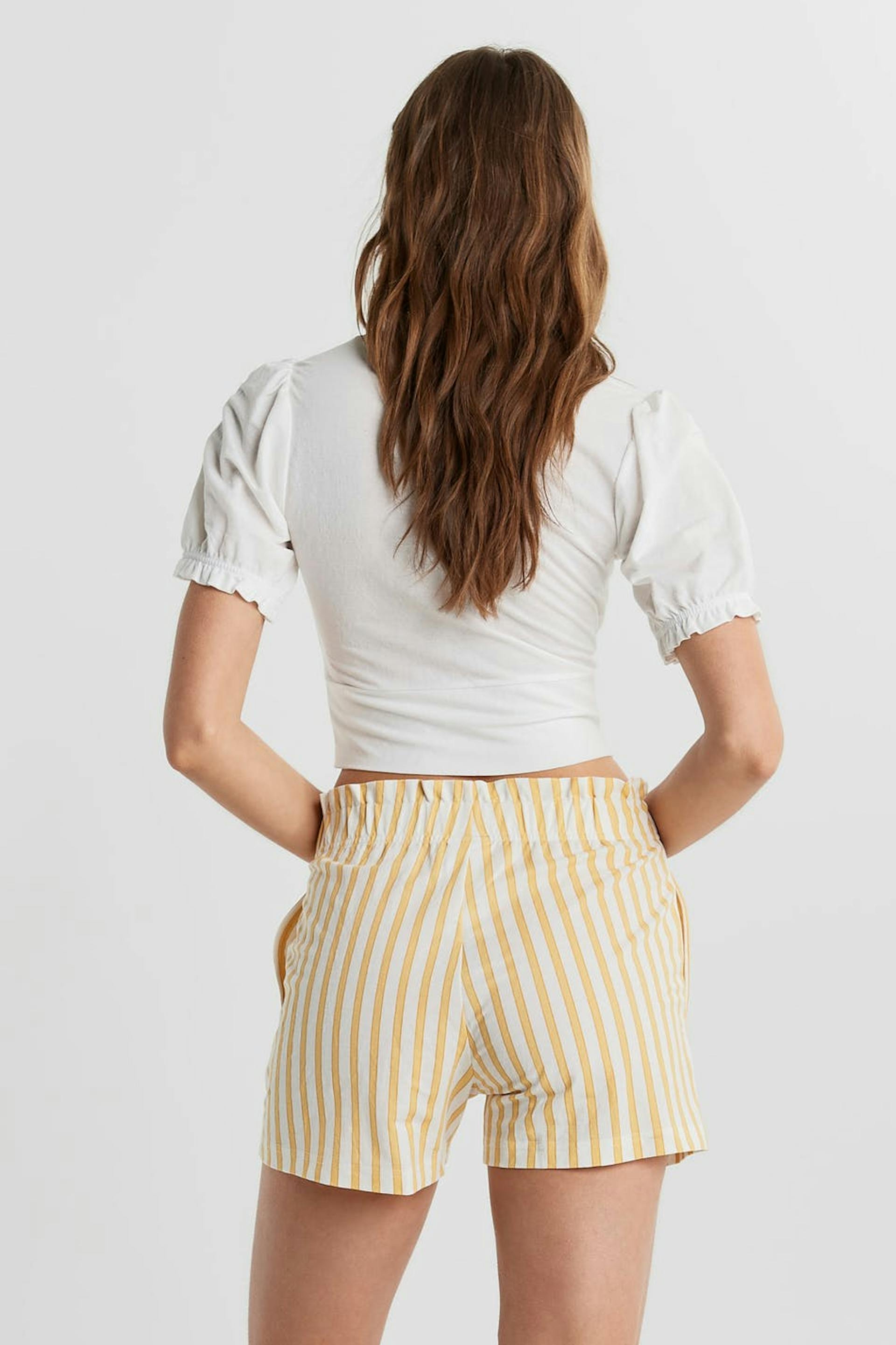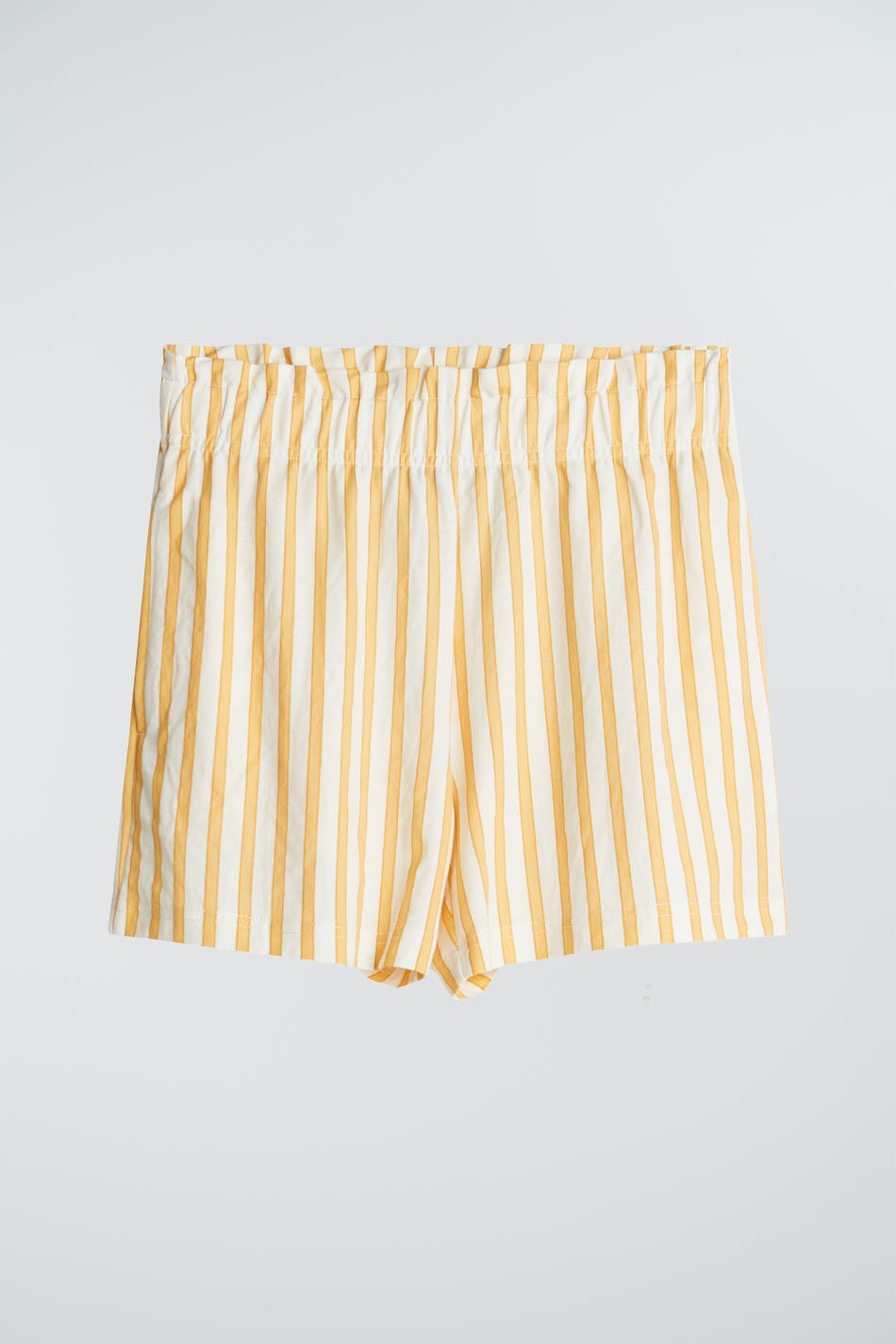 Raidalliset shortsit normaalilla leikkauksella. Shortsit ovat keltaisia, valkoisia ja lyhyitä. Ne valmistetaan trikoosta ja niissä on joustava vyötärö.