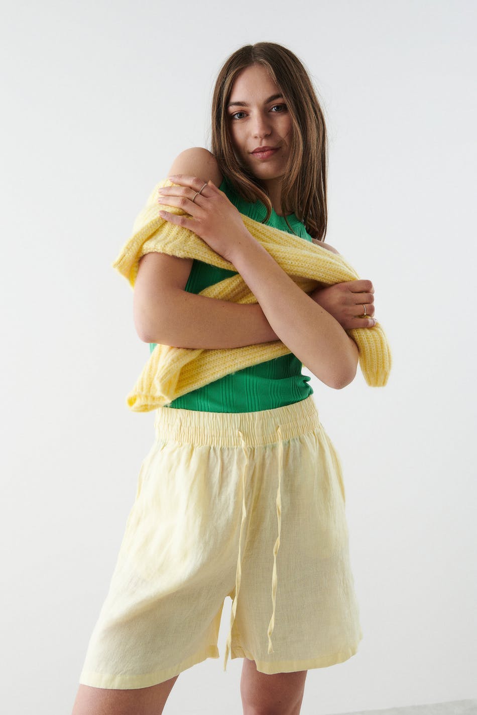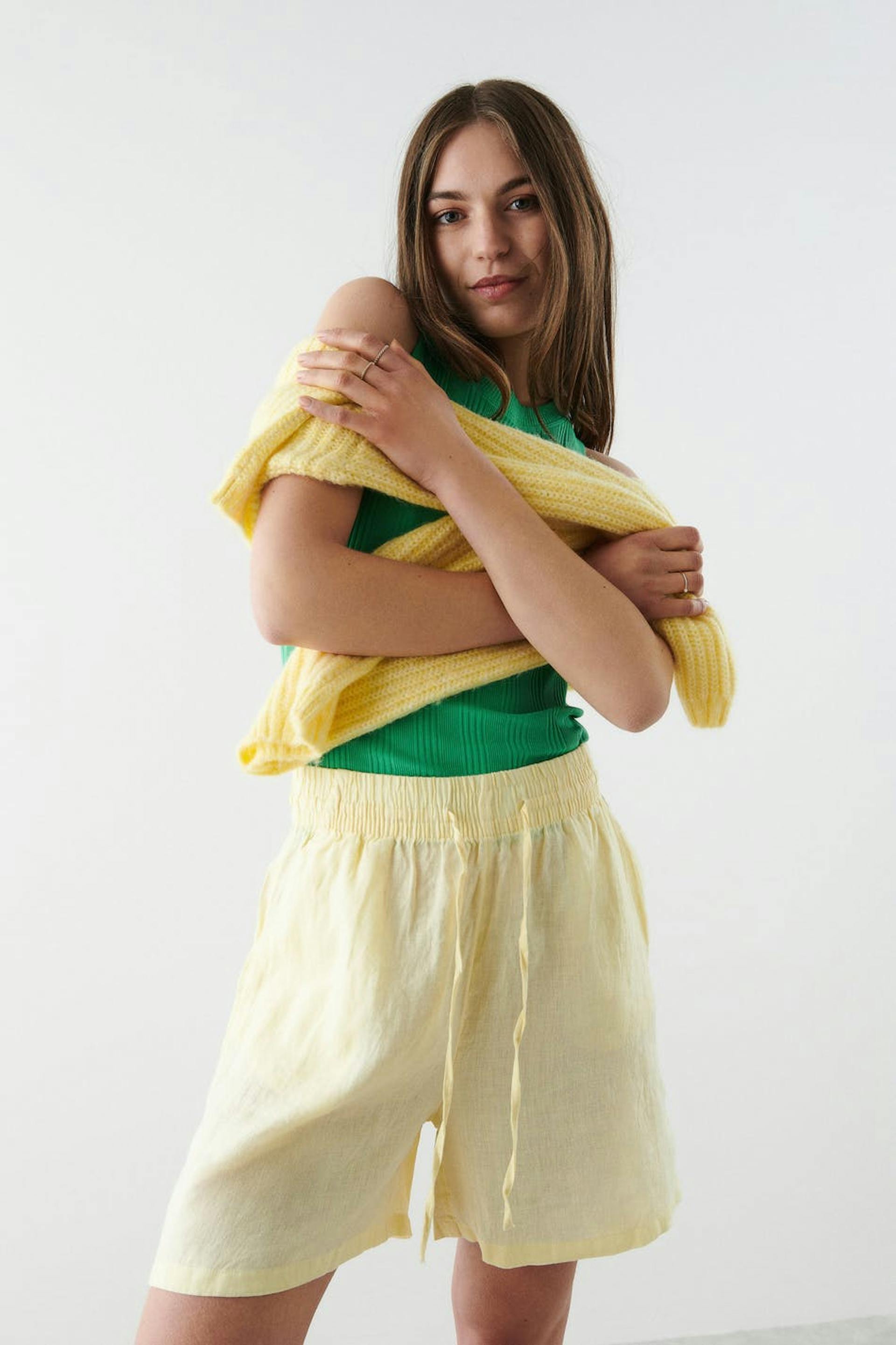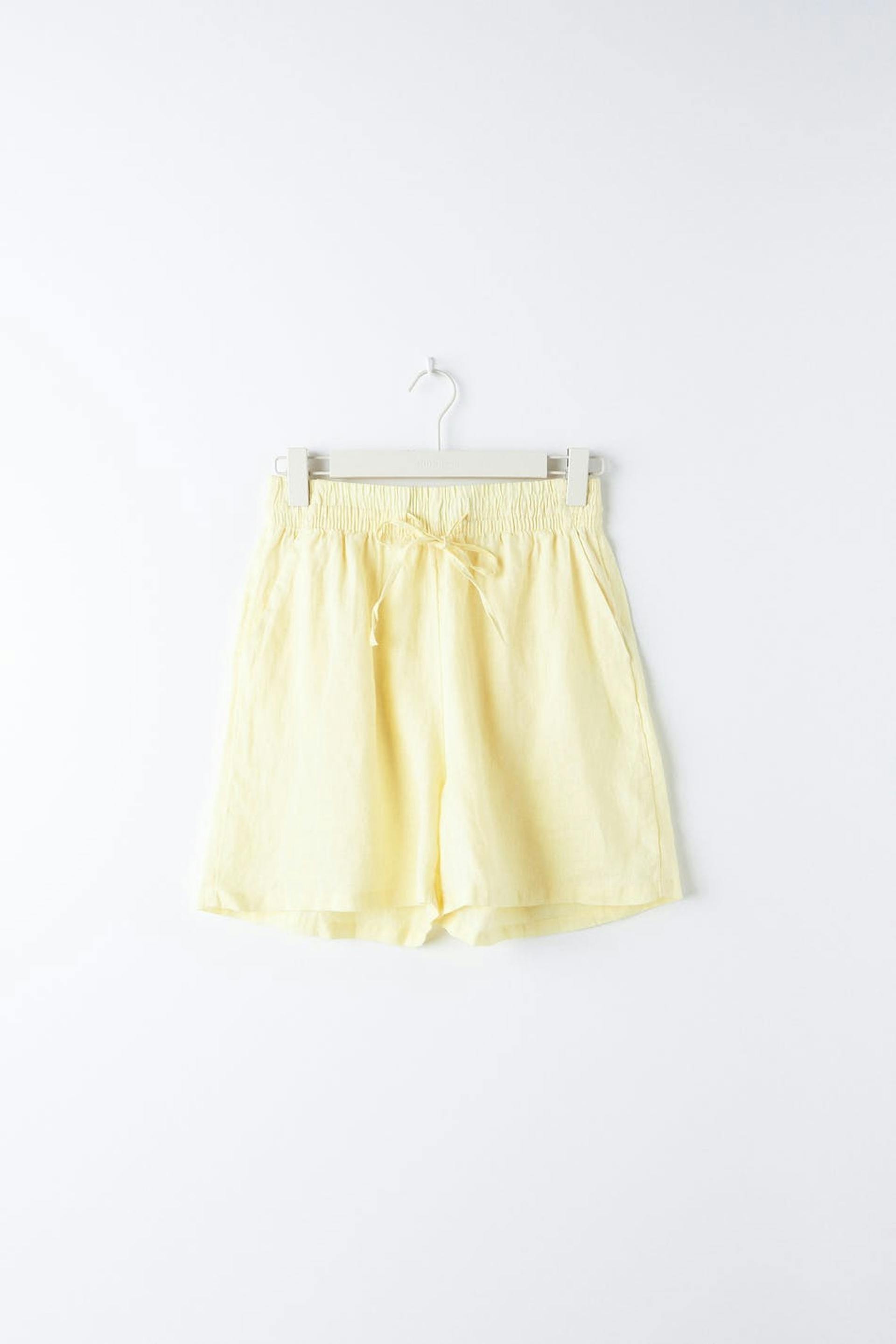 Pellavashortsit korkealla vyötäröllä. Shortsit ovat keltaisia ja niissä on taskut sivuissa. Niissä on kudottu laatu pellavasta, kuminauha vyötäröllä ja säädettävä kiristysnyöri solmittavalla vyöllä edessä.