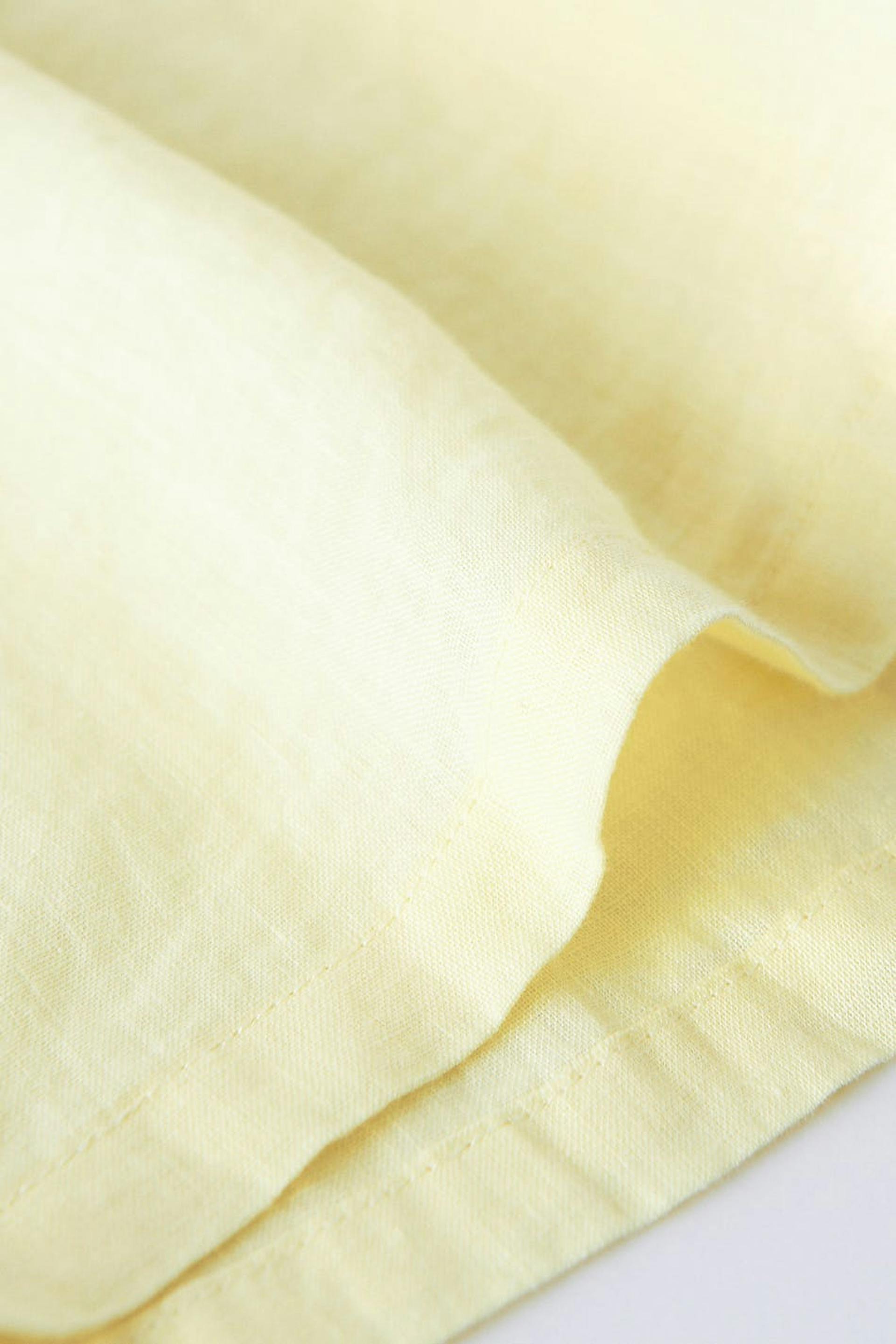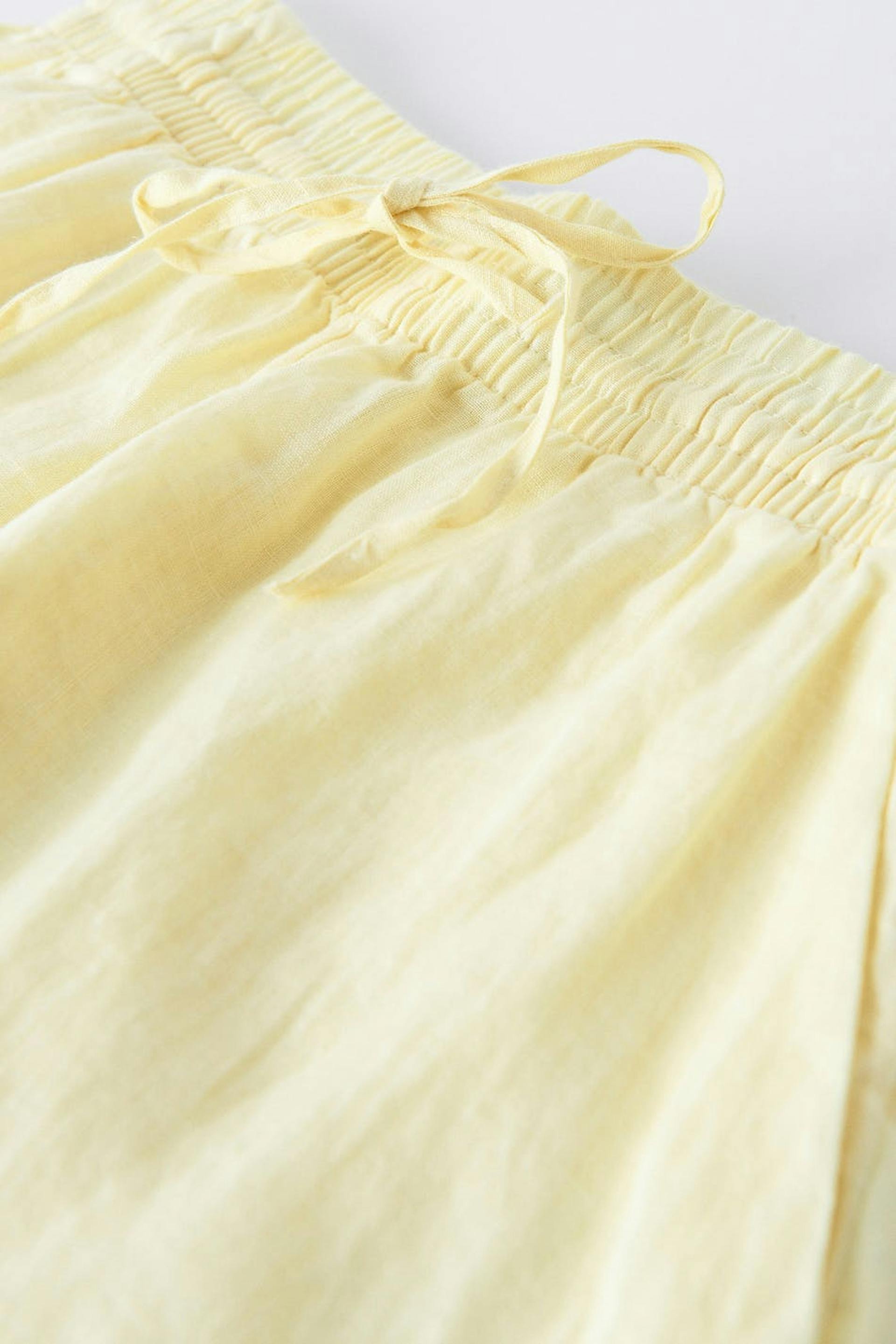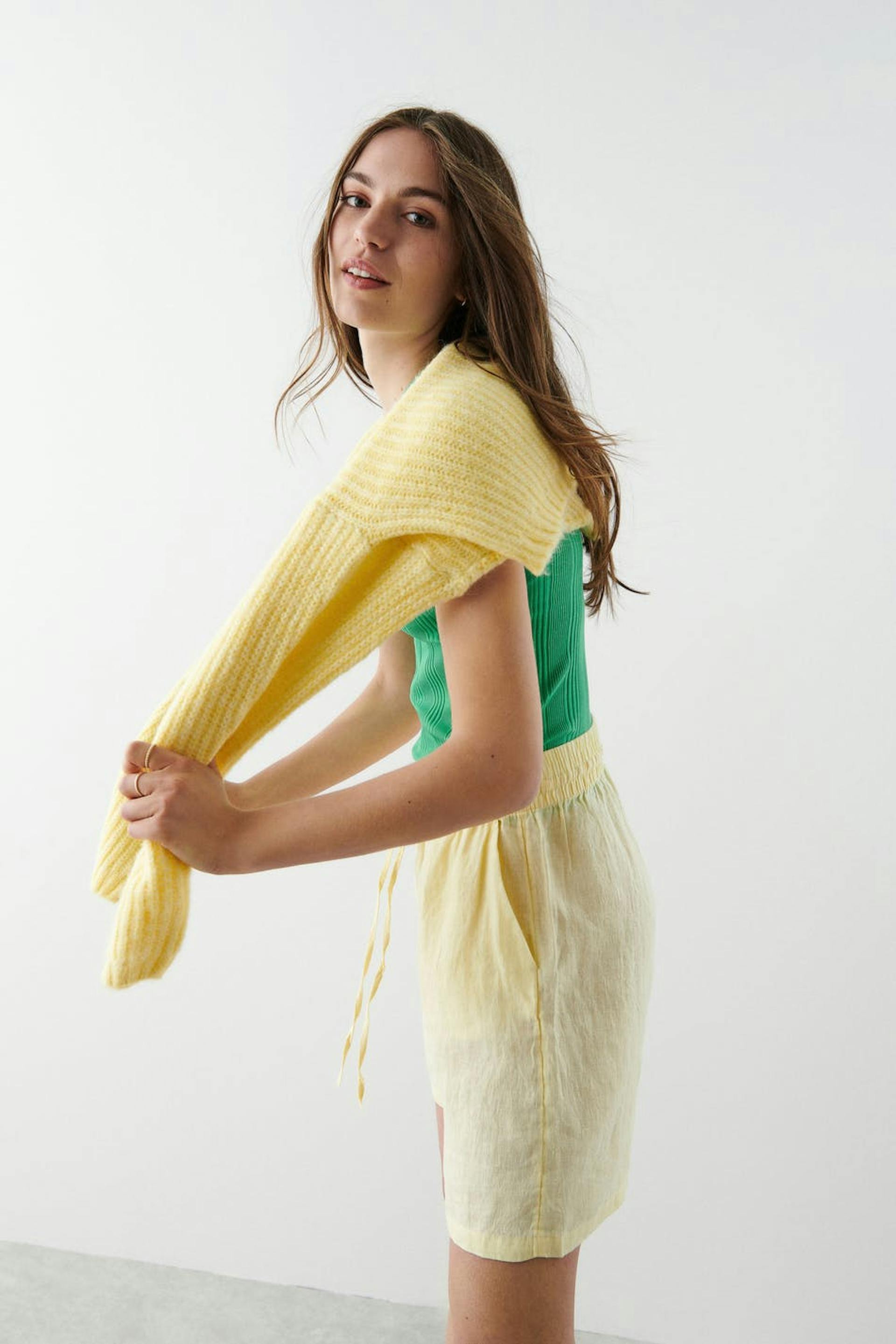 Pellavashortsit korkealla vyötäröllä. Shortsit ovat keltaisia ja niissä on taskut sivuissa. Niissä on kudottu laatu pellavasta, kuminauha vyötäröllä ja säädettävä kiristysnyöri solmittavalla vyöllä edessä.