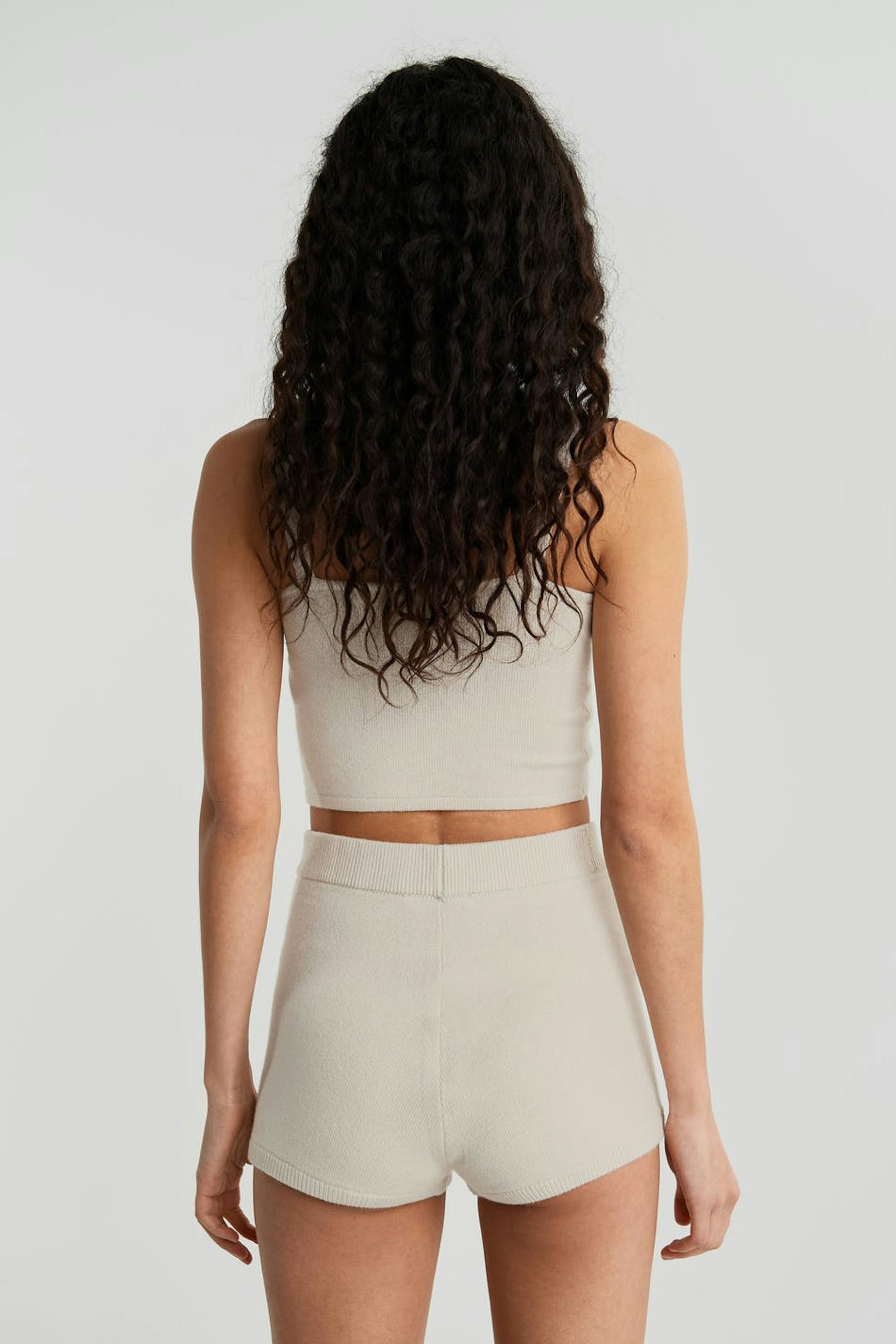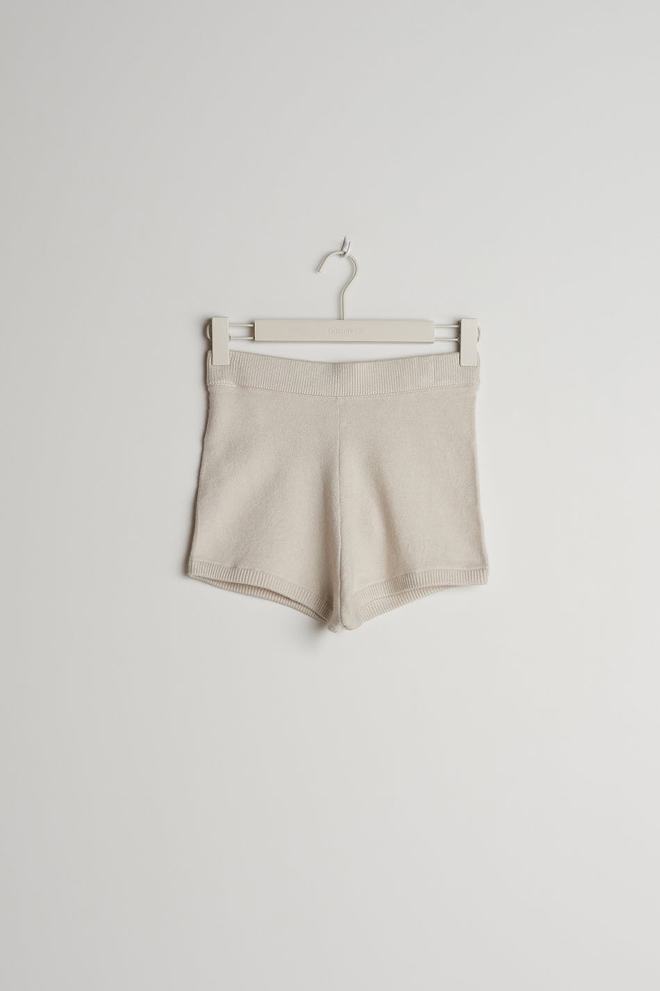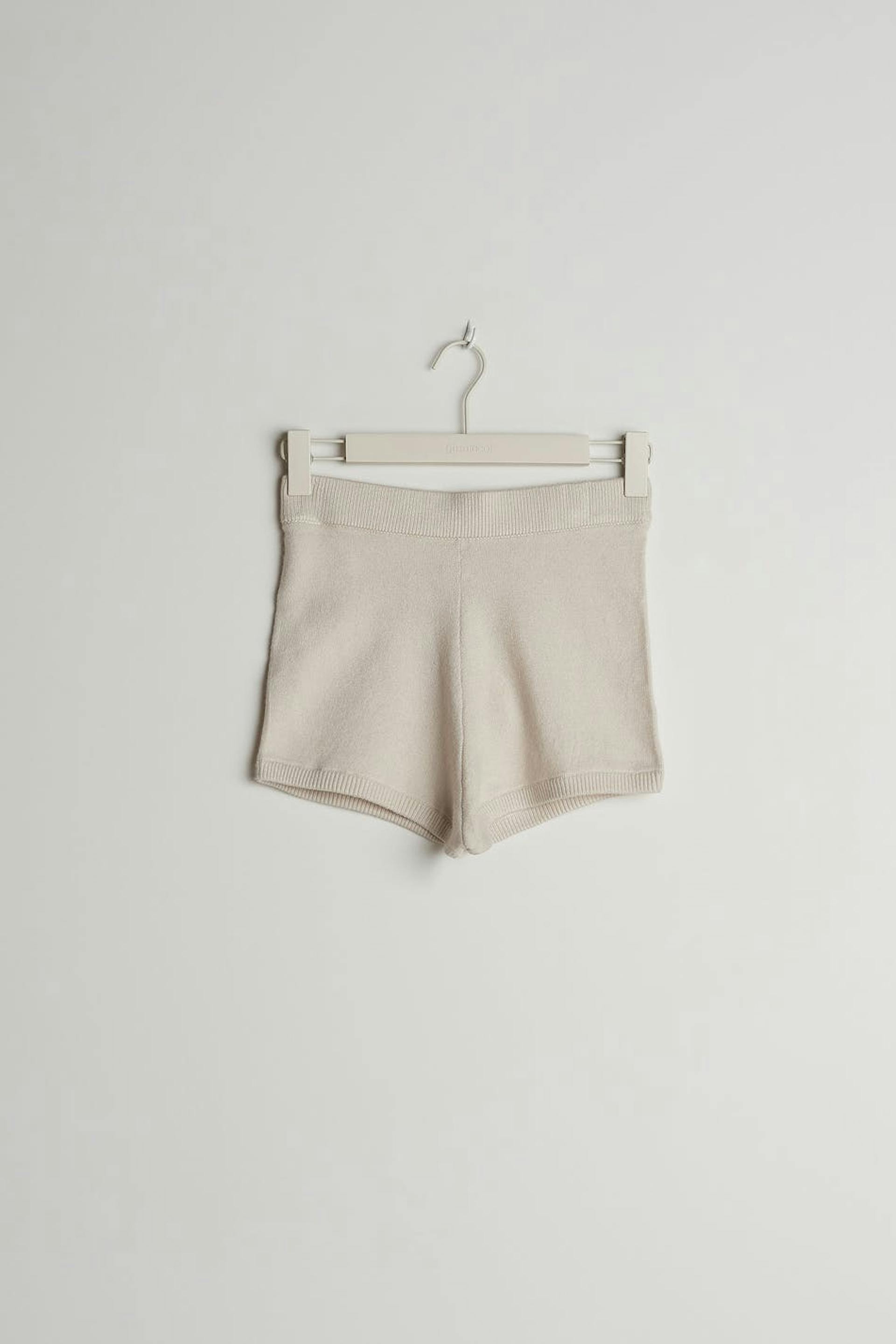 Neulotut shortsit korkealla vyötäröllä. Shortsit ovat beigejä ja lyhyitä.