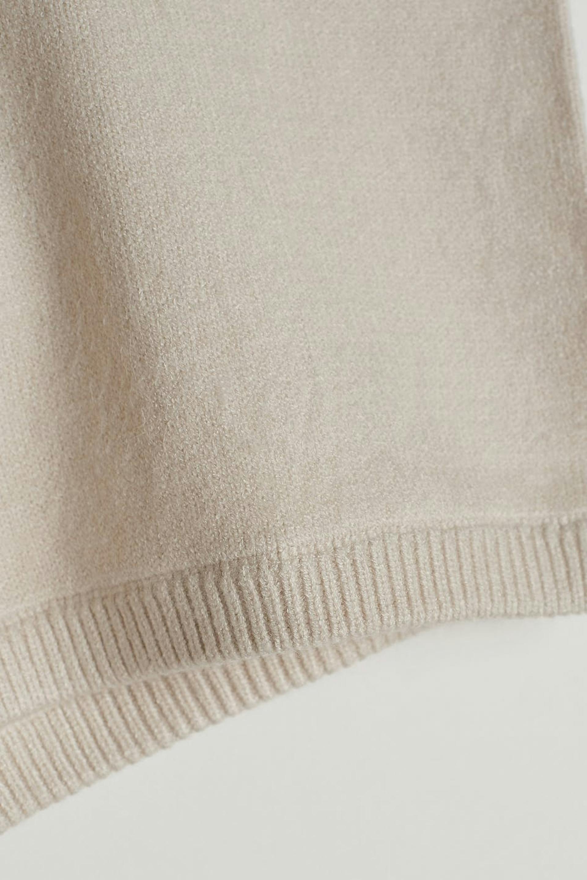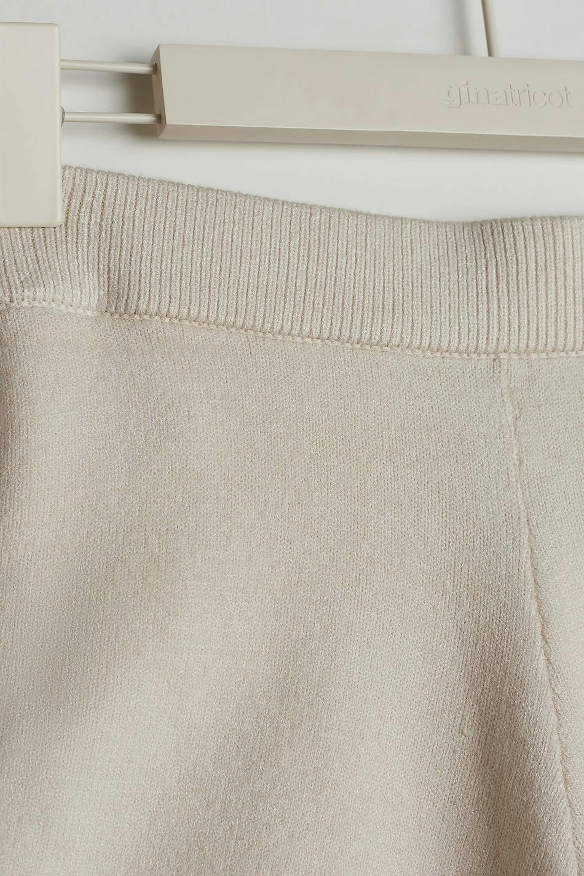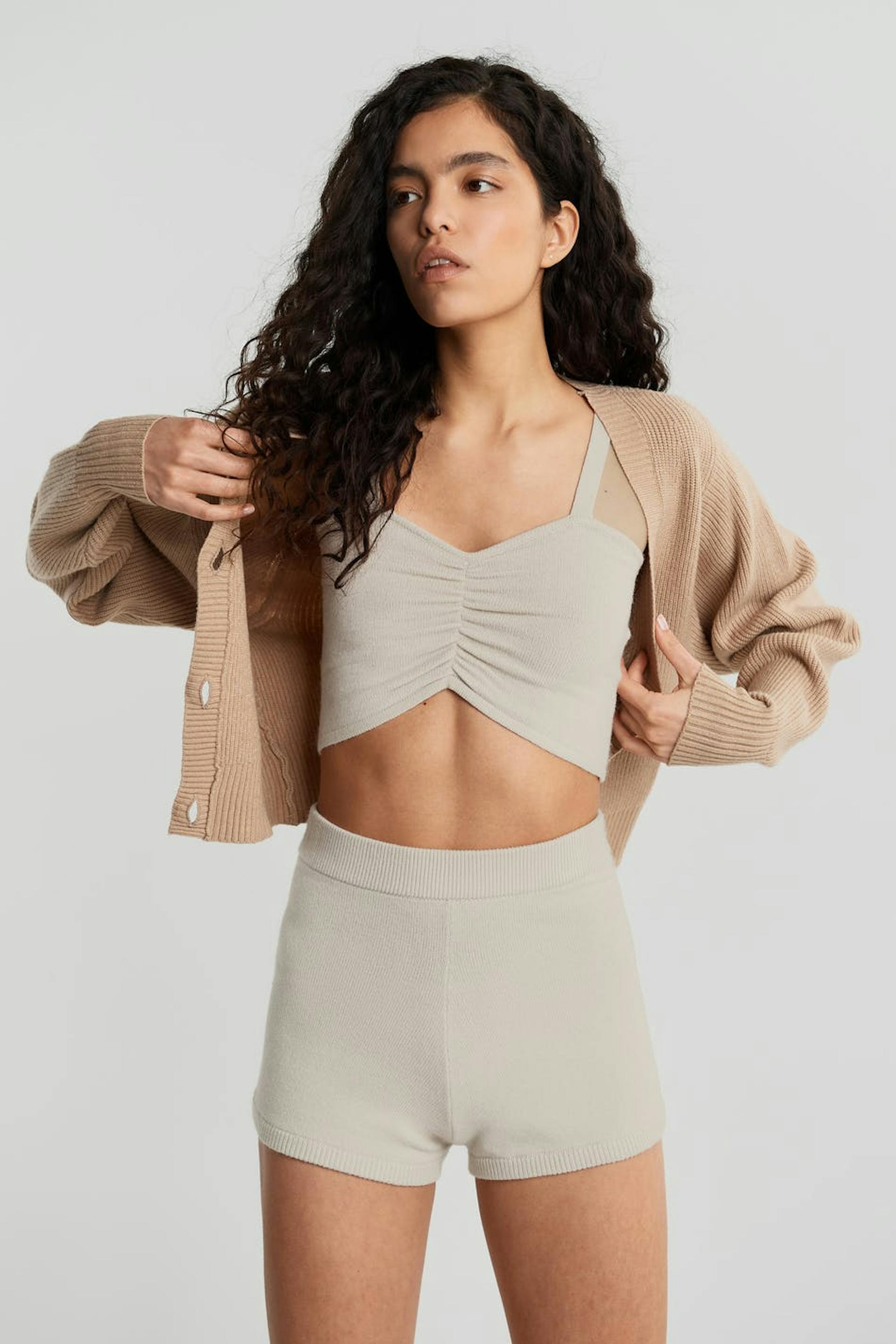 Neulotut shortsit korkealla vyötäröllä. Shortsit ovat beigejä ja lyhyitä.