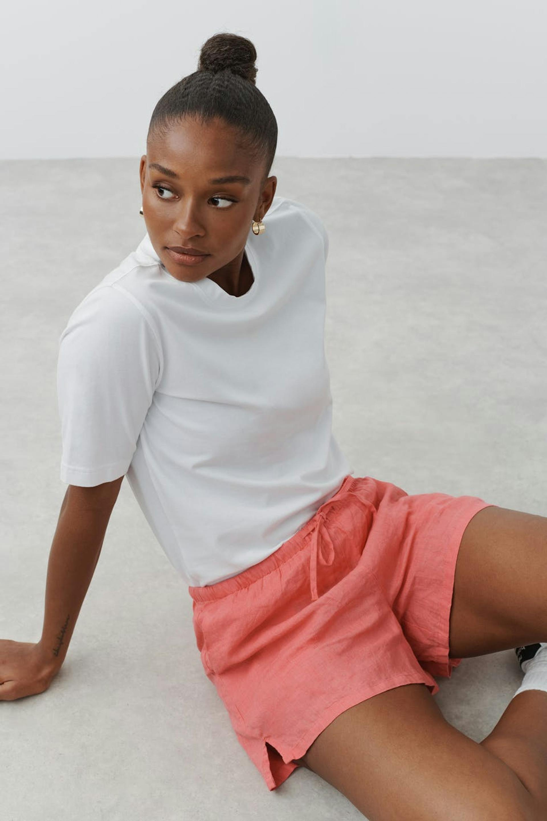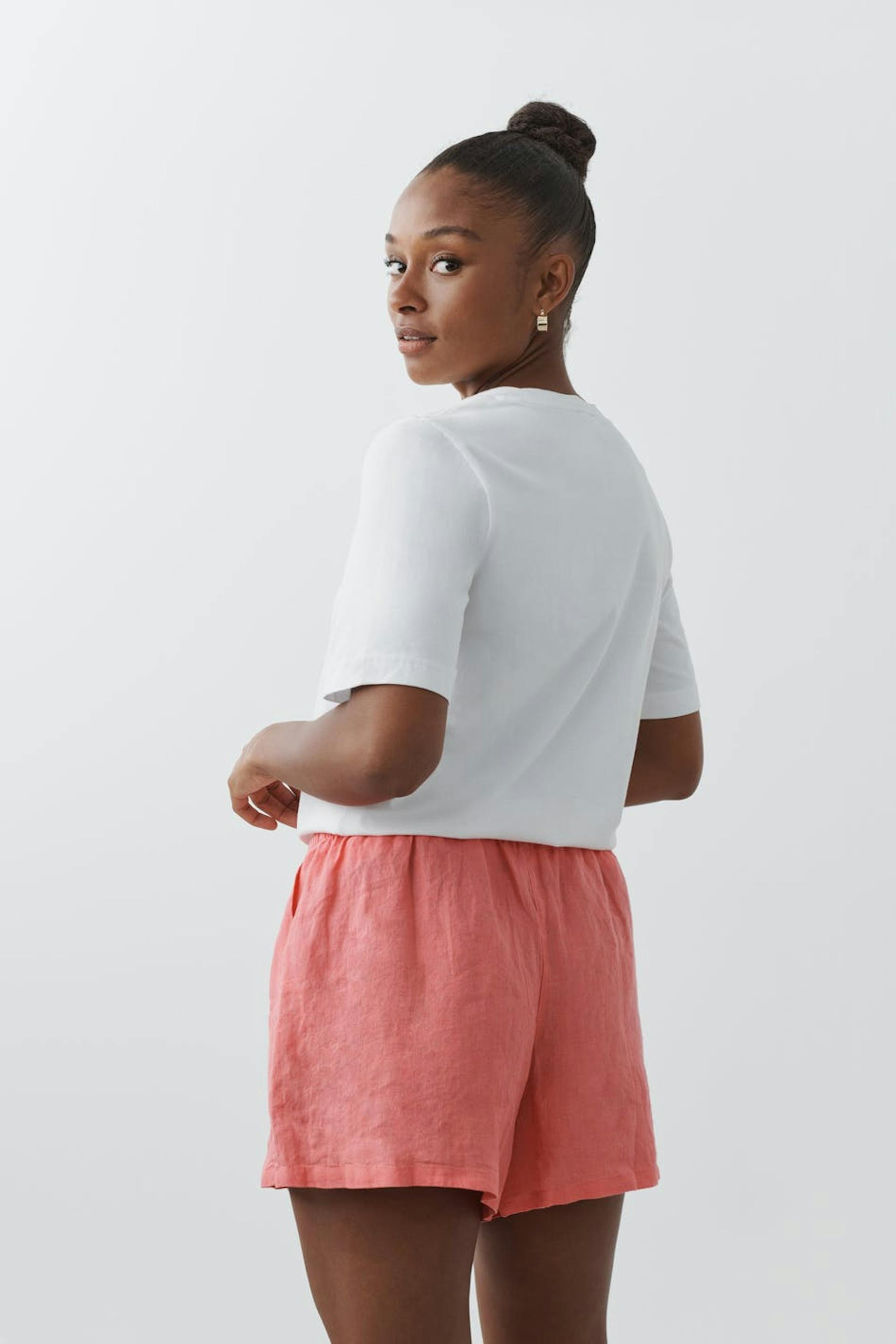 Pellavashortsit keskikorkealla vyötäröllä. Shortsit ovat oransseja ja niissä on joustonauha vyötäröllä kiristysnyörillä edessä. Niissä on sivutaskut ja halkio sivuilla.
