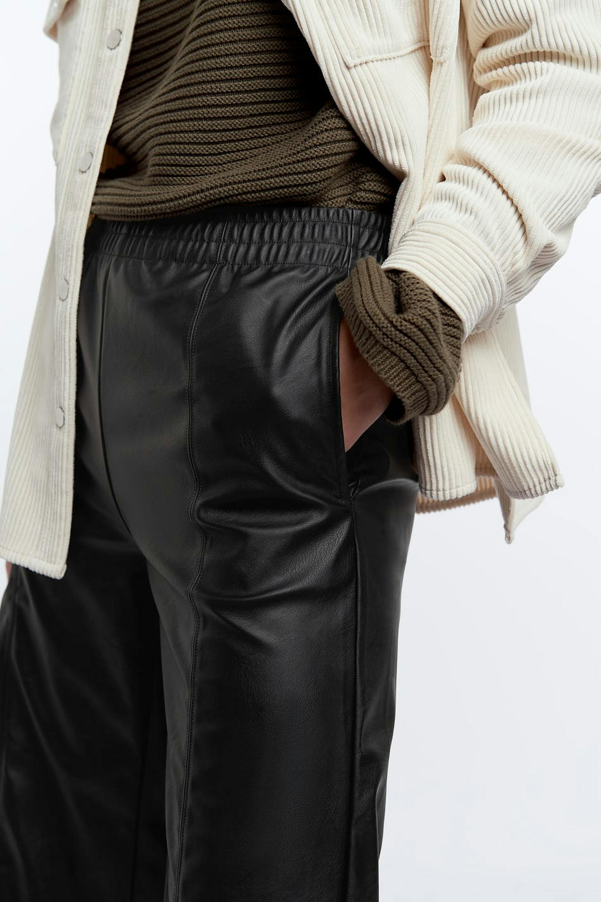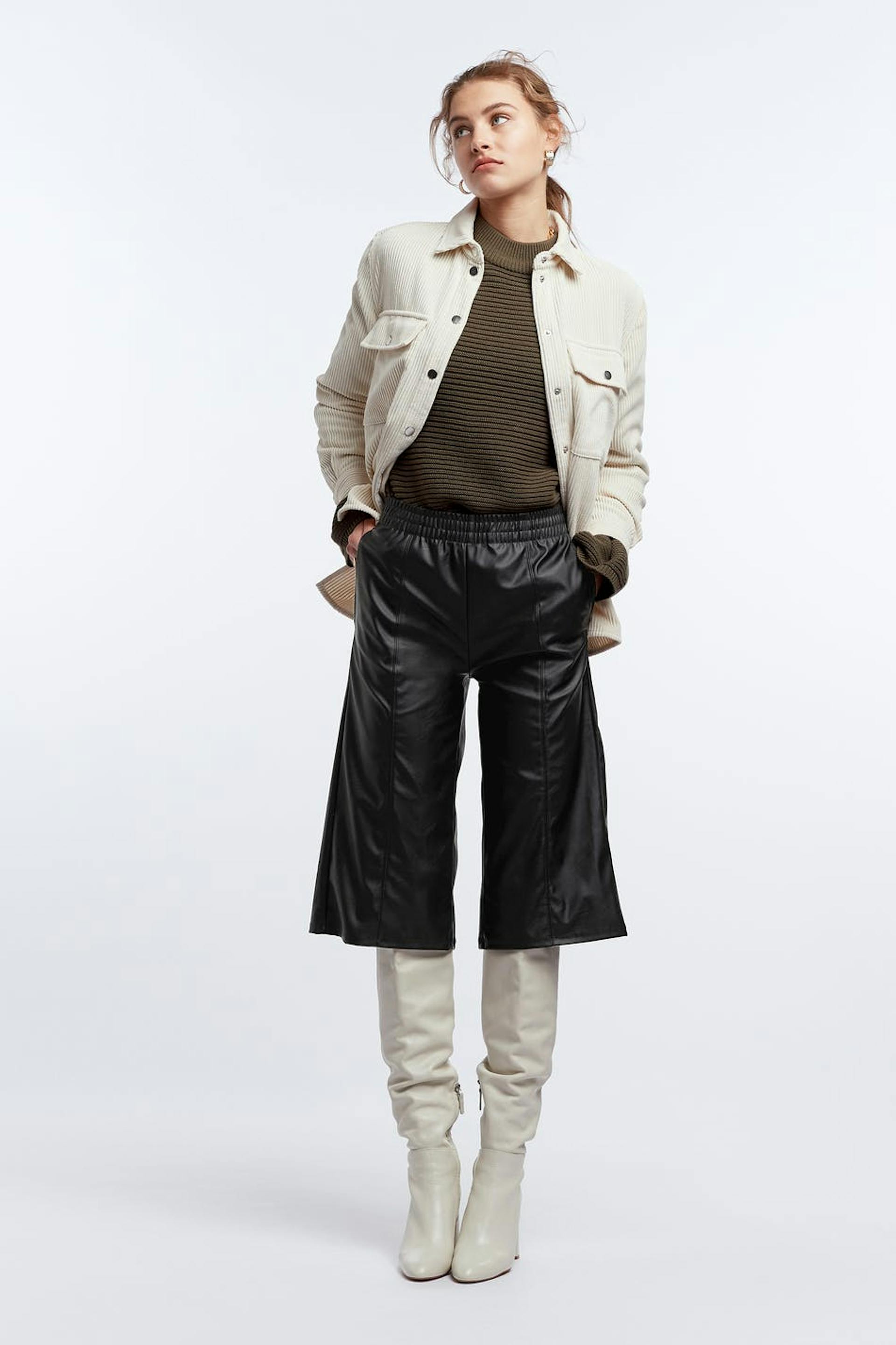 Pitkät shortsit normaalilla leikkauksella. Shortsit ovat mustia ja niissä on korkea vyötärö kuminauhasta. Ne valmistetaan PU:sta ja niissä on suorat, leveät jalat.