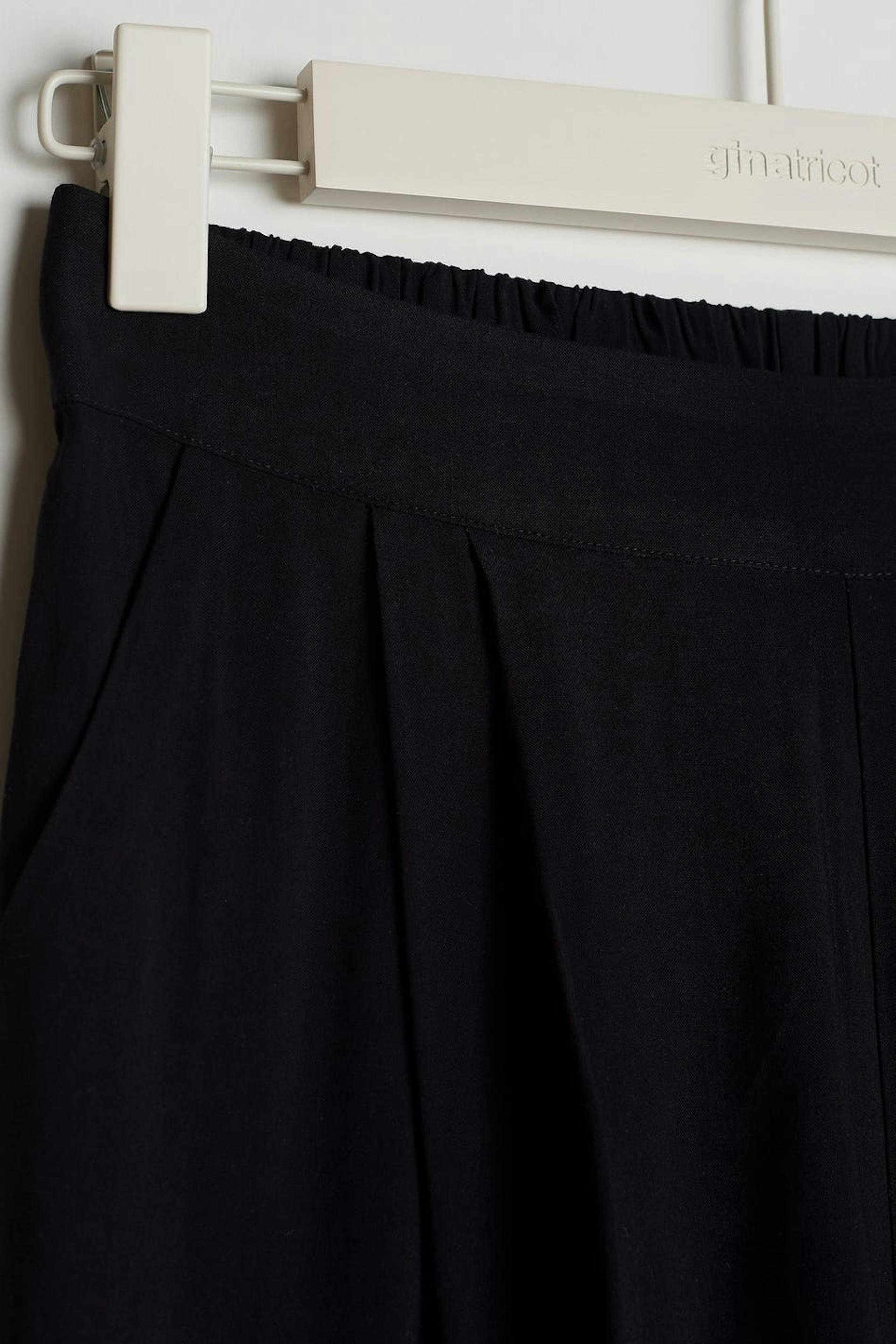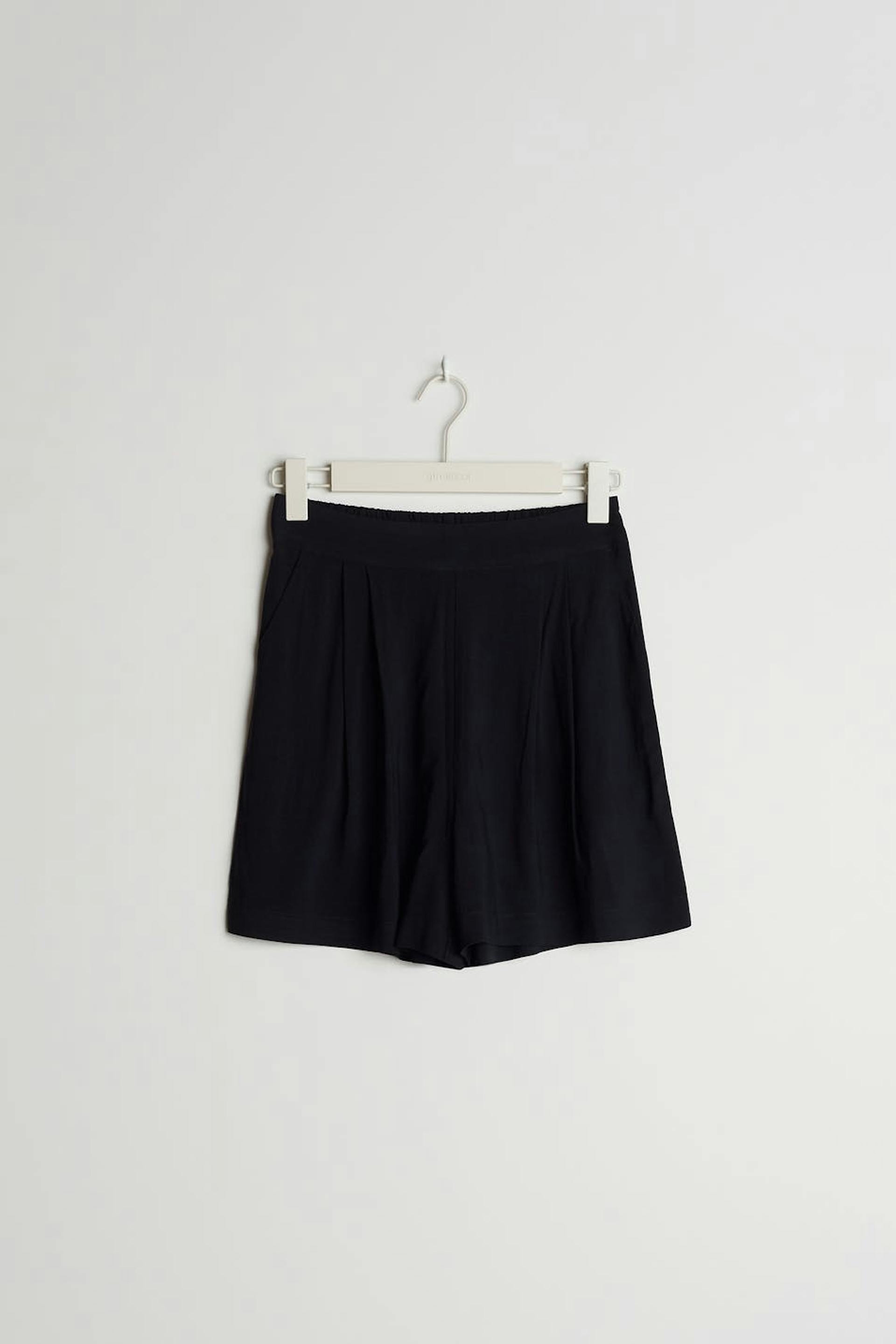 Lyhyet shortsit vekeillä edessä. Shortsit ovat mustia ja leveitä ja niissä on sivutaskut. Niissä on vyötärö elastisella takana.