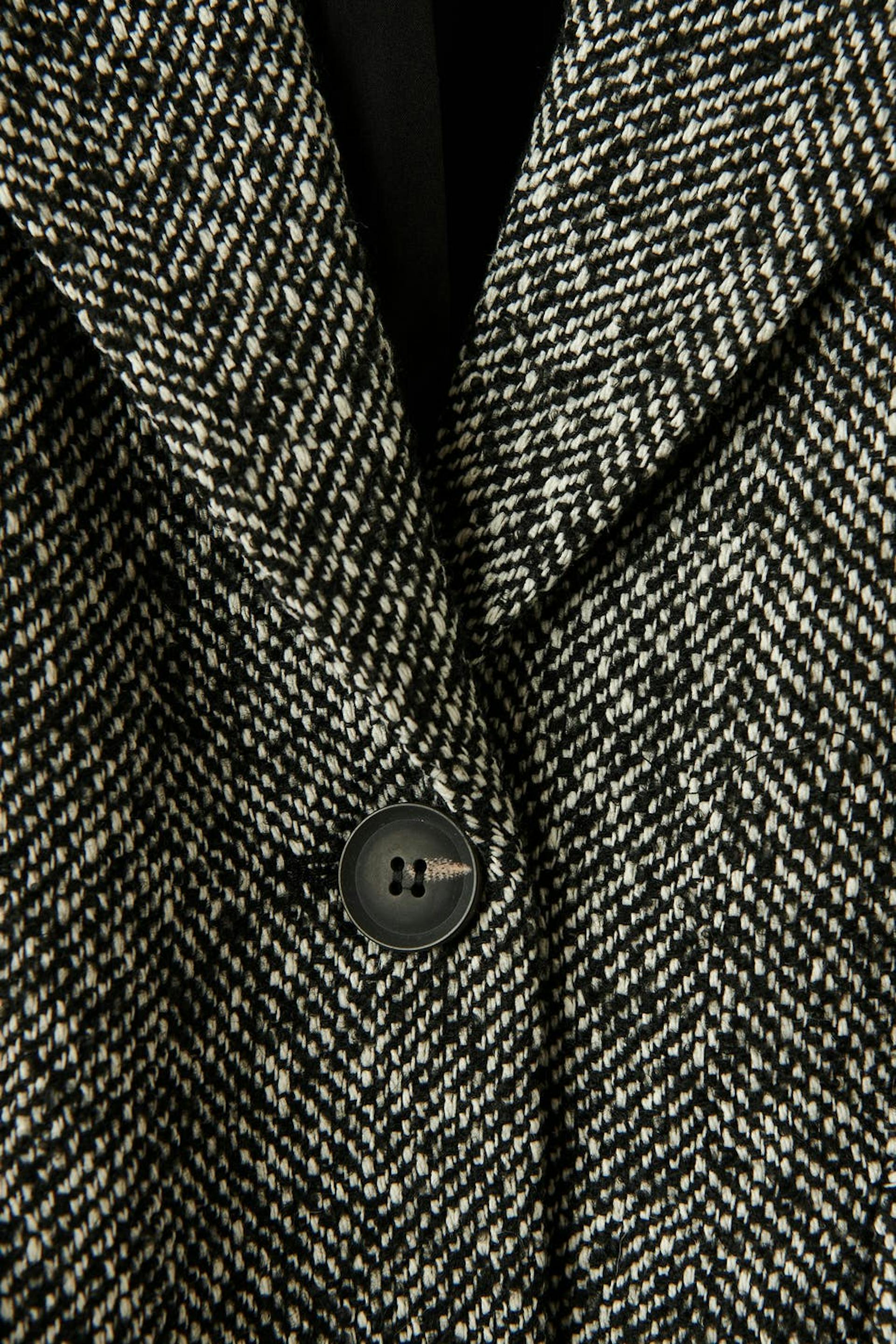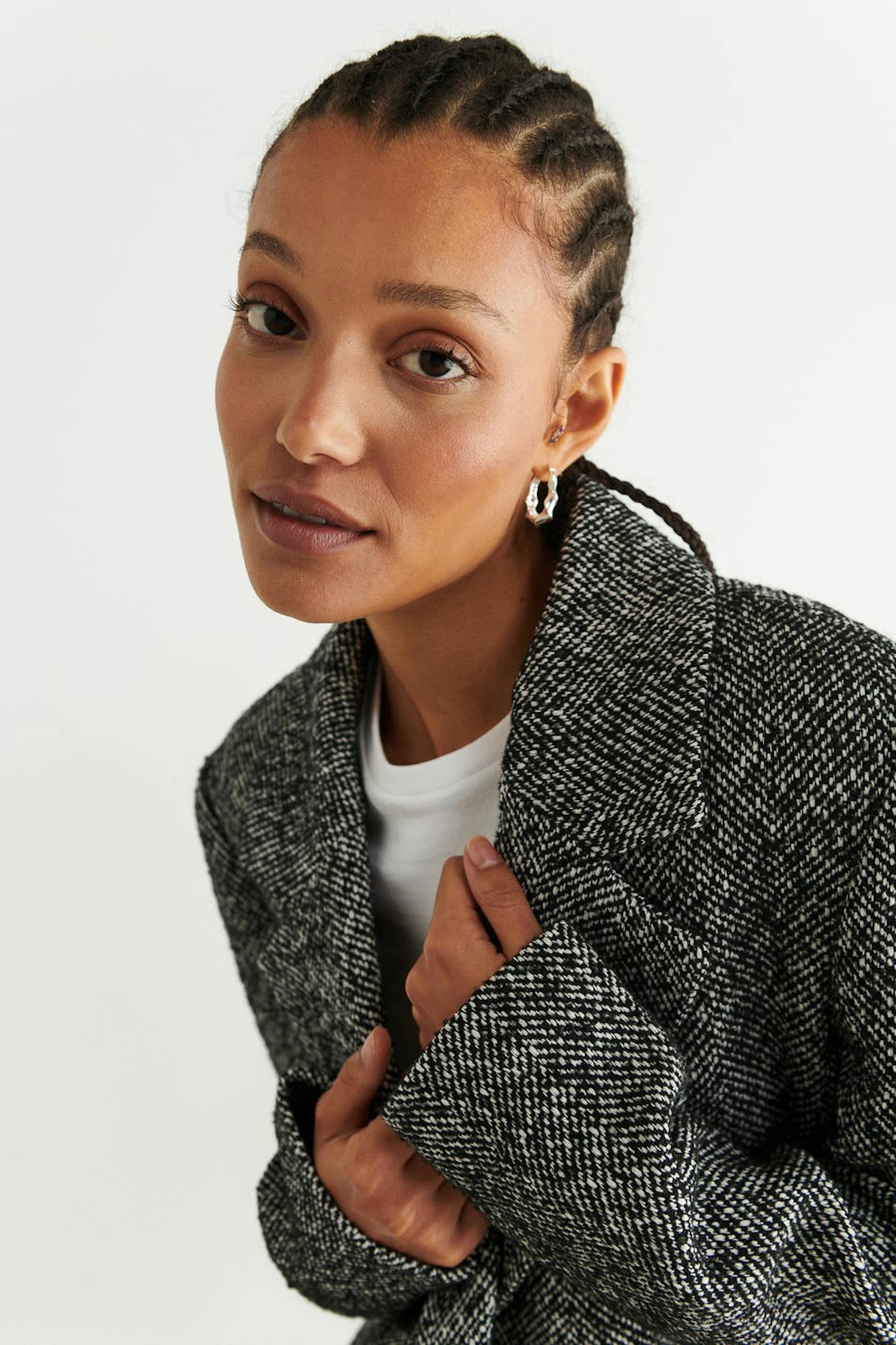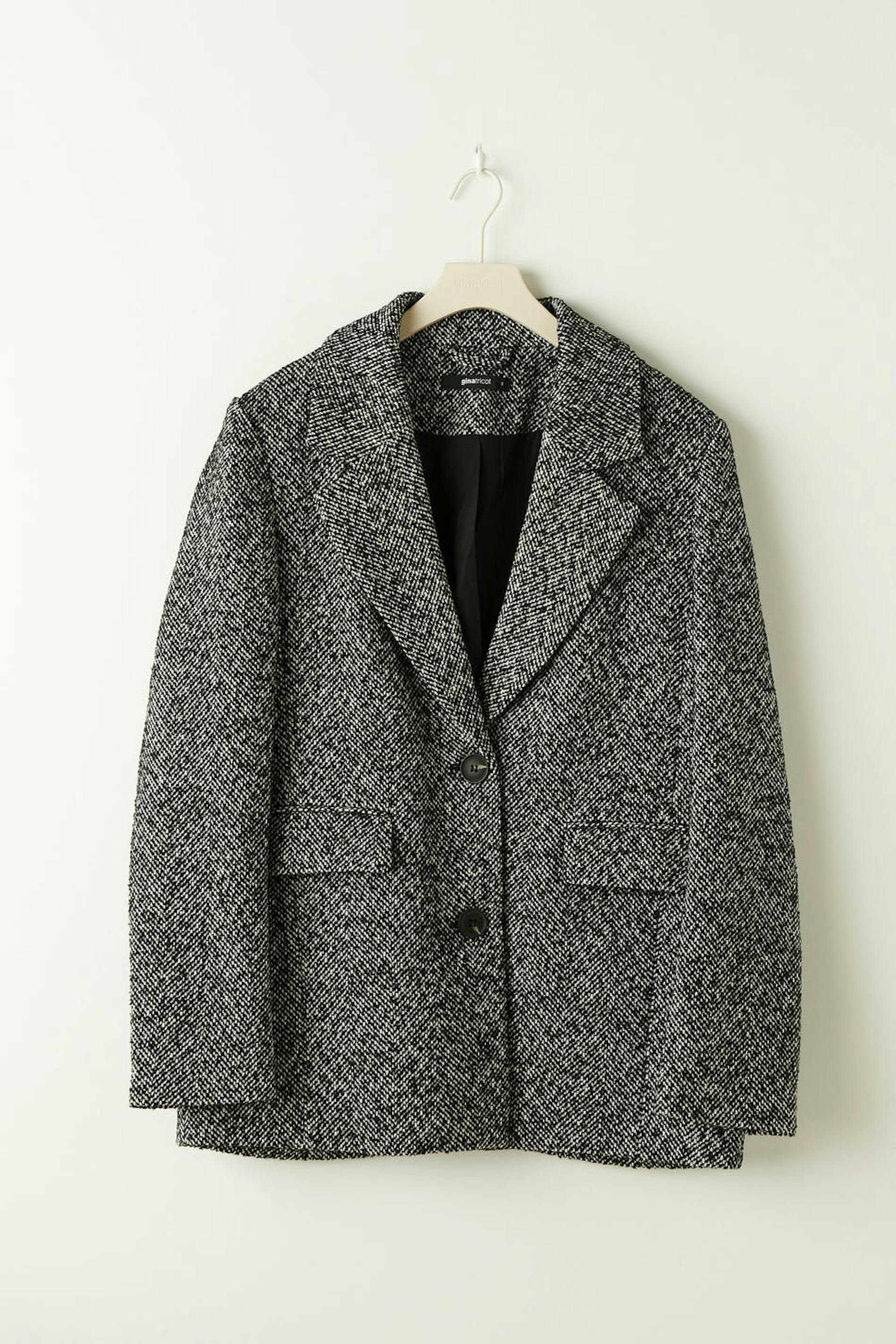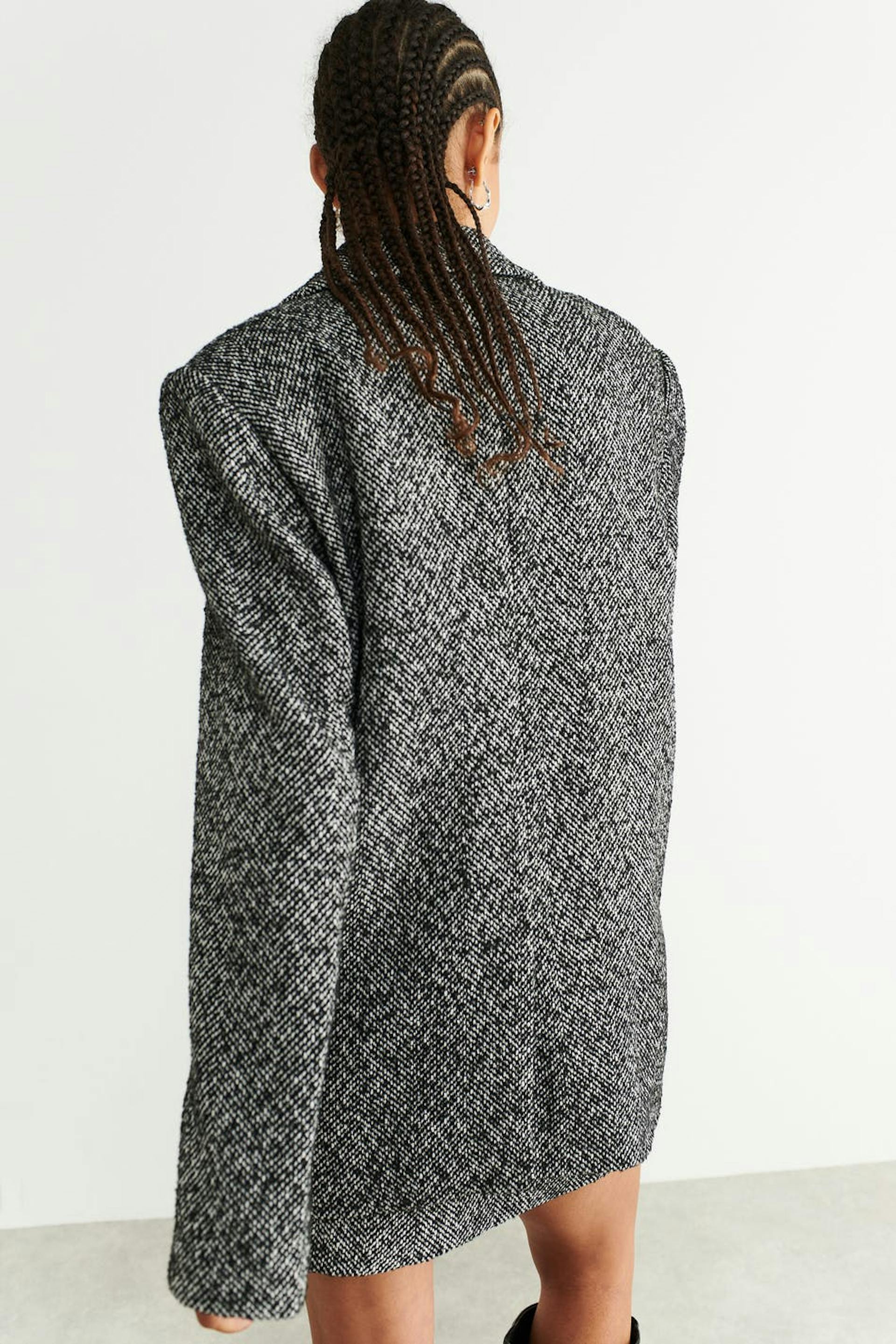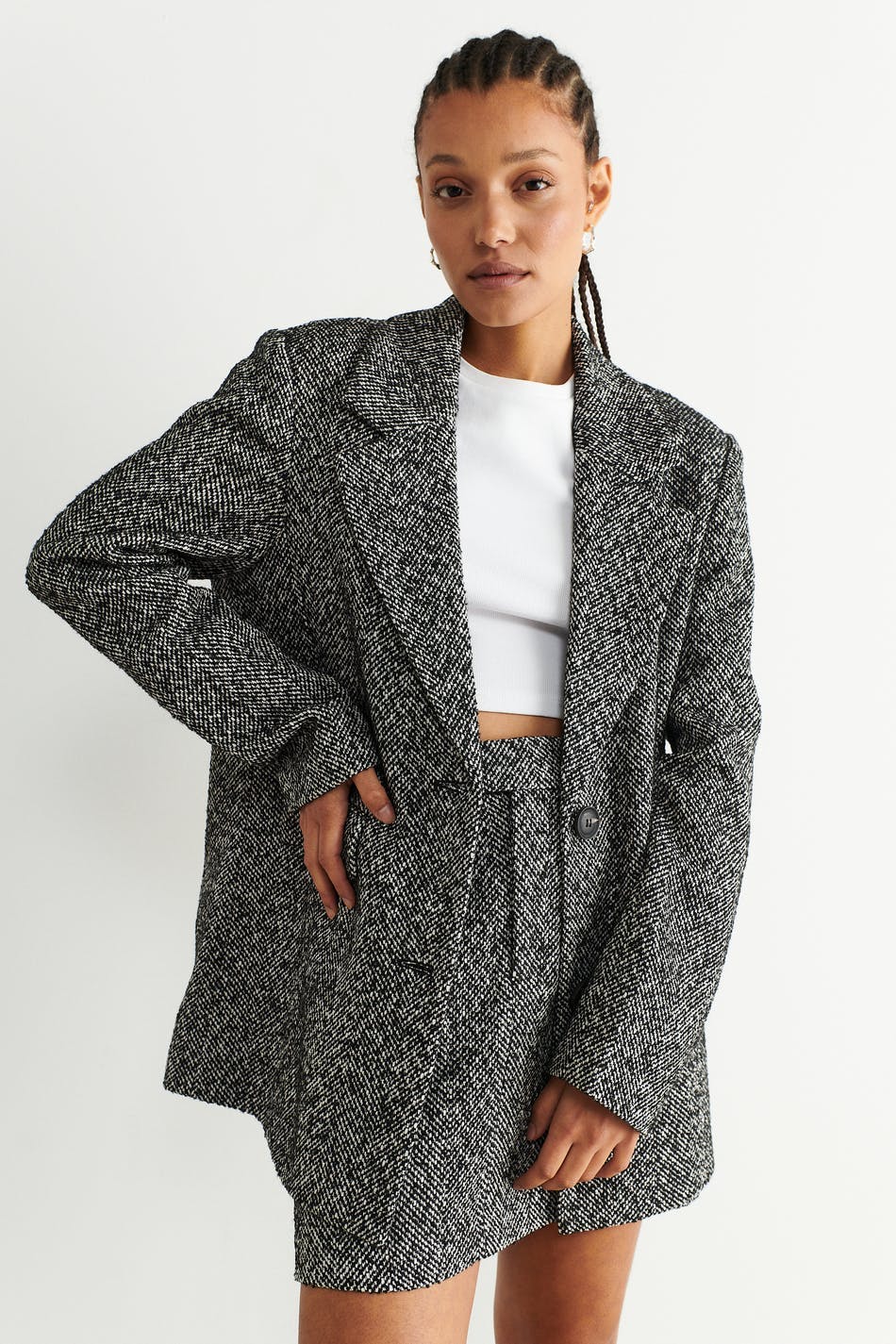 Oversize bleiseri tweedistä laatikkomaisella mallilla. Bleiseri on harmaa ja siinä on napituslista edessä. Siinä on päälleommellut taskut sivuilla, leveät hihat ja kaulus käänteillä.