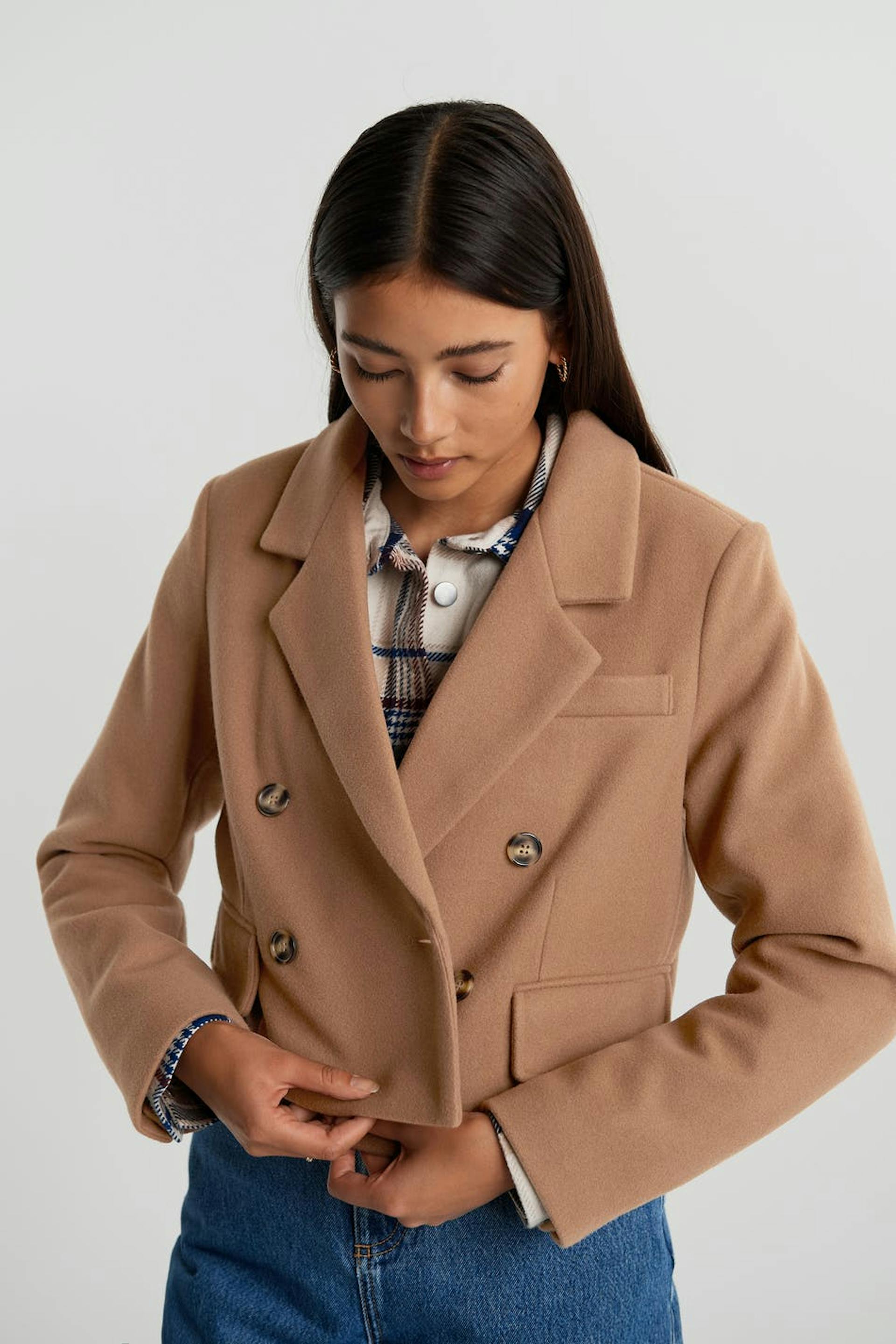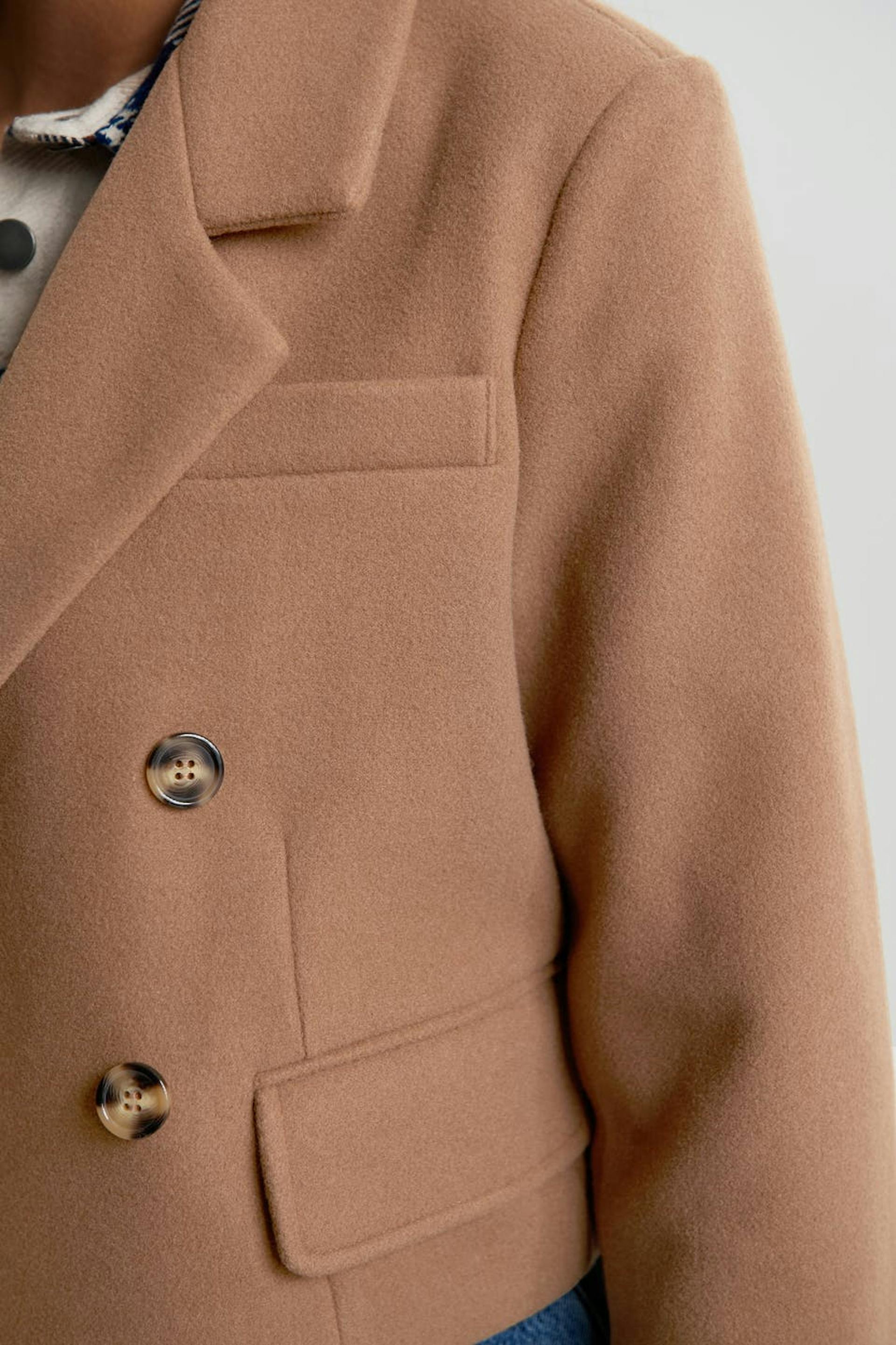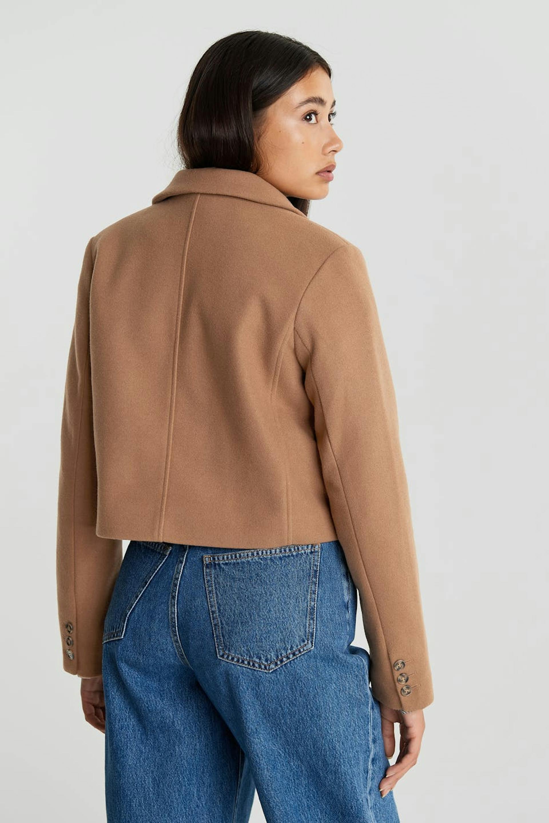 Lyhyt bleiseri napeilla edessä. Bleiseri on ruskea. Se valmistetaan kierrätetystä polyesteristä.