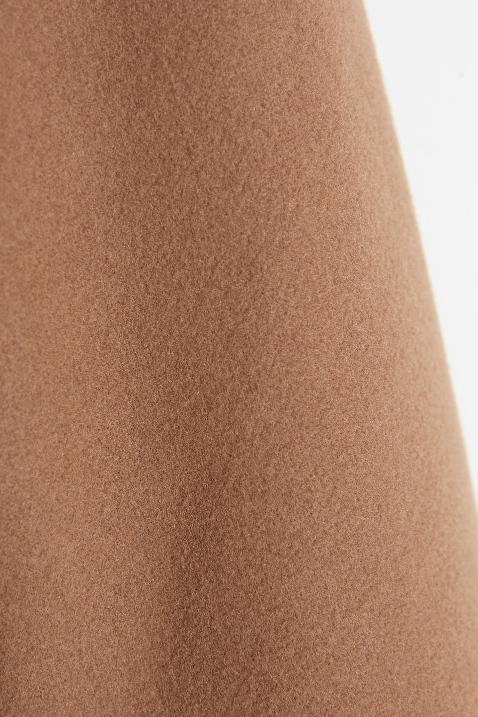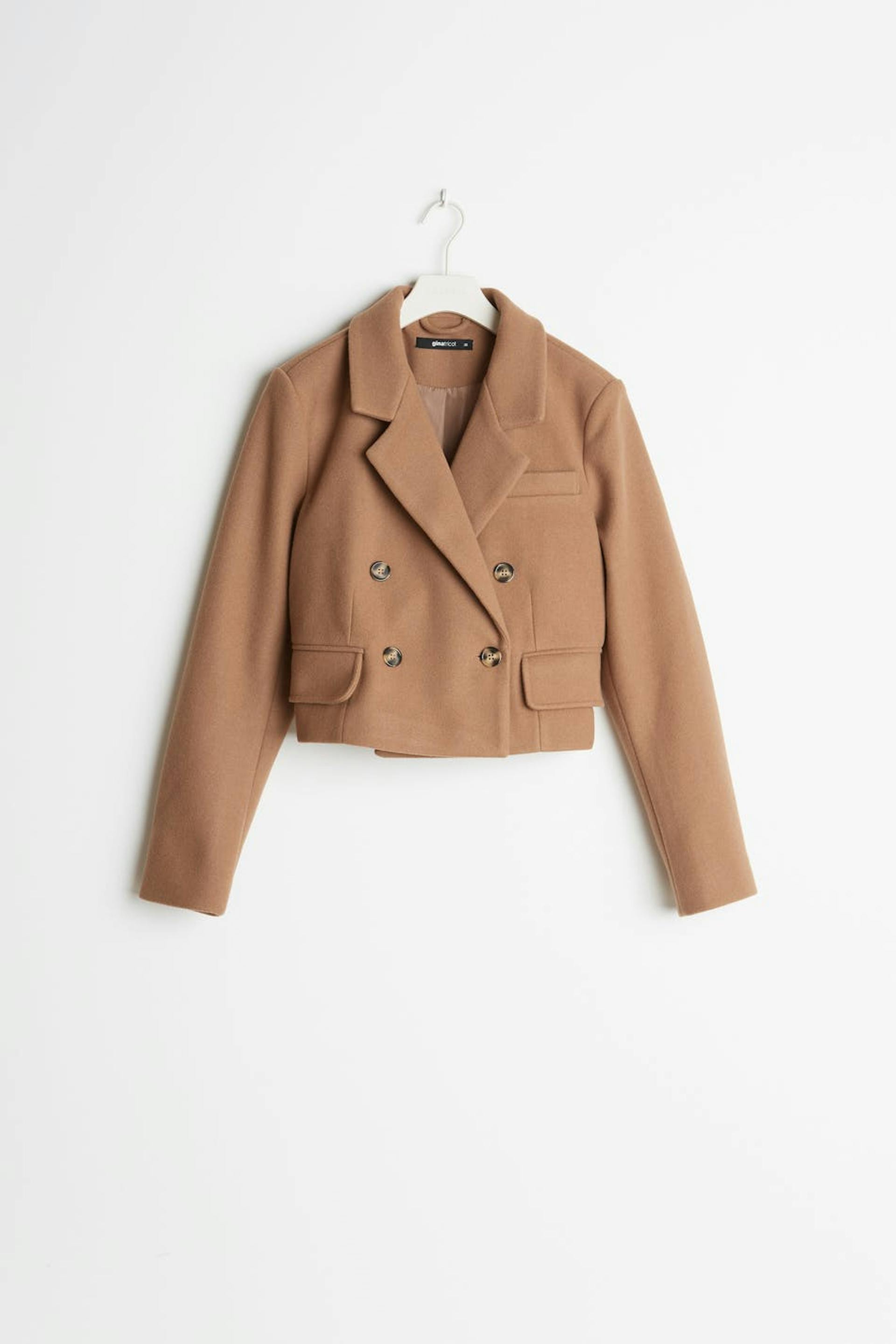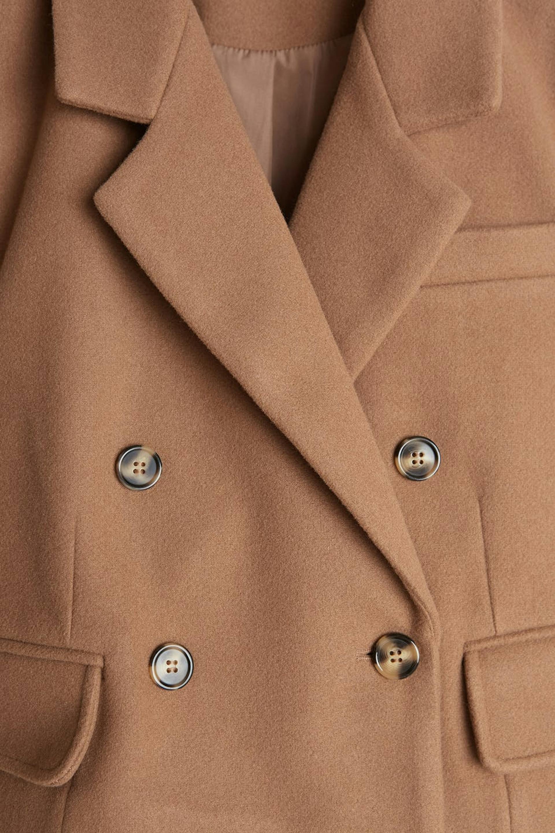 Lyhyt bleiseri napeilla edessä. Bleiseri on ruskea. Se valmistetaan kierrätetystä polyesteristä.