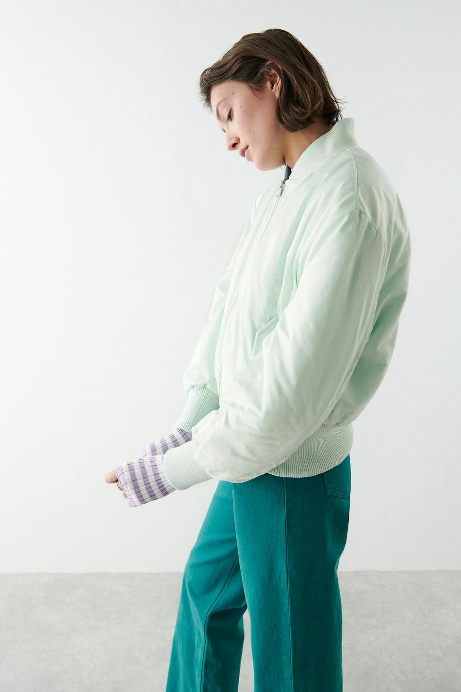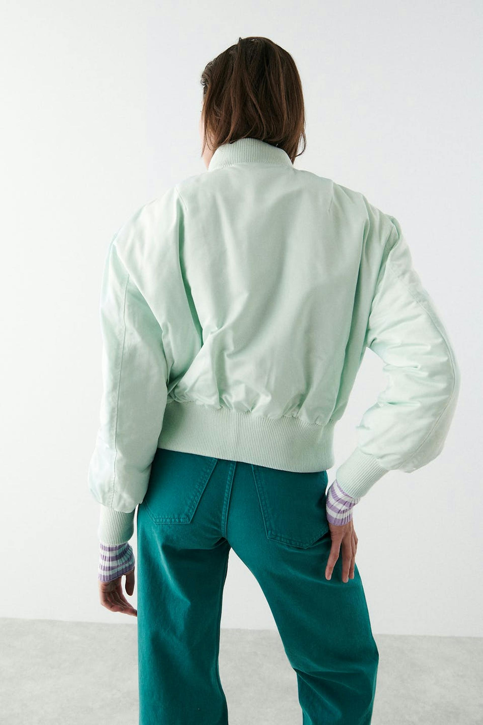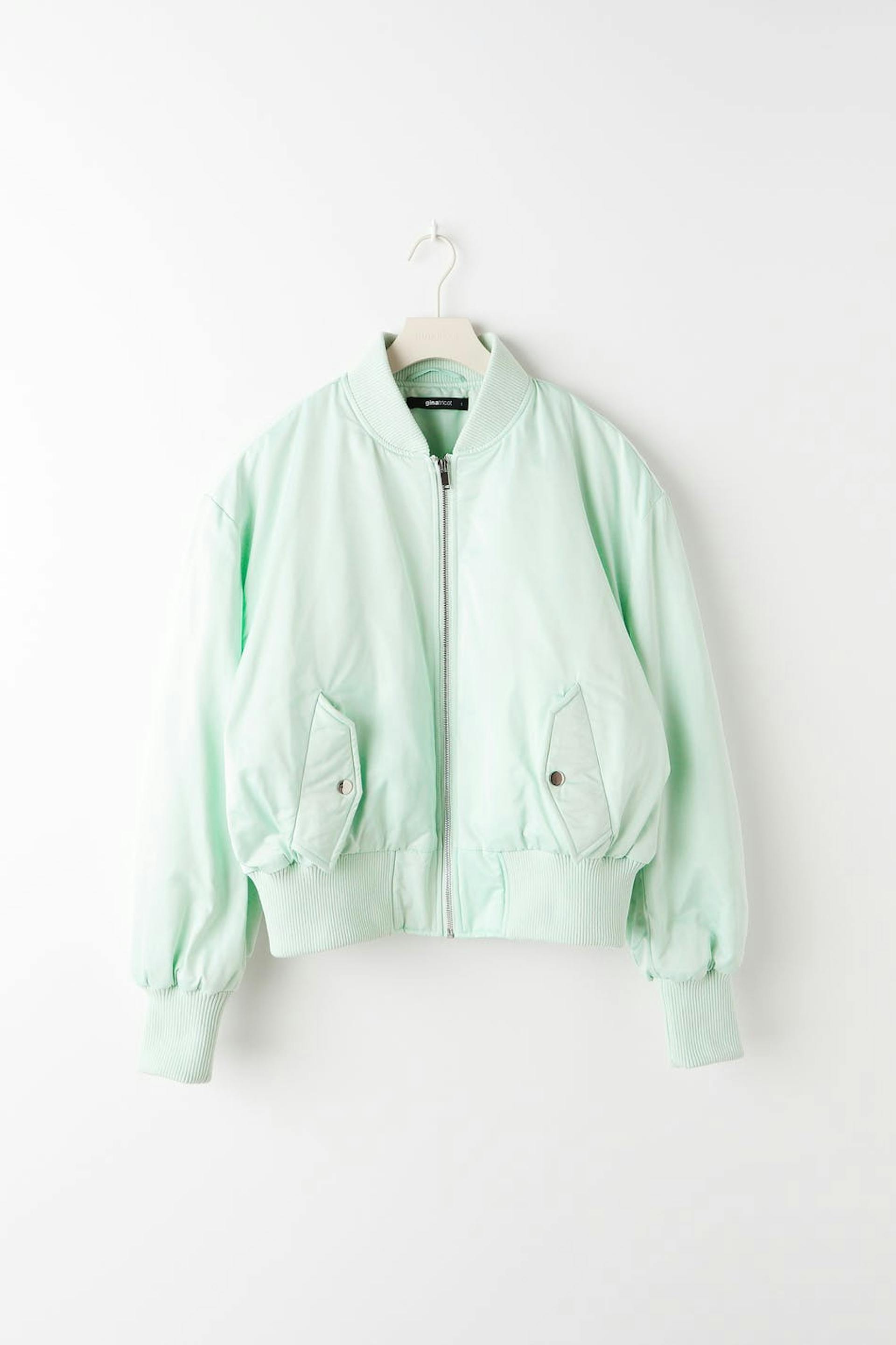 Topattu bombertakki laatikkomaisella mallilla. Takki on sininen ja siinä on ribattu kaulus. Siinä on vetoketju edessä, vinotaskut neppareilla ja ribbiresori alhaalla ja hihansuissa.