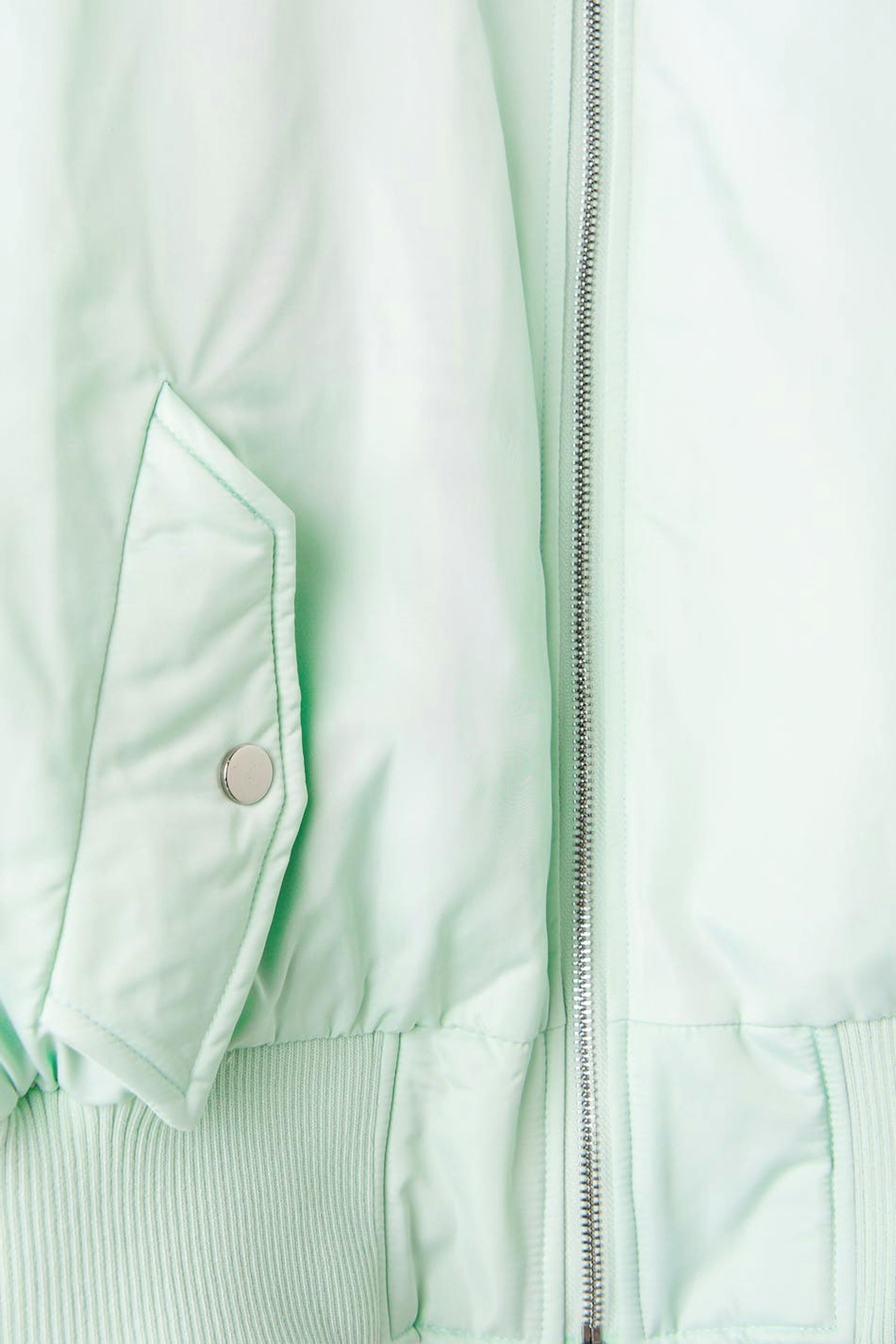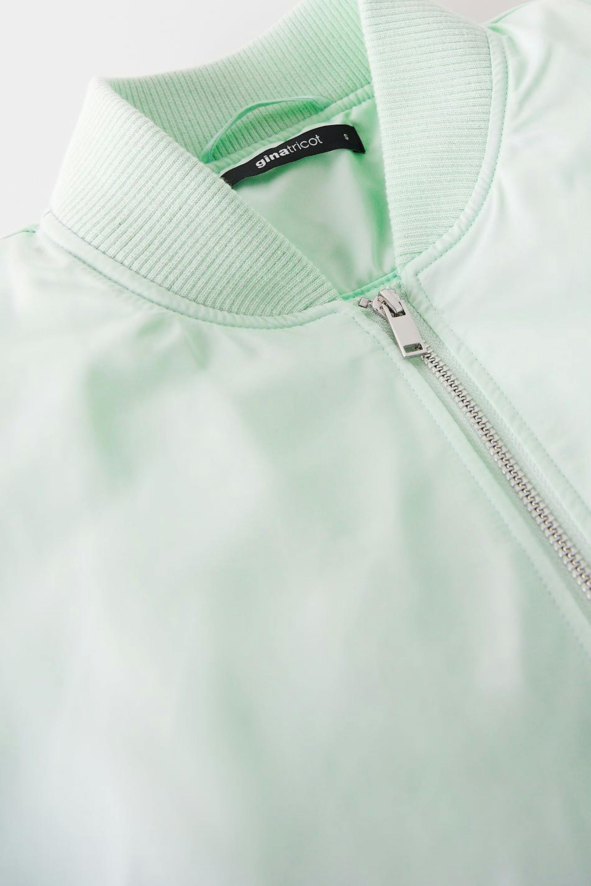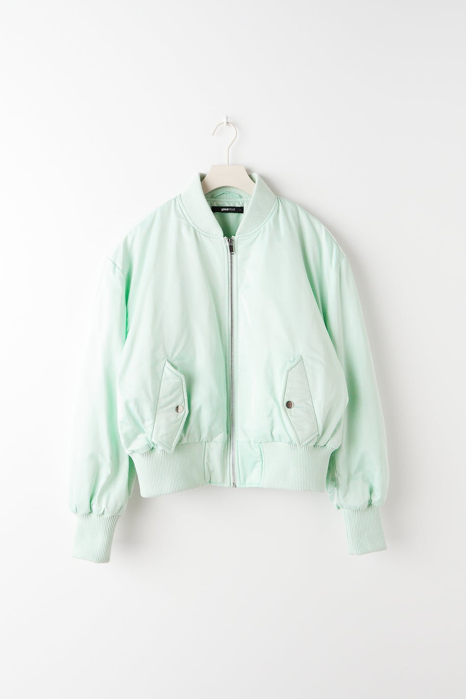 Topattu bombertakki laatikkomaisella mallilla. Takki on sininen ja siinä on ribattu kaulus. Siinä on vetoketju edessä, vinotaskut neppareilla ja ribbiresori alhaalla ja hihansuissa.