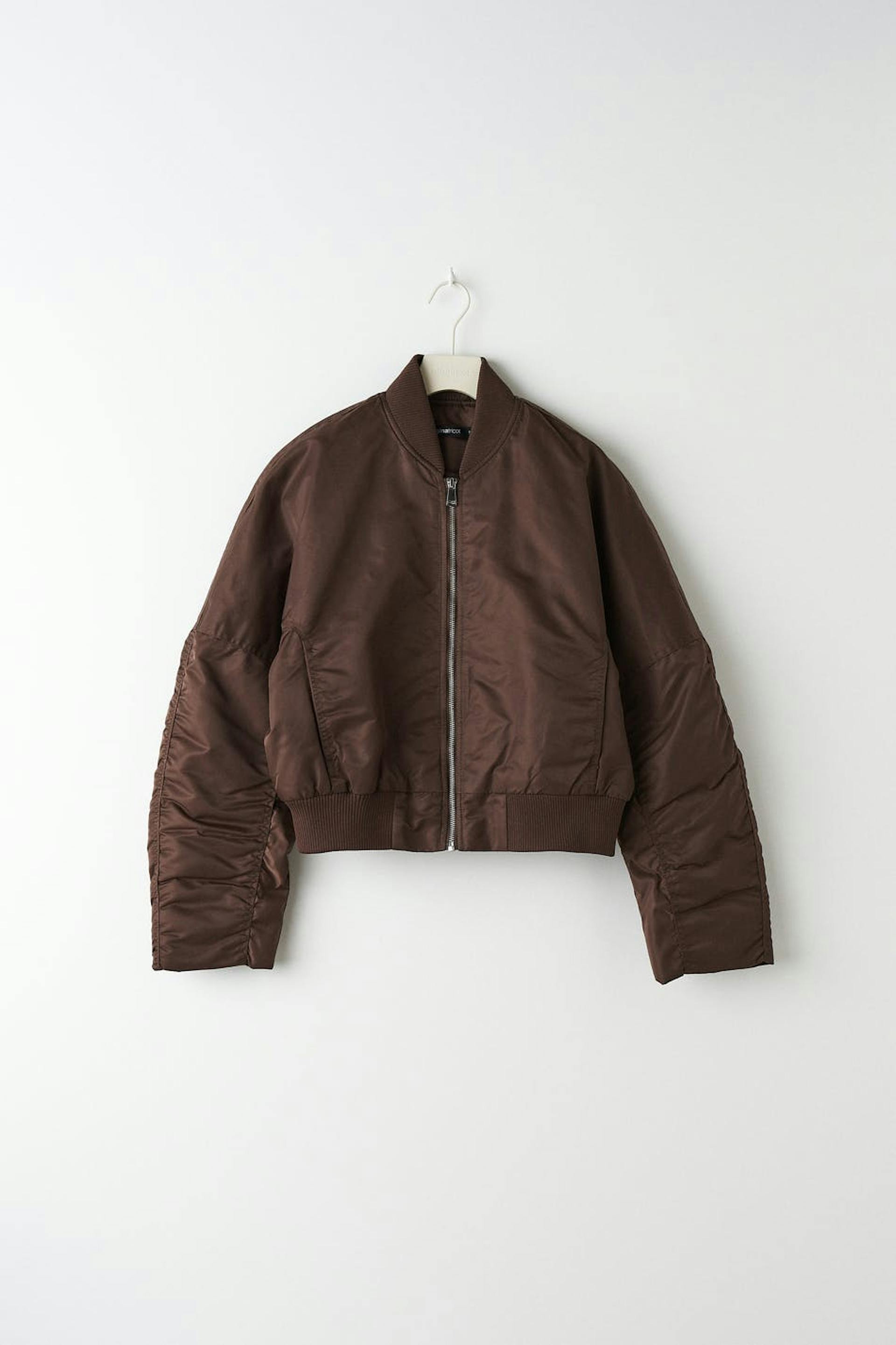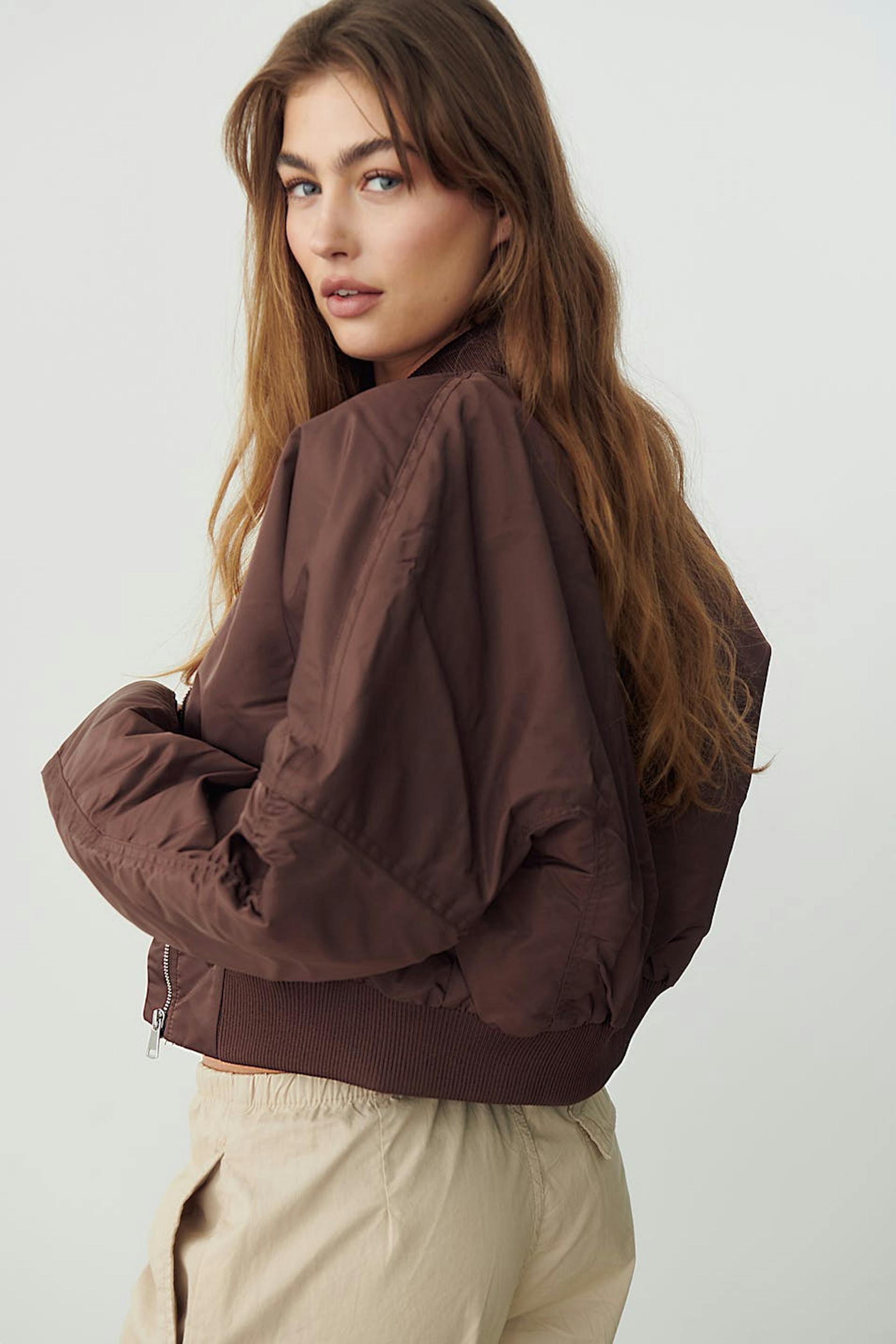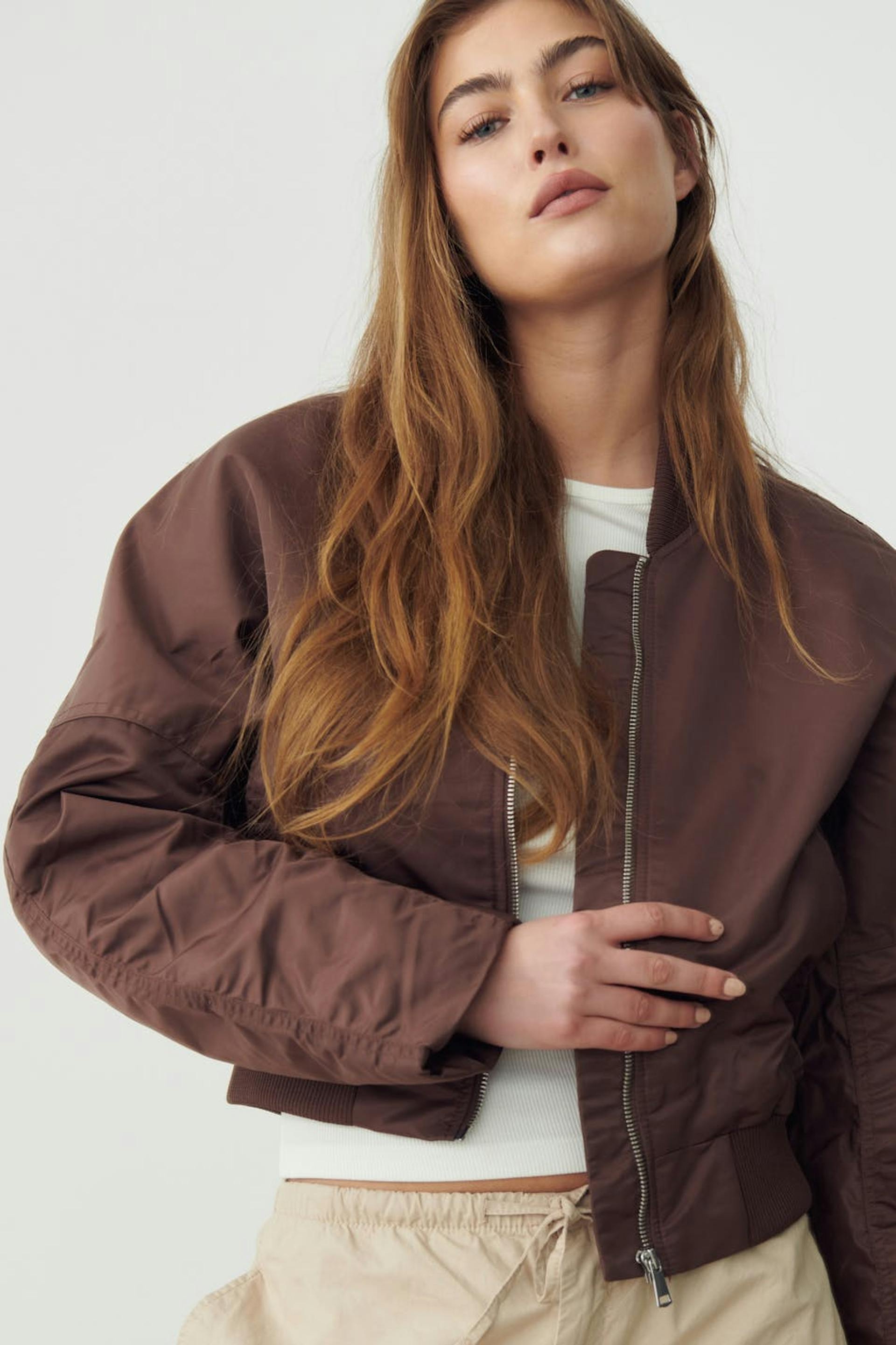 Cropattu bombertakki laatikkomaisella mallilla. Takki on ruskea ja siinä on ribattu hihansuu alhaalla ja hihansuissa. Siinä on vetoketju edessä, ribattu kaulus, taskut sivuilla ja koristeelliset saumayksityiskohdat hihoissa.