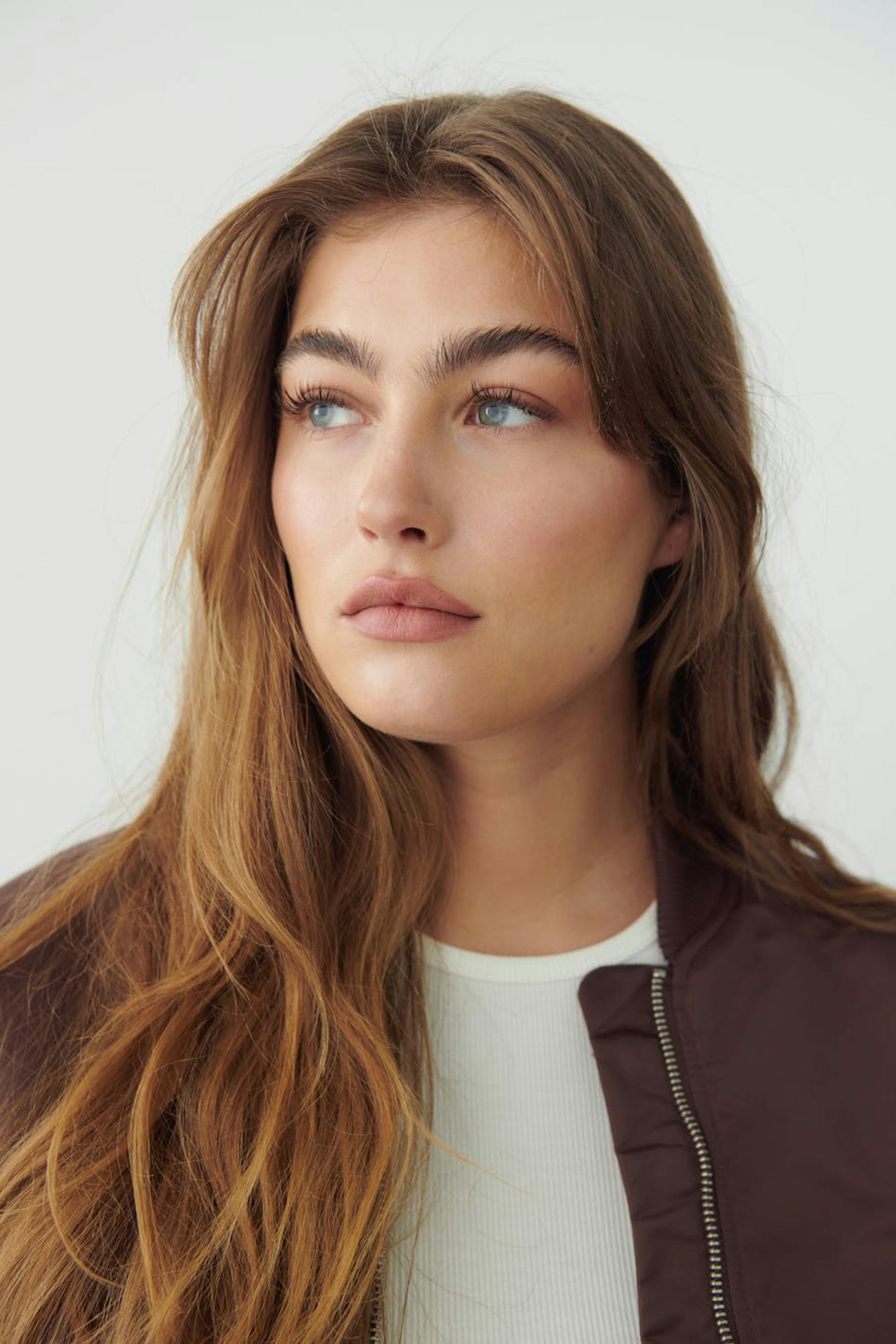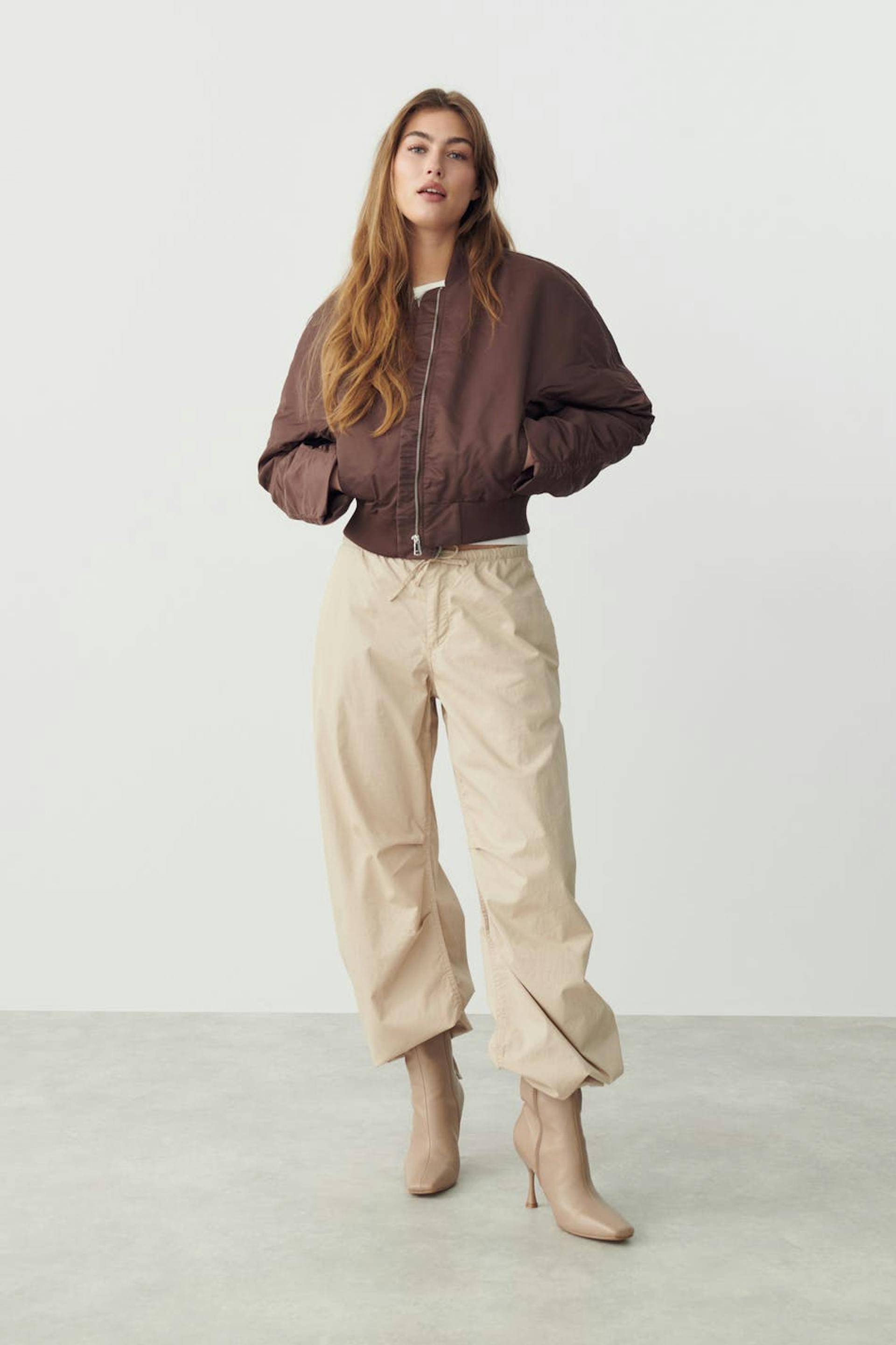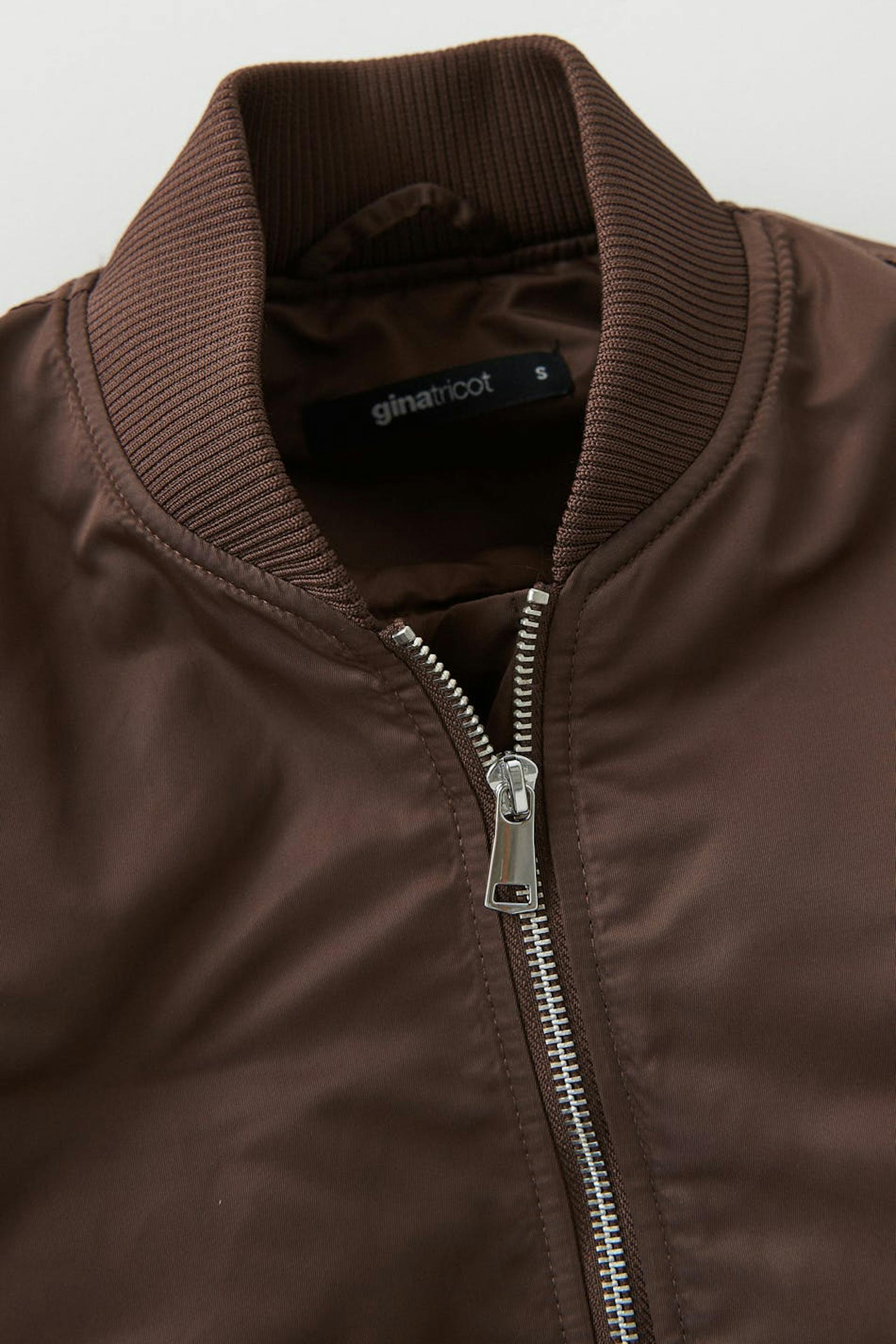 Cropattu bombertakki laatikkomaisella mallilla. Takki on ruskea ja siinä on ribattu hihansuu alhaalla ja hihansuissa. Siinä on vetoketju edessä, ribattu kaulus, taskut sivuilla ja koristeelliset saumayksityiskohdat hihoissa.
