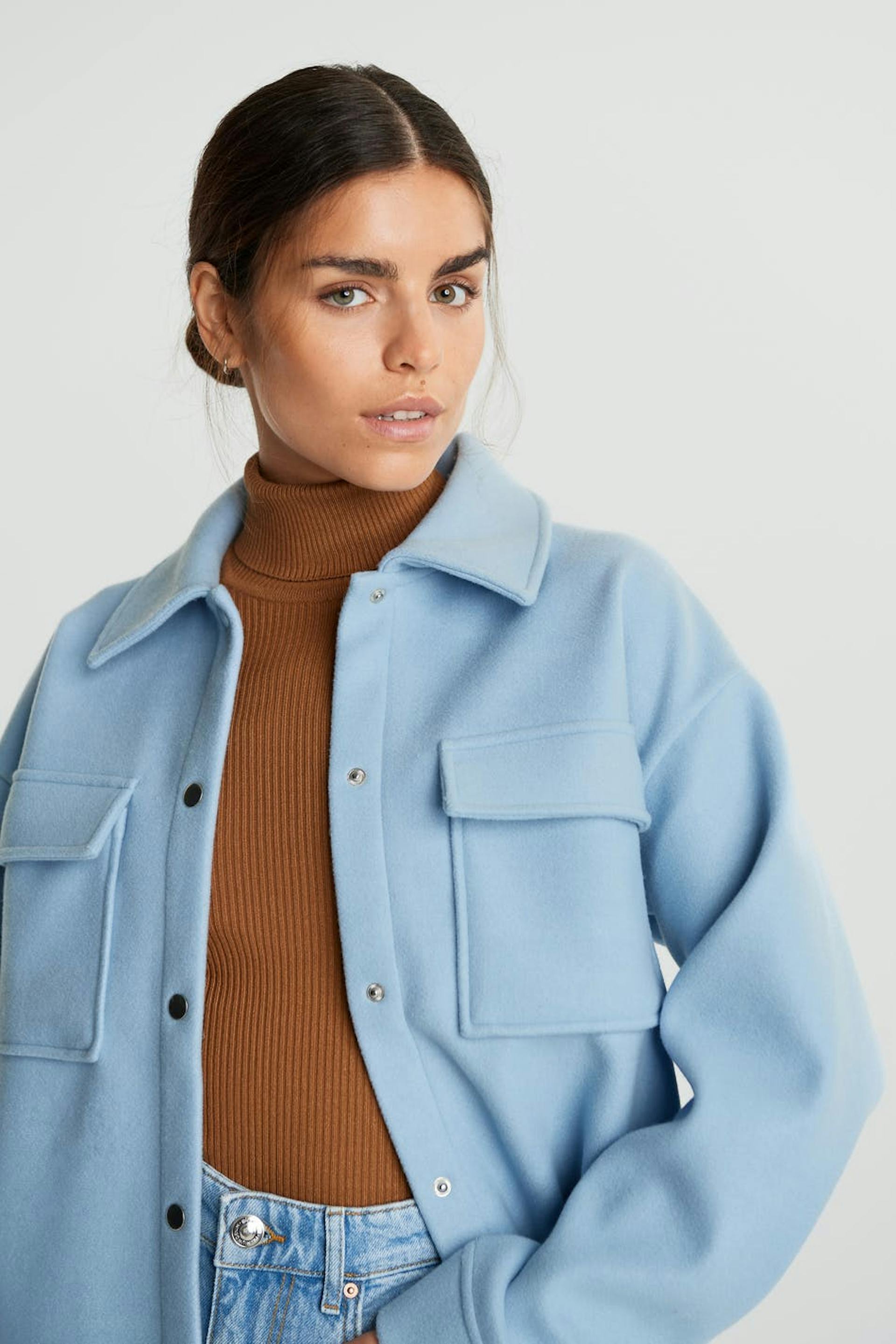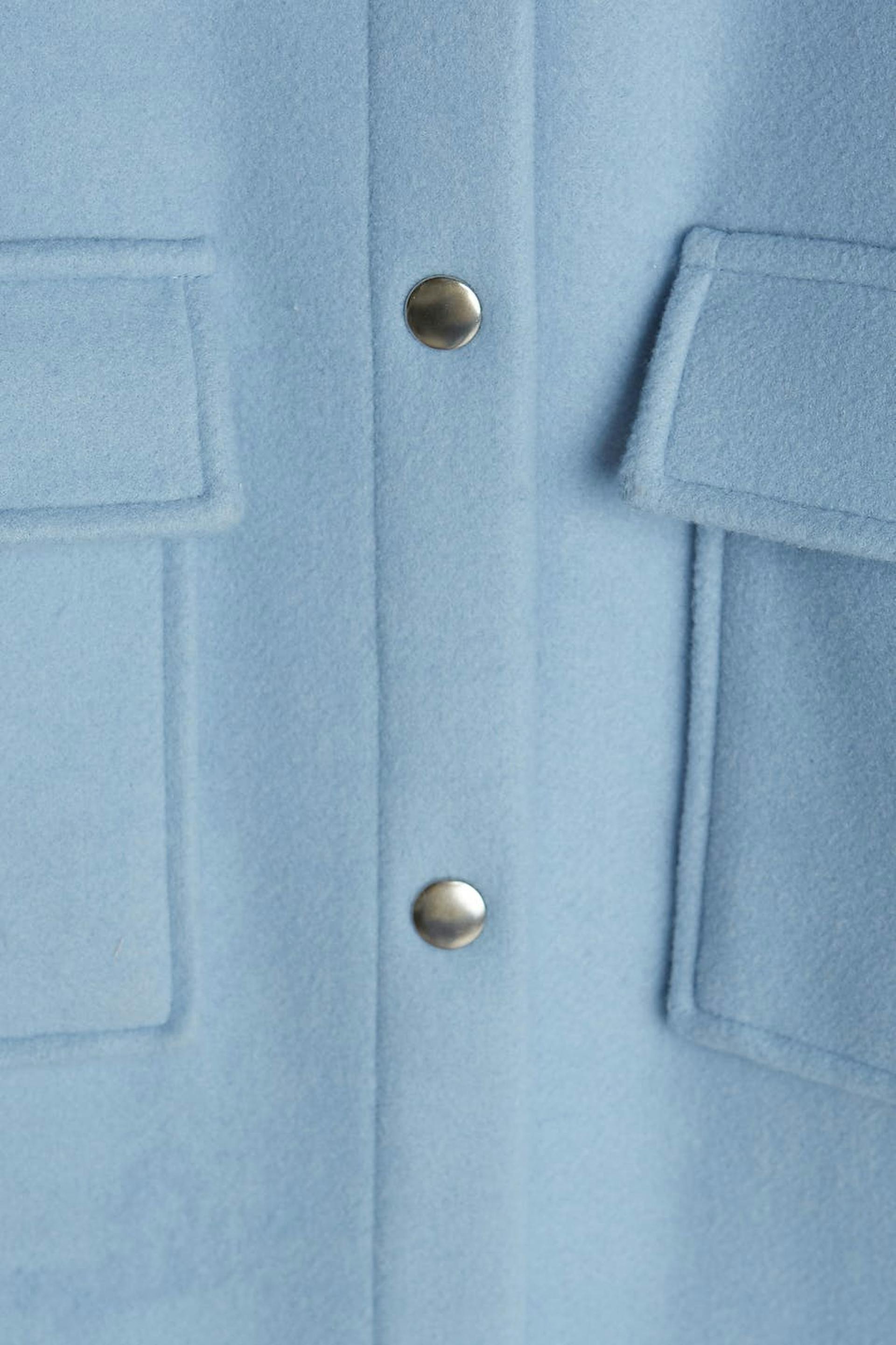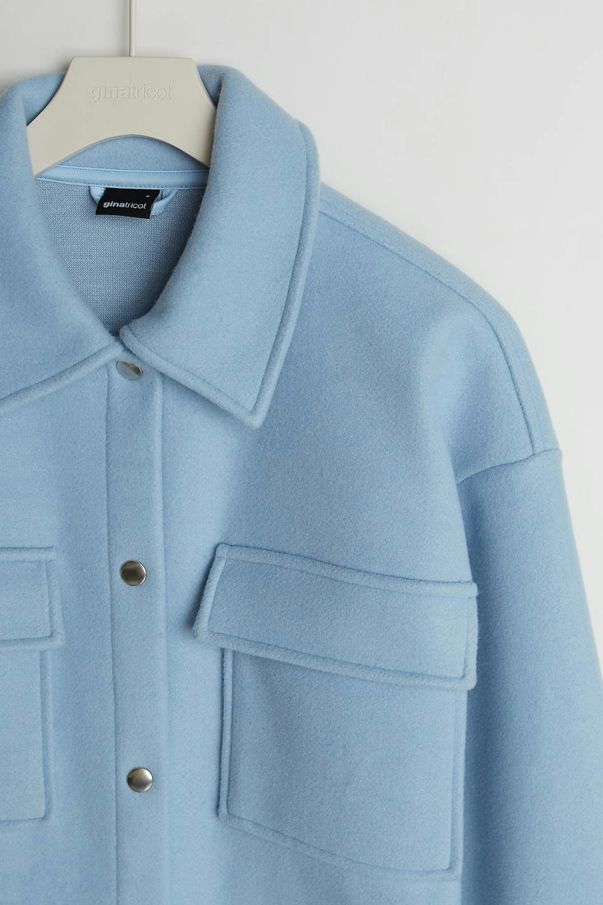 Takki neppareilla edessä. Takki on sininen ja siinä on rintataskut. Se valmistetaan huovasta.