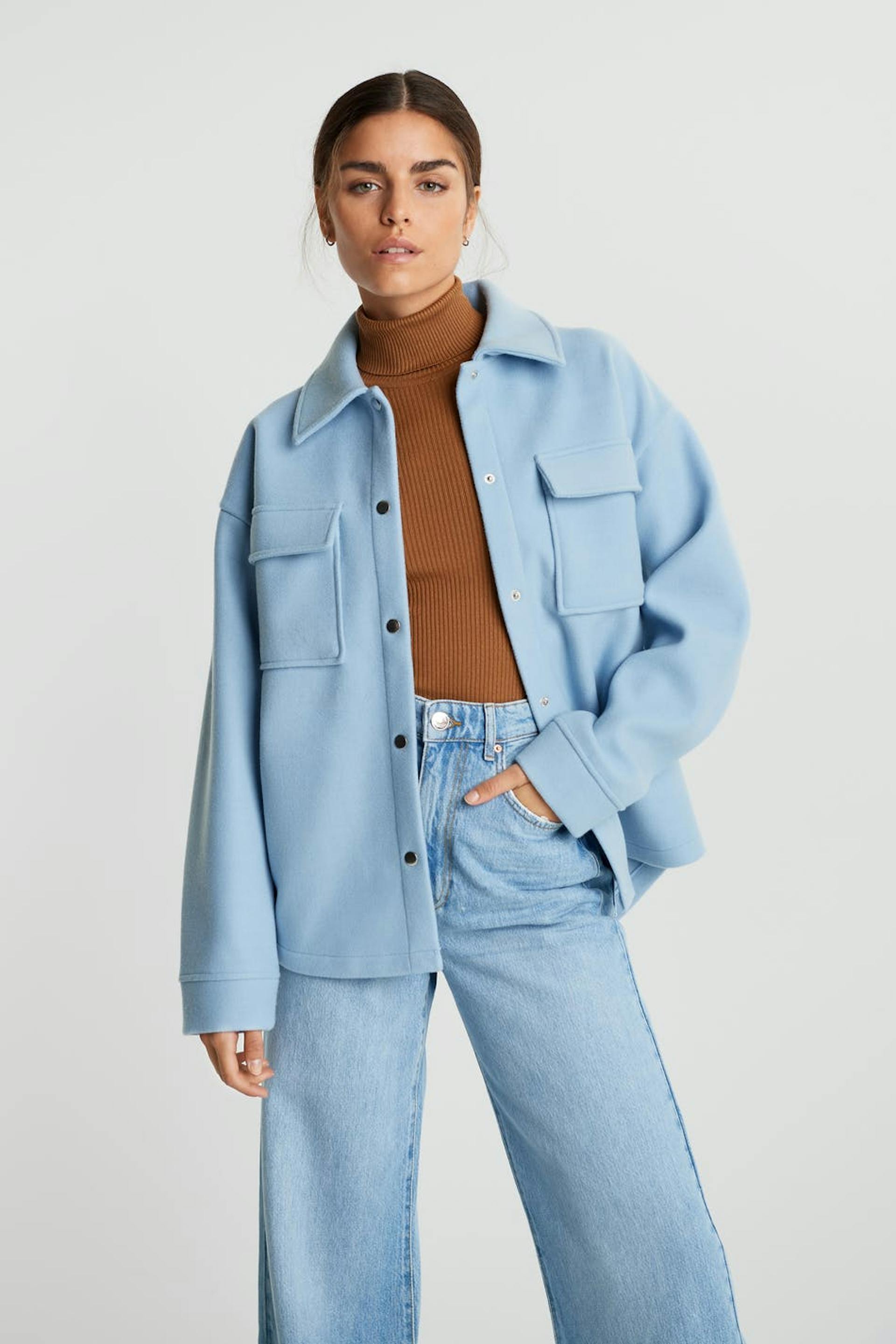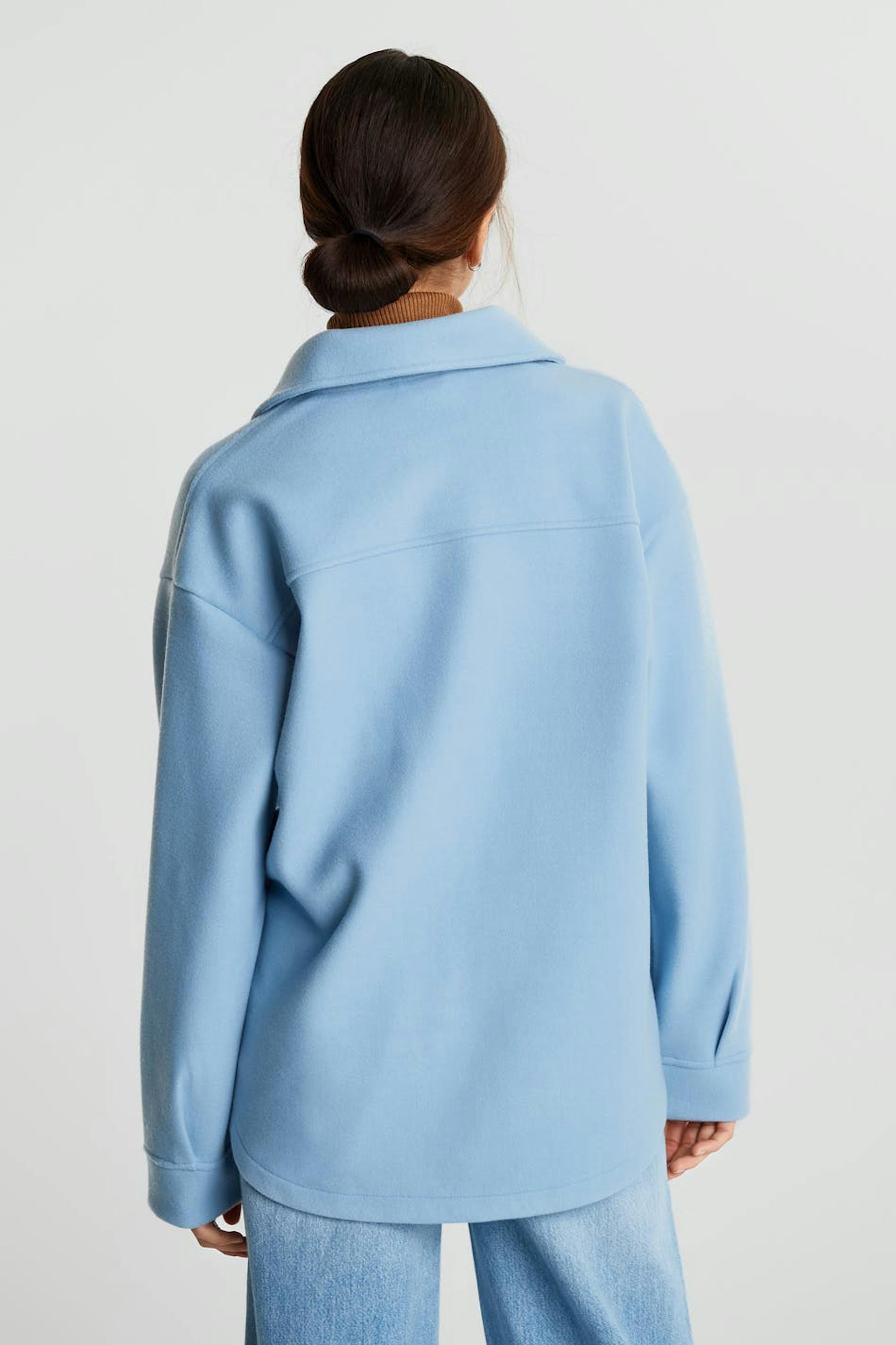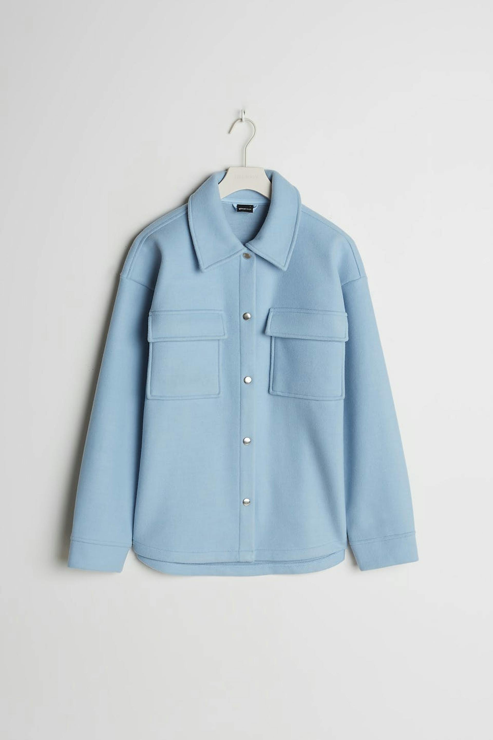 Takki neppareilla edessä. Takki on sininen ja siinä on rintataskut. Se valmistetaan huovasta.