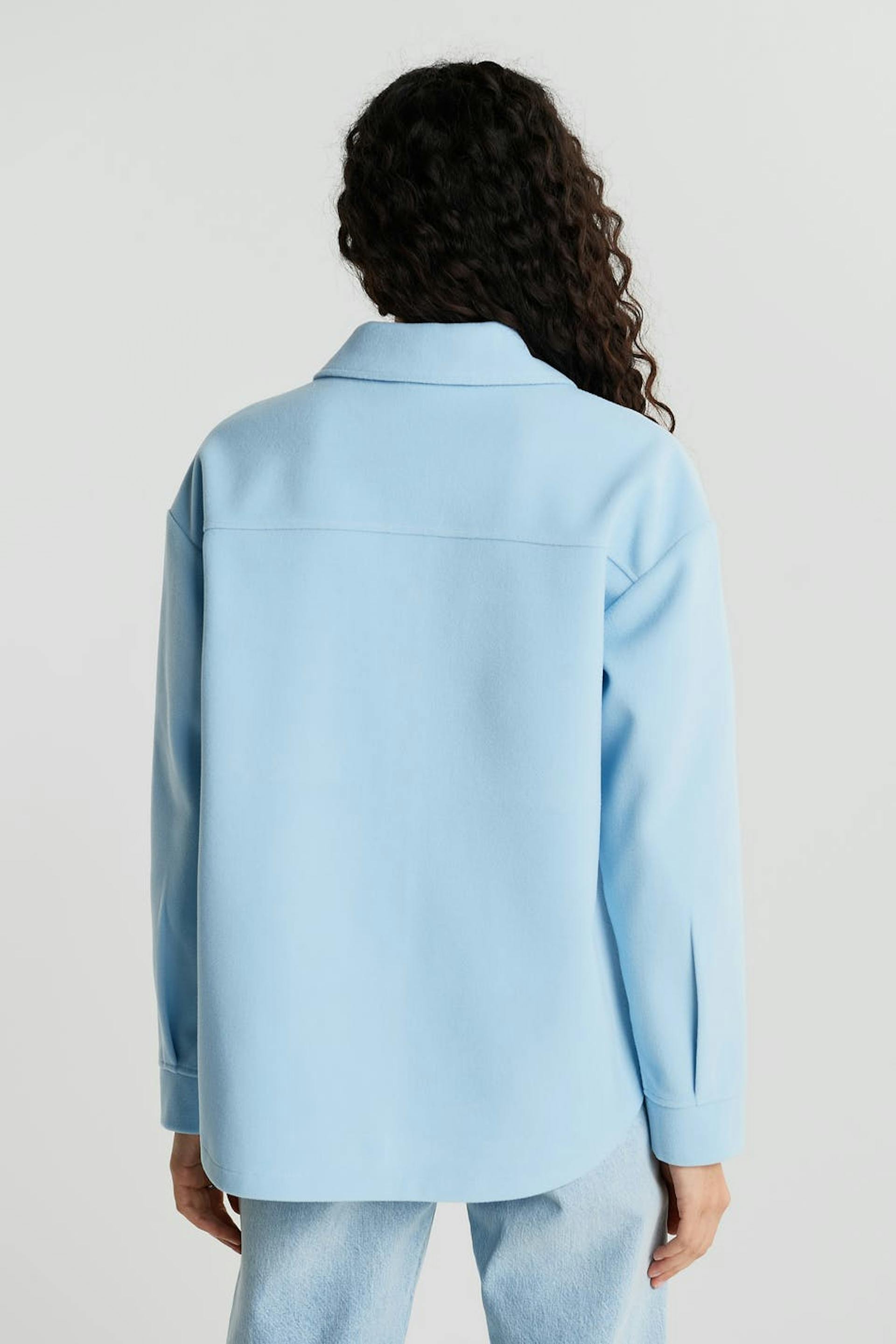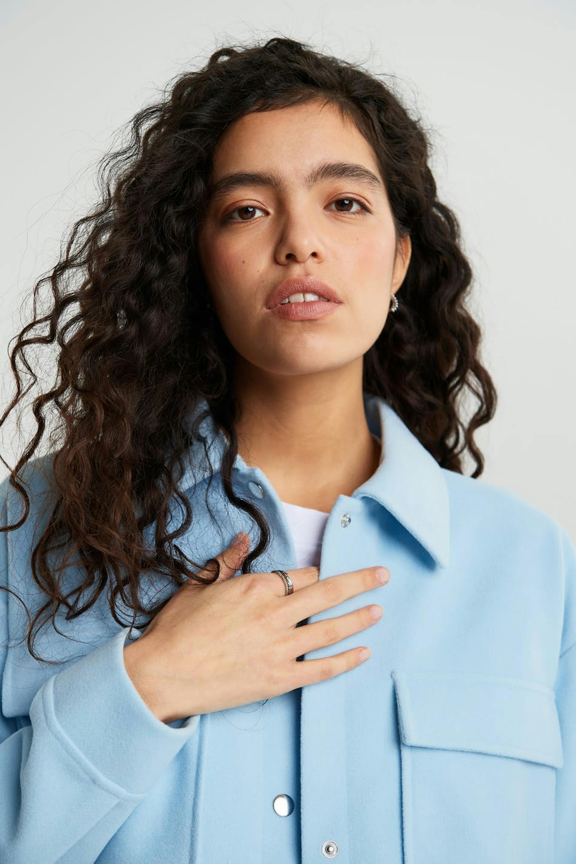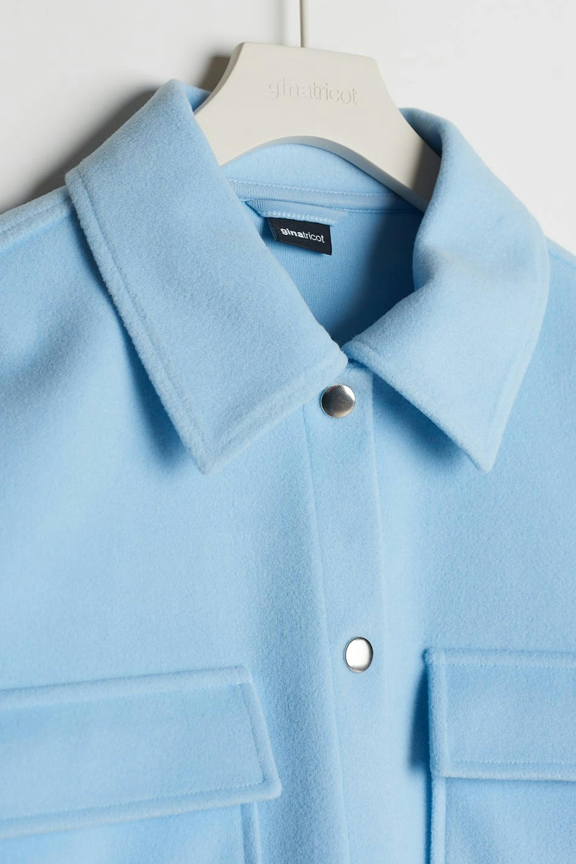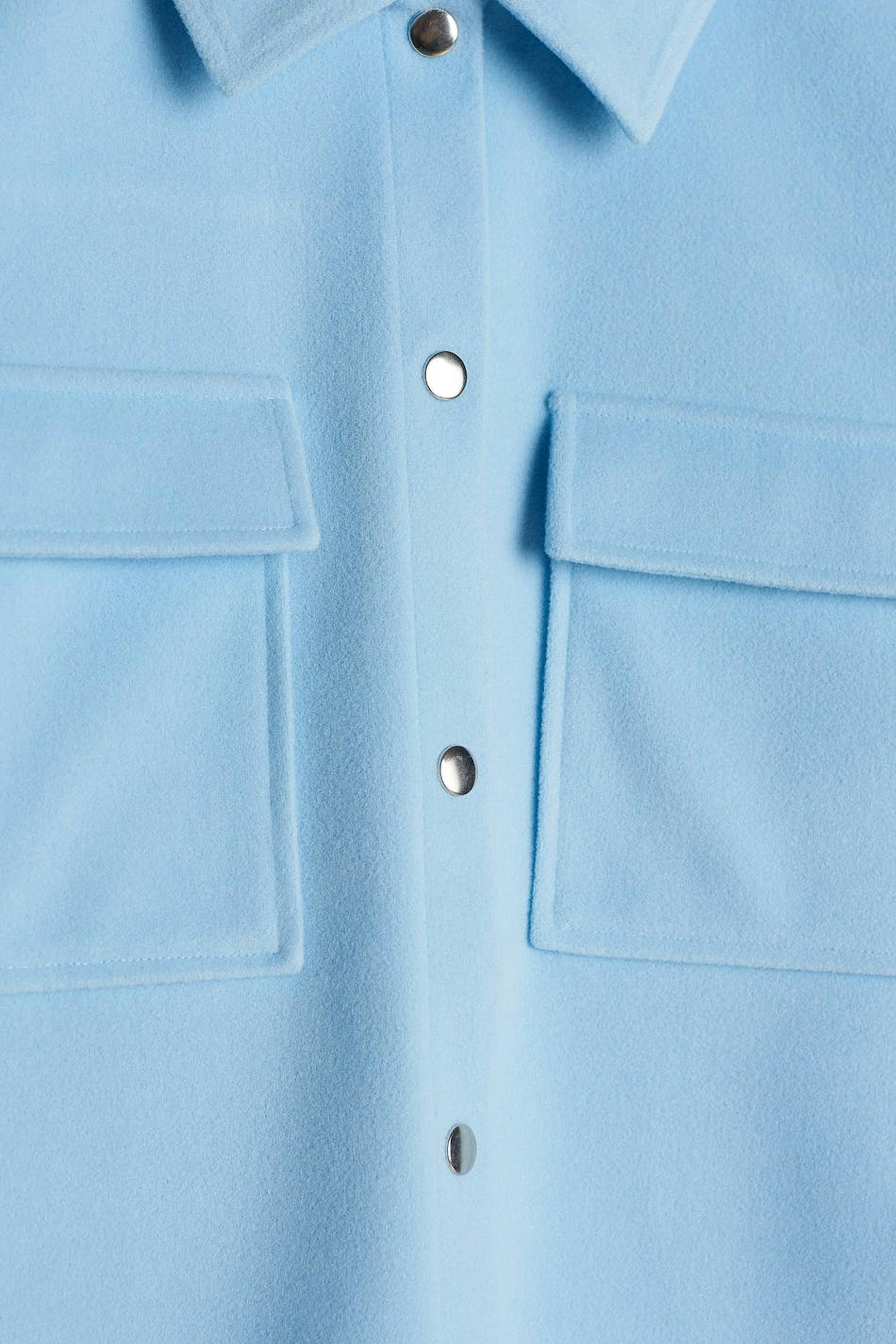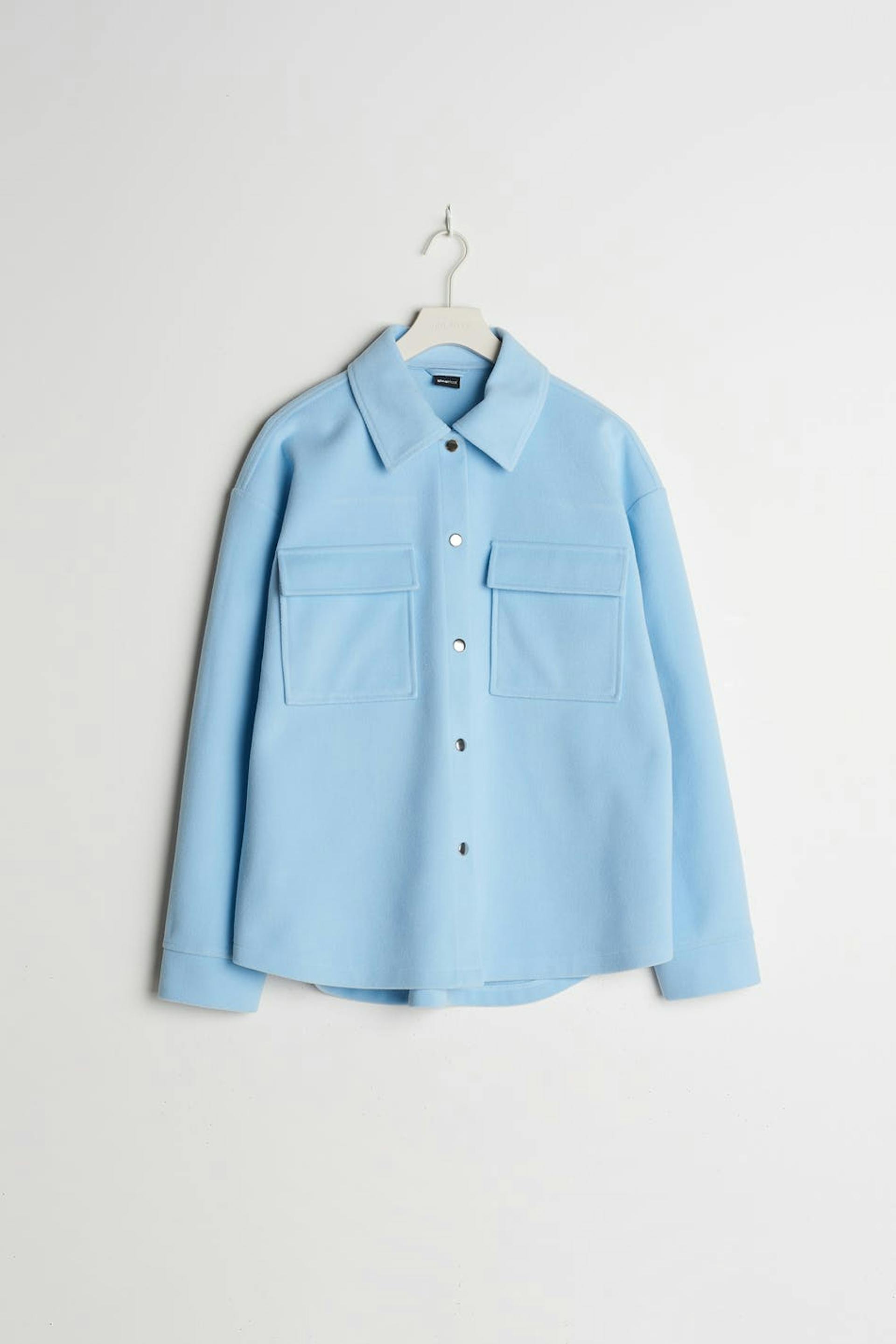 Päällyspaita neppareilla edessä. Shacket on sininen ja siinä on rintataskut. Se valmistetaan huovasta.