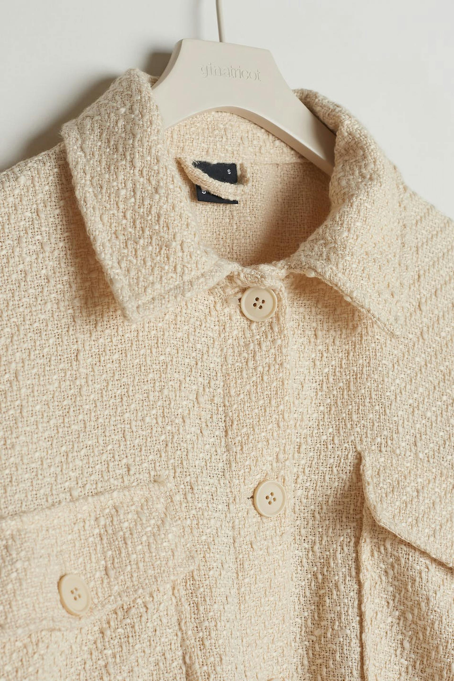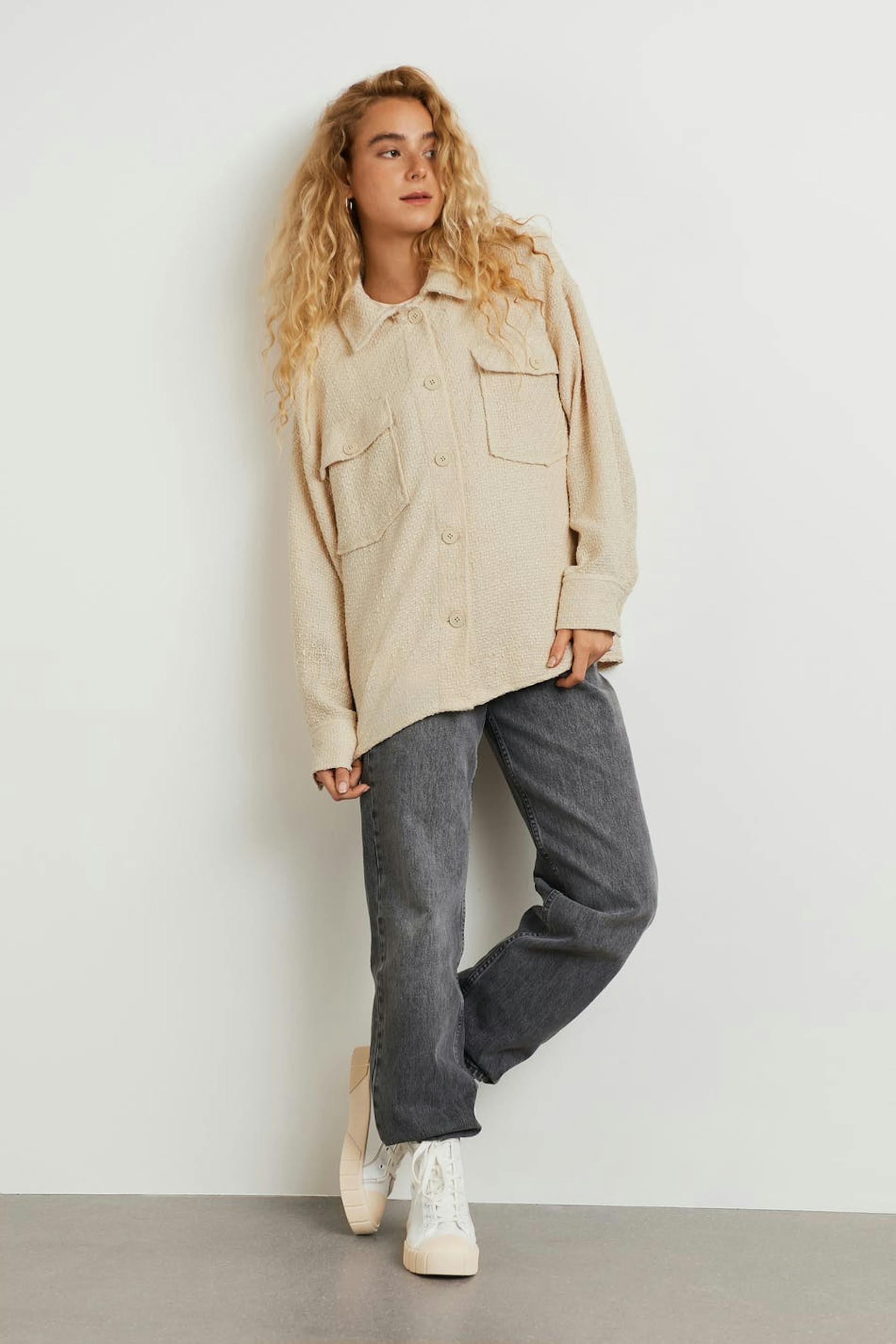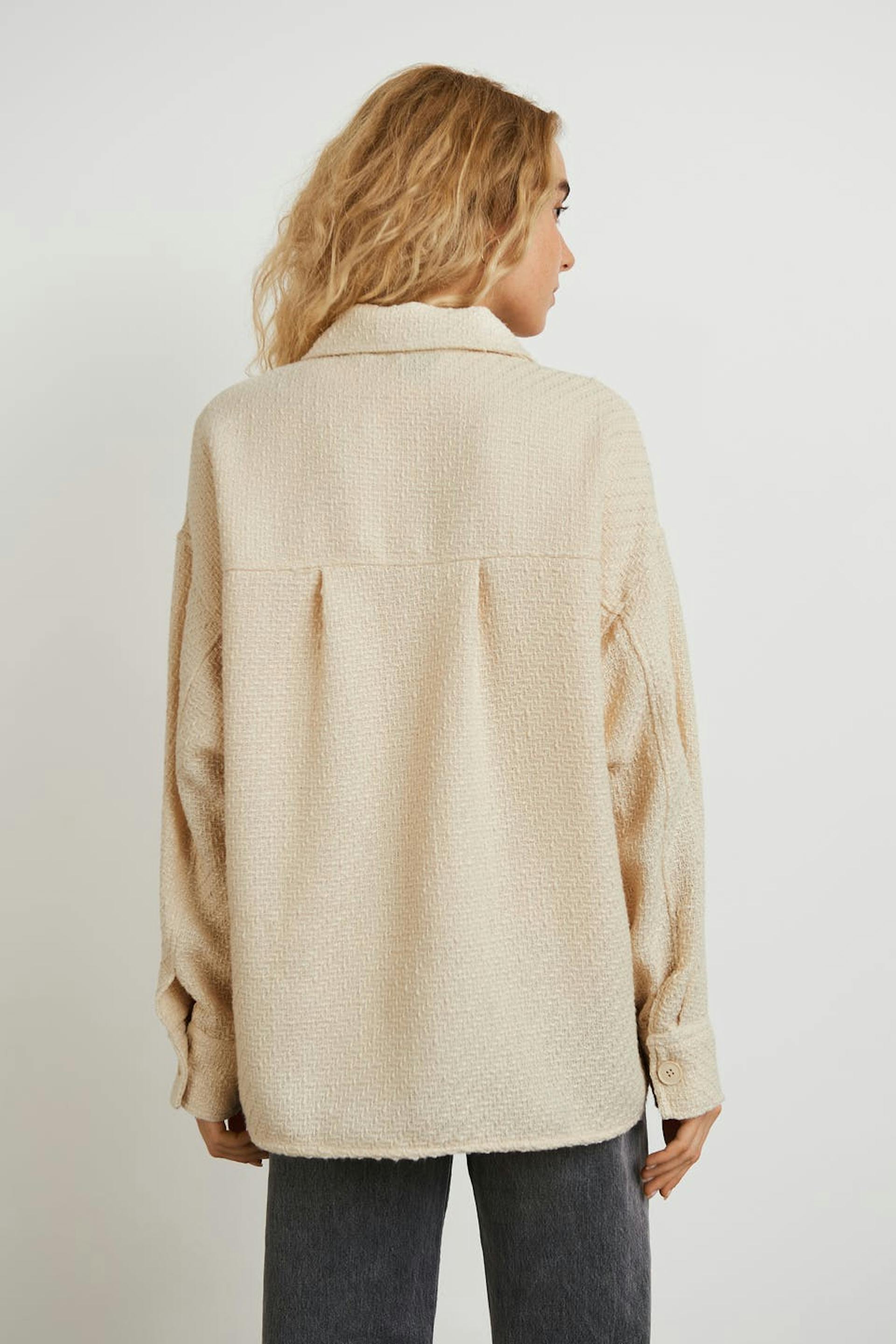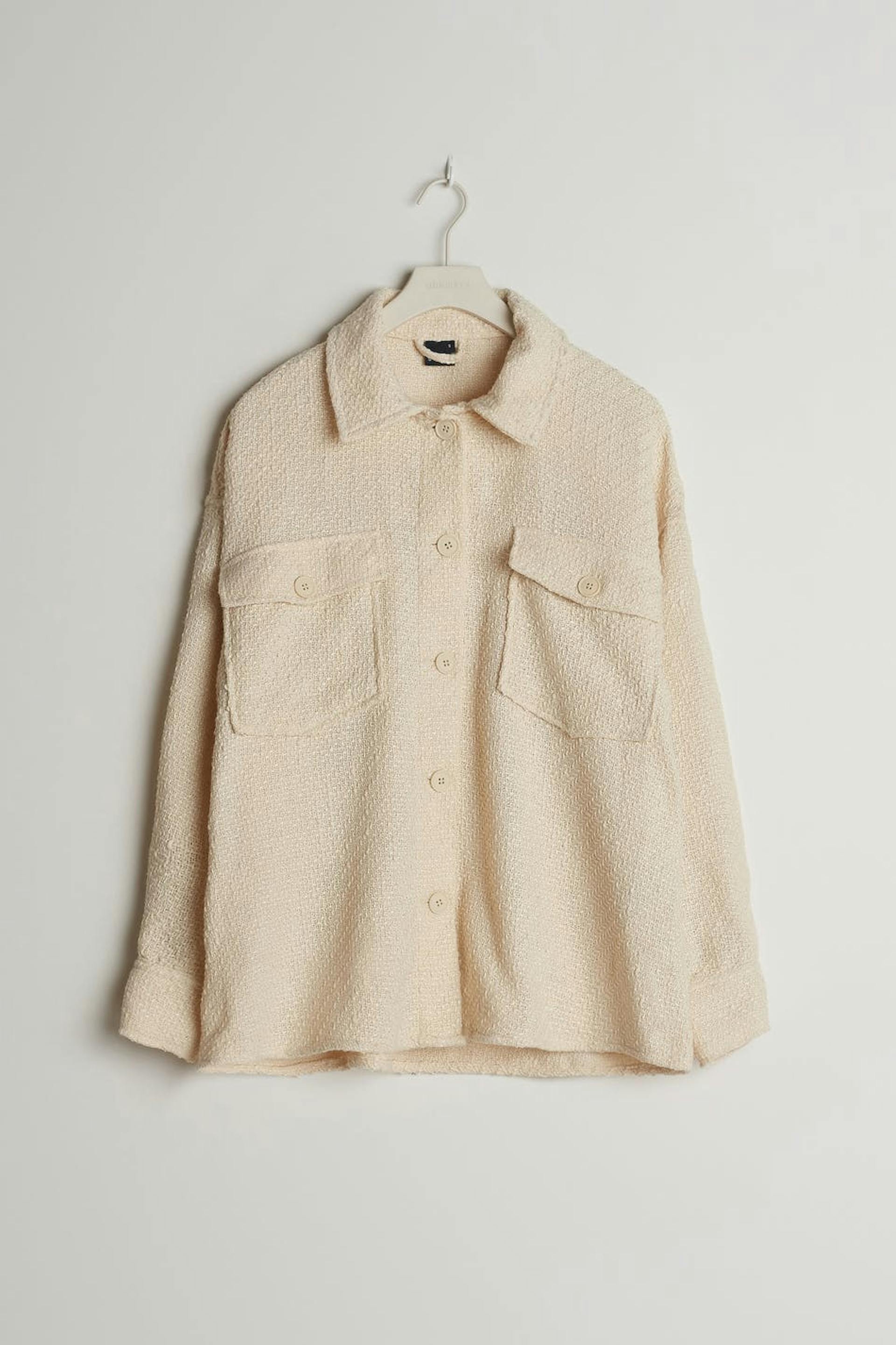 Shacket kudotulla laadulla. Päällyspaita on beige ja siinä on kaulus. Siinä on rintataskut ja nappikiinnitys edessä.