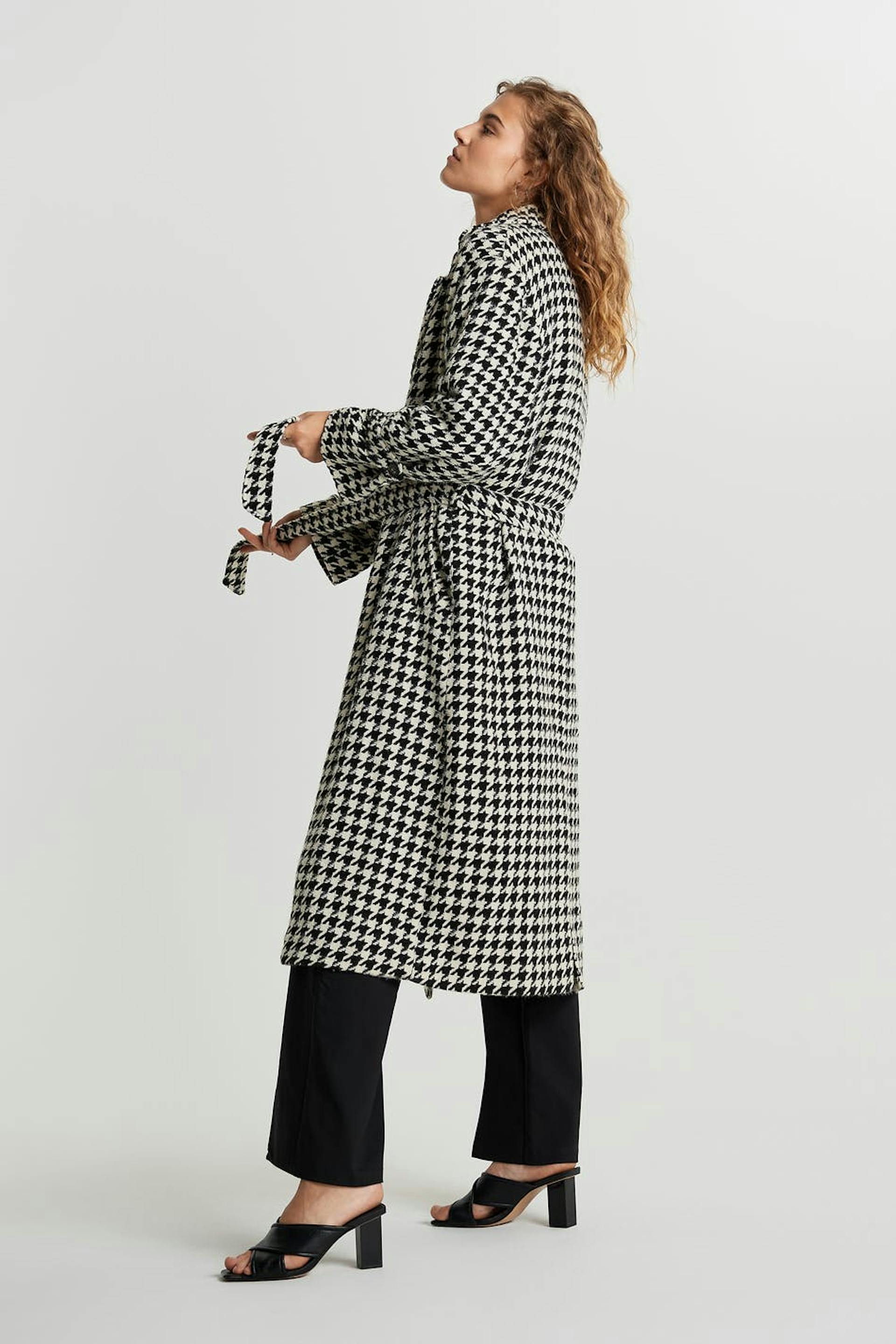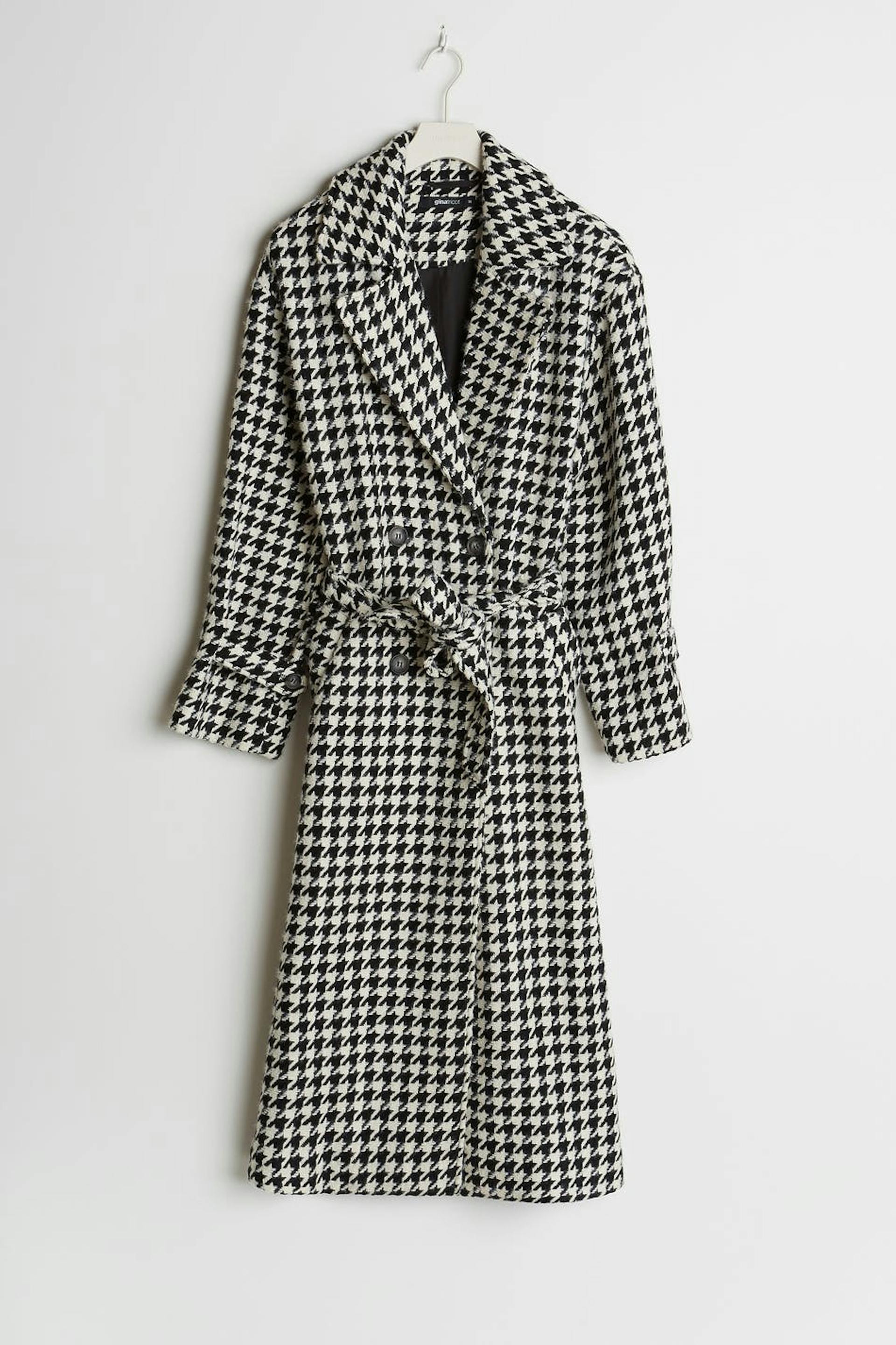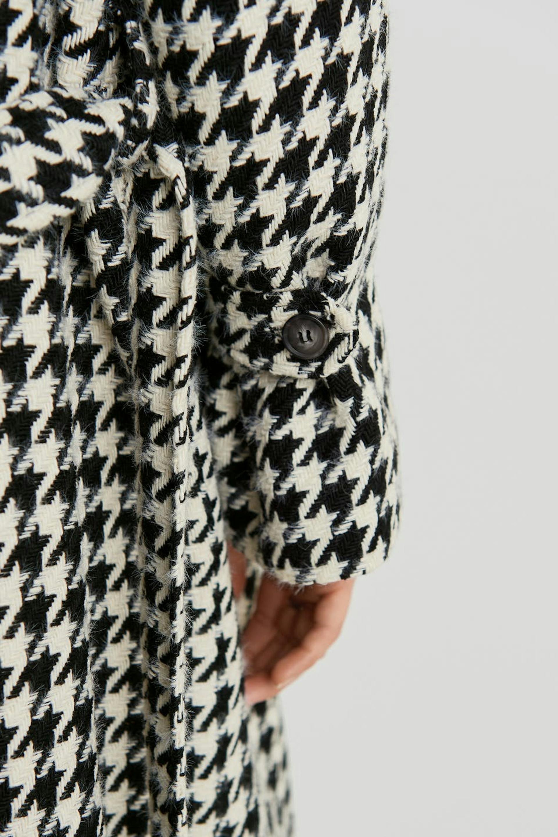 Koiranhammaskuvioinen takki vyöllä. Takki on ylisuuri, pitkä ja kaksirivinen. Siinä on leveät käänteet.