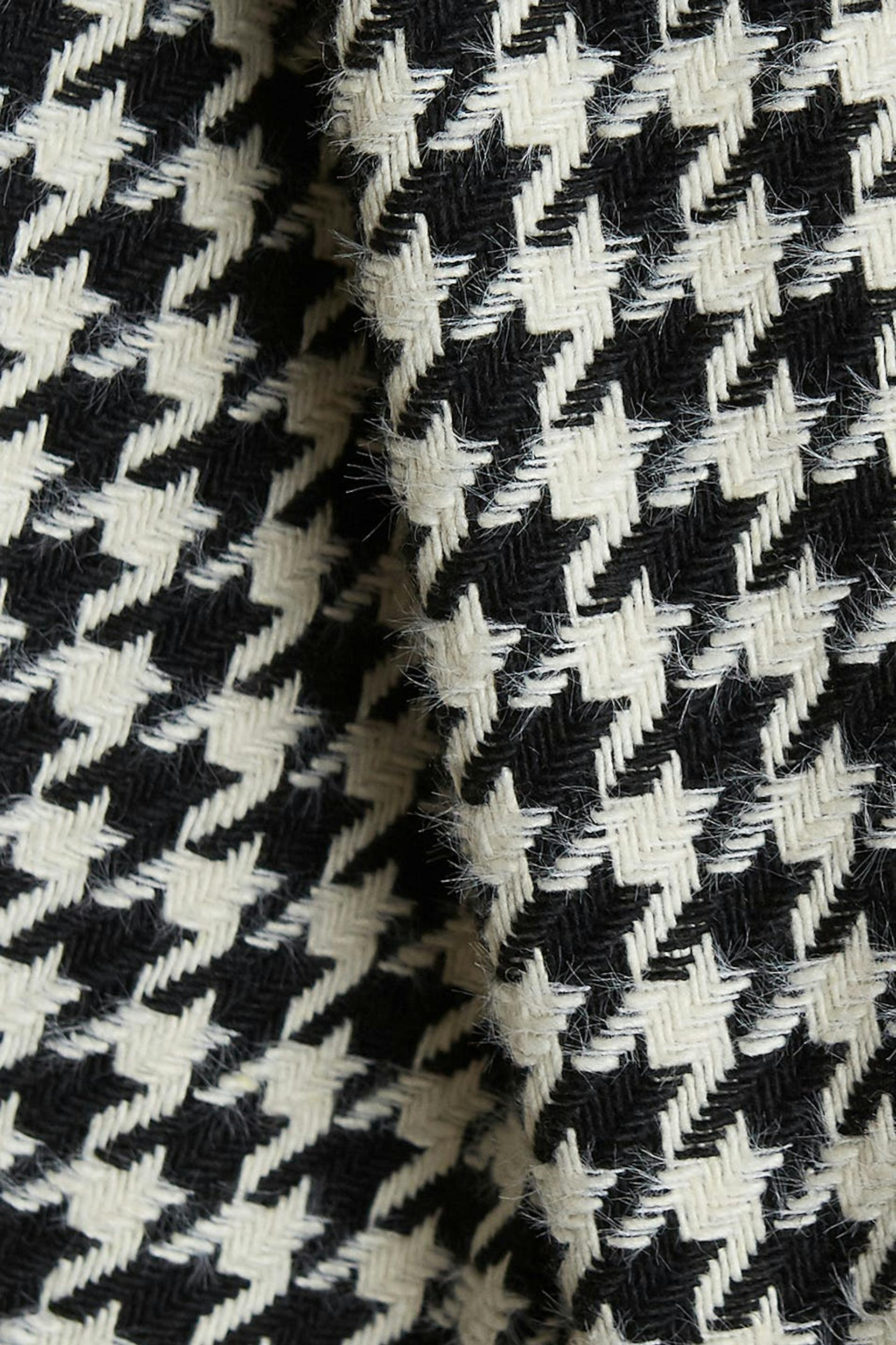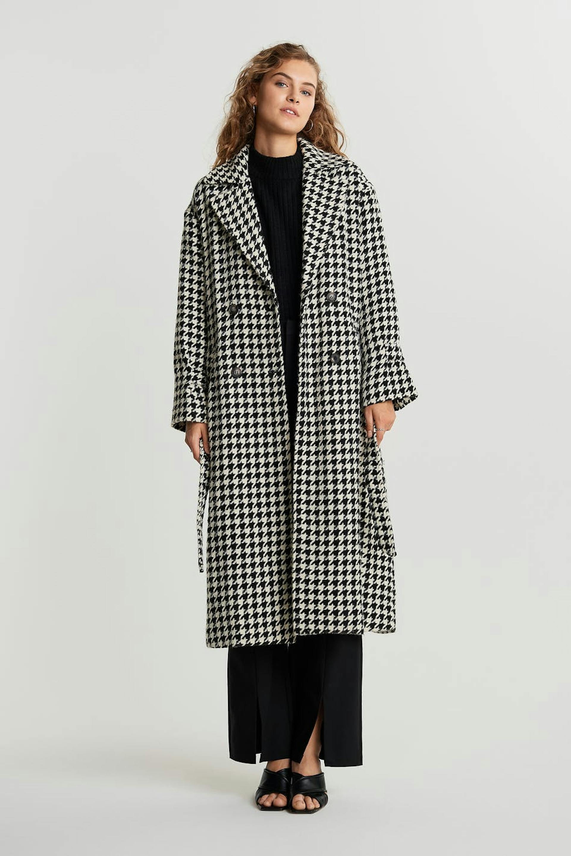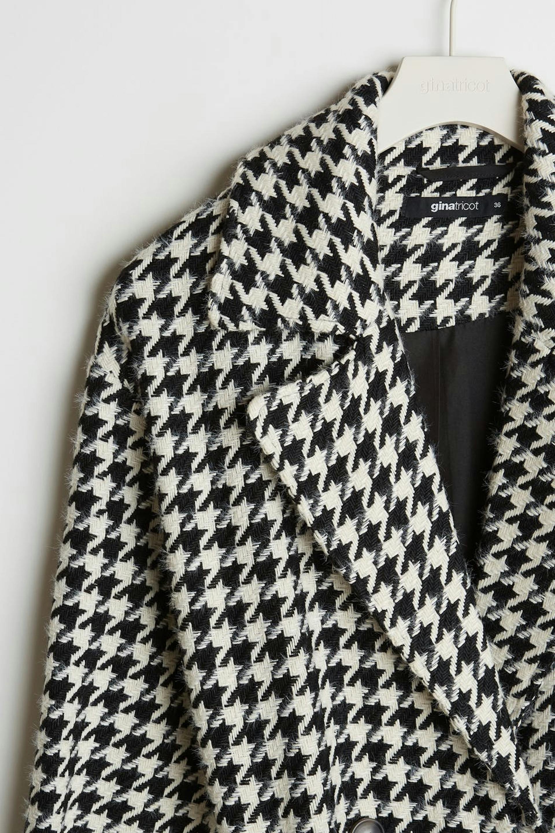 Koiranhammaskuvioinen takki vyöllä. Takki on ylisuuri, pitkä ja kaksirivinen. Siinä on leveät käänteet.