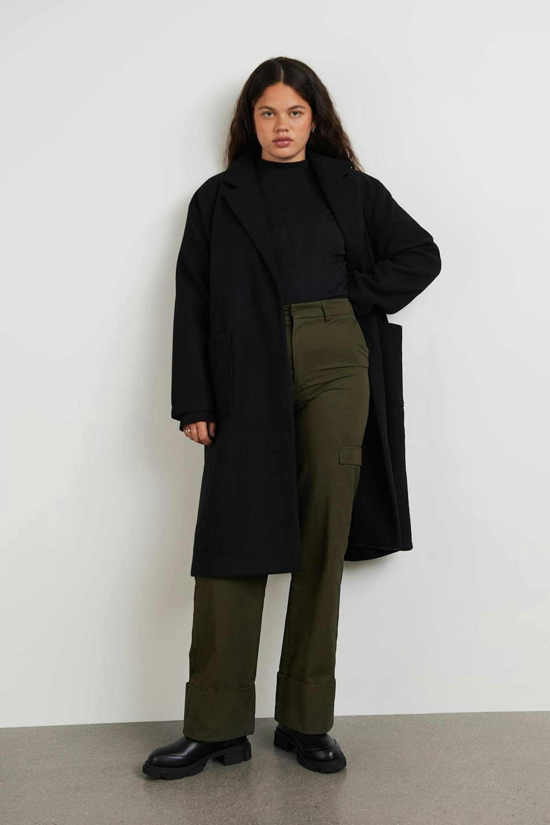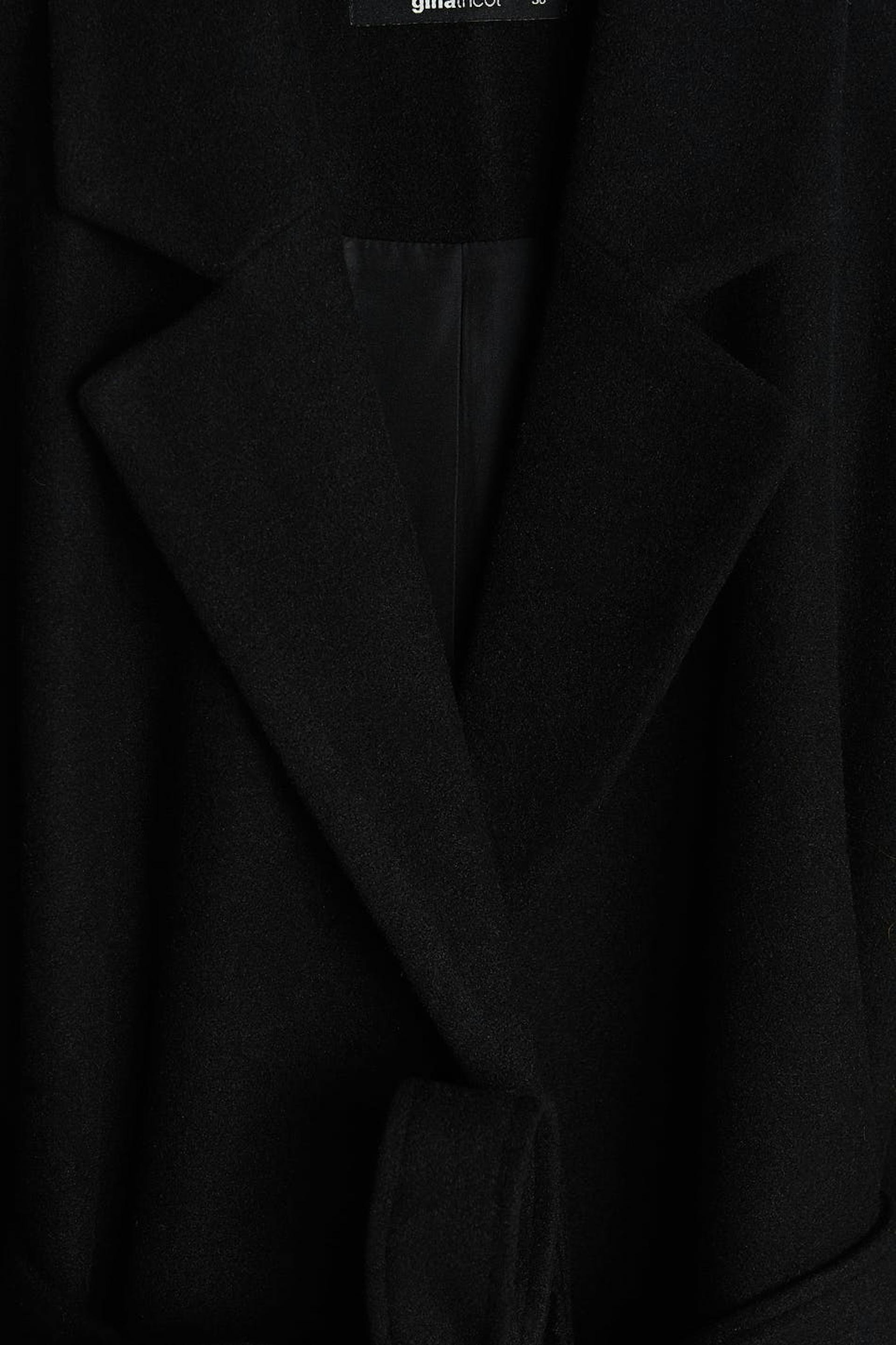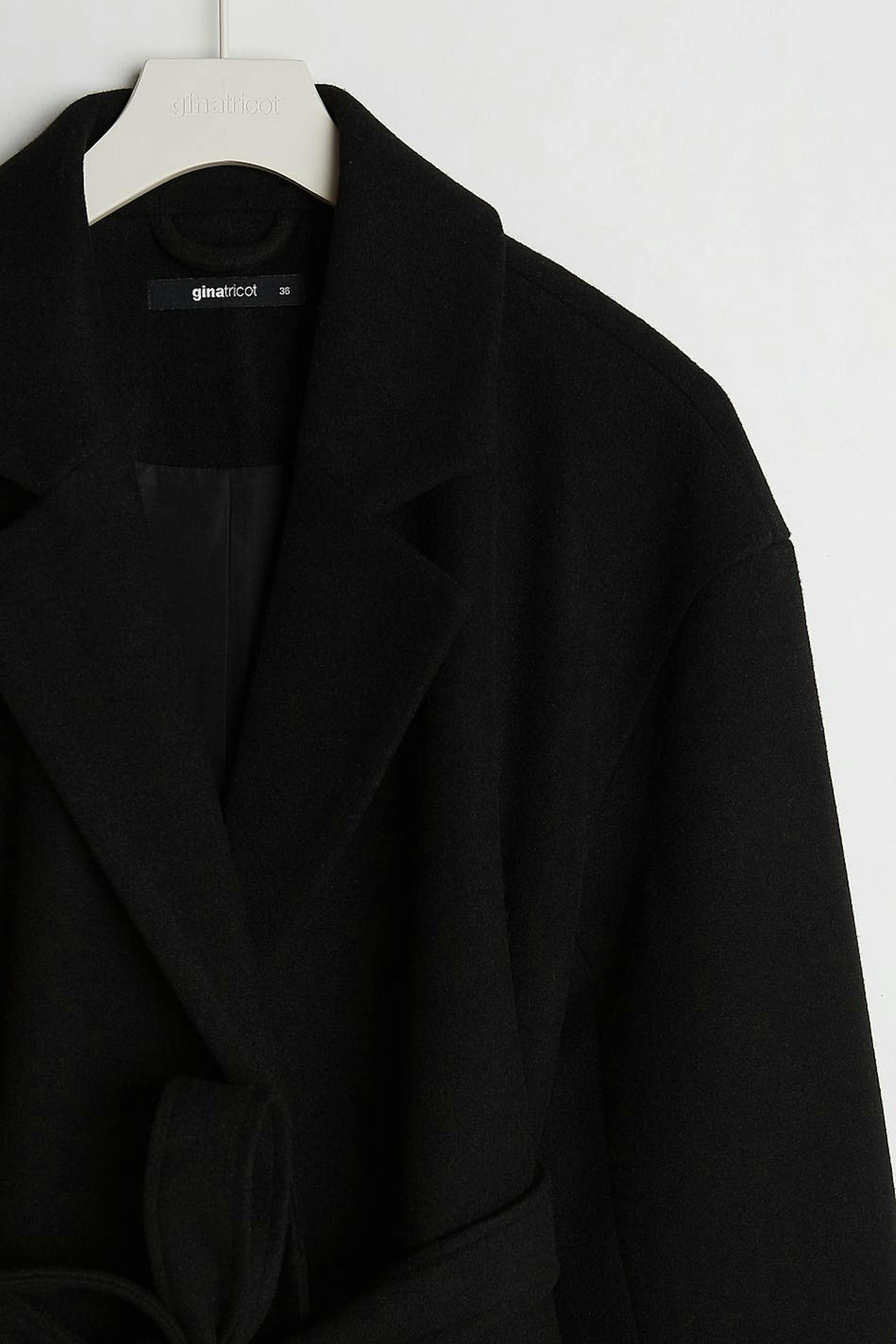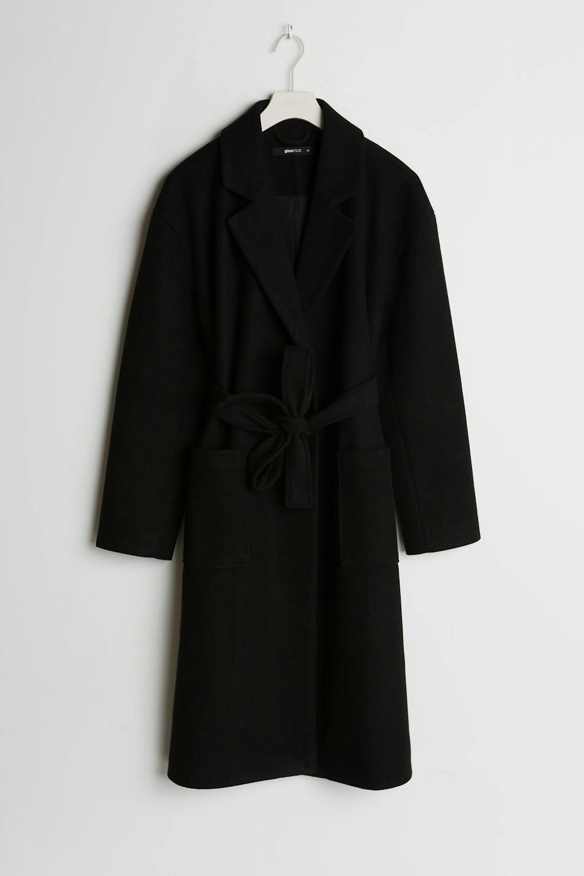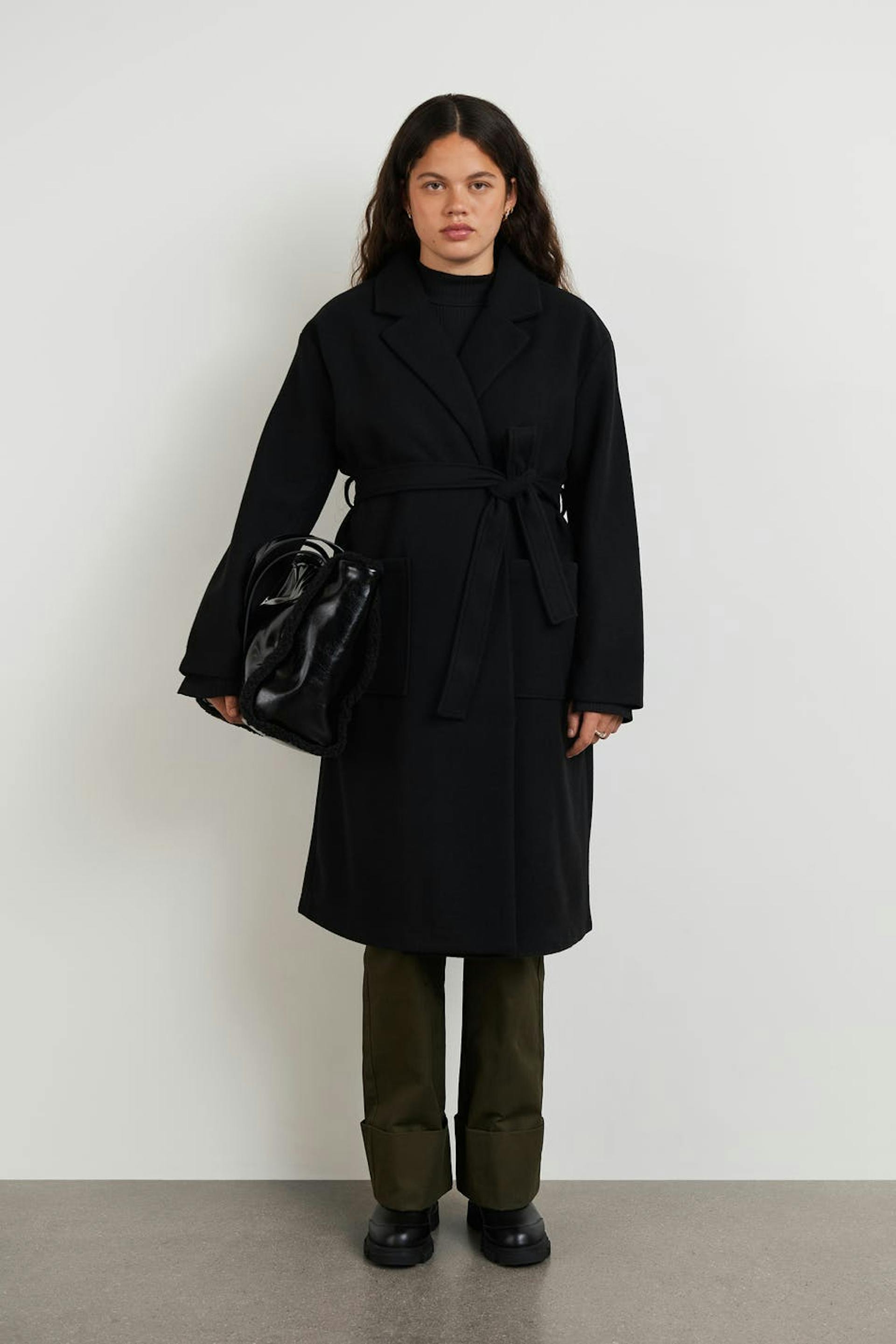Takki vyöllä vyötäröllä. Takki on musta ja siinä on ylisuuri istuvuus. Siinä on suora malli.