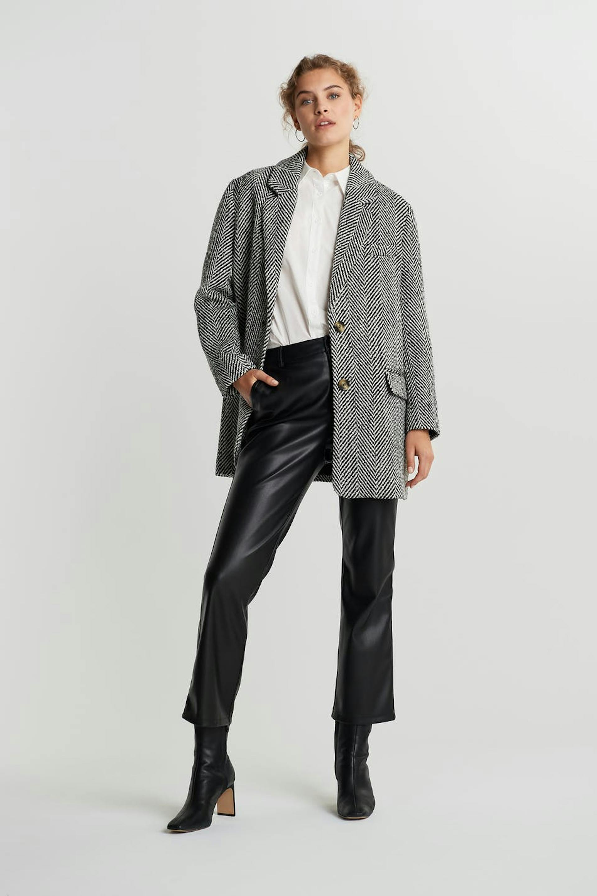 Mustavalkoisella kuviolla koristeltu takki napeilla edessä. Takki on lyhyt ja ylisuuri ja siinä on taskut.