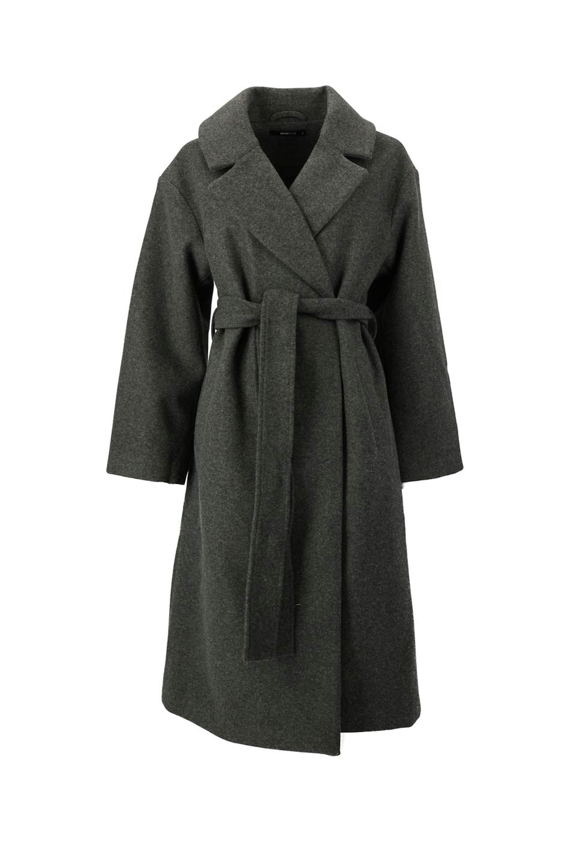 Pitkä takki vyöllä vyötäröllä. Takki on harmaa, kaksirivinen ja suora. Siinä on oversized-malli, taskut sivuilla ja kaulus lovikauluksella.