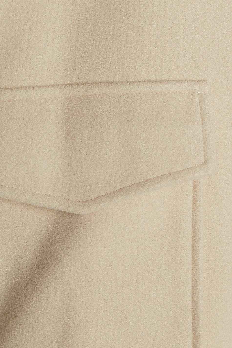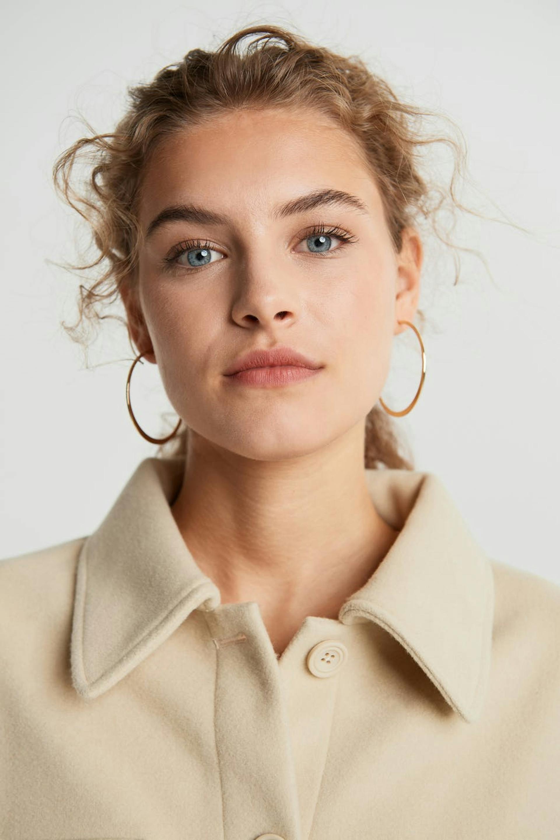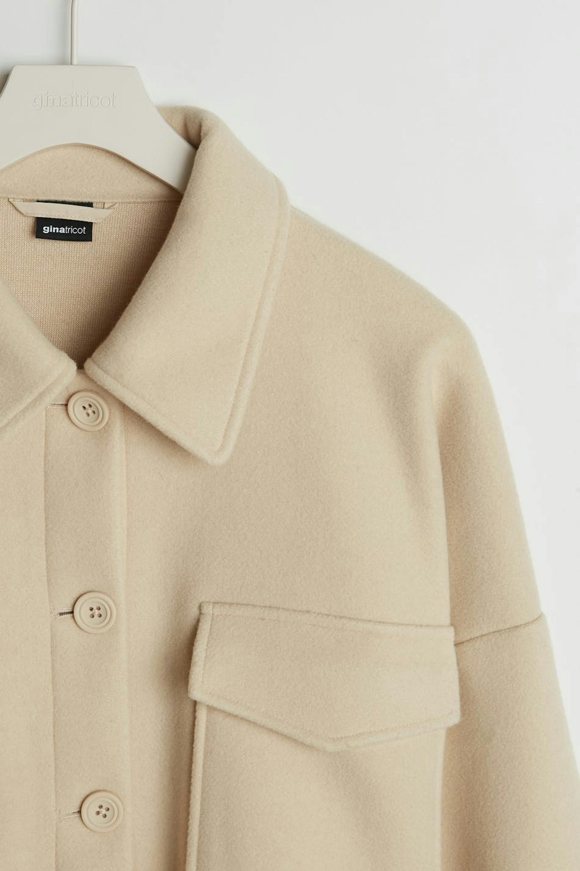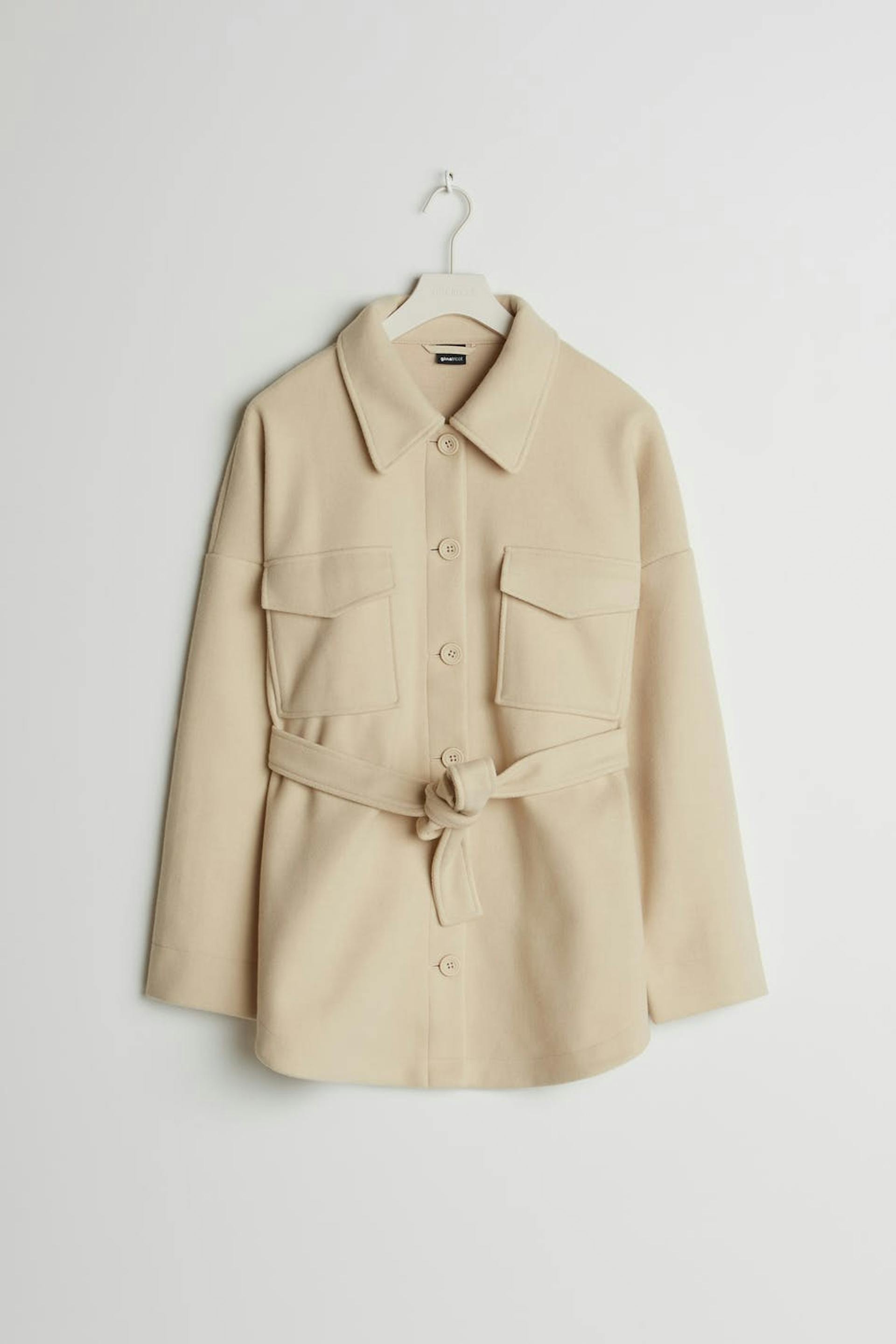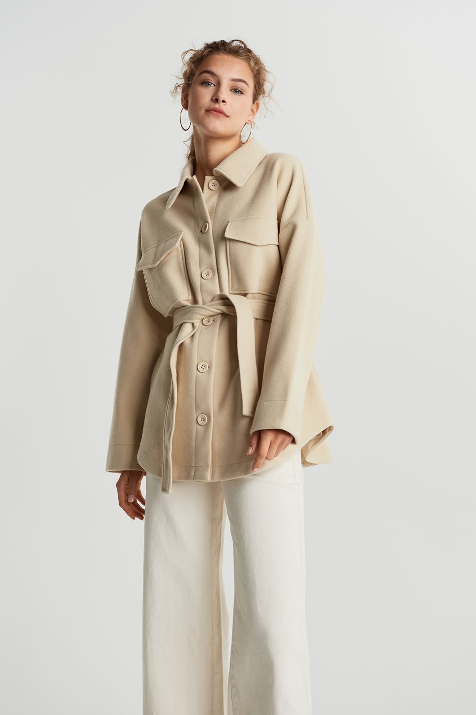 Takki ylisuuri istuvuudella. Takki on beige ja siinä on vyö vyötäröllä. Se valmistetaan huovasta ja siinä on napit edessä ja taskut rinnassa ja edessä.