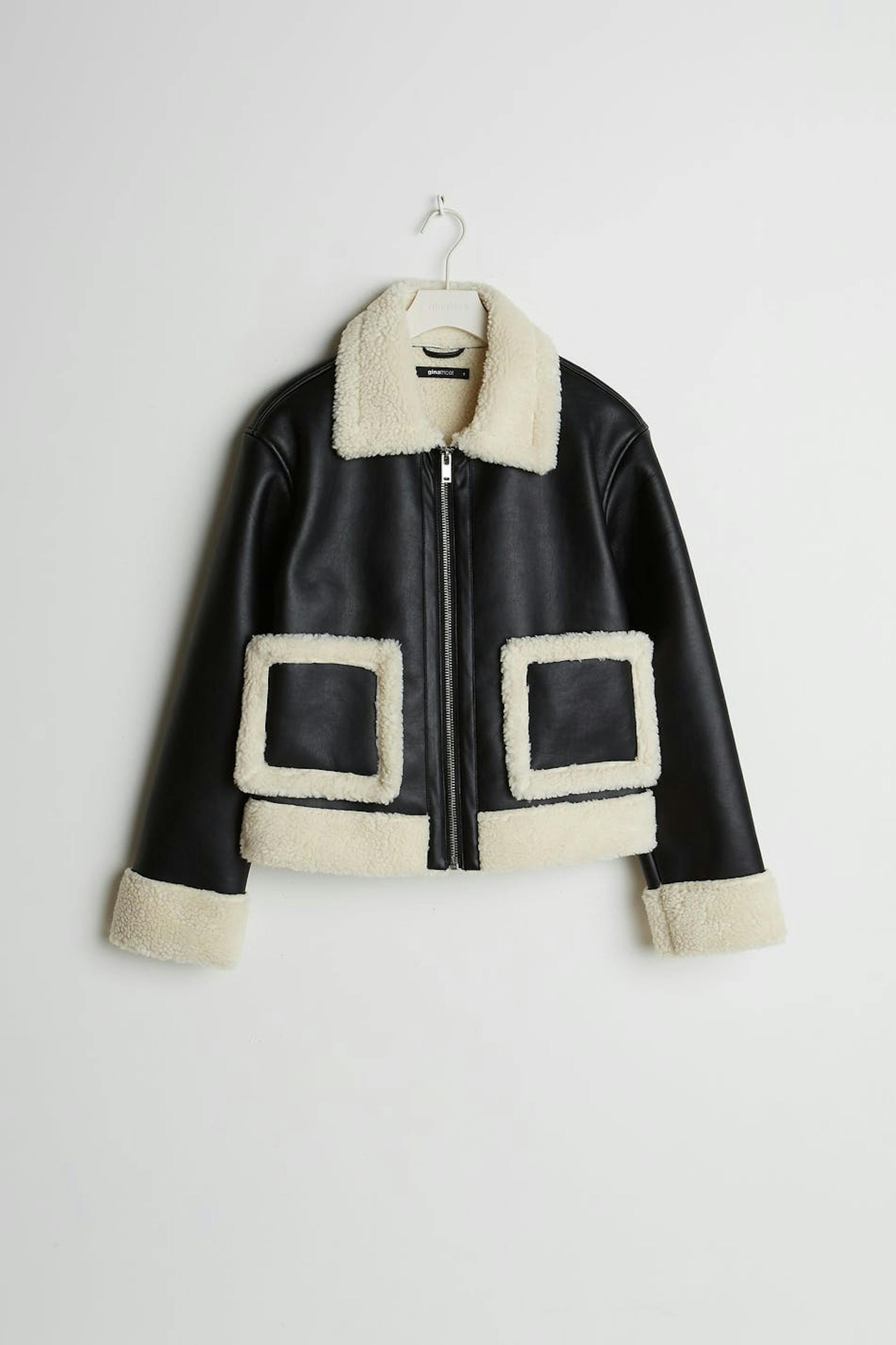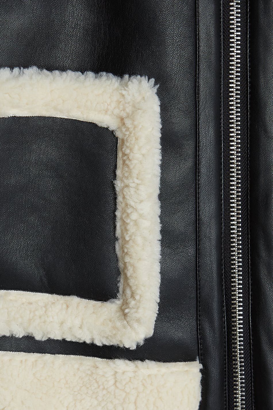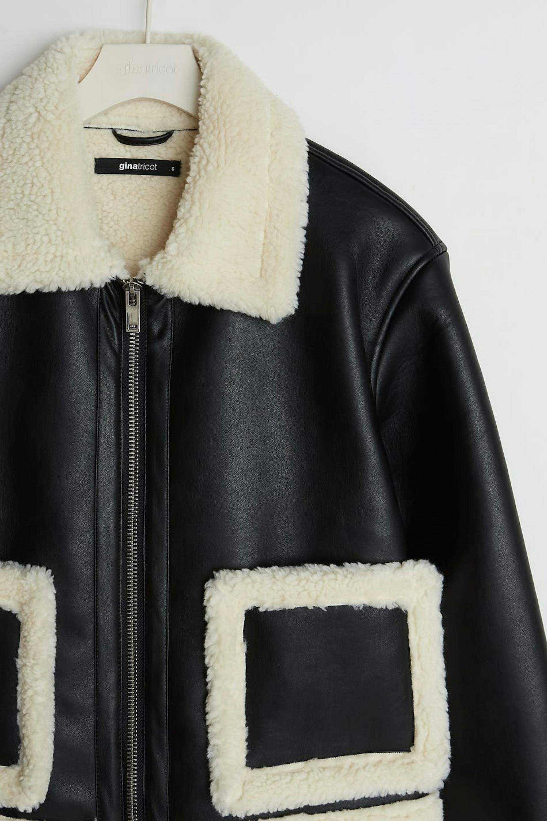 Takki yksityiskohdilla valkoisella vuorauksella hihansuissa, kauluksessa, helmassa ja taskuissa. Takki on musta ja siinä on napituslista vetoketjulla. Se valmistetaan PU-nahkasta.