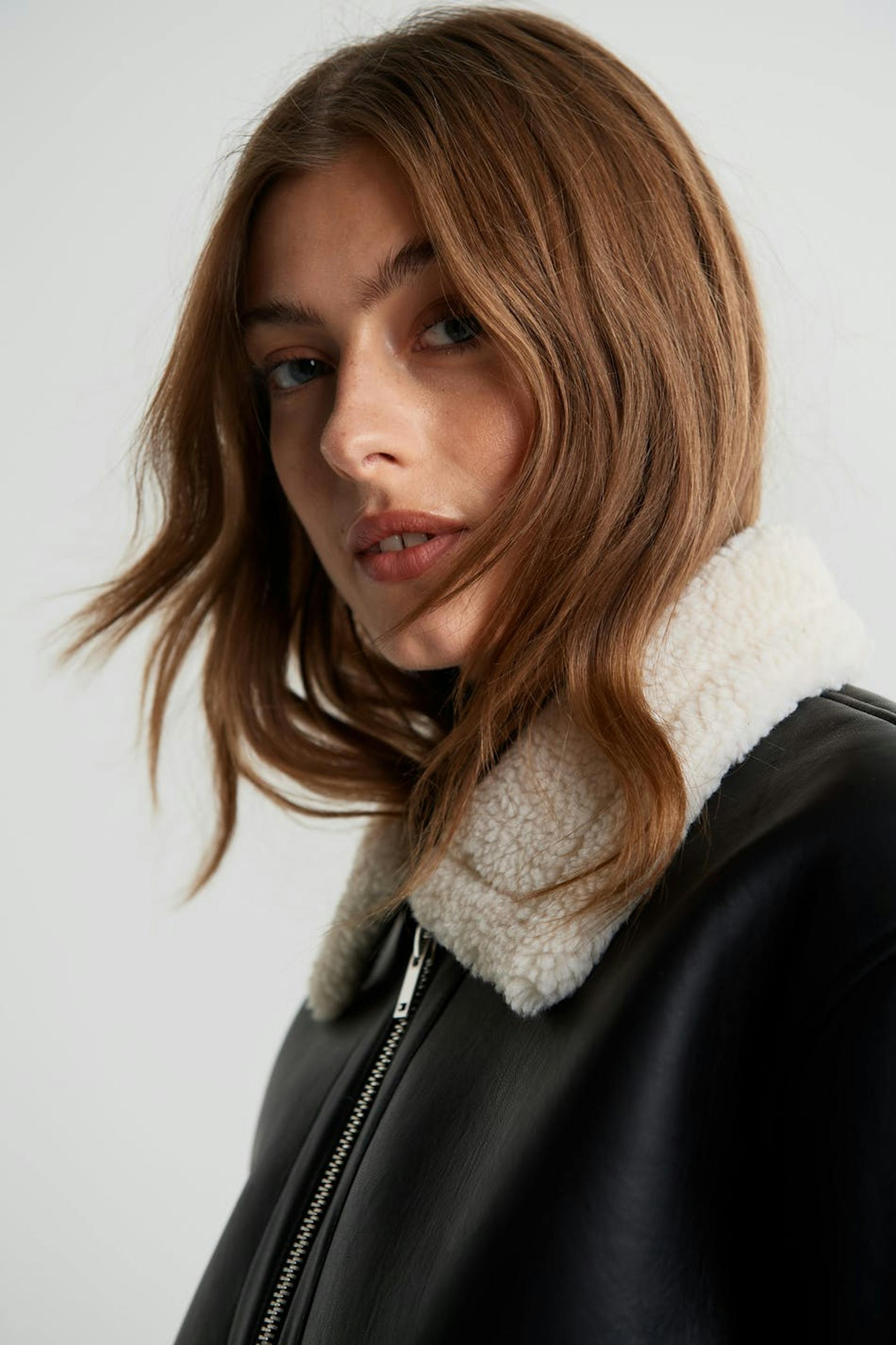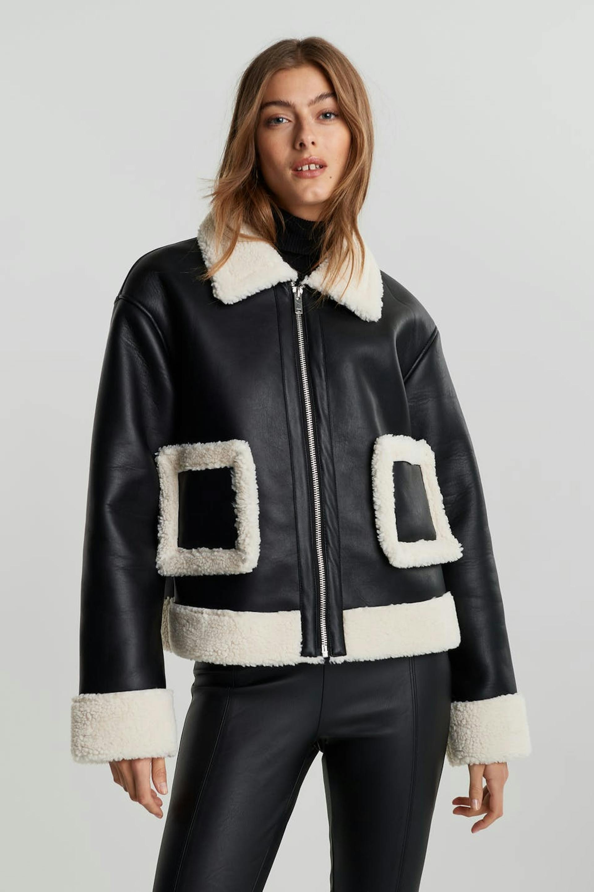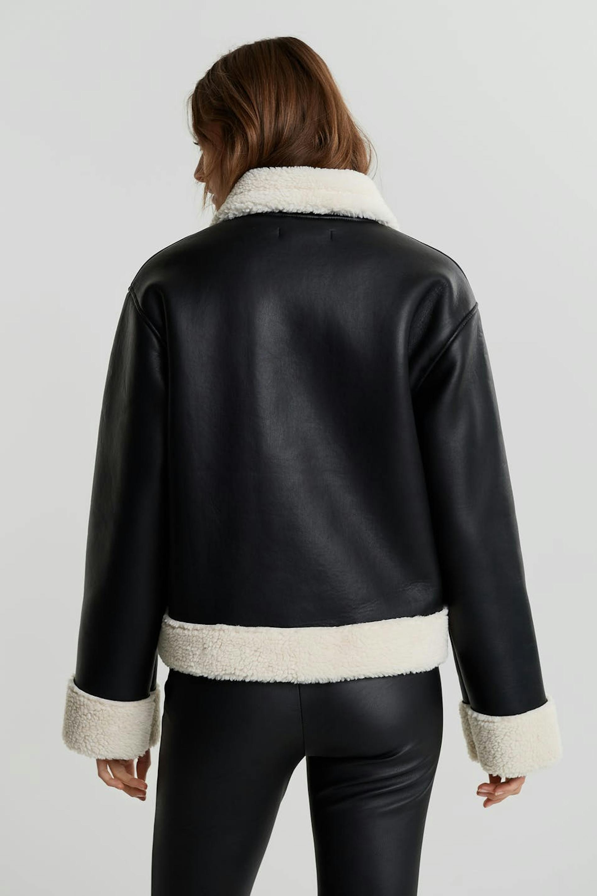 Takki yksityiskohdilla valkoisella vuorauksella hihansuissa, kauluksessa, helmassa ja taskuissa. Takki on musta ja siinä on napituslista vetoketjulla. Se valmistetaan PU-nahkasta.