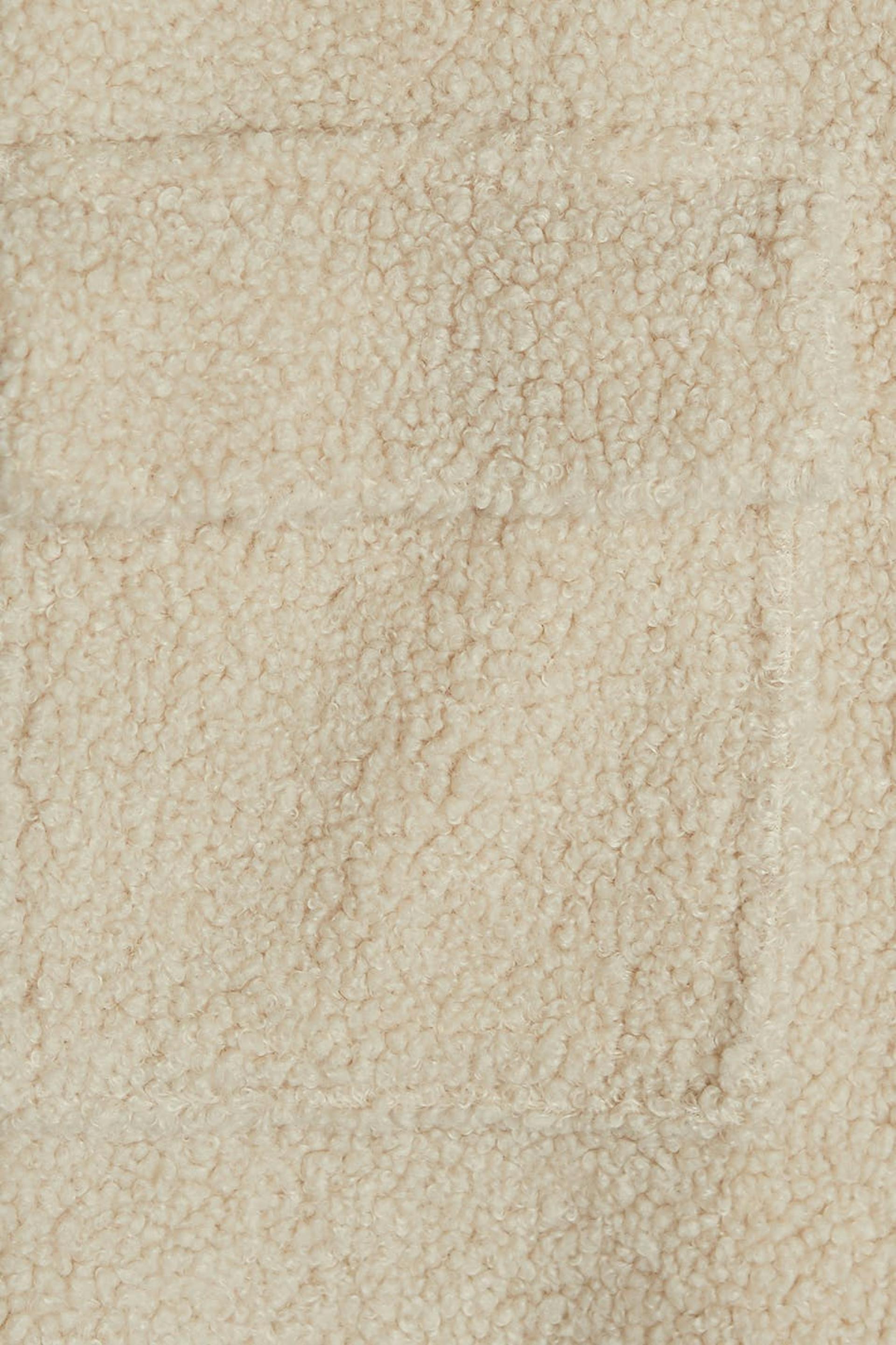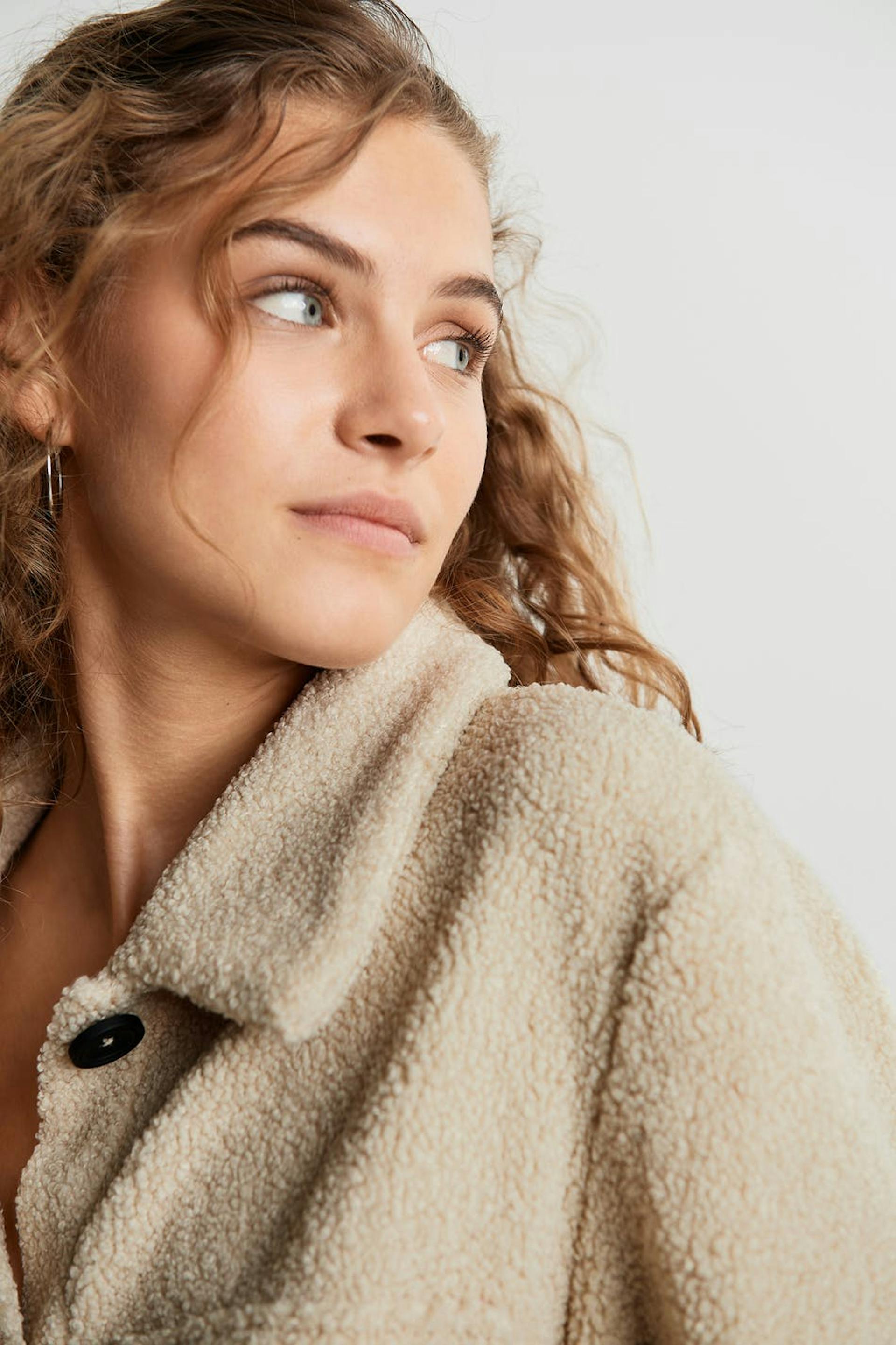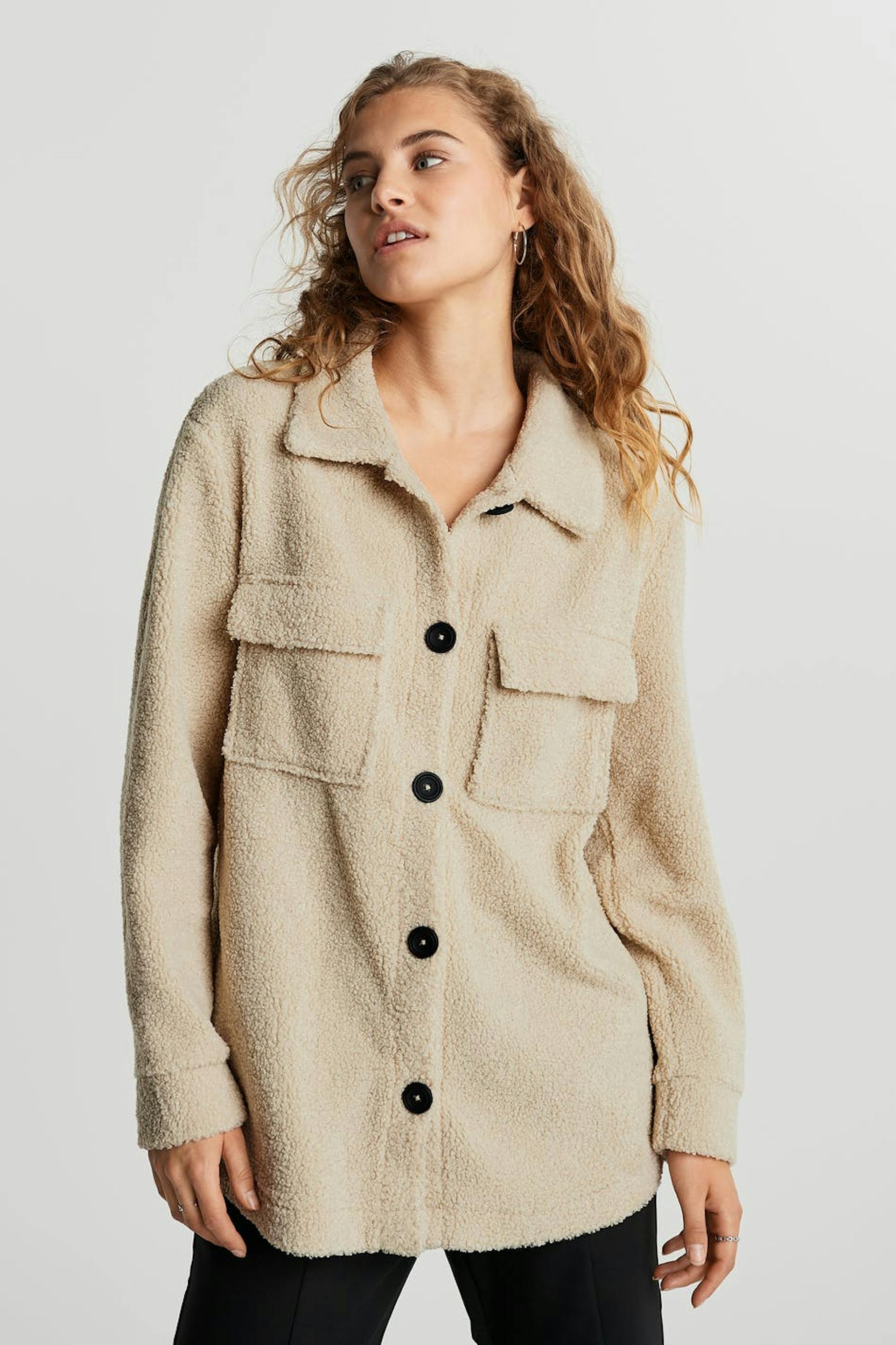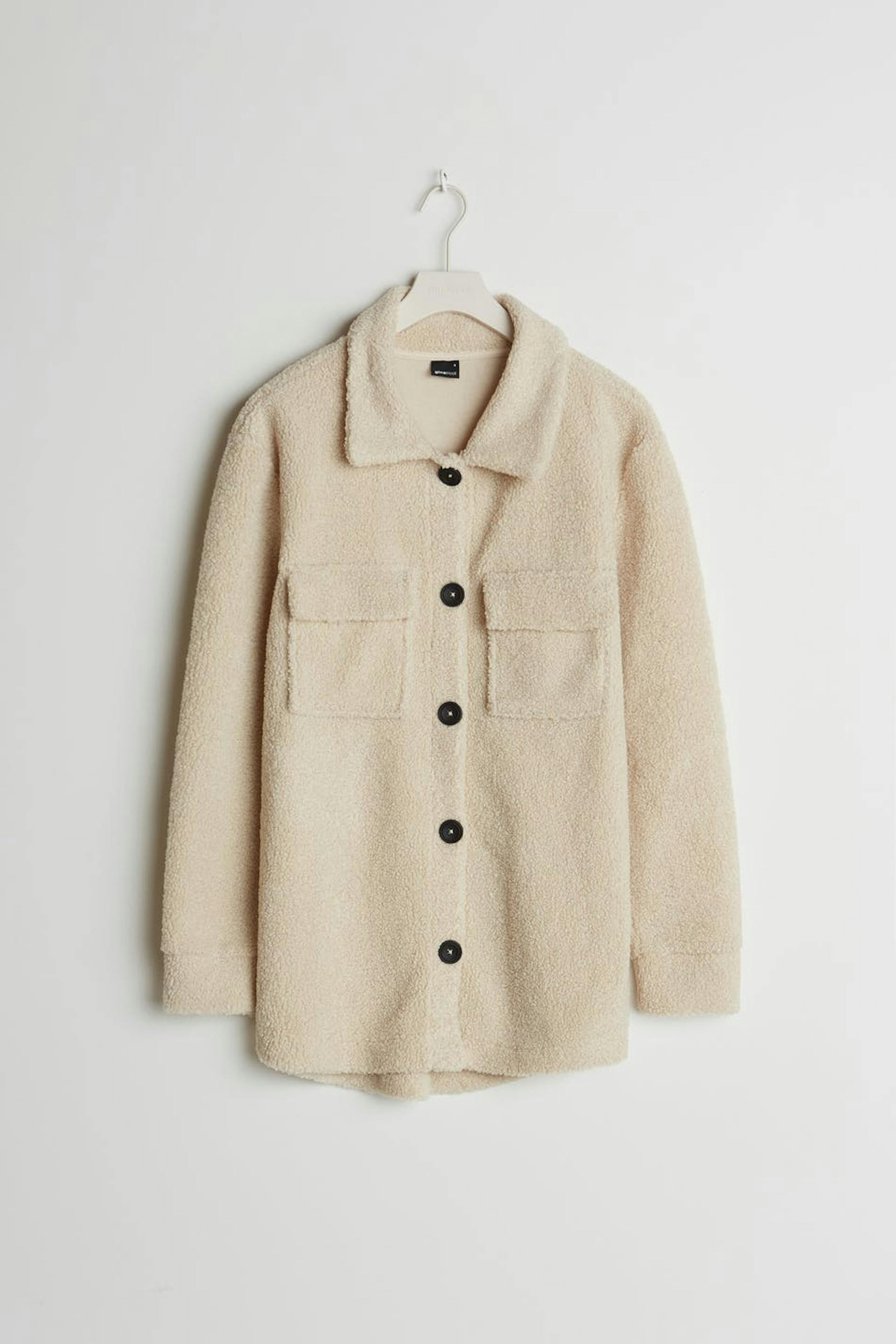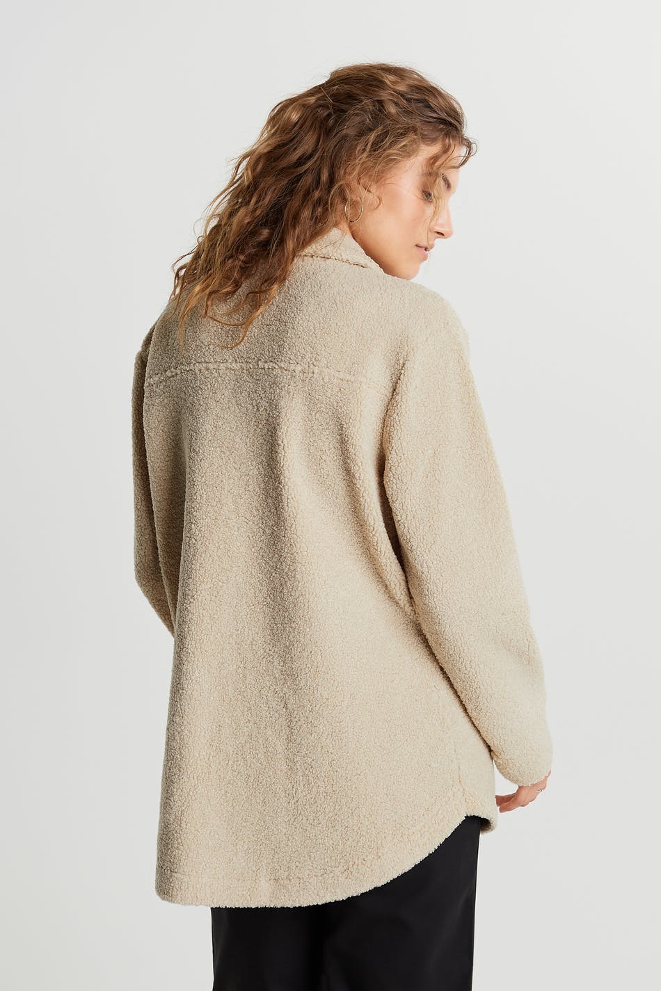 Takki ylisuuri istuvuudella. Takki on beige ja siinä on teddy-materiaali. Siinä on napit, rintataskut ja pudotetut olkapäät.