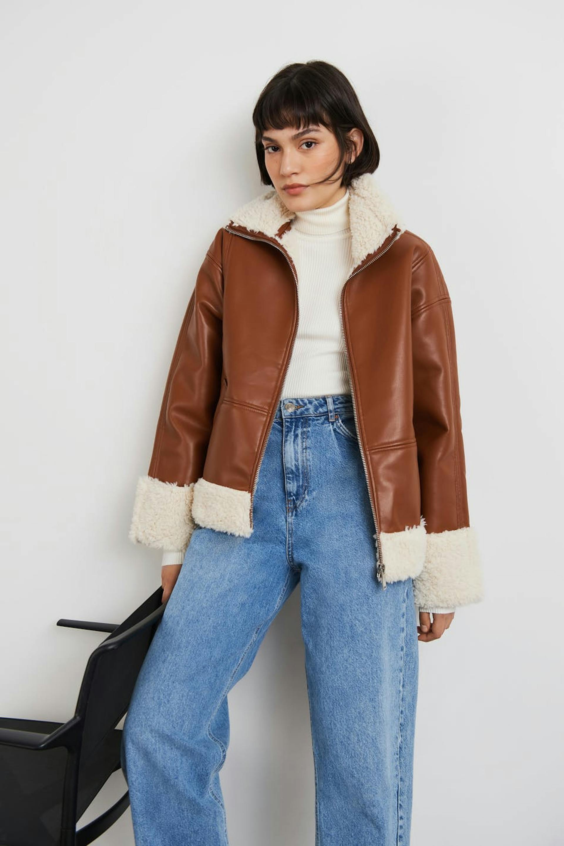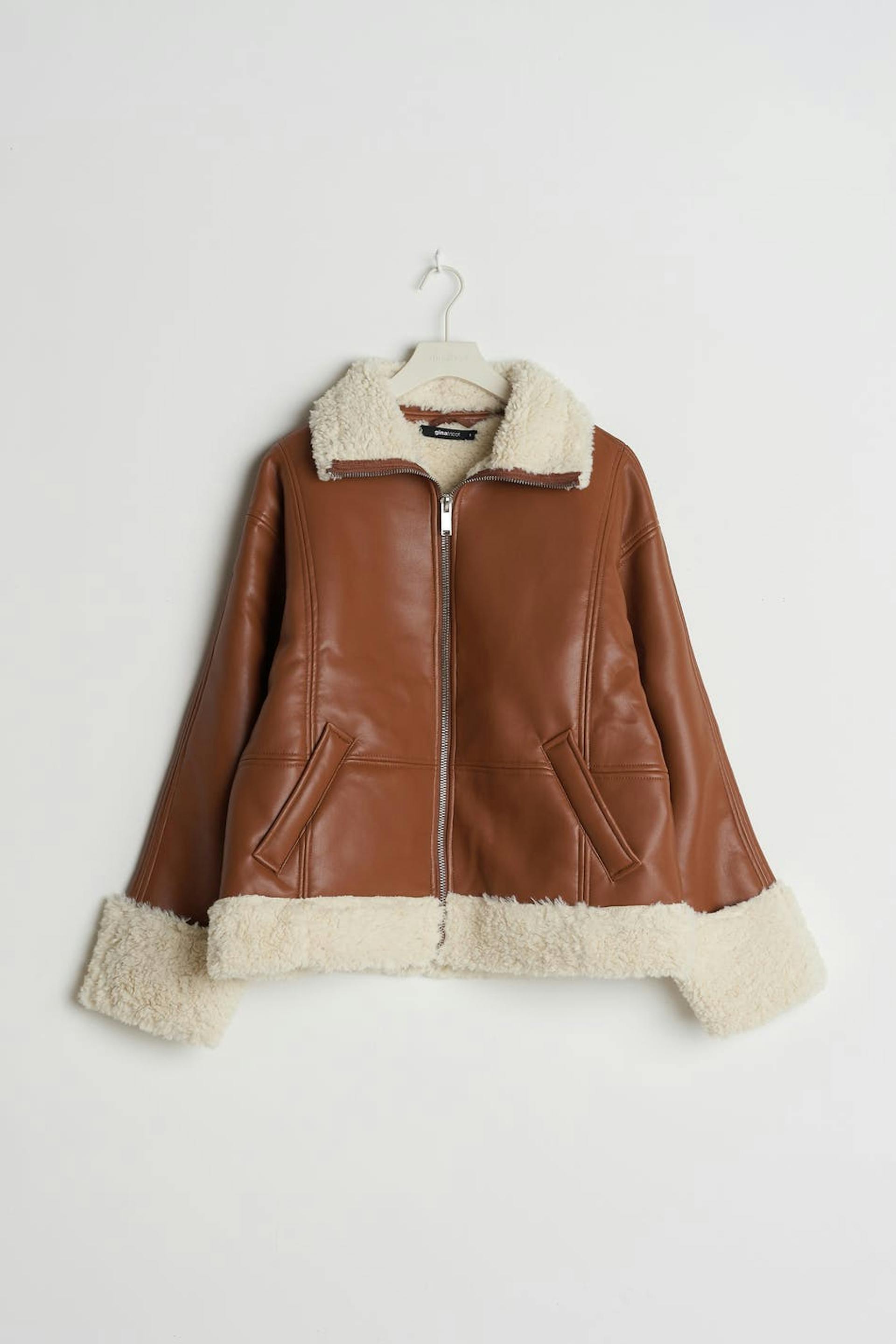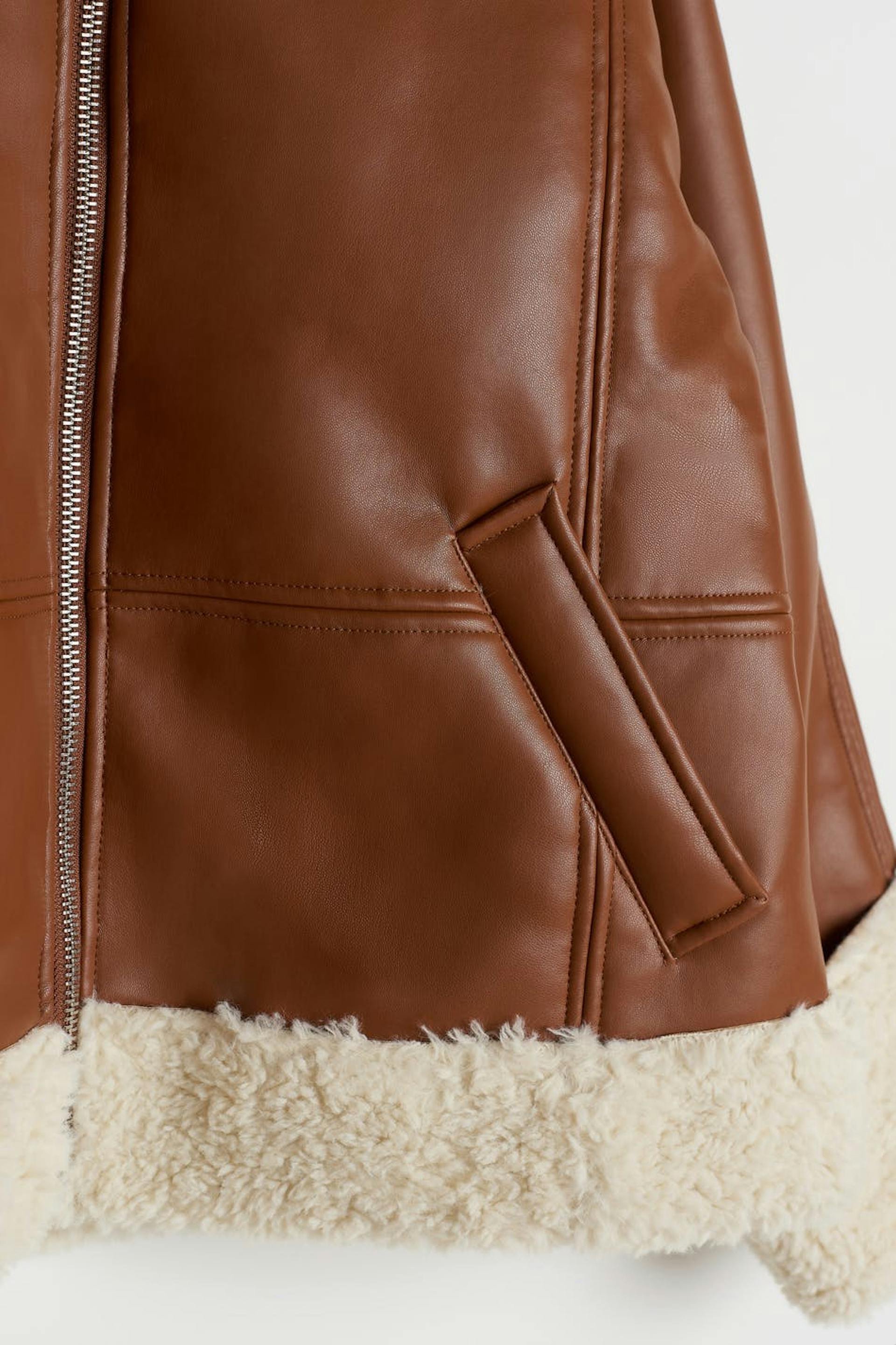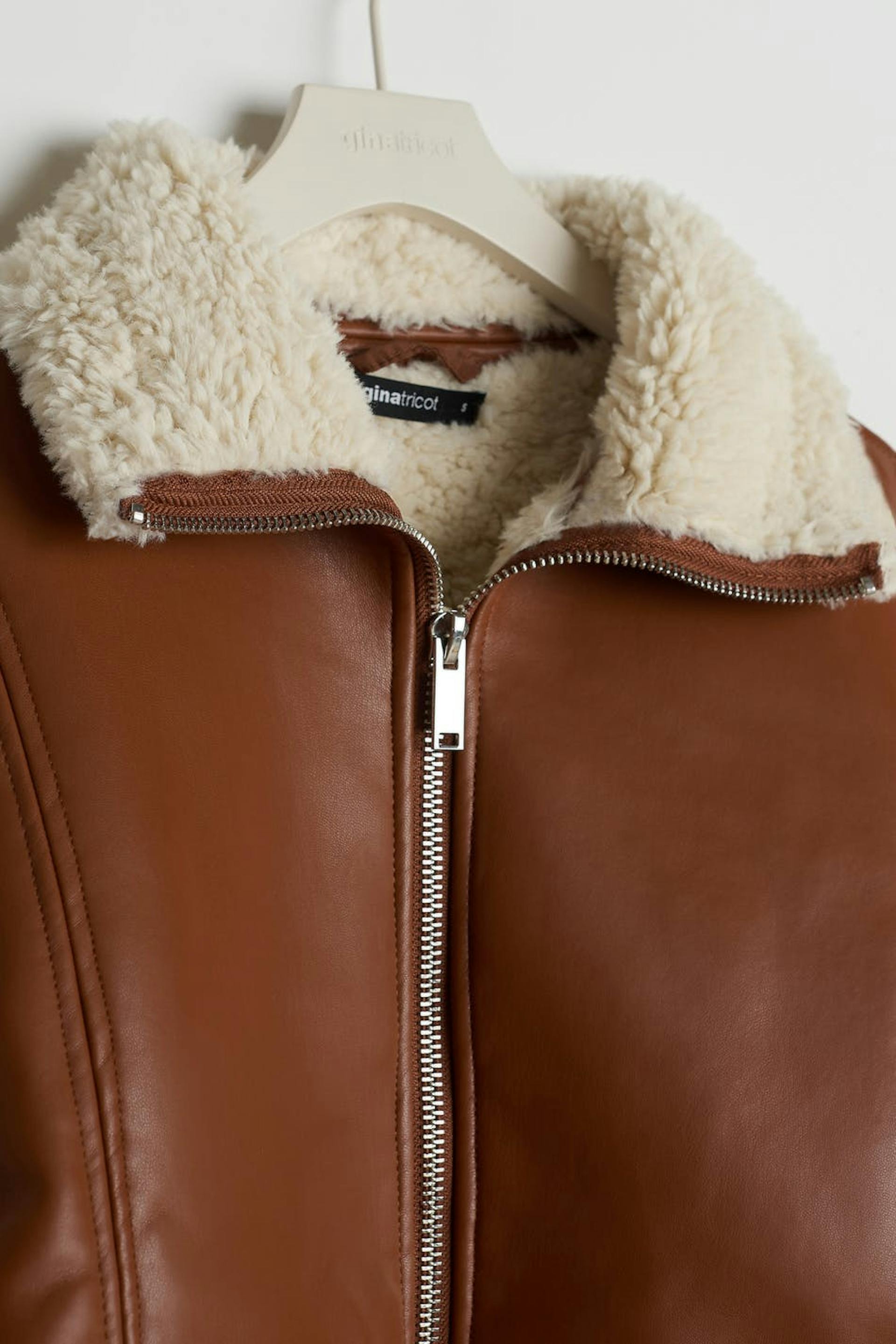 Vuorattu takki korkealla kauluksella. Takki on ruskea ja siinä on tekonahkamateriaali. Siinä on vetoketju edessä, taskut sivuissa ja yksityiskohdat teddy-materiaalilla alhaalla ja hihoissa.