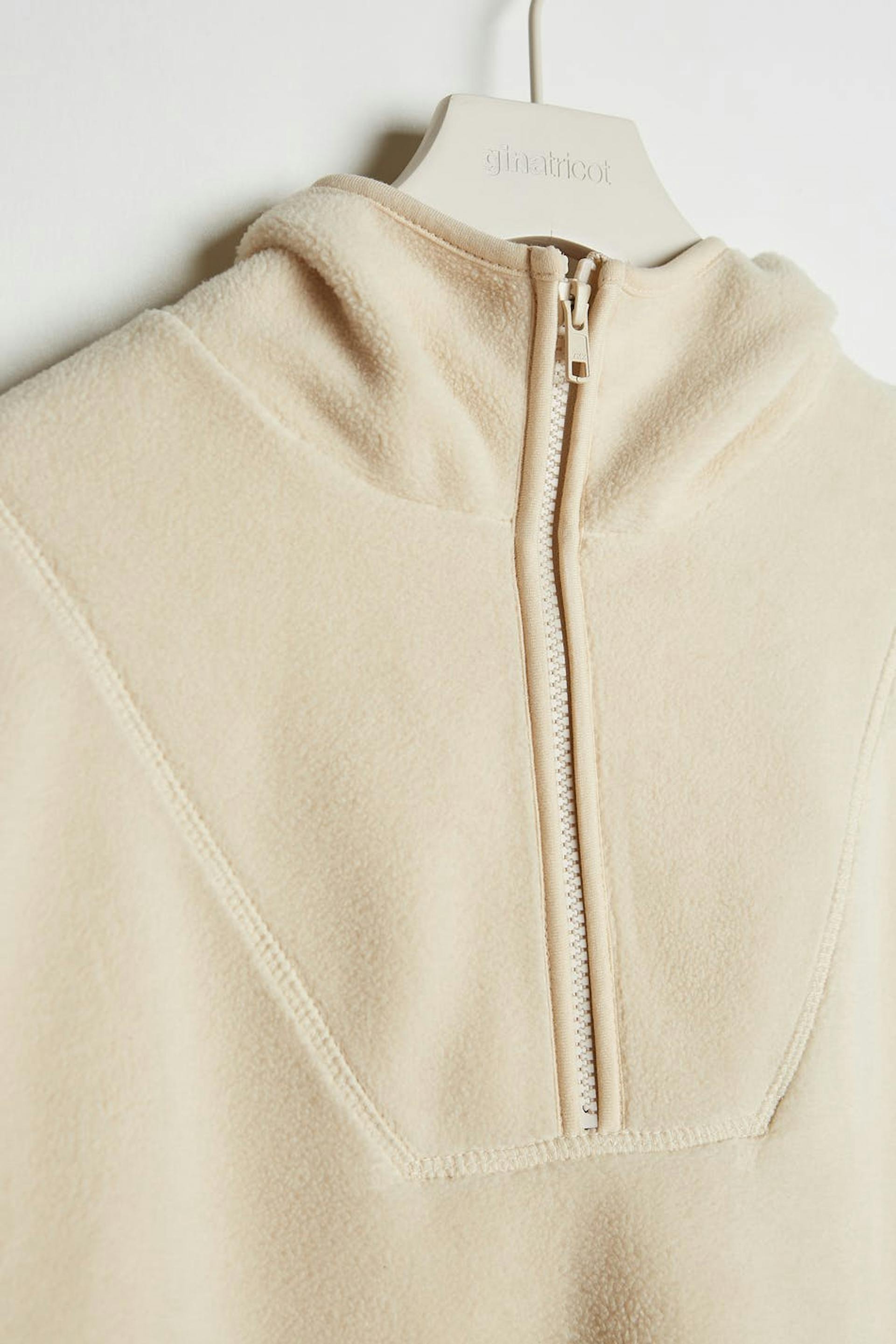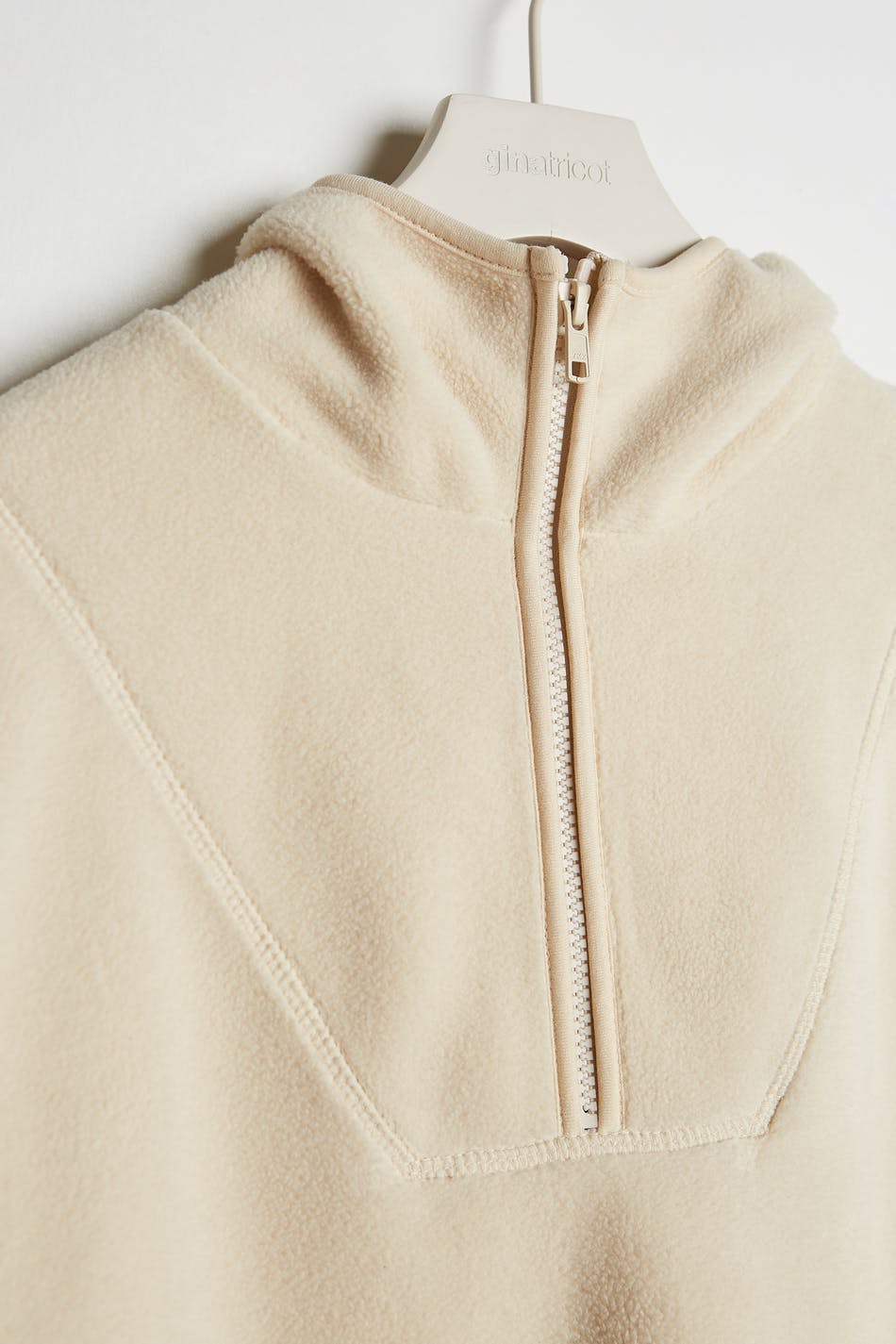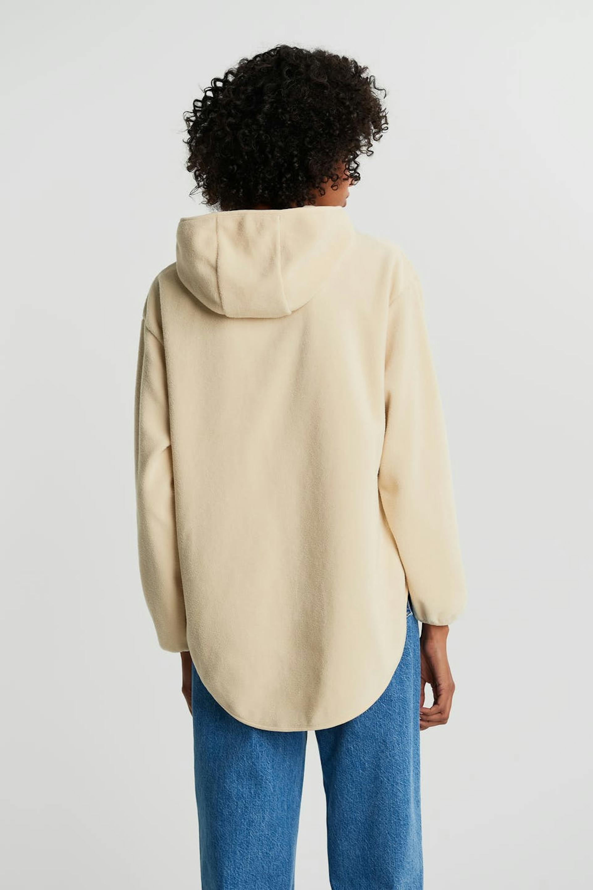 Takki ylisuuri istuvuudella. Takki on valkoinen ja siinä on teddy-materiaali. Siinä on vetoketju edessä.