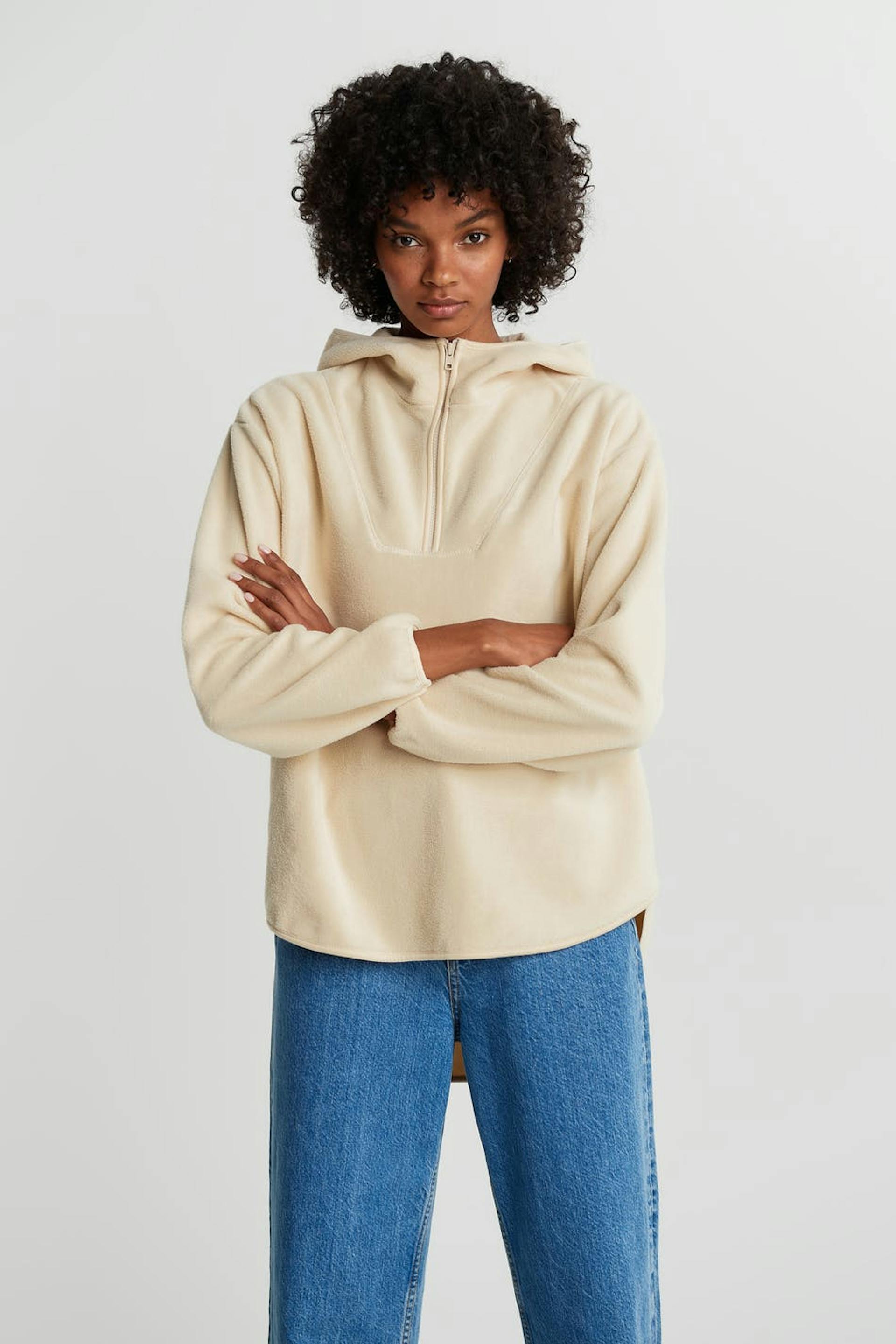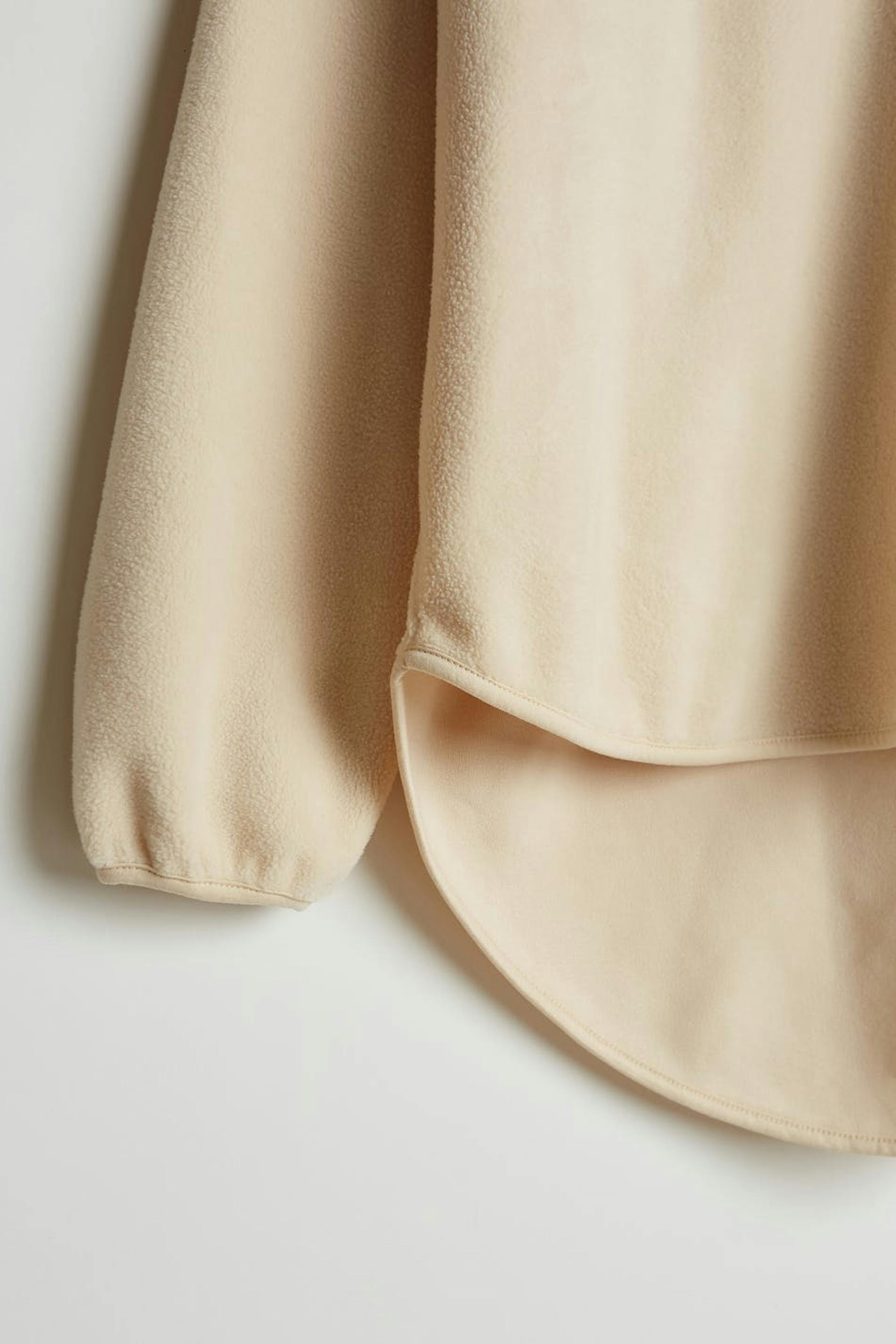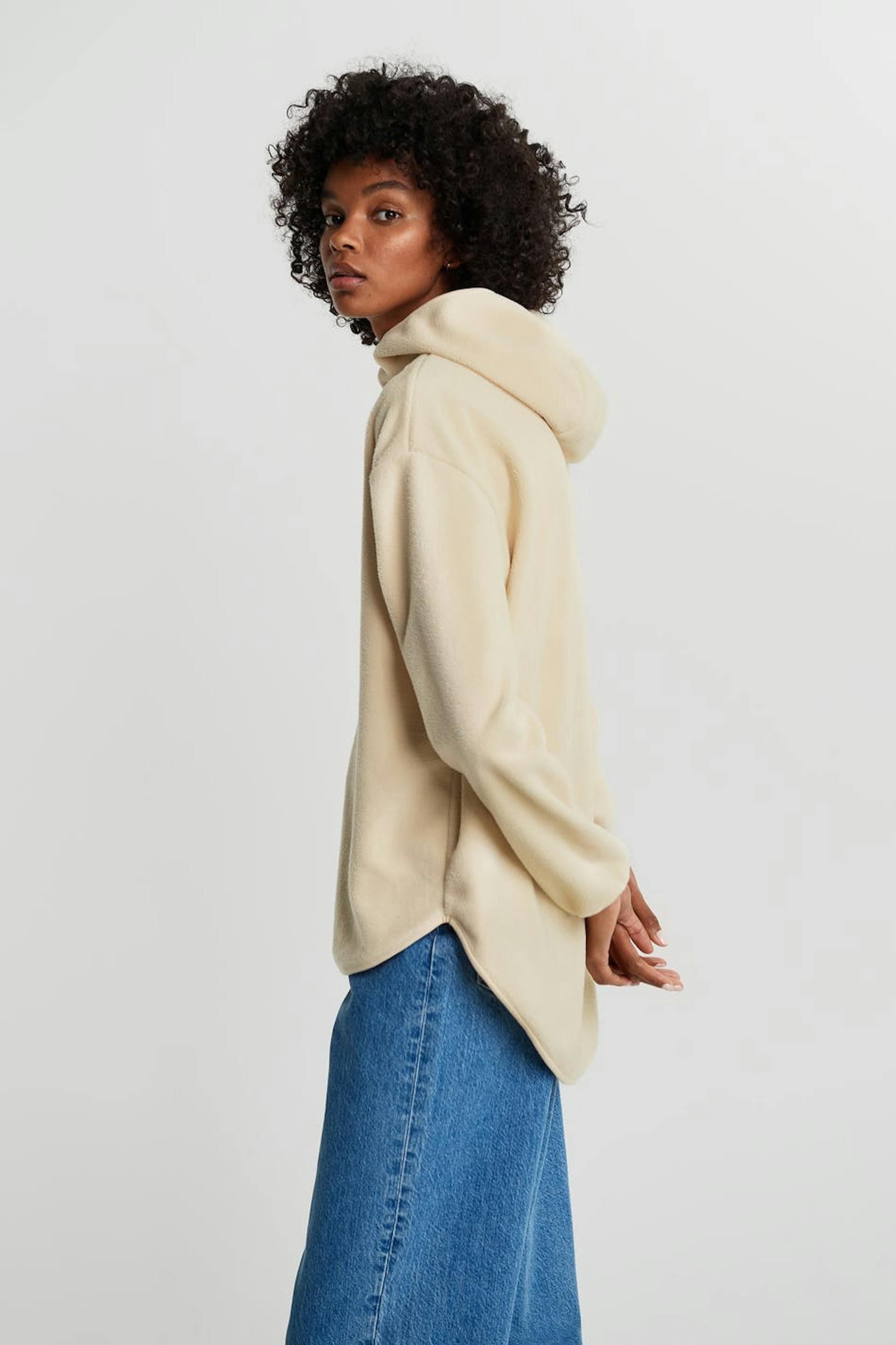 Takki ylisuuri istuvuudella. Takki on valkoinen ja siinä on teddy-materiaali. Siinä on vetoketju edessä.