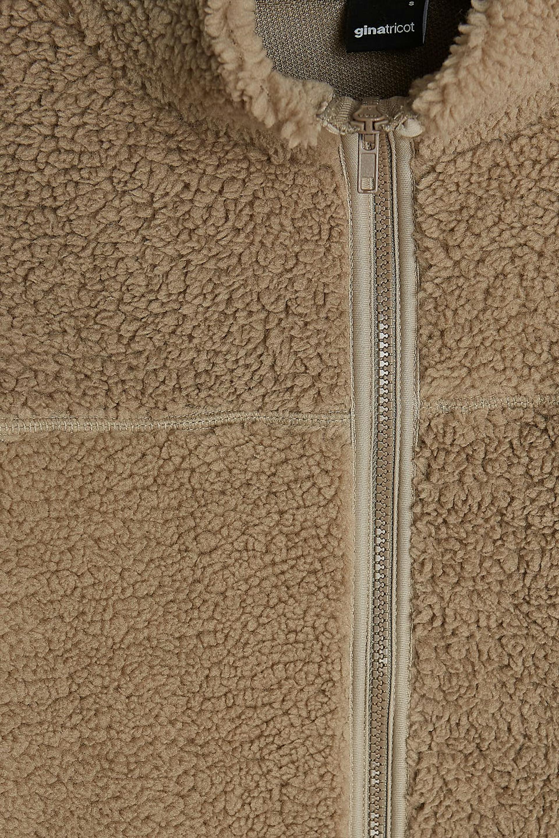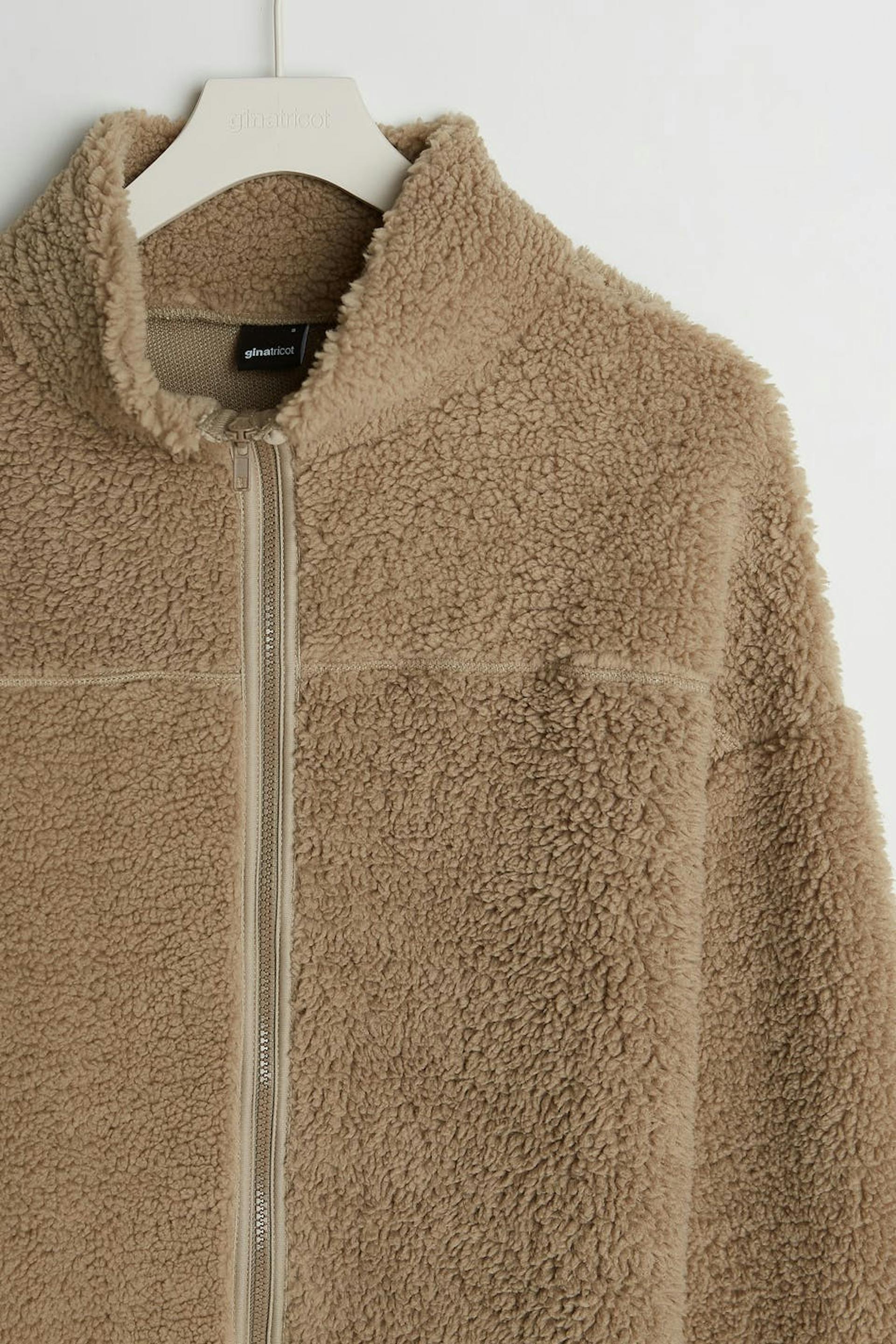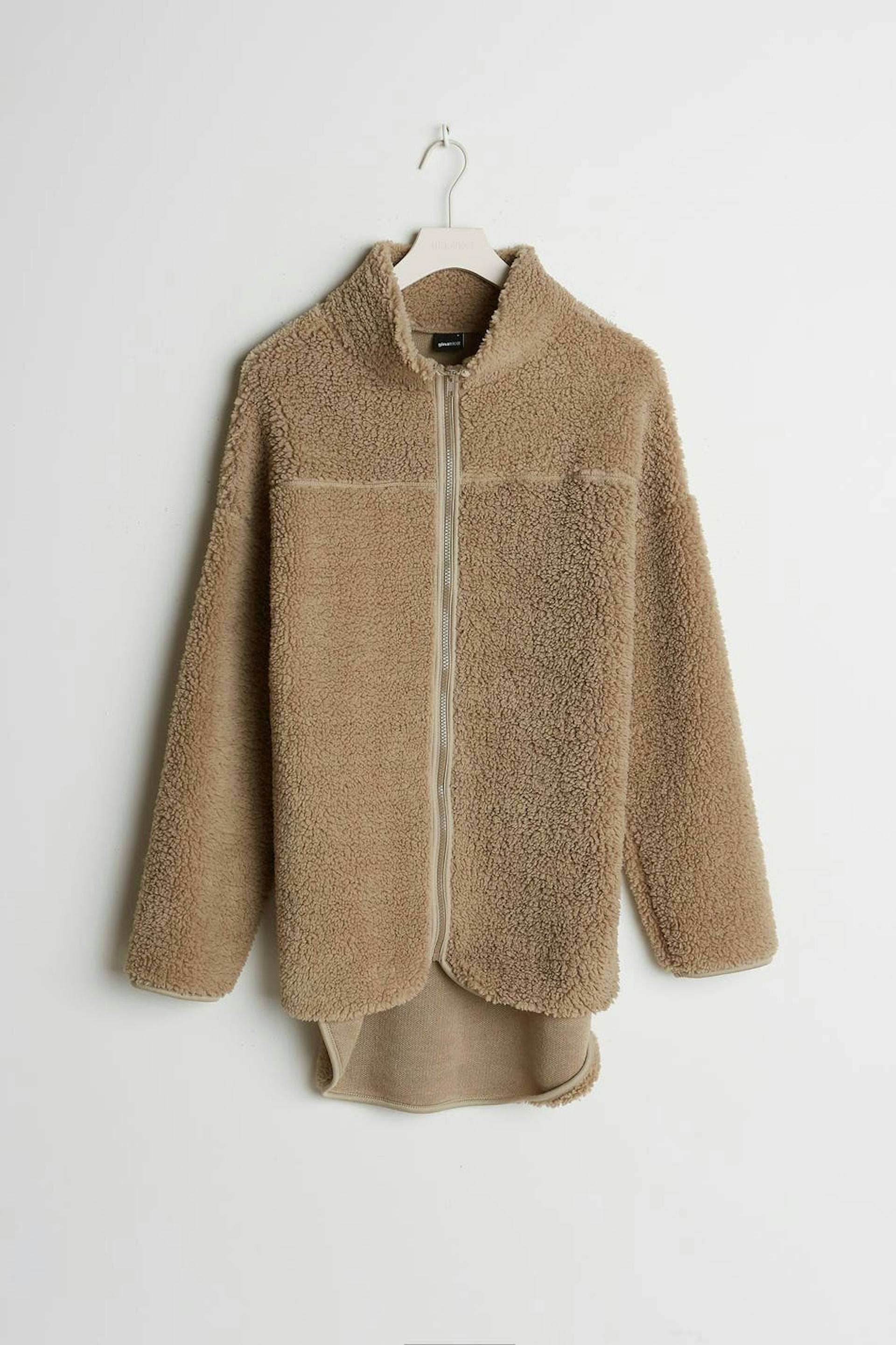 Takki ylisuuri istuvuudella. Takki on beige ja siinä on teddy-materiaali. Siinä on vetoketju edessä.