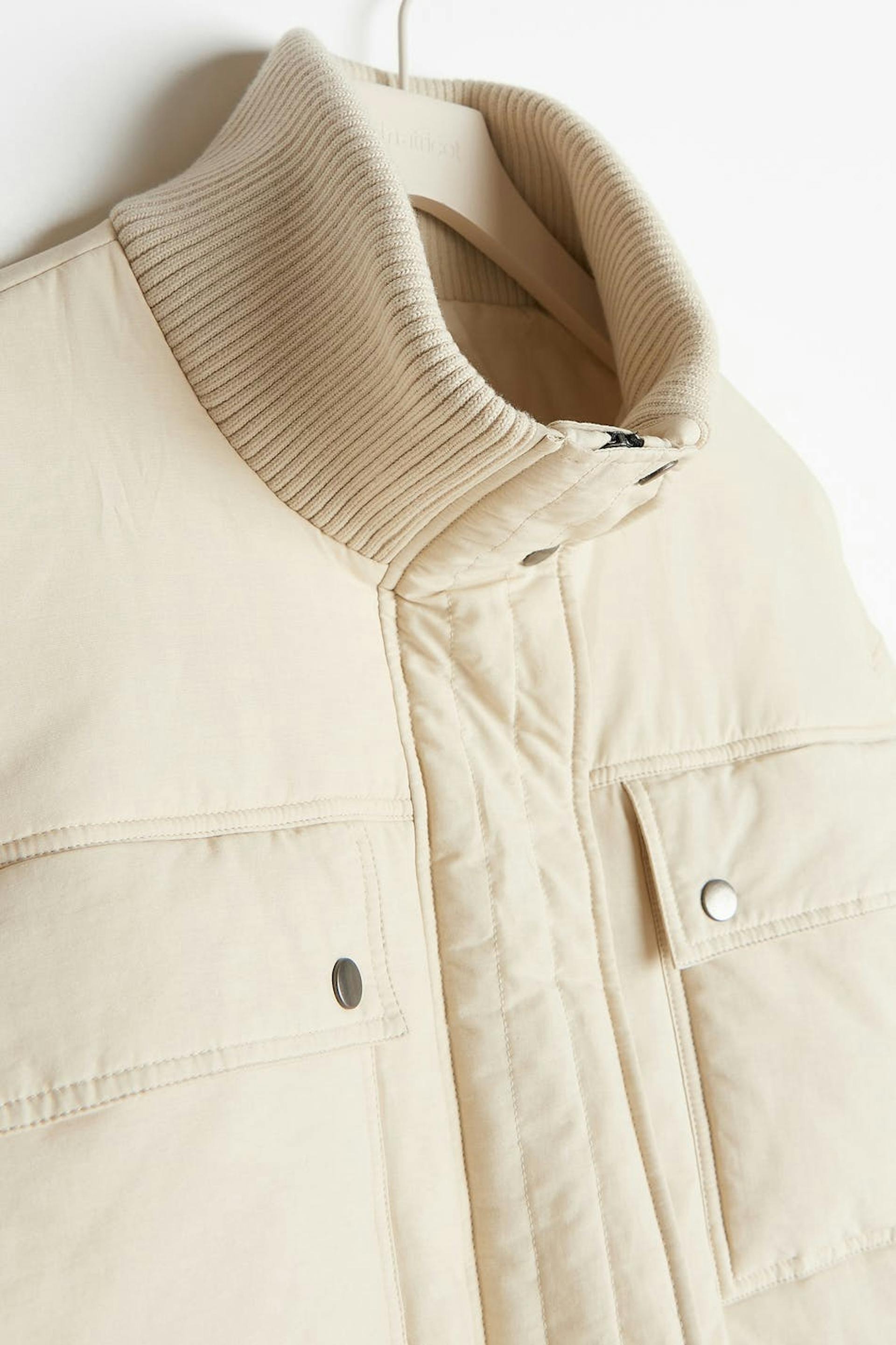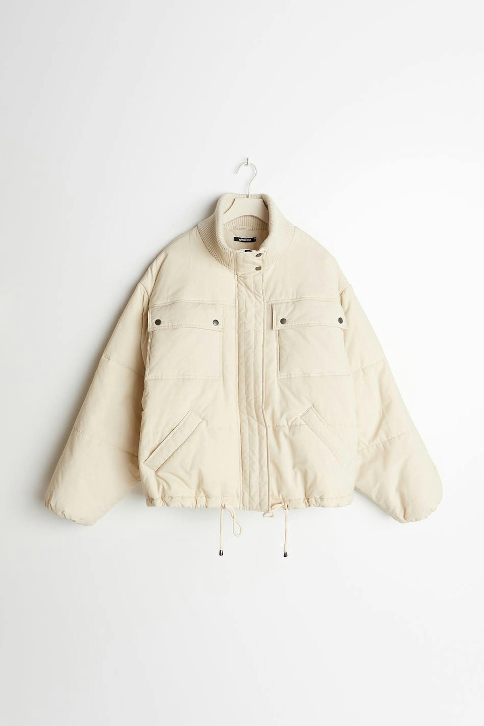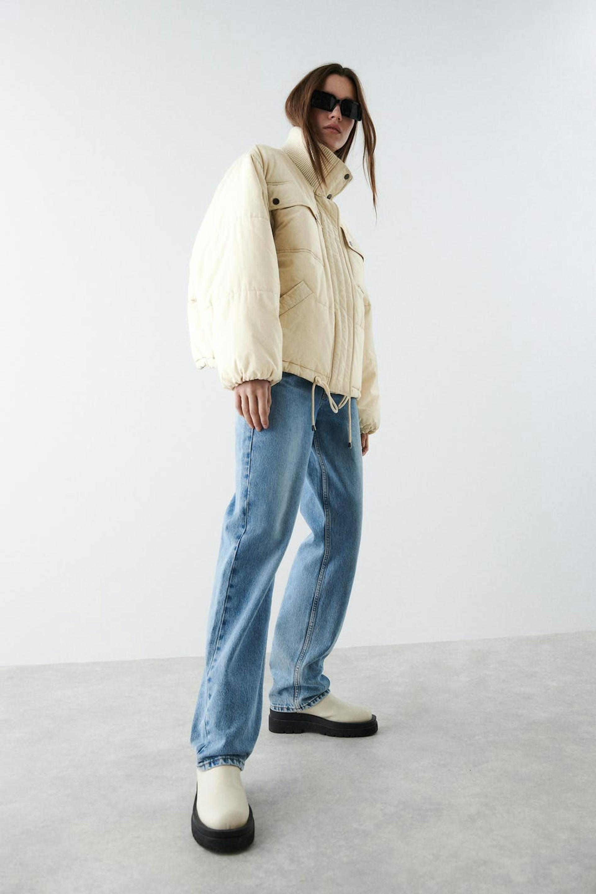 Topattu takki oversized-mallilla. Takki on keltainen ja siinä on korkea, ribattu kaulus. Siinä on kaksi etutaskua napeilla, sivutaskut, tikatut saumat, kätketty vetoketju edessä ja säädettävä kiristysnyöri helmassa.