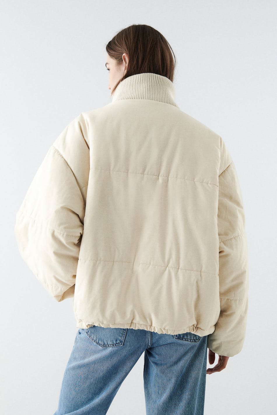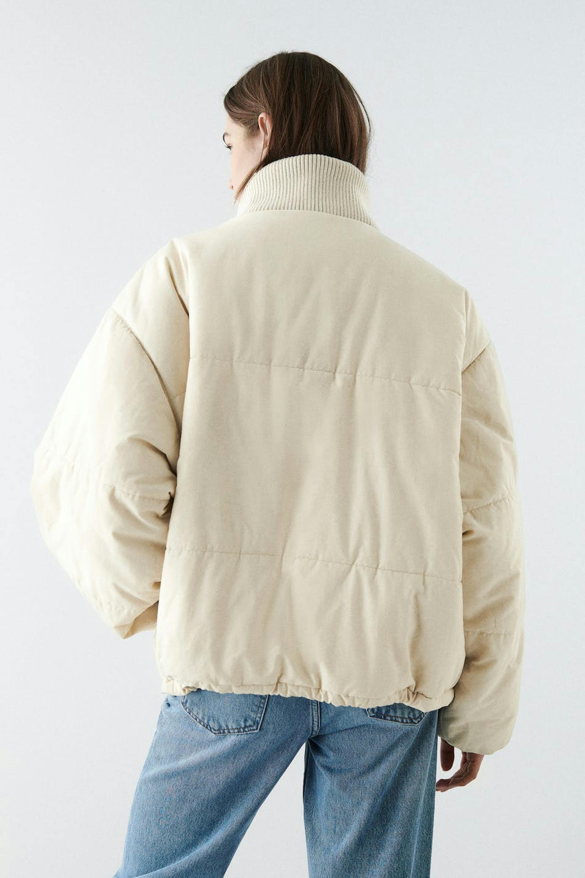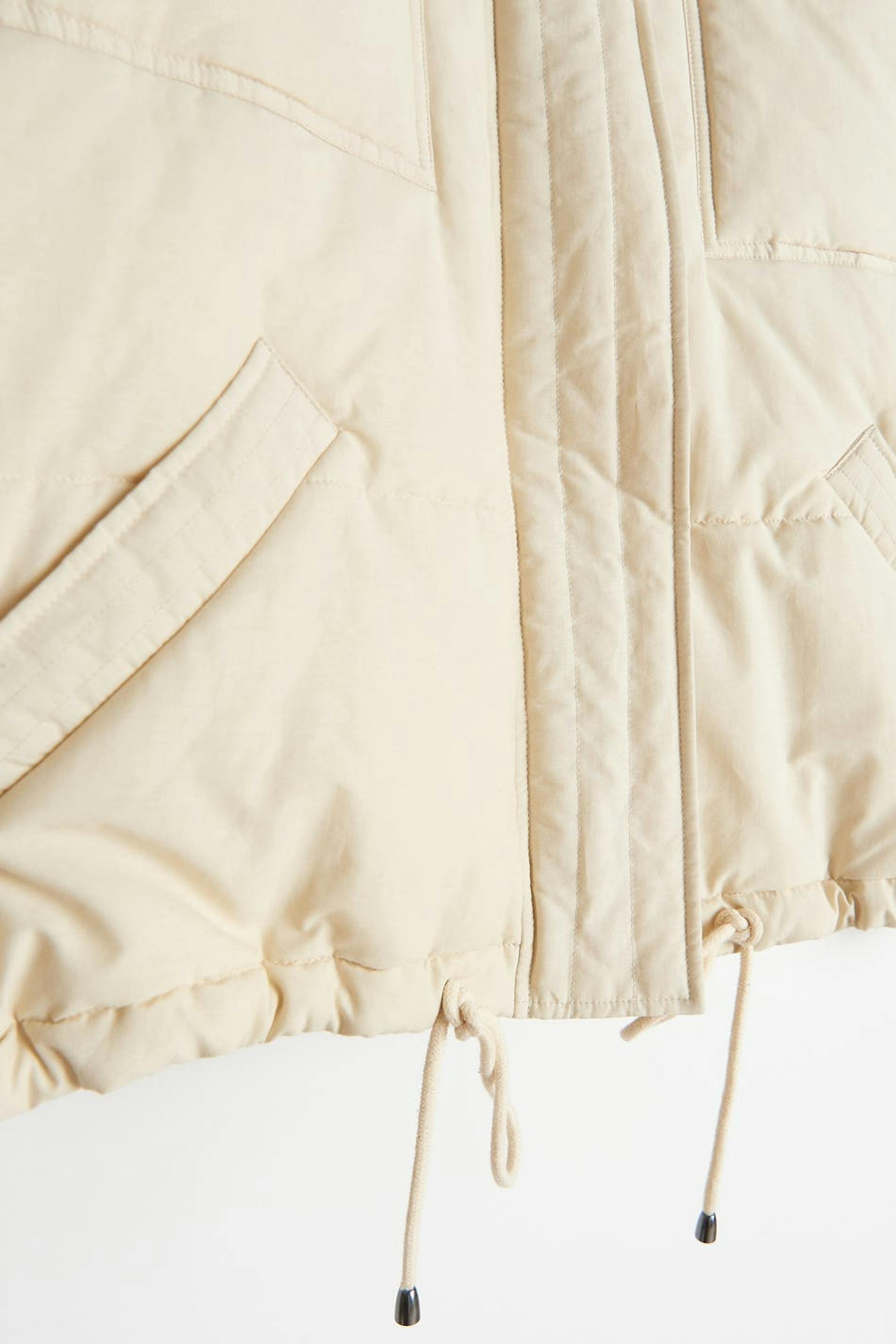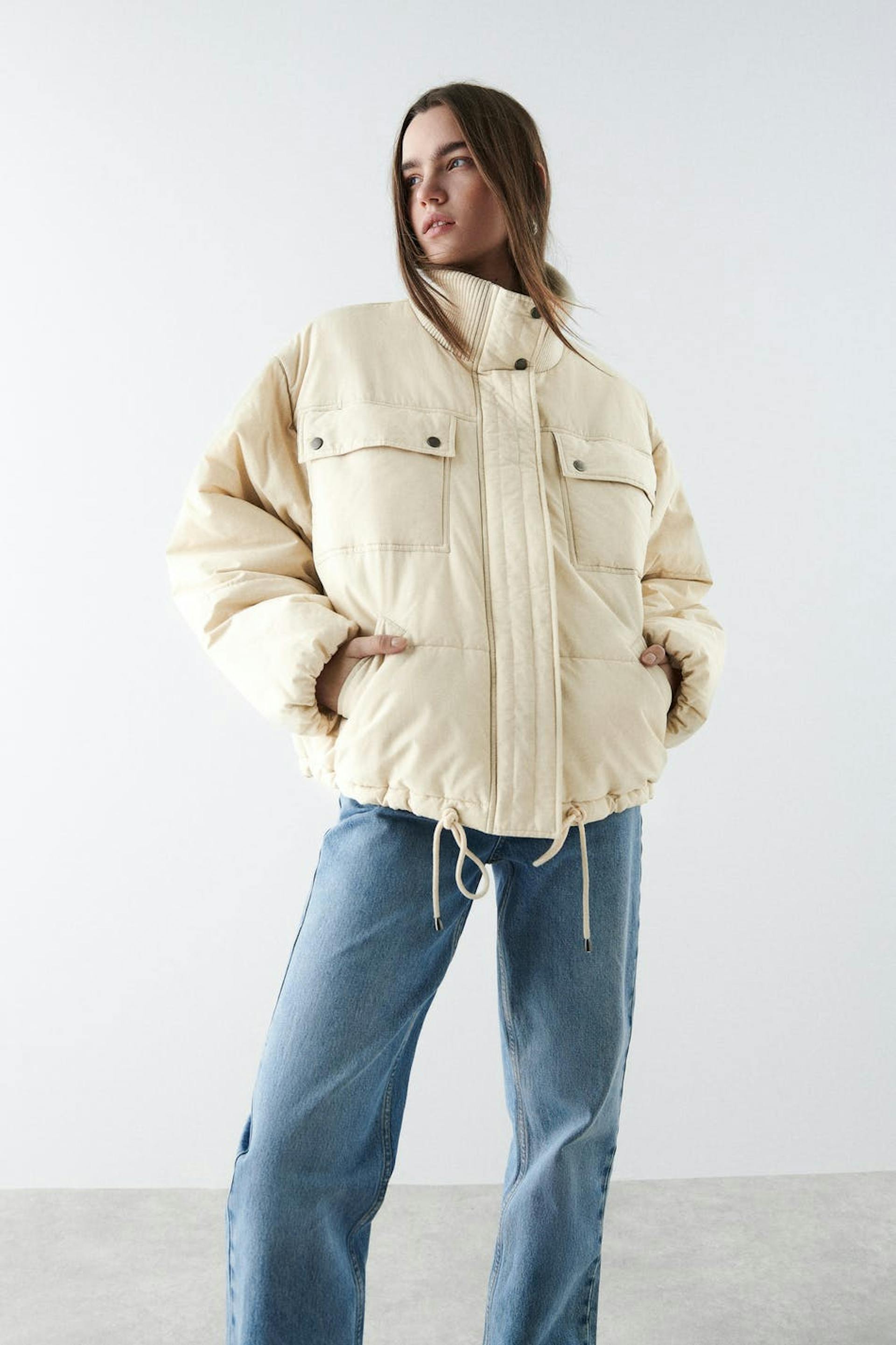 Topattu takki oversized-mallilla. Takki on keltainen ja siinä on korkea, ribattu kaulus. Siinä on kaksi etutaskua napeilla, sivutaskut, tikatut saumat, kätketty vetoketju edessä ja säädettävä kiristysnyöri helmassa.