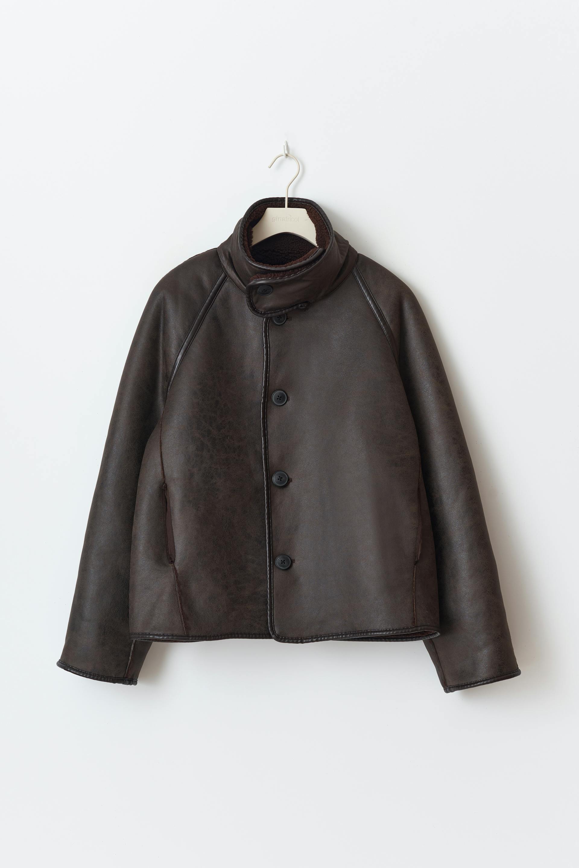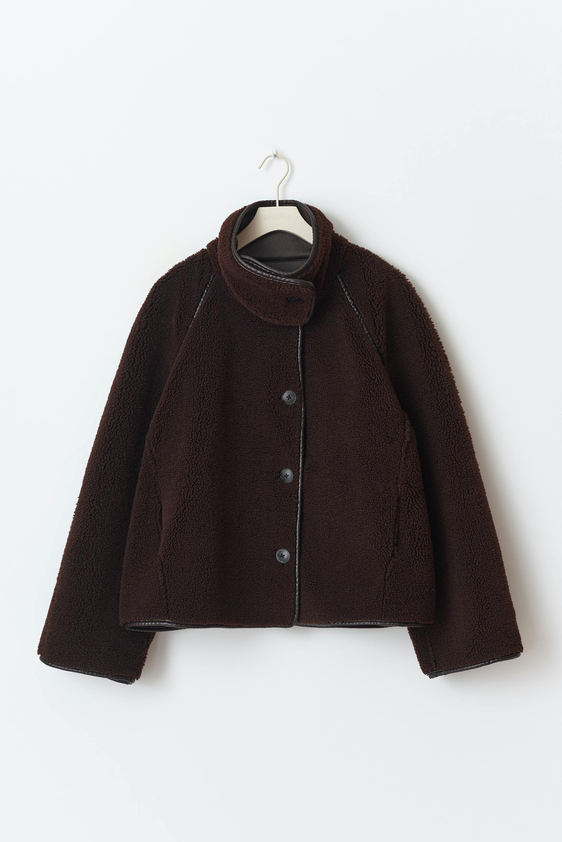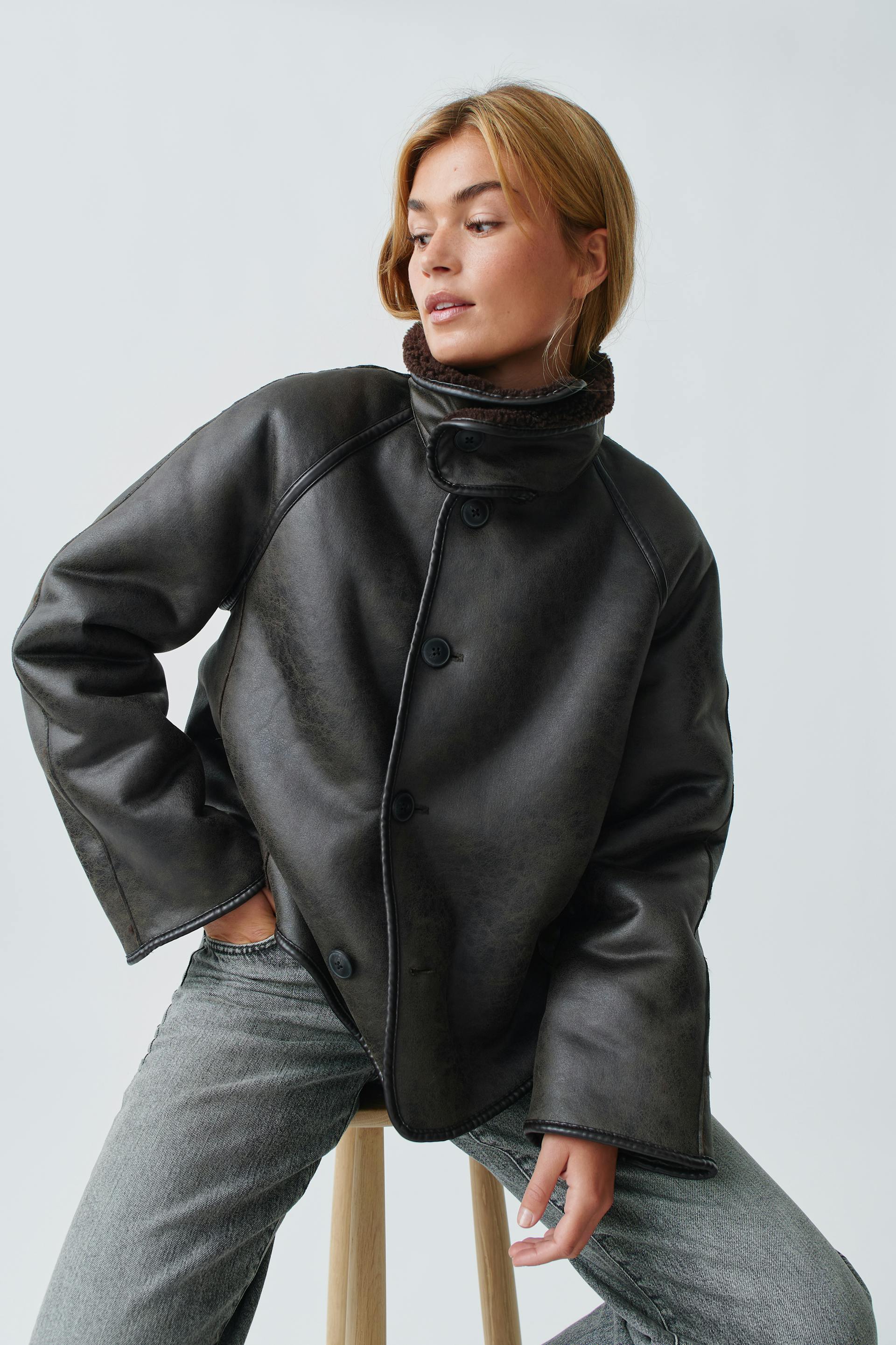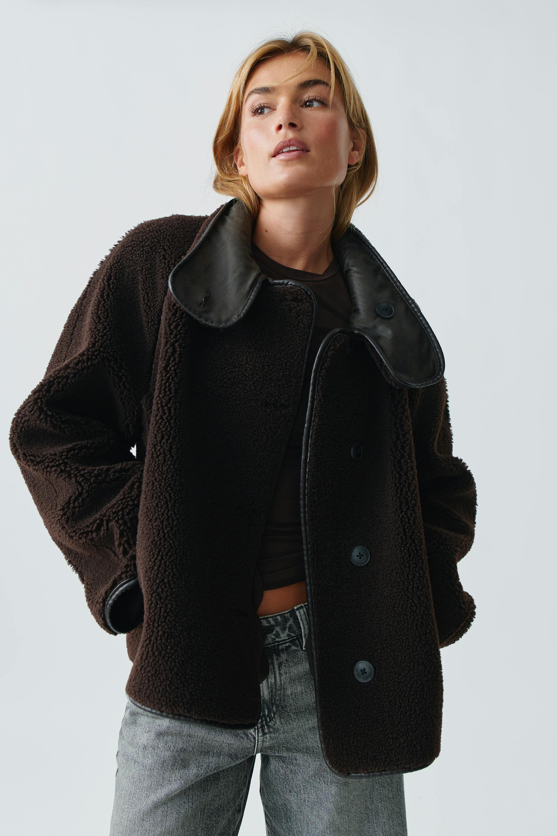 Käännettävä teddy-takki tekonahasta korkealla kauluksella. Teddy-takki on ruskea ja siinä on pehmeä vuori. Siinä on oversized-malli, napitus edessä ja pitkä hiha.