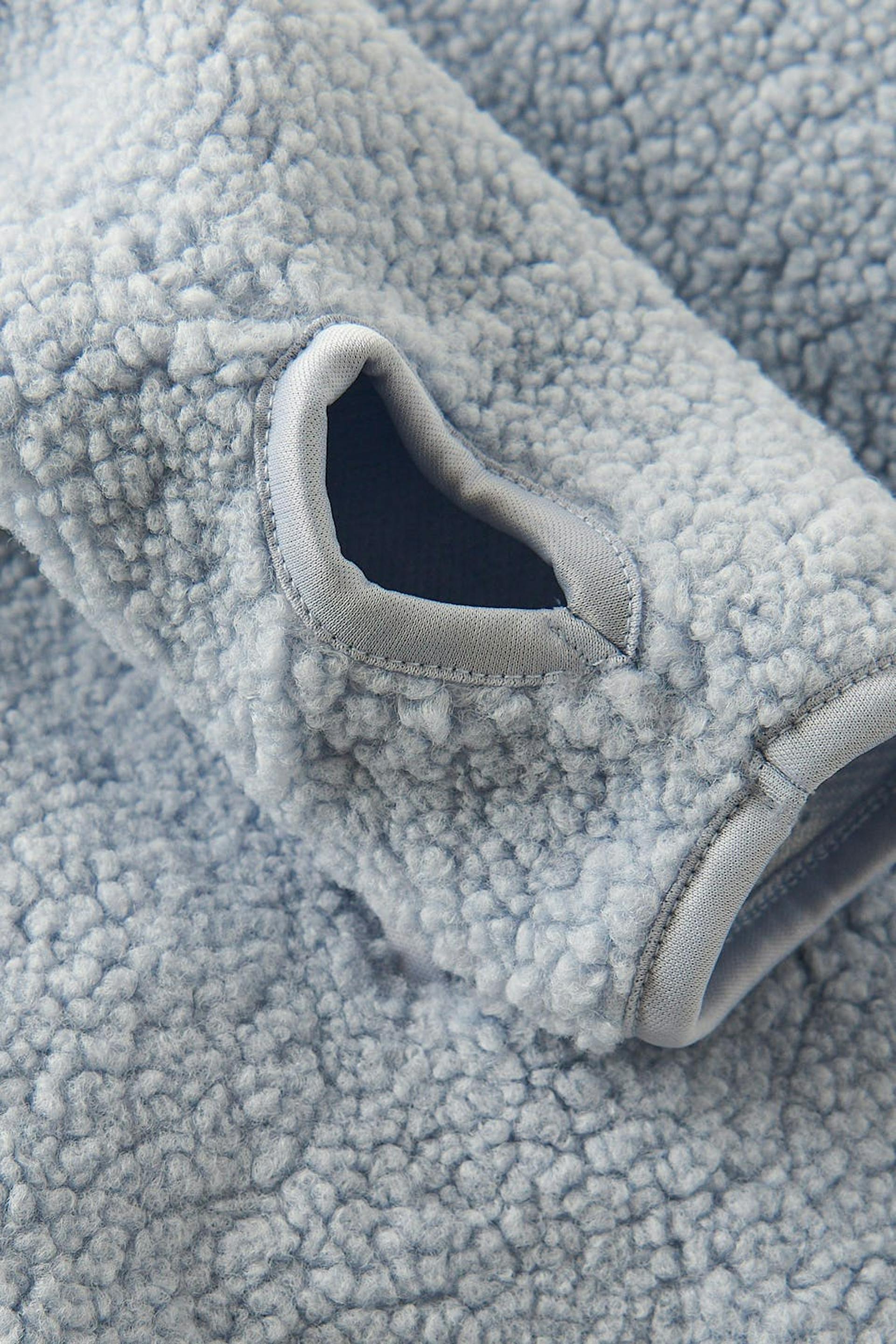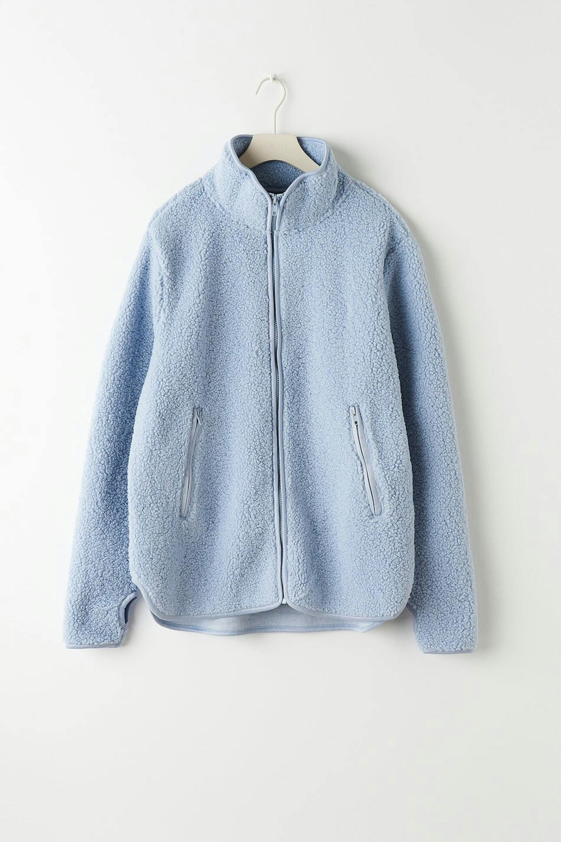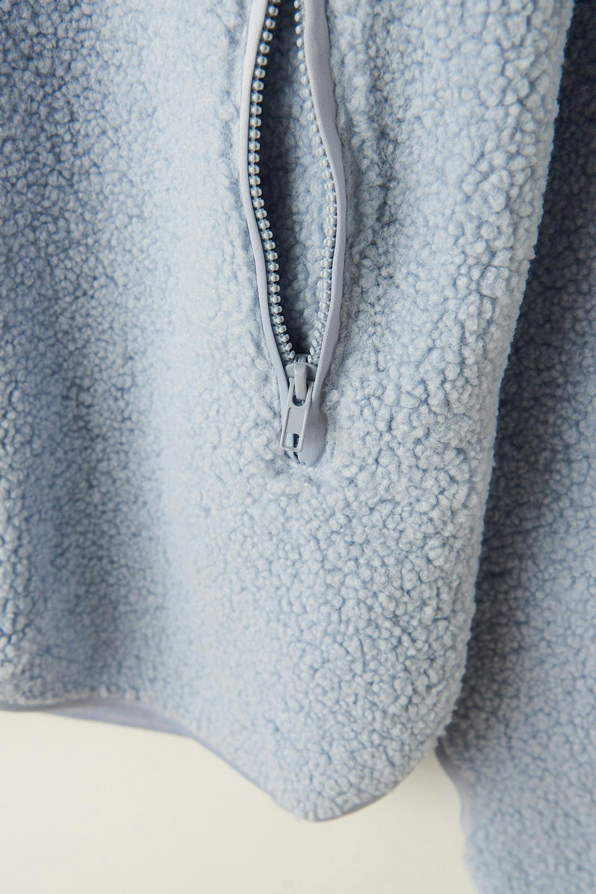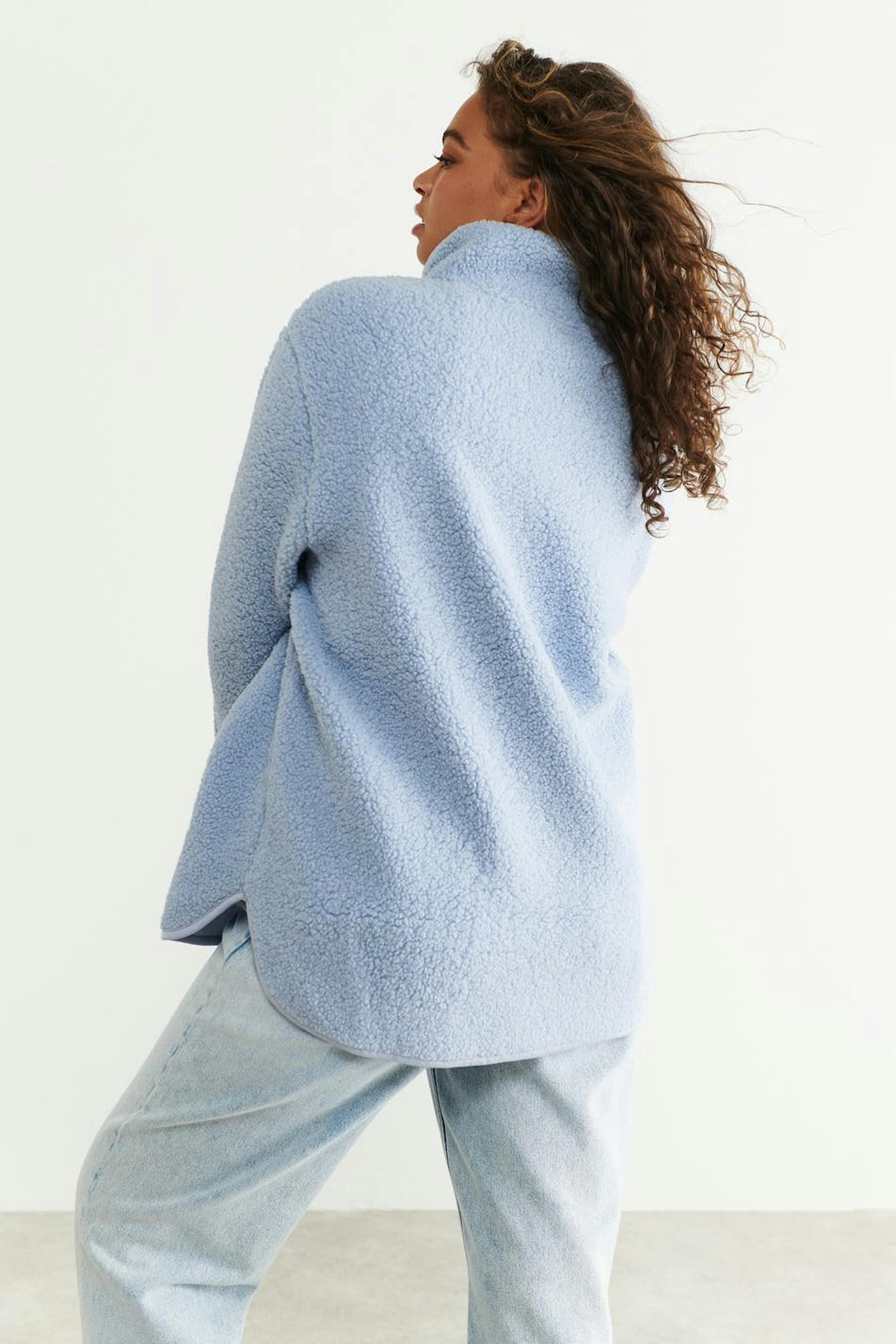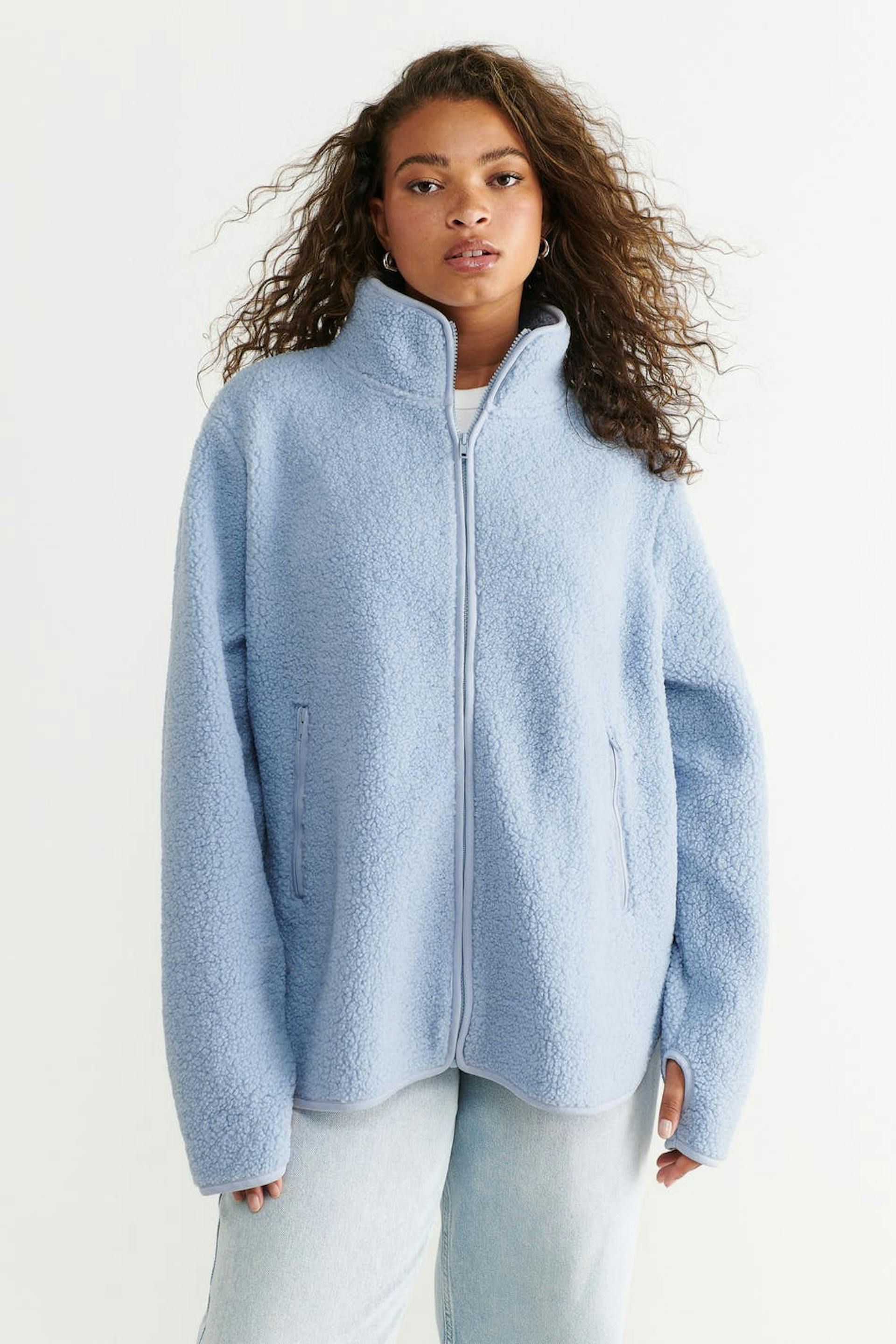 Teddy-takki oversized-mallilla. Teddy-takki on sininen ja siinä on korkea kaula. Siinä on vetoketju edessä, sivutaskut vetoketjulla, peukalonreikä hihansuissa ja halkio sivuilla.