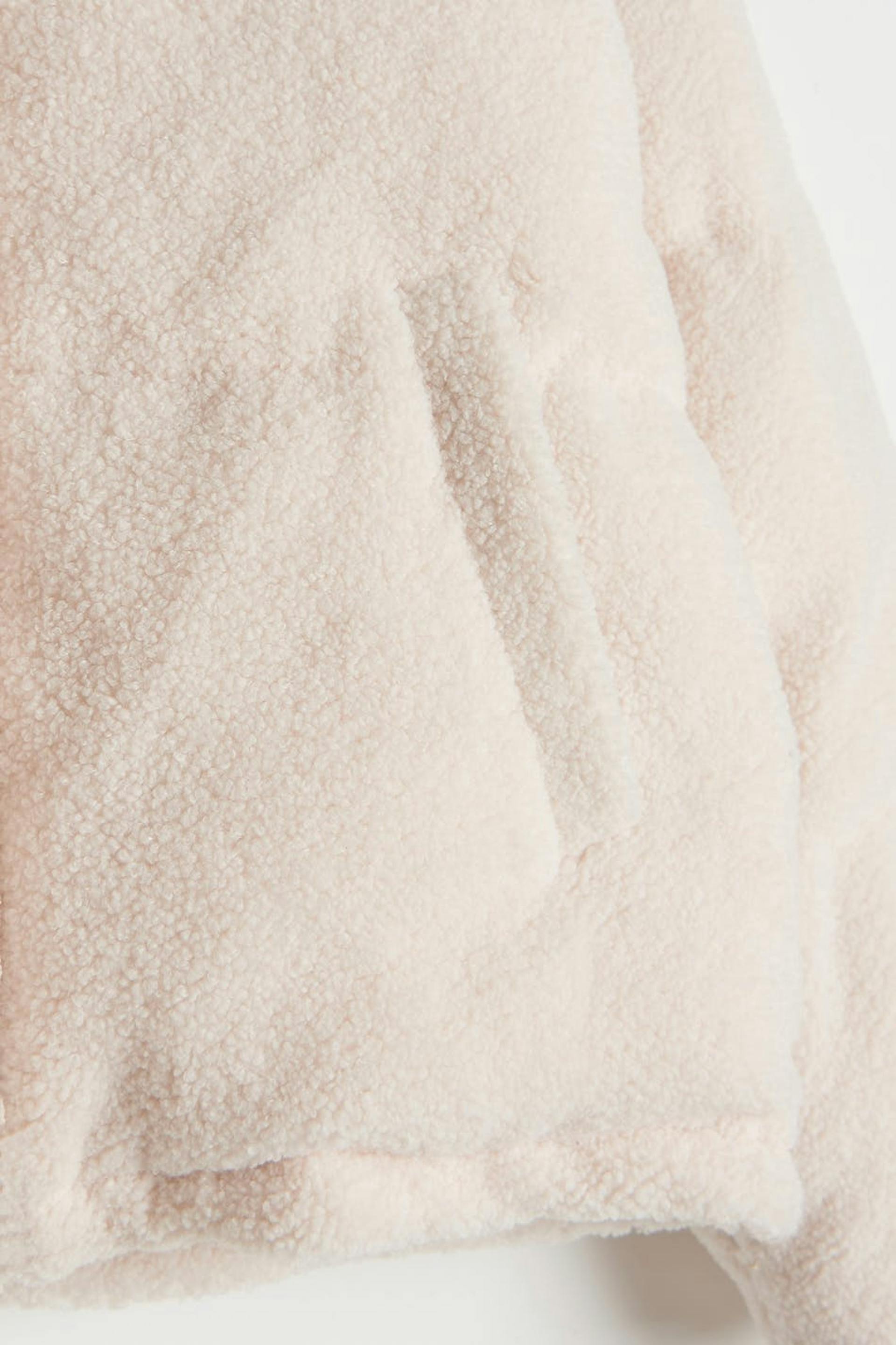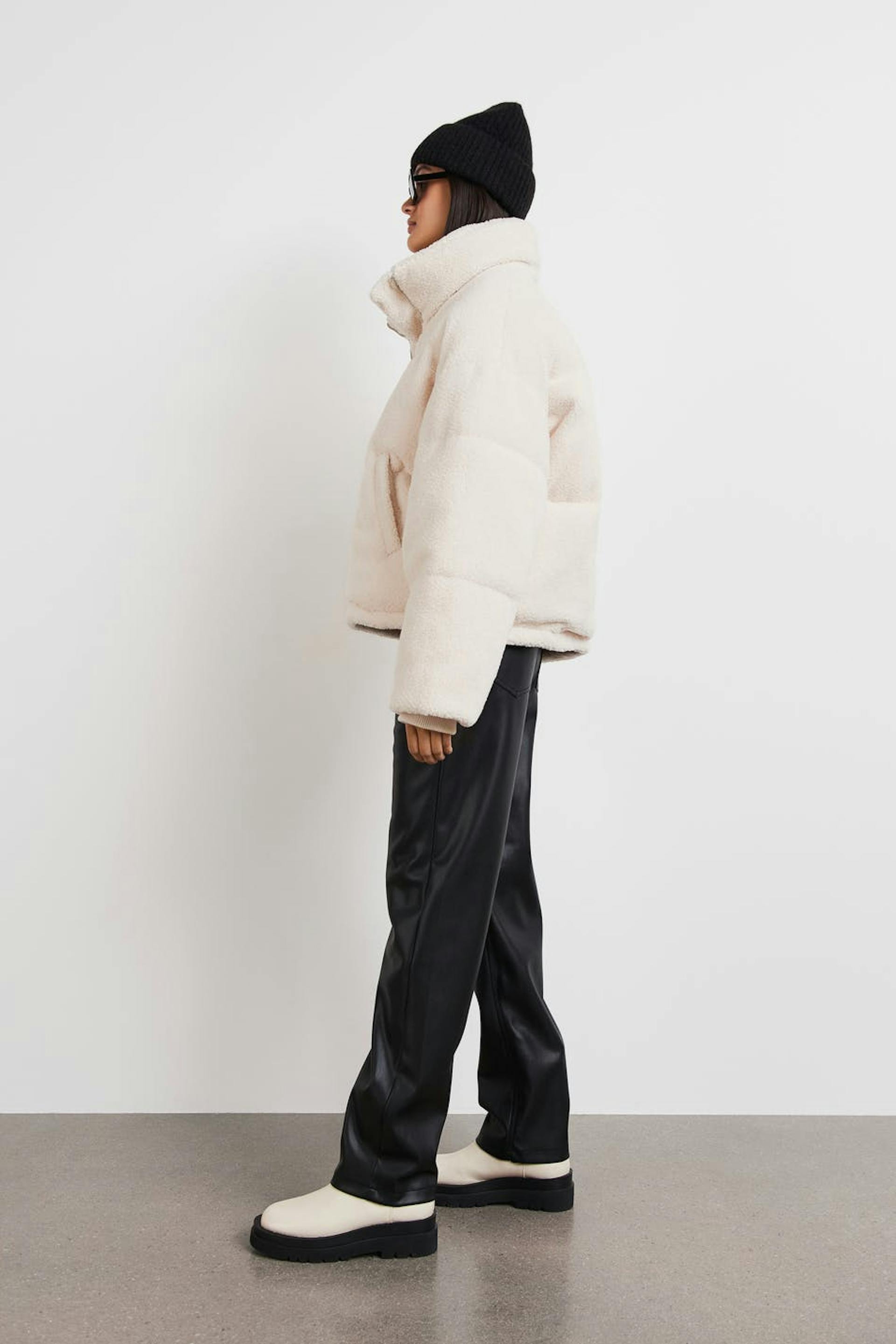 Teddy-takki cropatulla pituudella. Teddy-takki on valkoinen ja siinä on korkea kaula. Siinä on vetoketju edessä ja taskut sivuissa.