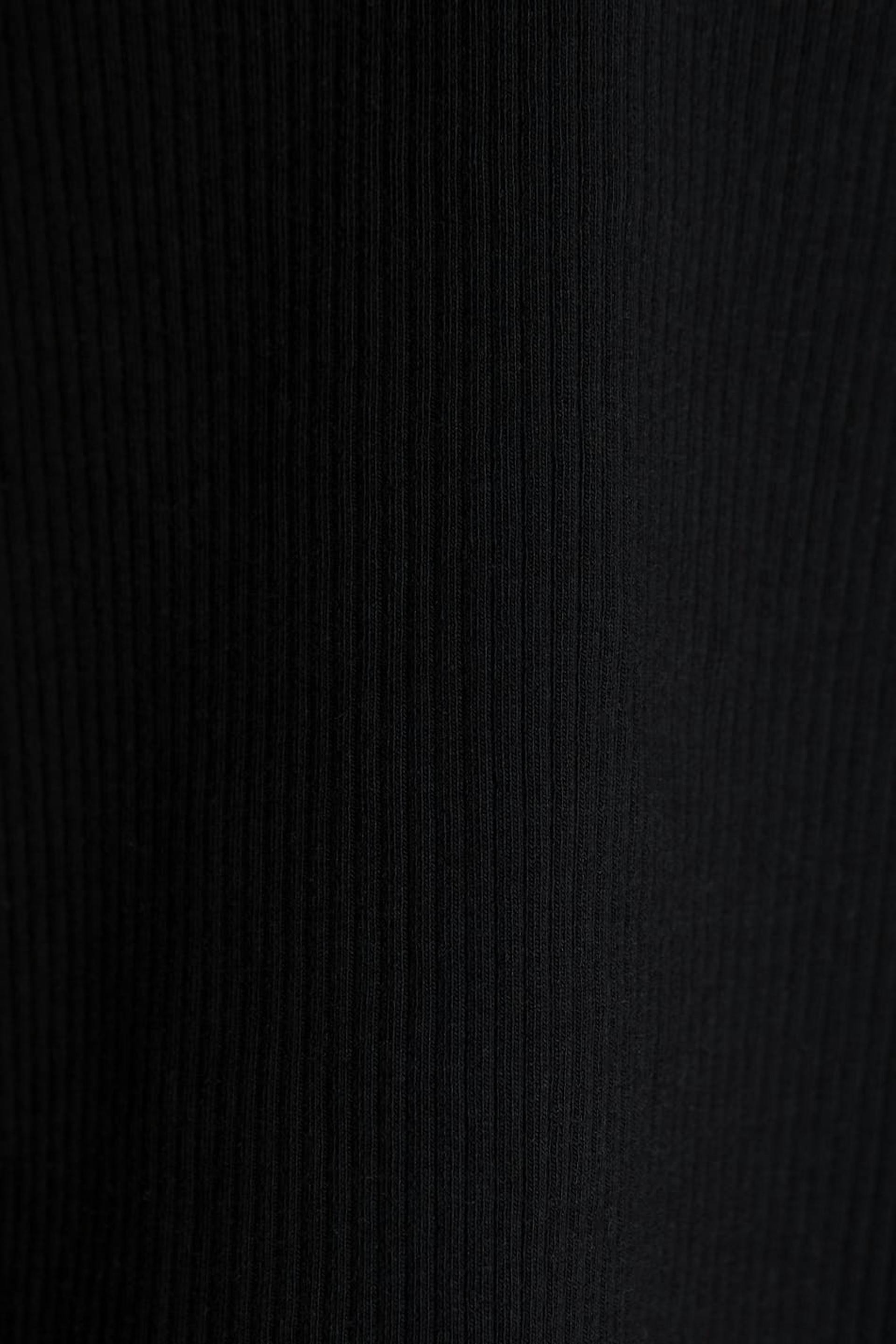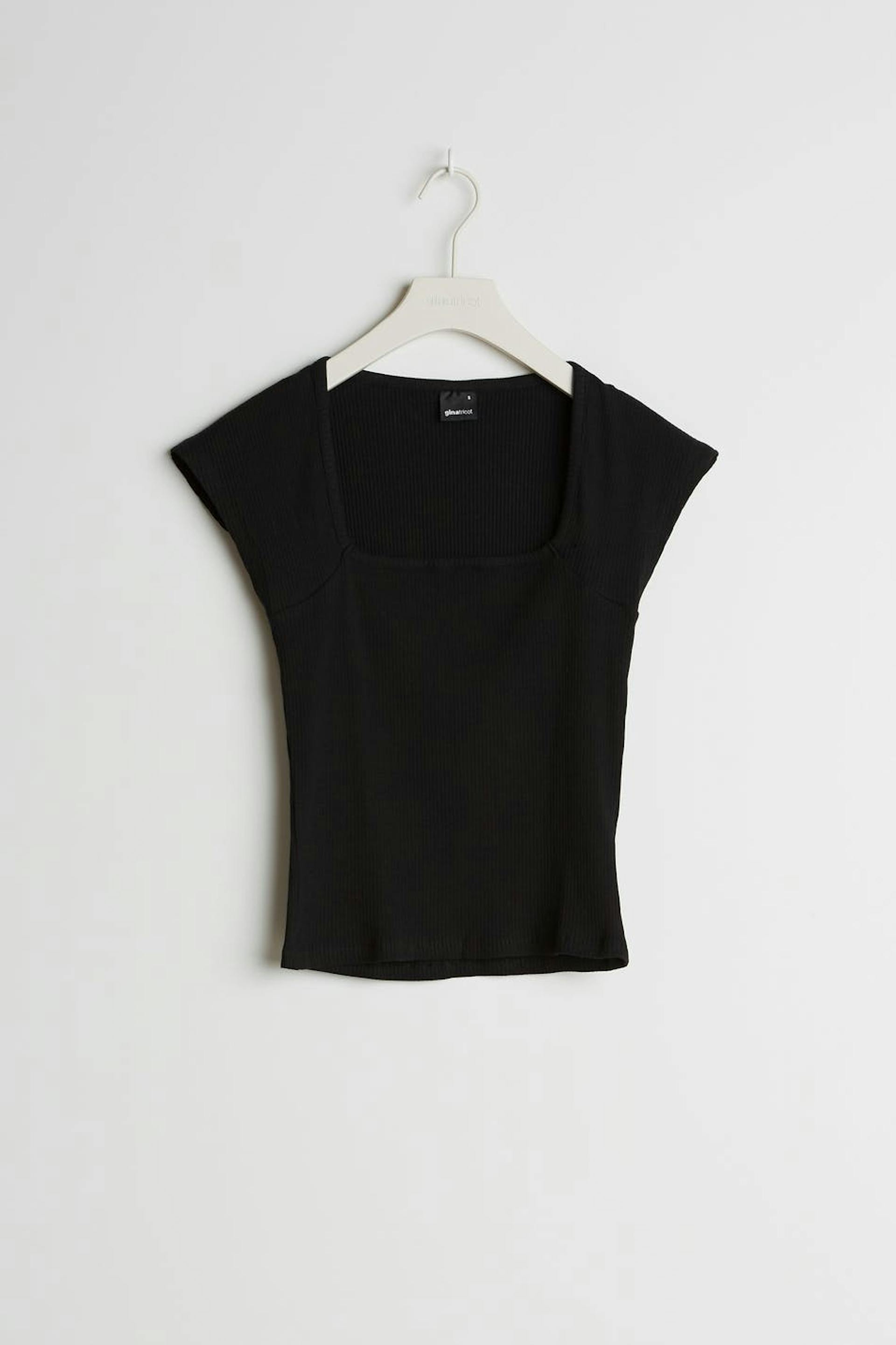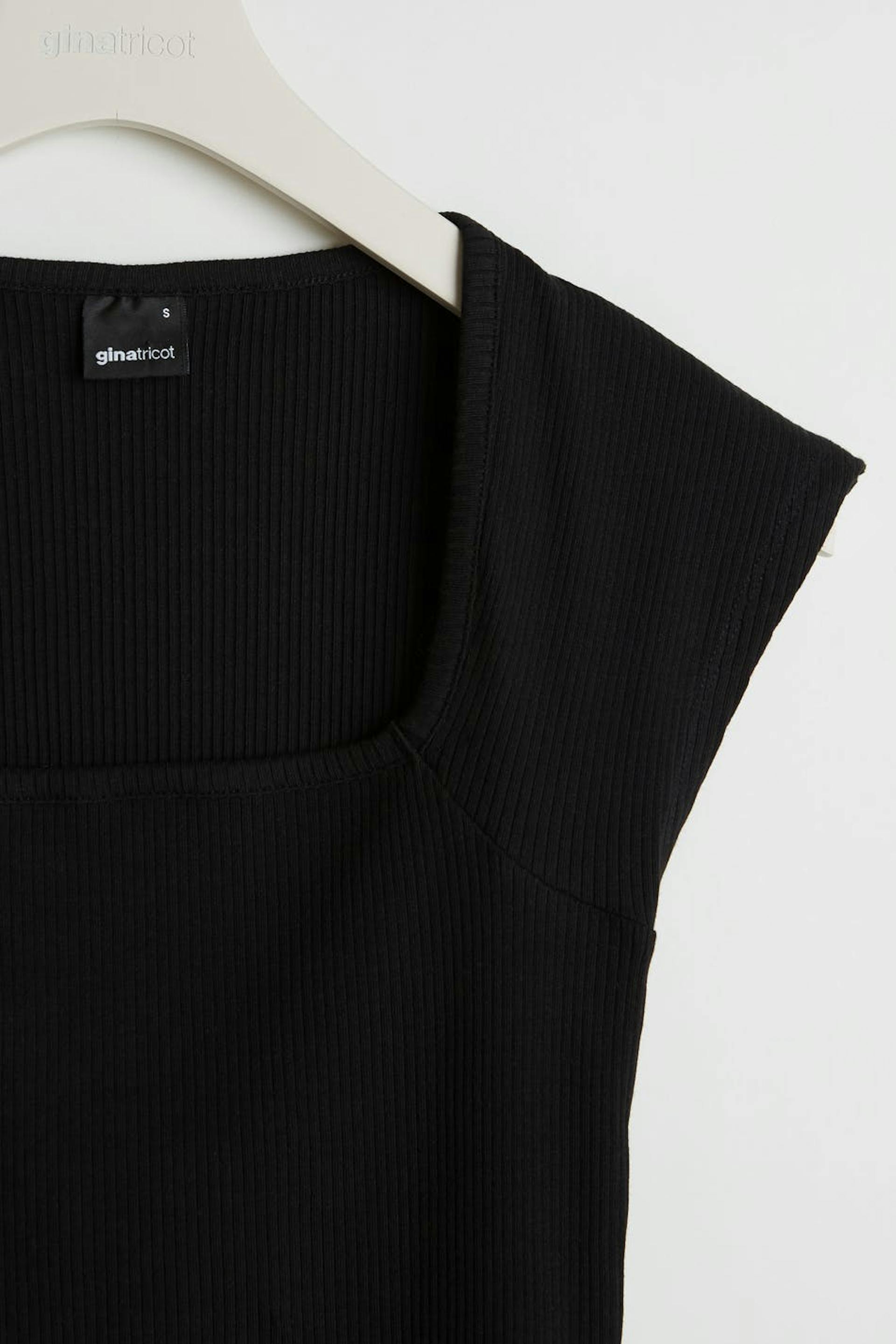 Resorimainen toppi vartalonmyötäisellä istuvuudella. Toppi on musta ja hihaton ja siinä on neliöpääntie. Siinä on leveät olkaimet ja lyhyempi pituus. Sinulle, joka olet enintään 160 cm pitkä.