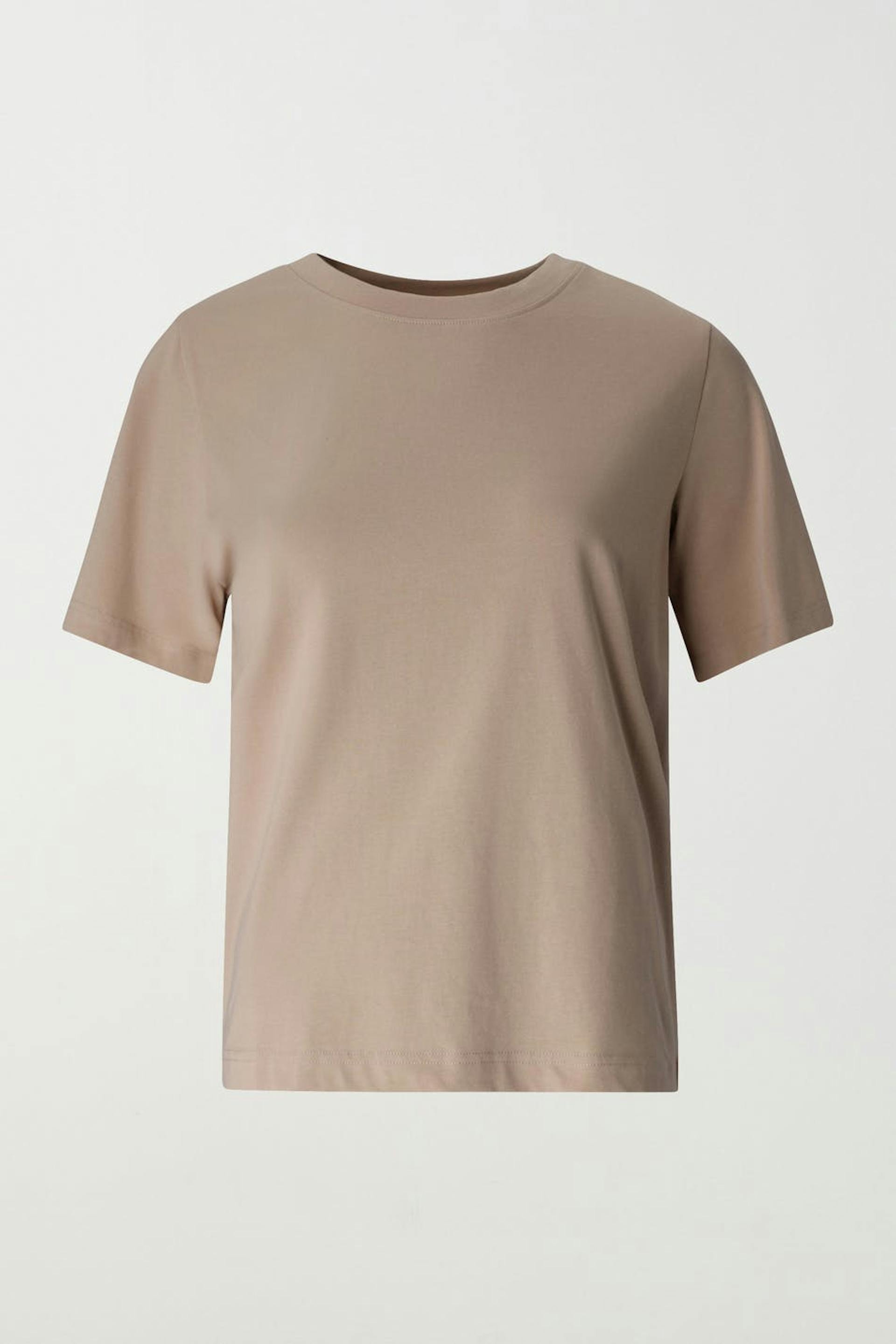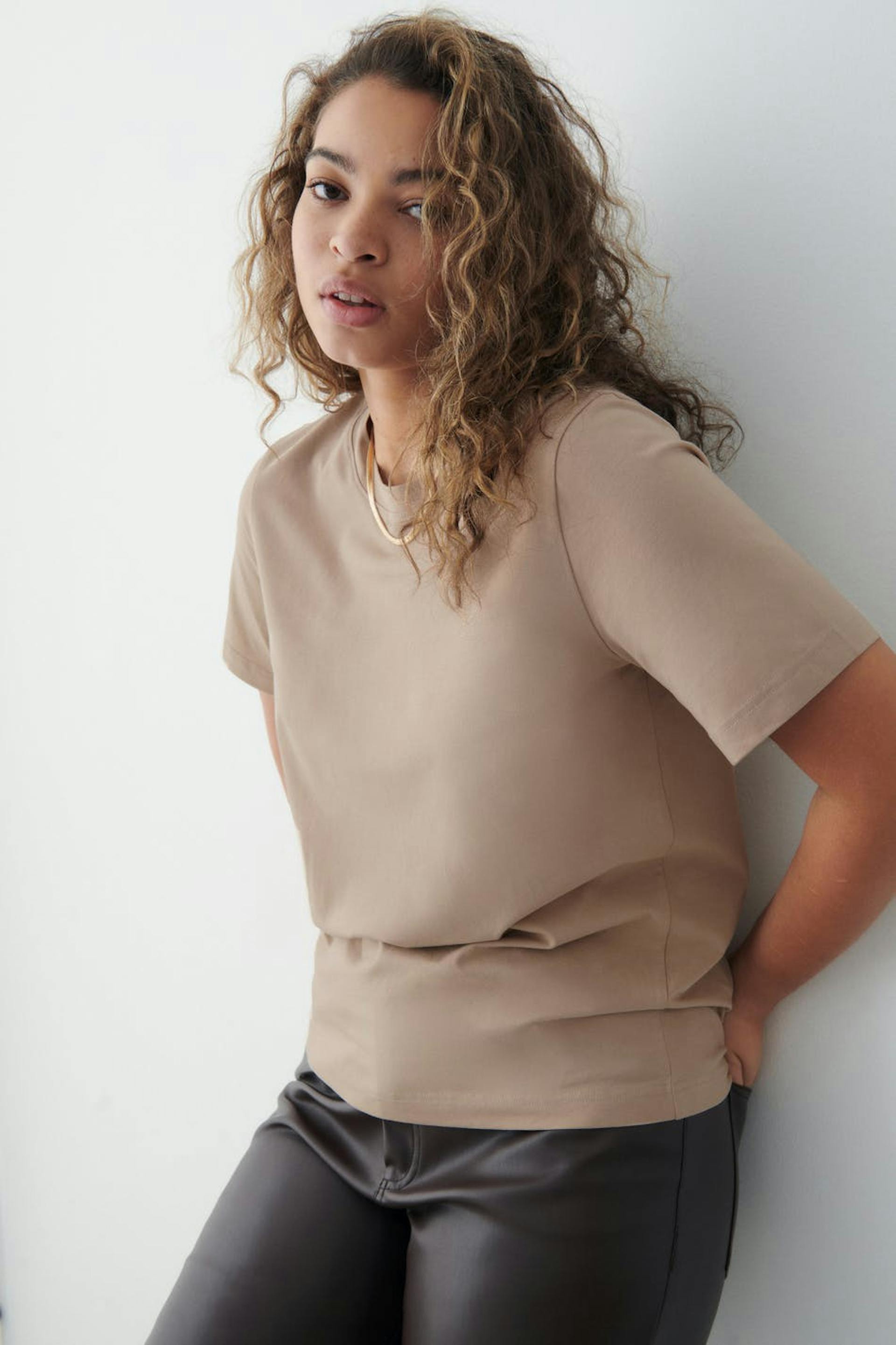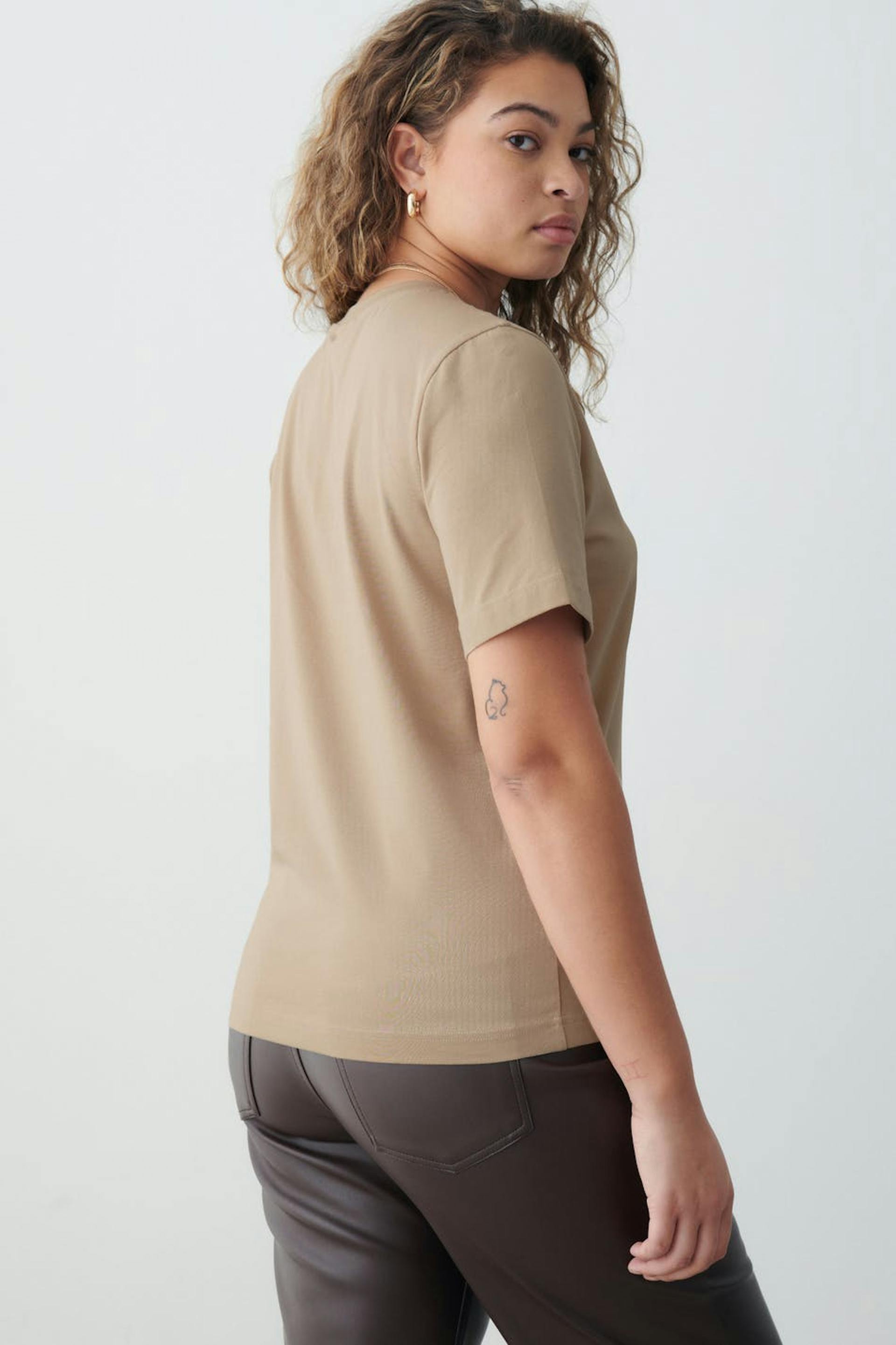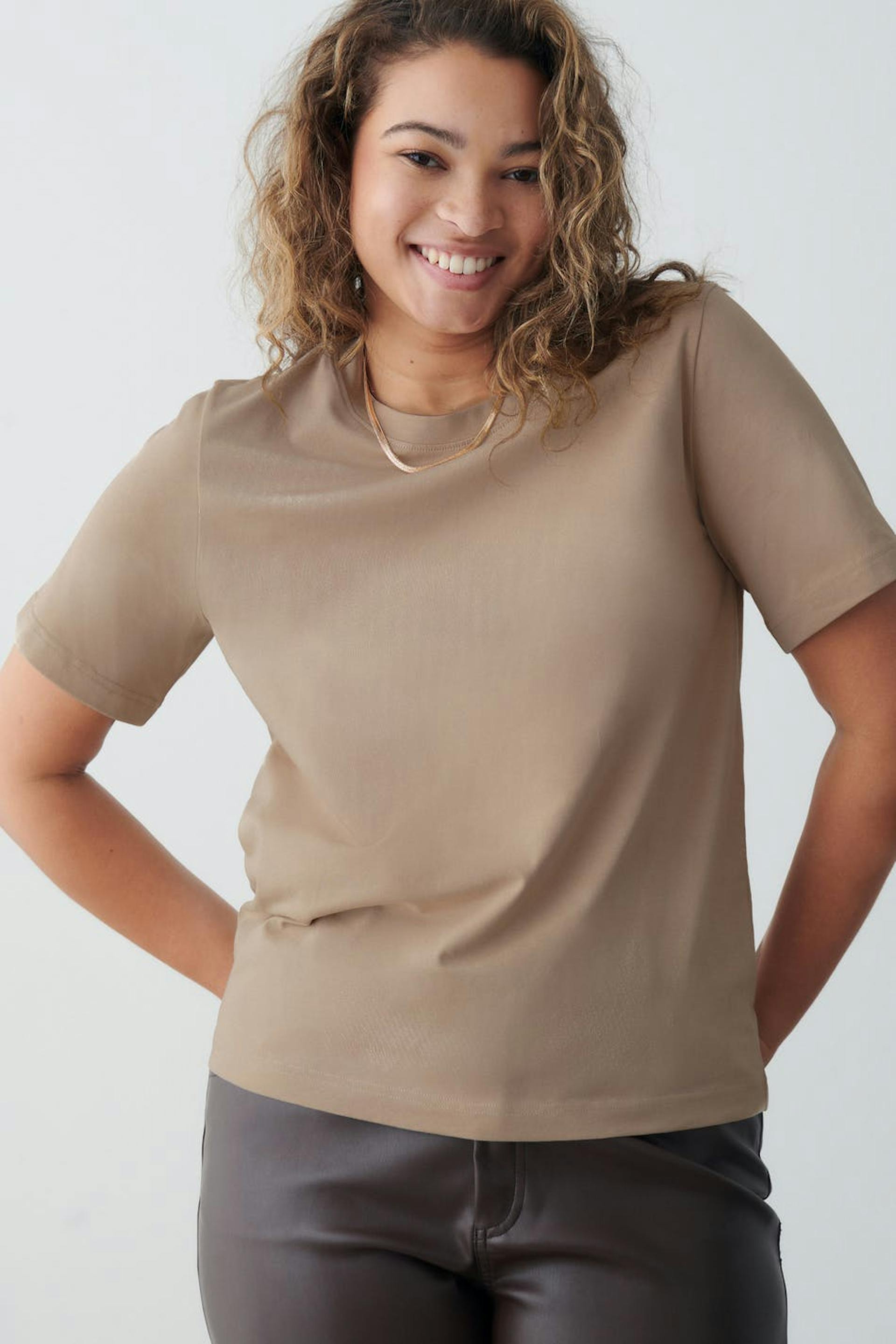 Pehmeä T-paita normaalilla leikkauksella. T-paita on beige ja siinä on pyöristetty kaula-aukko.