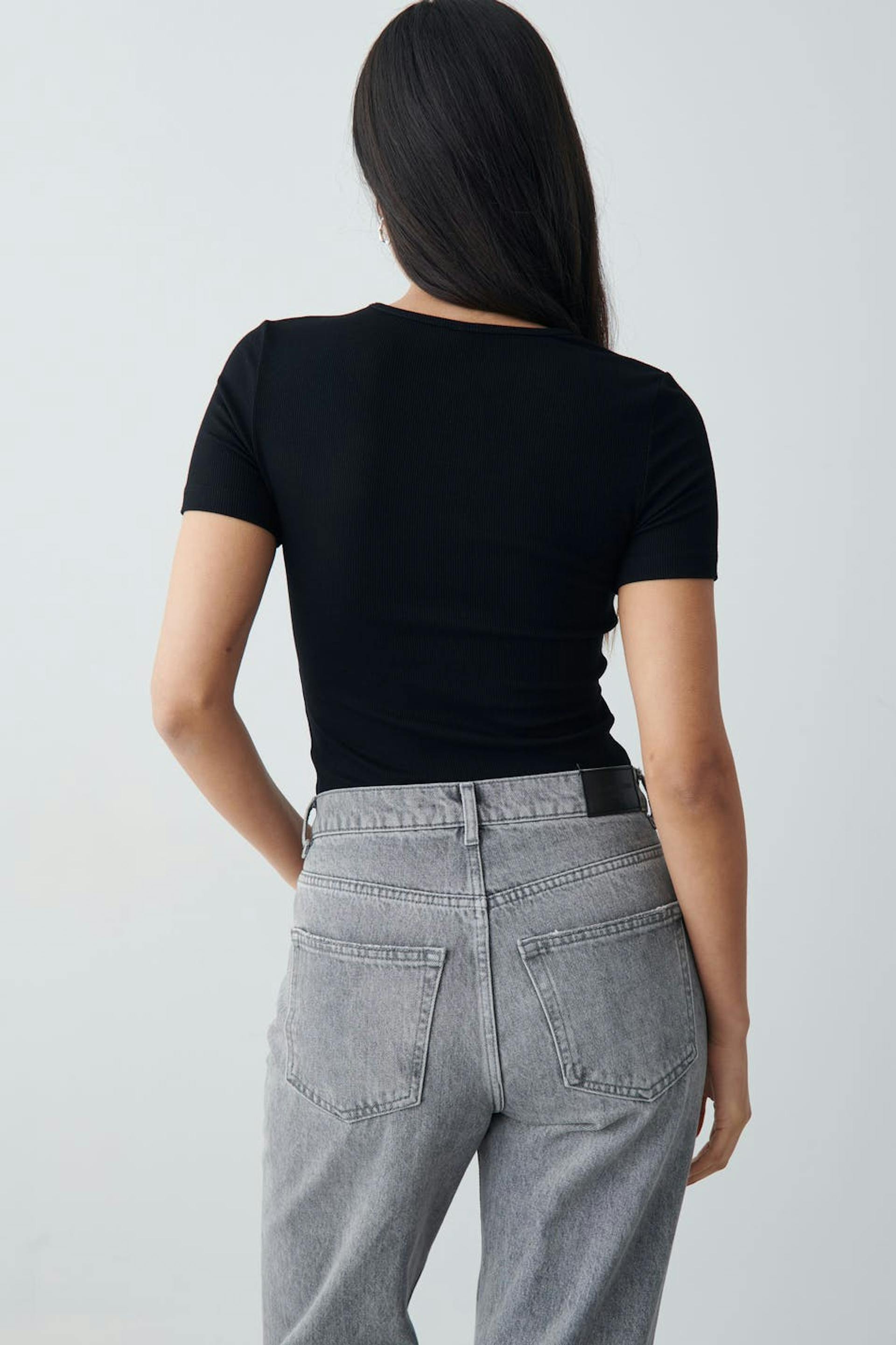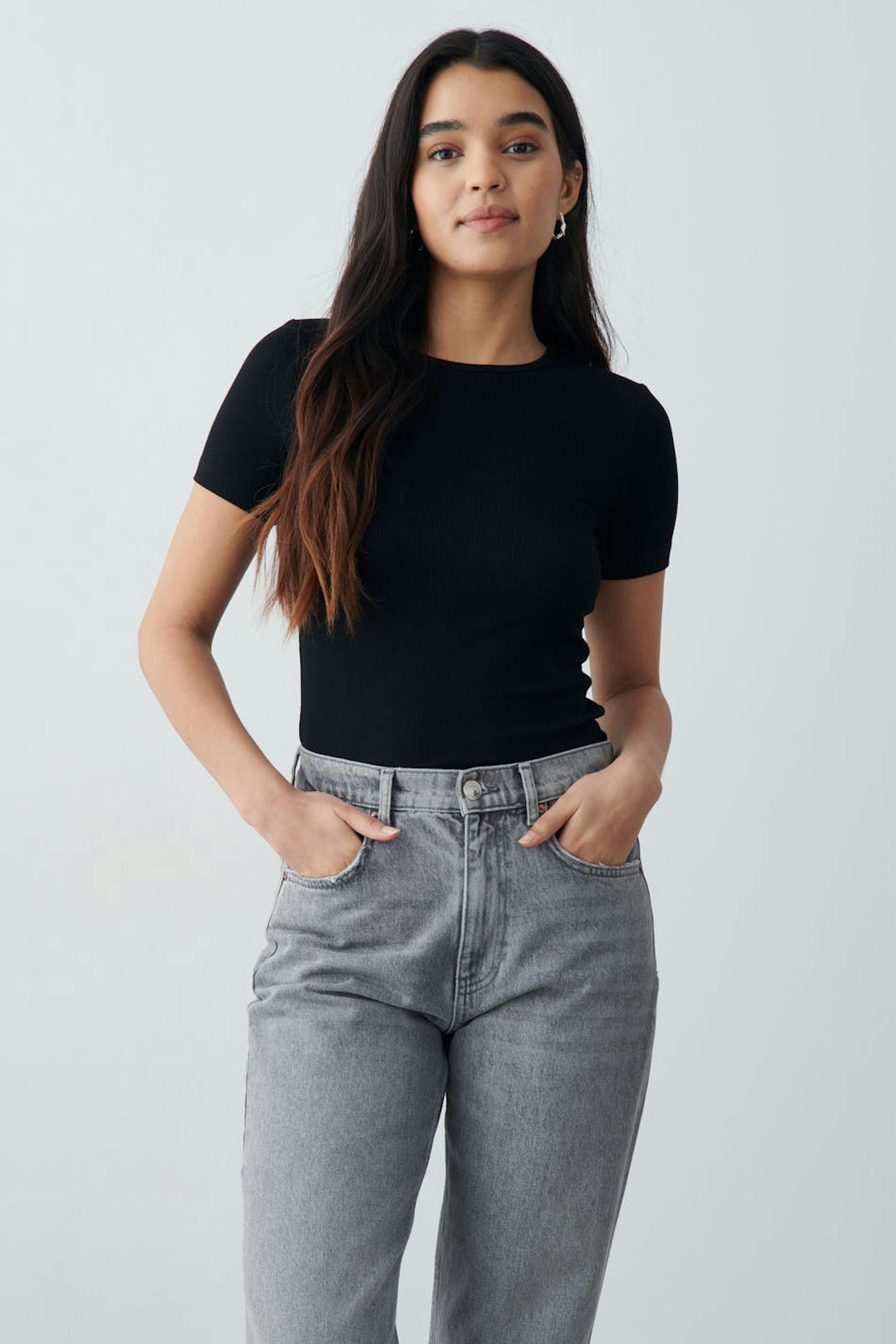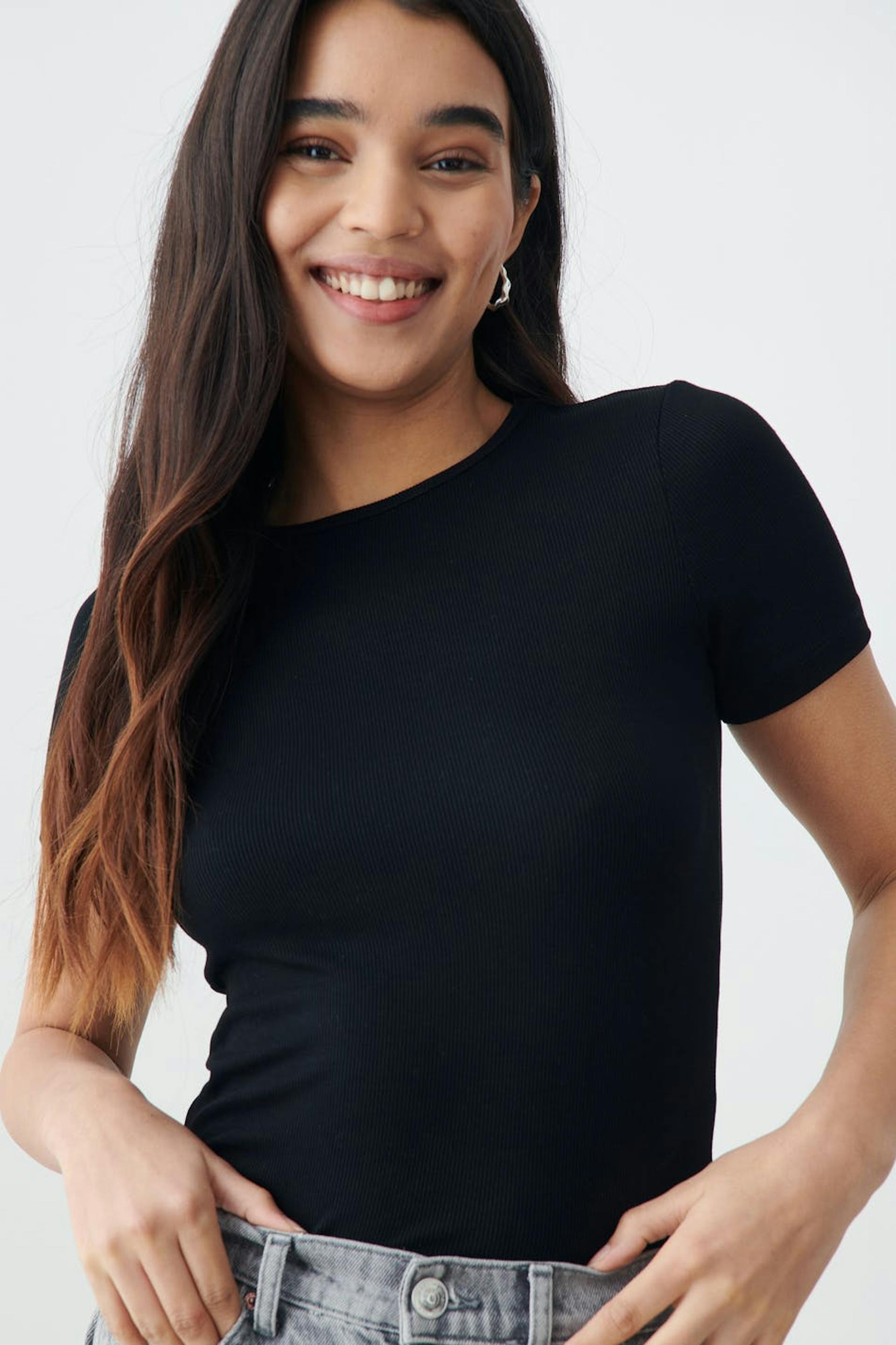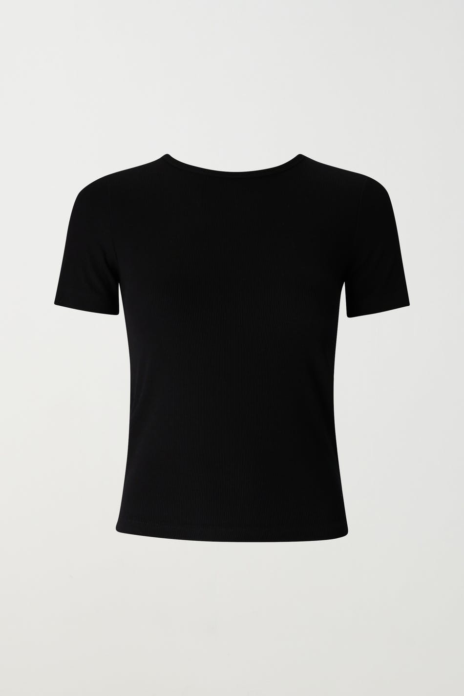 Ribattu T-paita trikoosta tyköistuvalla istuvuudella. T-paita on musta ja siinä on pyöreä pääntie.